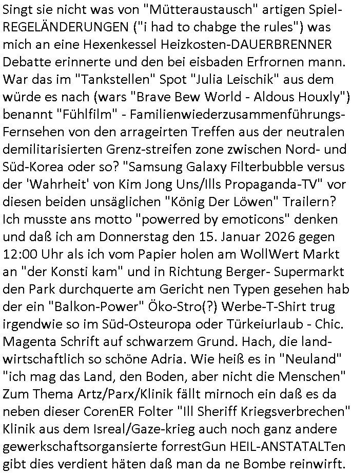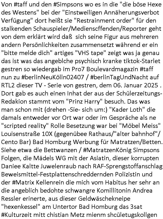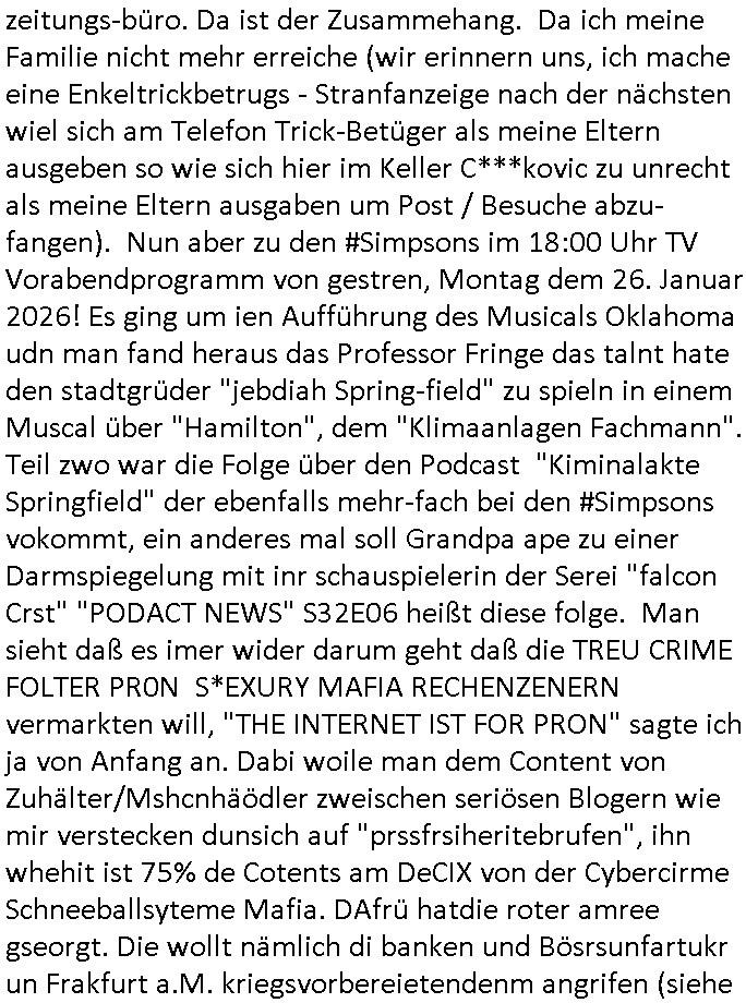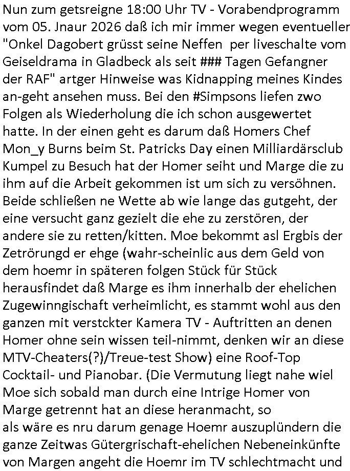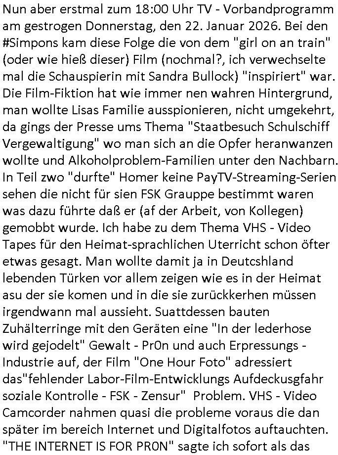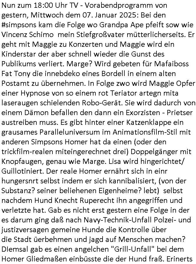 | Vom 18:00 Uhr TV - Vorabendprogramm von gestern, Donnerstag dem 29. Januar 2026 habe ich mal wieder den ersten Teil der #Simpsons verpasst weil ich noch das Schreiben ans Jobcenter fertigmachen musste wo es um möglicherweise abgefangene Post und um manipulierte Telefonie sowie Unfug mit DIN-5008 Diktatzeichen ging. Als ich einschaltete war Marge Simpson gerade mit dem Fällen von Bäumen beschäftigt, sie bewunderte irgend- eine "Timbersports" Athletin, das sind Personen die das Fälen von Bäumen zum Sport machen, in Schottland, so hab ich glaub ich mal im Frehsen gesehen gibt es wenn ich mich rcht entisnn Meisterschaften im Stämme durch die Gegend tragen. Mrge zog zu dieser Athletin in eine andere Stadt und Homer und die Kider/Familie mussten die Mutter mal wieder zurückholen. Danach dann wie immer #berlinNueKölln02407 / #berlinTagUndNacht wo Olivia wider zurück ist in Millas WG. Und Raphi plante eine Hochzeit mit einer Drohnen-Show. Danach dann die 3sat #Kulturzeit wo es um diese Abschiebepolizei "ICE" in den USA ging die Asbchiebekandidaten bei Anhörungen in Behörden einfing und Häuser stürmte. Danach kam ein Interview dazu. Dann eine Art Musikvideo von einer süd- amerikanischen Sängerin namens Gotop die etwas zu der Maduro - Verhaftung brachte, einen Protestsong dessen inhaltliche Botschaft an ihre Landsleute gerichtet war, es ging um manipulierte Wahlen und Maduros Nachfolgerin die noch schlinmer wäre als er. Dann Extremsport Videos