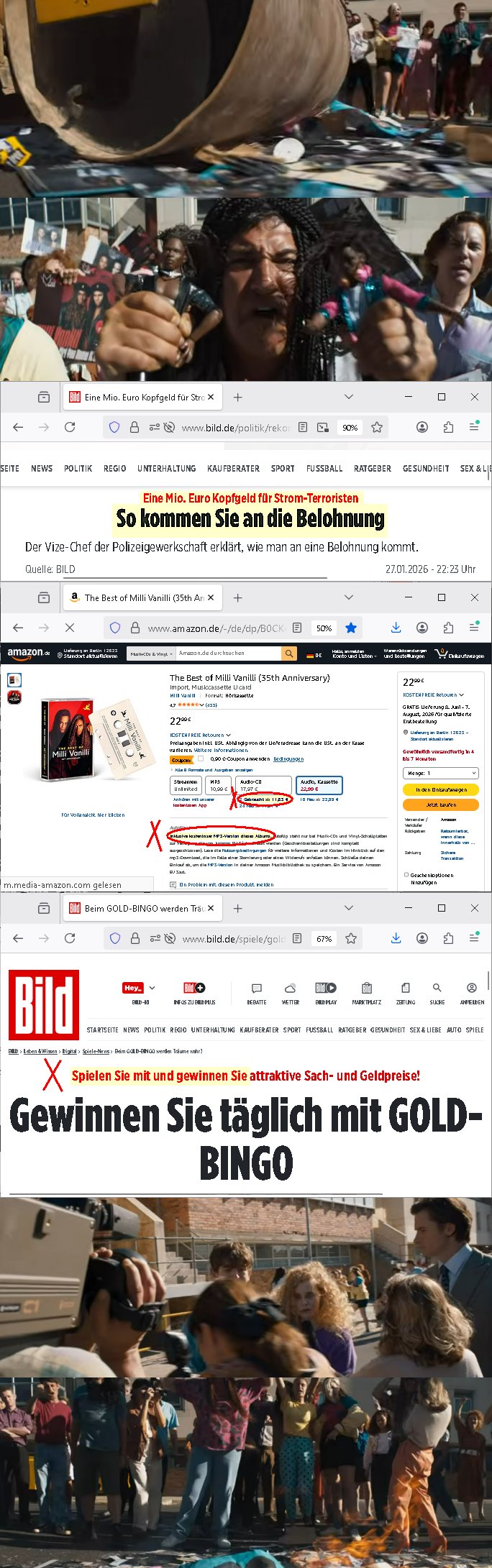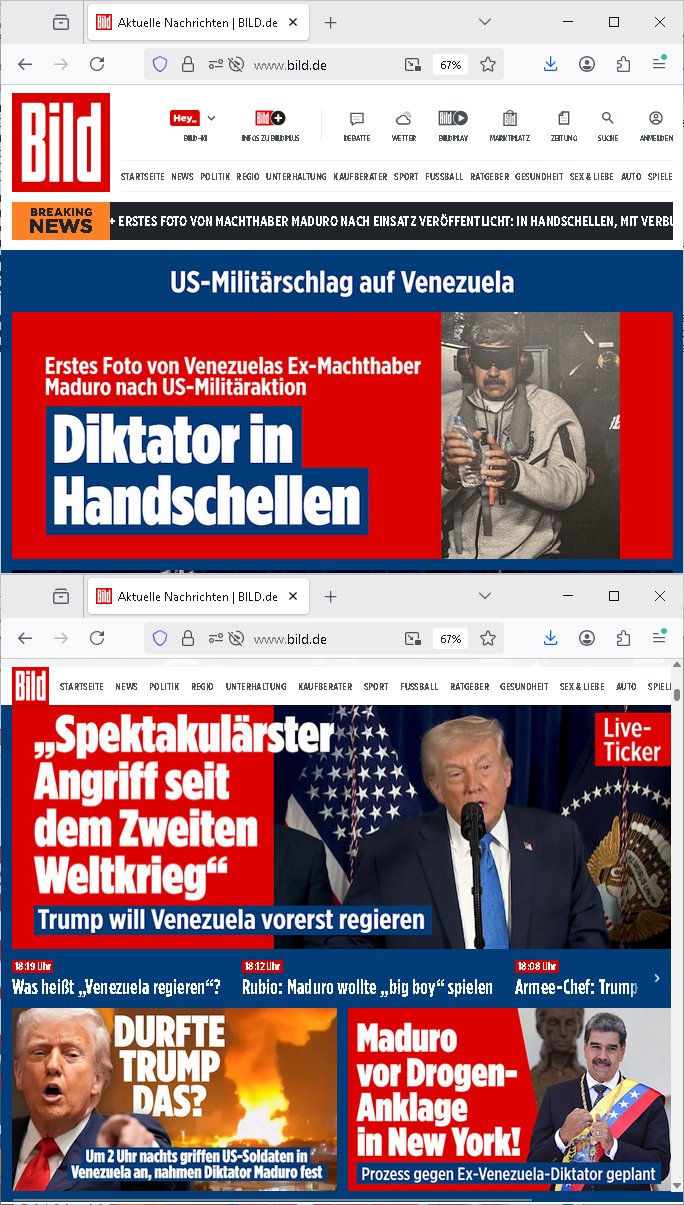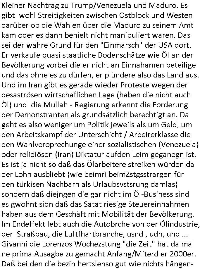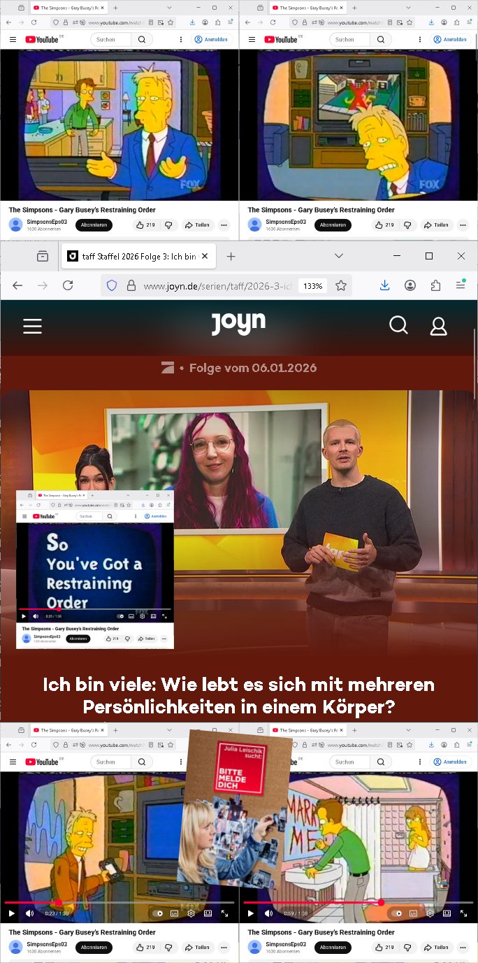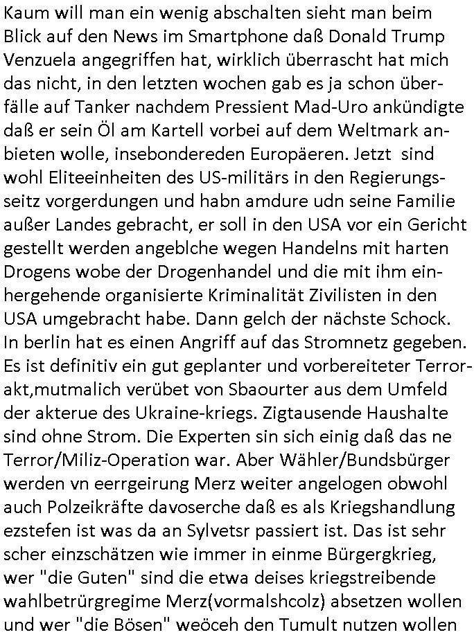 | Vom 18:00 Uhr TV - Vorabendprogramm von gestern, Donnerstag dem 29. Januar 2026 habe ich mal wieder den ersten Teil der #Simpsons verpasst weil ich noch das Schreiben ans Jobcenter fertigmachen musste wo es um möglicherweise abgefangene Post und um manipulierte Telefonie sowie Unfug mit DIN-5008 Diktatzeichen ging. Als ich einschaltete war Marge Simpson gerade mit dem Fällen von Bäumen beschäftigt, sie bewunderte irgend- eine "Timbersports" Athletin, das sind Personen die das Fälen von Bäumen zum Sport machen, in Schottland, so hab ich glaub ich mal im Frehsen gesehen gibt es wenn ich mich rcht entisnn Meisterschaften im Stämme durch die Gegend tragen. Mrge zog zu dieser Athletin in eine andere Stadt und Homer und die Kider/Familie mussten die Mutter mal wieder zurückholen. Danach dann wie immer #berlinNueKölln02407 / #berlinTagUndNacht wo Olivia wider zurück ist in Millas WG. Und Raphi plante eine Hochzeit mit einer Drohnen-Show. Danach dann die 3sat #Kulturzeit wo es um diese Abschiebepolizei "ICE" in den USA ging die Asbchiebekandidaten bei Anhörungen in Behörden einfing und Häuser stürmte. Danach kam ein Interview dazu. Dann eine Art Musikvideo von einer süd- amerikanischen Sängerin namens Gotop die etwas zu der Maduro - Verhaftung brachte, einen Protestsong dessen inhaltliche Botschaft an ihre Landsleute gerichtet war, es ging um manipulierte Wahlen und Maduros Nachfolgerin die noch schlinmer wäre als er. Dann Extremsport Videos