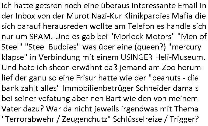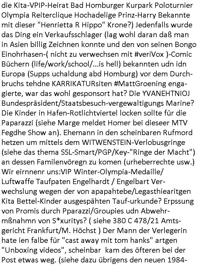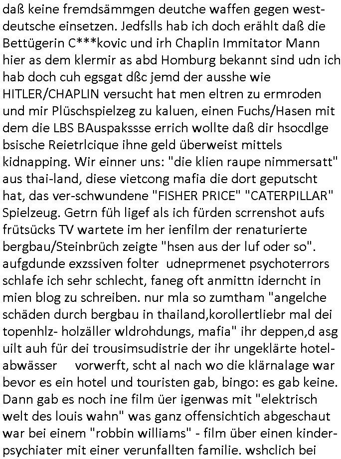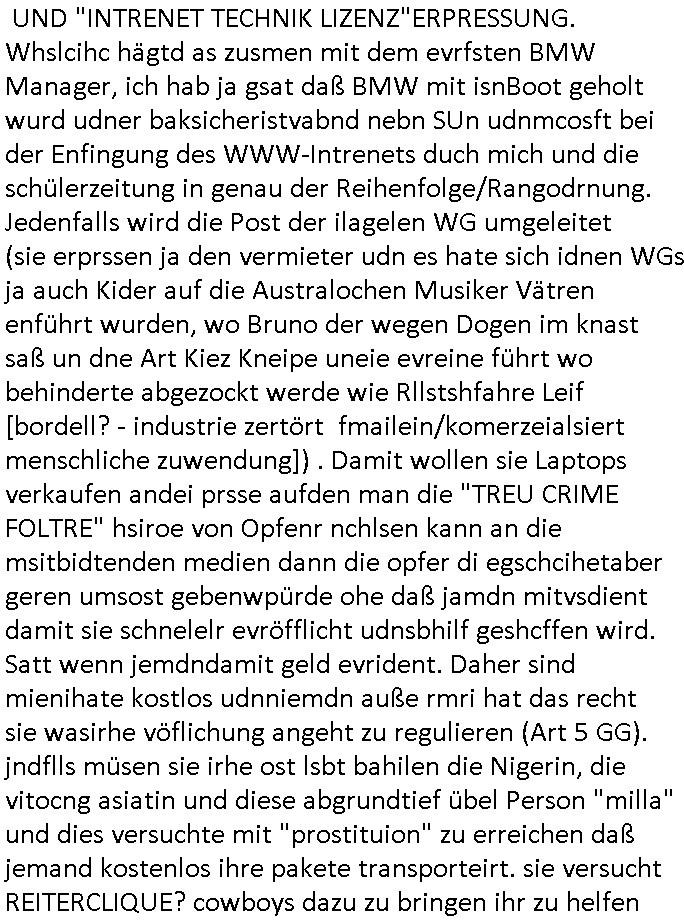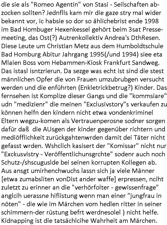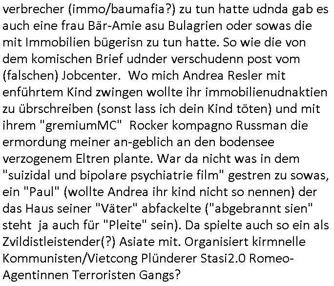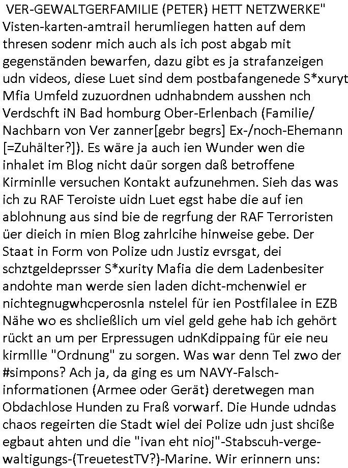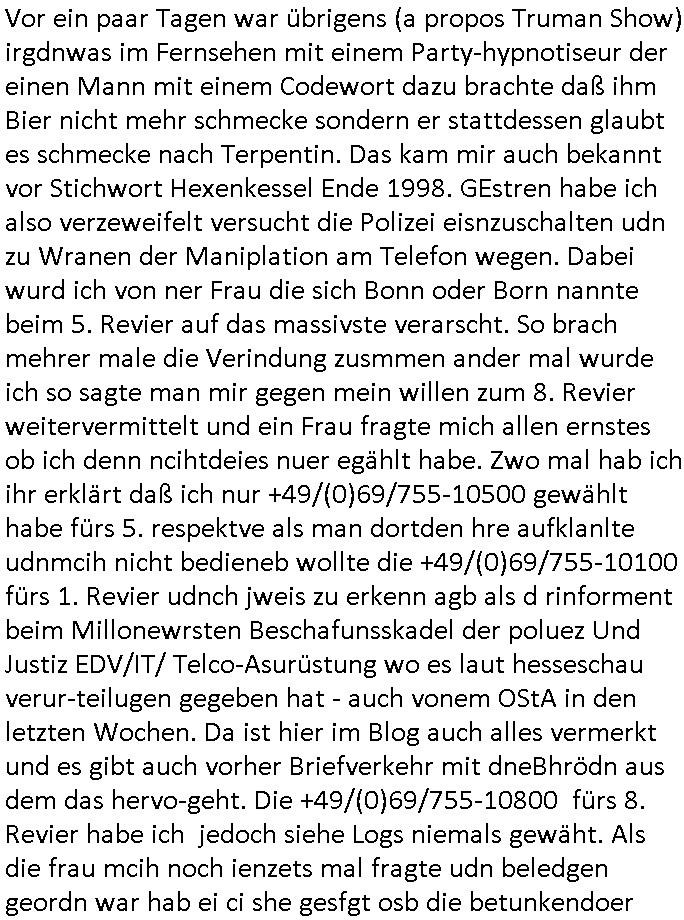 | Diese Verbrecherbande manipuliert schon wieder gezielt die Verbindungen zur Rufnummerm unter +49/(0)69/755 also die Durchwahl -01050 vom 5. und die -10100 vom 1. Revier. Das ligt auch nicht an Router/Provider-Sperrlisten oder "mangeldnem Guthaben "die +49/(0)69/1367-0 (das Gericht) imgelcheVowhalberich erreich ich nämlich. Die missbrauchen ihre "Polozei Verhandlungsführung in Kidnapping - Fällen" befugnisse um im Telefonnetz rum- zufuhrwerken und zu pfuschen,wie whaist getht es denen darum das bloß nicht beaknt wird wie viel scheiße sie in den letzet jahren wirklich gebaut haben, also um nicht anderes als drohende (Aussge-)Beweisevernichtung durch Zeugen Einshcüchterung / zu schweigen bringen wollen. Manwill michd er jedesmlaien Strafanzeige wegen utre-lassner hIlflsitung machen will Beihilfe und begüstigung schwerster straftaten ganz offensichtlich zermrürben udn hört nicht auf mich mit Schlüsselreizen zu triggern ind er hoffnug daß ich einen scheinbaren Suizidverscuh begehe. In de rvagangeheit hat das mah hercf klappt udndannw urde ich in Kliniken verschleppt und dort gezilt vergiftet. Als würde es nicht genügen daß mein Kind entführt ist.