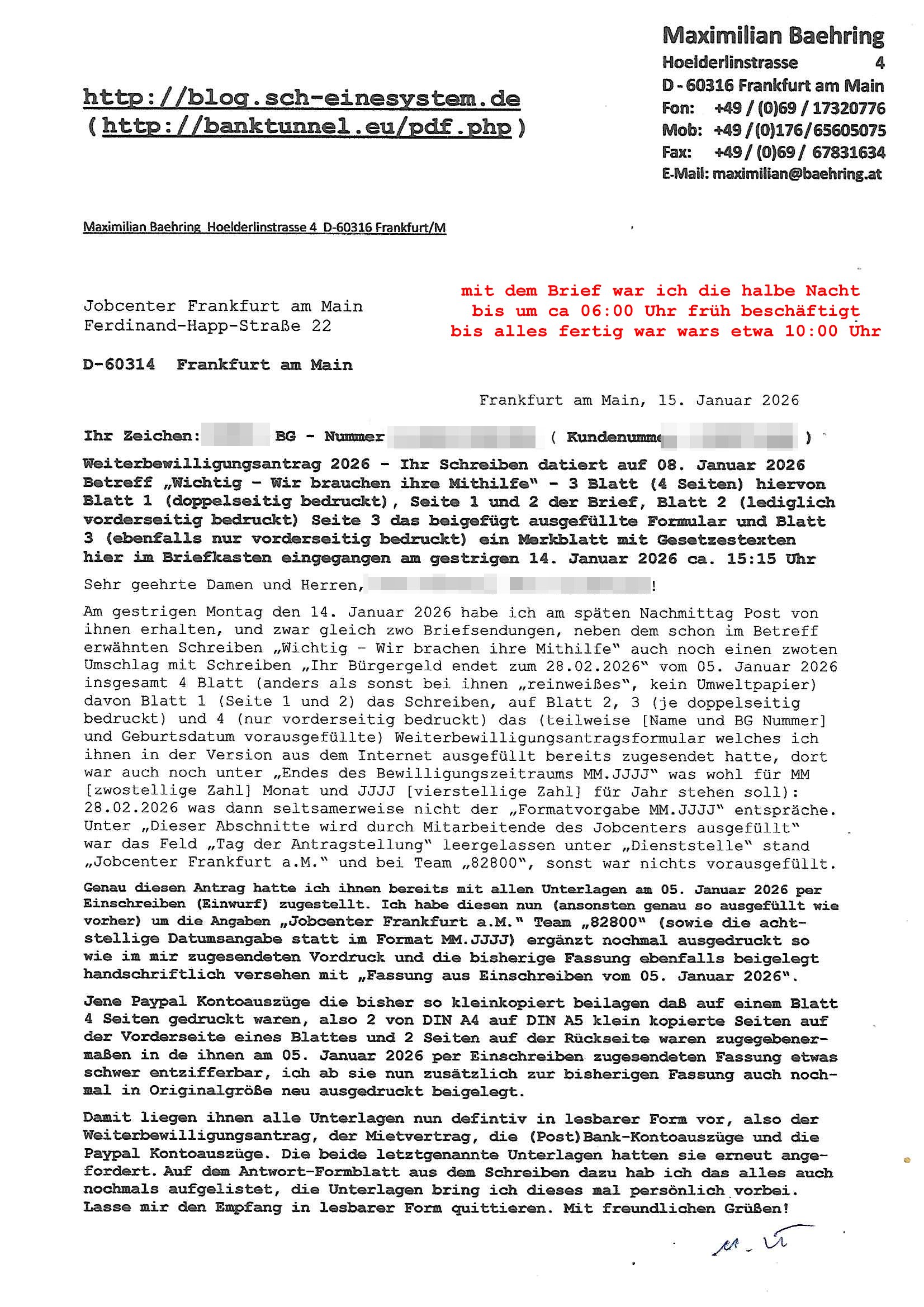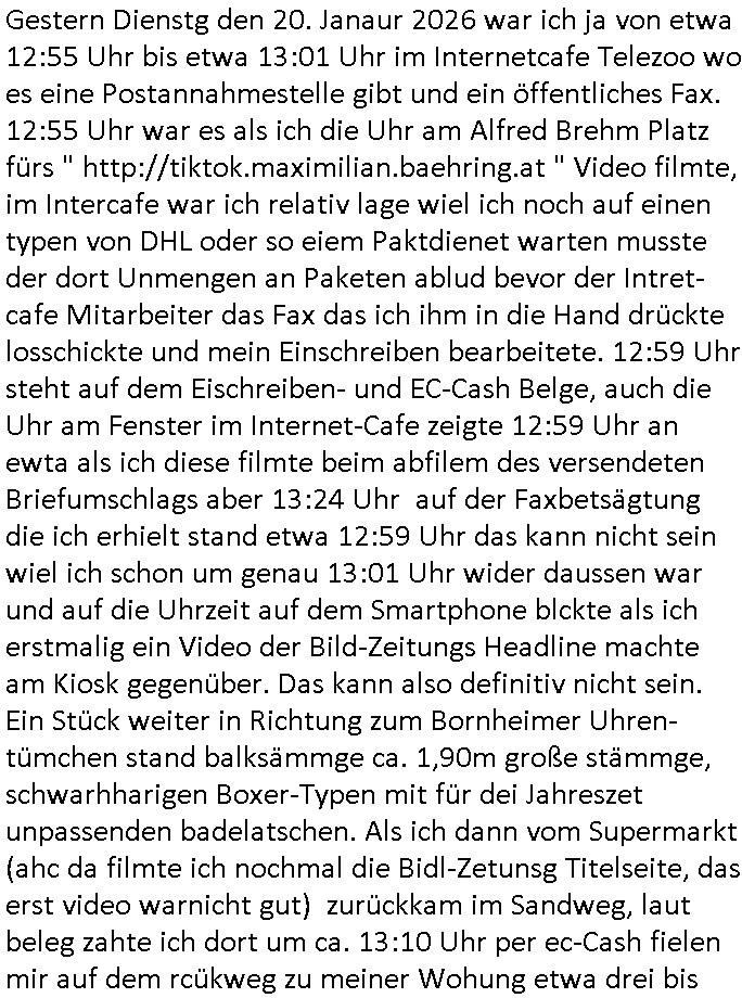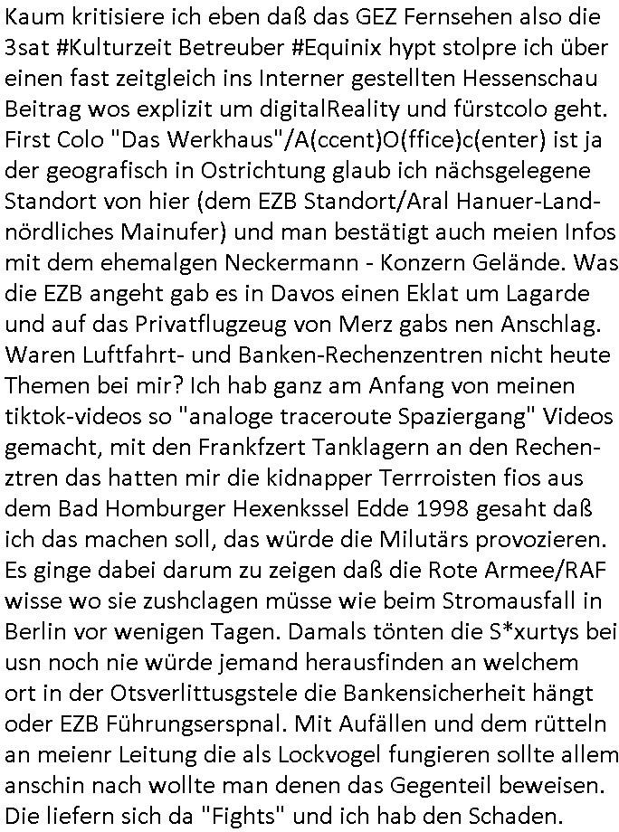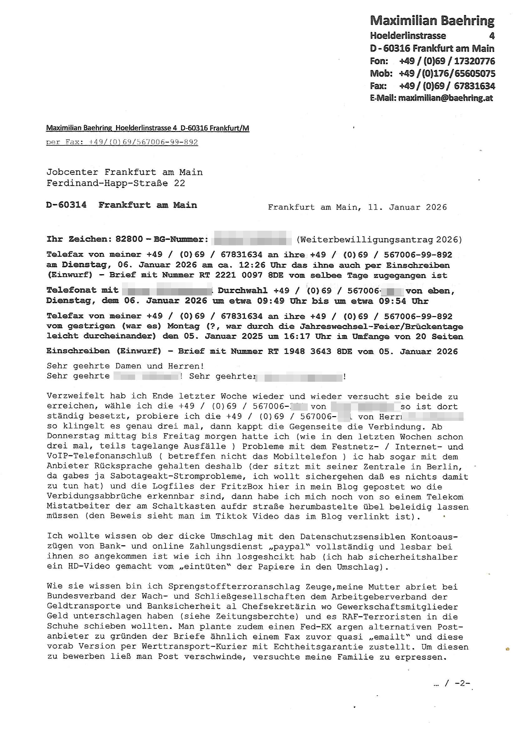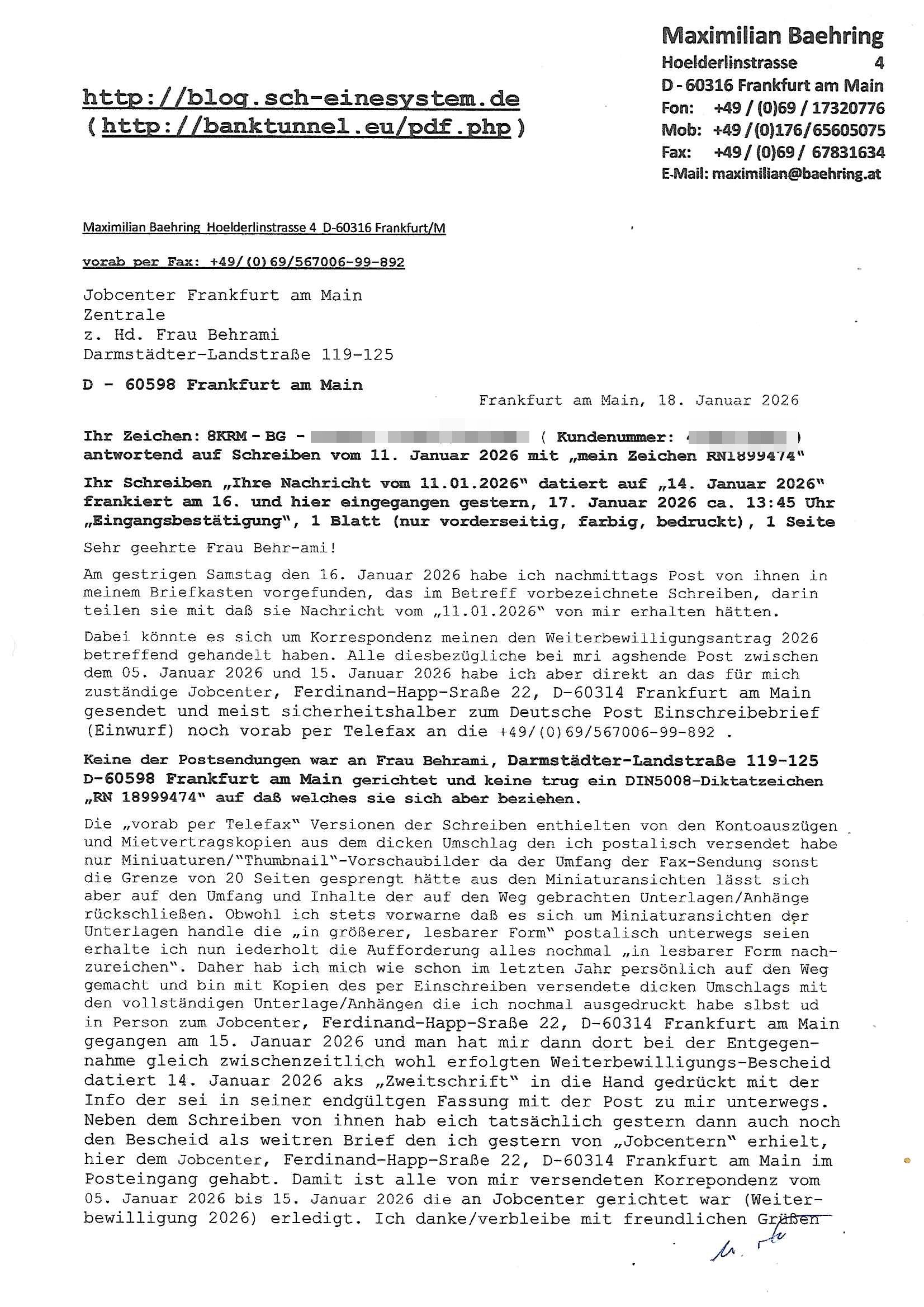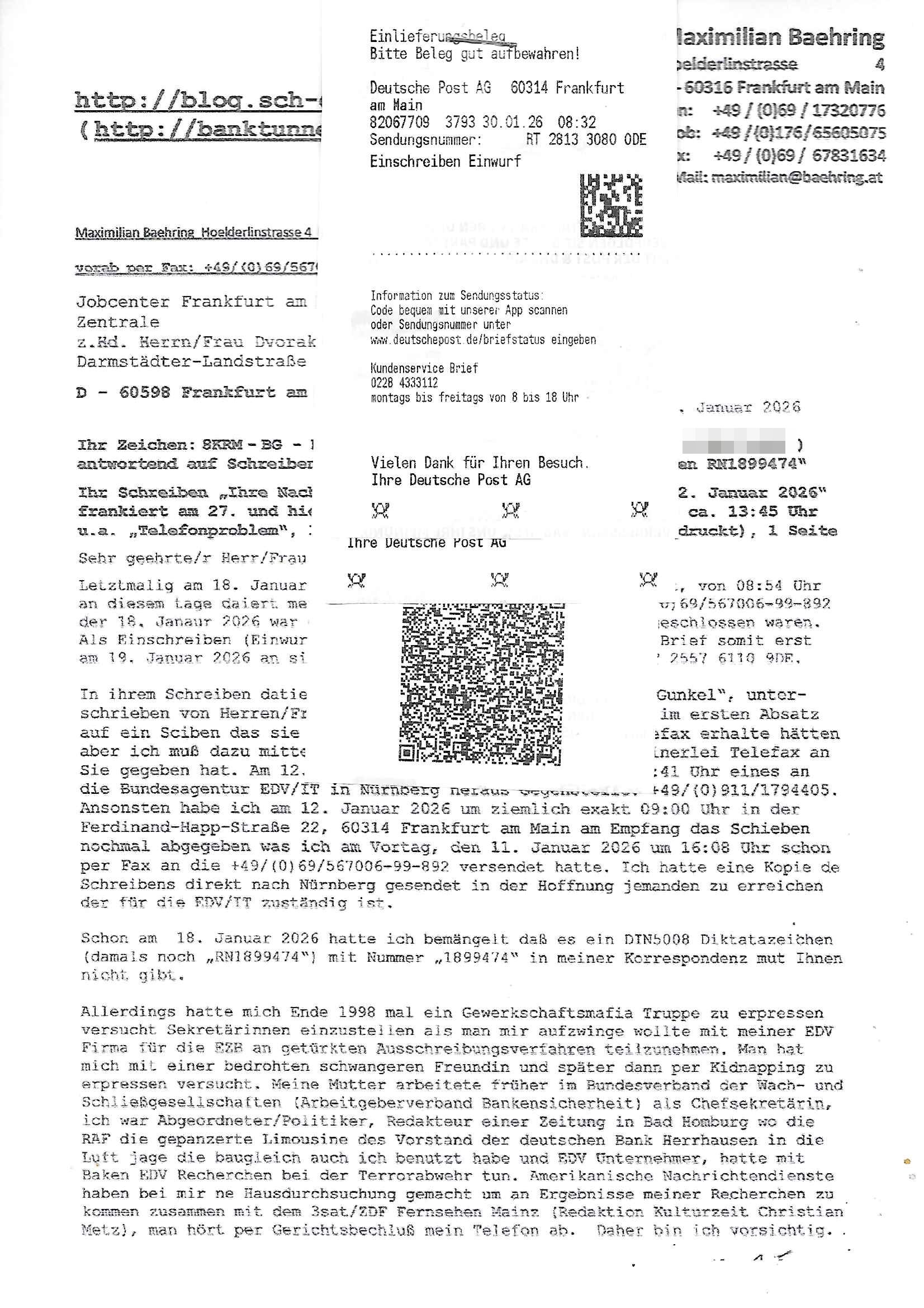 ( http://banktunnel.eu/pdf.php ) Maximilian Baehring Hoelderlinstrasse 4 D-60316 Frankfurt/M vorab per Fax: +49/(0)69/567006-99-892 Jobcenter Frankfurt am Main Zentrale z.Hd. Herrn/Frau D***k/Frau G***l Darmstädter-Landstraße 119-125 D - 60598 Frankfurt am Main Frankfurt am Main, 29. Januar 2026 Ihr Zeichen: 8KRM - BG - Nummer: ****( Kundenummer: *** ) antwortend auf Schreiben vom 11. Januar 2026 mit „mein Zeichen RN1899474“ Ihr Schreiben „Ihre Nachricht vom 11.01.2026“ datiert auf „22. Januar 2026“ frankiert am 27. und hier eingegangen heute, 29. Januar 2026 ca. 13:45 Uhr u.a. „Telefonproblem“, 1 Blatt (nur vorderseitig, farbig, bedruckt), 1 Seite Sehr geehrte/r Herr/Frau D***! Letztmalig am 18. Januar 2026 hatte ich mit ihrem Hause Kontakt, von 08:54 Uhr an diesem tage daiert mein Telefax an ihre Frau Behrami +49/(0)69/567006-99-892 der 18. Janaur 2026 war ein Sonntag an dem die Postfilialen geschlossen waren. Als Einschreiben (Einwurf) ging der vorab per faxe gesendete Brief somit erst am 19. Januar 2026 an sie herus die Nummer der Sendung ist RT 2557 6110 9DE. In ihrem Schreiben datiert 22. Januar 2026 von einer „Frau Gunkel“, unter-schrieben von Herren/Frau? „Uli Dvorak“ beziehen sie sich im ersten Absatz auf ein Sciben das sie von mir am 12. Januar 2026 per Telefax erhalte hätten aber ich muß dazu mittelöen daß es vom 12. Januar 2026 keinerlei Telefax an Sie gegeben hat. Am 12. Januar 2026 geing lediglich um 18:41 Uhr eines an die Bundesagentur EDV/IT in Nürnberg heraus Gegenstelle: +49/(0)911/1794405. Ansonsten habe ich am 12. Januar 2026 um ziemlich exakt 09:00 Uhr in der Ferdinand-Happ-Straße 22, 60314 Frankfurt am Main am Empfang das Schieben nochmal abgegeben was ich am Vortag, den 11. Januar 2026 um 16:08 Uhr schon per Fax an die +49/(0)69/567006-99-892 versendet hatte. Ich hatte eine Kopie de Schreibens direkt nach Nürnberg gesendet in der Hoffnung jemanden zu erreichen der für die EDV/IT zuständig ist. Schon am 18. Januar 2026 hatte ich bemängelt daß es ein DIN5008 Diktatazeichen (damals noch „RN1899474“) mit Nummer „1899474“ in meiner Korrespondenz mut Ihnen nicht gibt. Allerdings hatte mich Ende 1998 mal ein Gewerkschaftsmafia Truppe zu erpressen versucht Sekretärinnen einzustellen als man mir aufzwinge wollte mit meiner EDV Firma für die EZB an getürkten Ausschreibungsverfahren teilzunehmen. Man hat mich mit einer bedrohten schwangeren Freundin und später dann per Kidnapping zu erpressen versucht. Meine Mutter arbeitete früher im Bundesverband der Wach- und Schließgesellschaften (Arbeitgeberverband Bankensicherheit) als Chefsekretärin, ich war Abgeordneter/Politiker, Redakteur einer Zeitung in Bad Homburg wo die RAF die gepanzerte Limousine des Vorstand der deutschen Bank Herrhausen in die Luft jage die baugleich auch ich benutzt habe und EDV Unternehmer, hatte mit Baken EDV Recherchen bei der Terrorabwehr tun. Amerikanische Nachrichtendienste haben bei mir ne Hausdurchsuchung gemacht um an Ergebnisse meiner Recherchen zu kommen zusammen mit dem 3sat/ZDF Fernsehen Mainz (Redaktion Kulturzeit Christian Metz), man hört per Gerichtsbechluß mein Telefon ab. Daher bin ich vorsichtig. | |