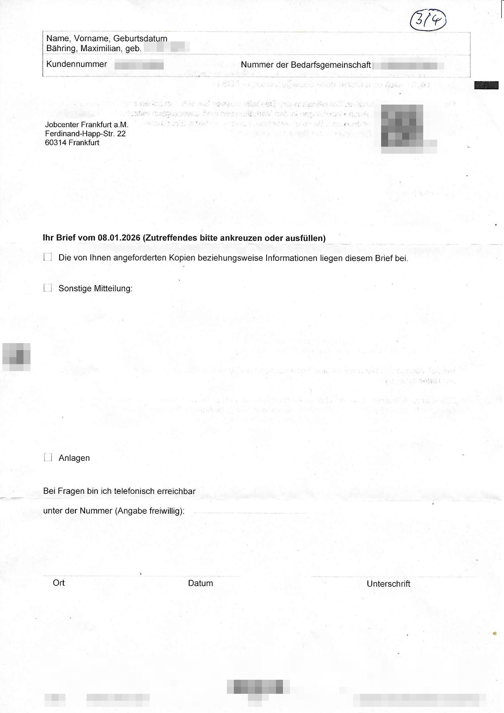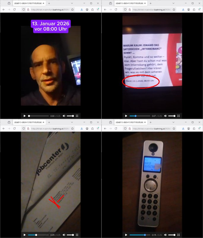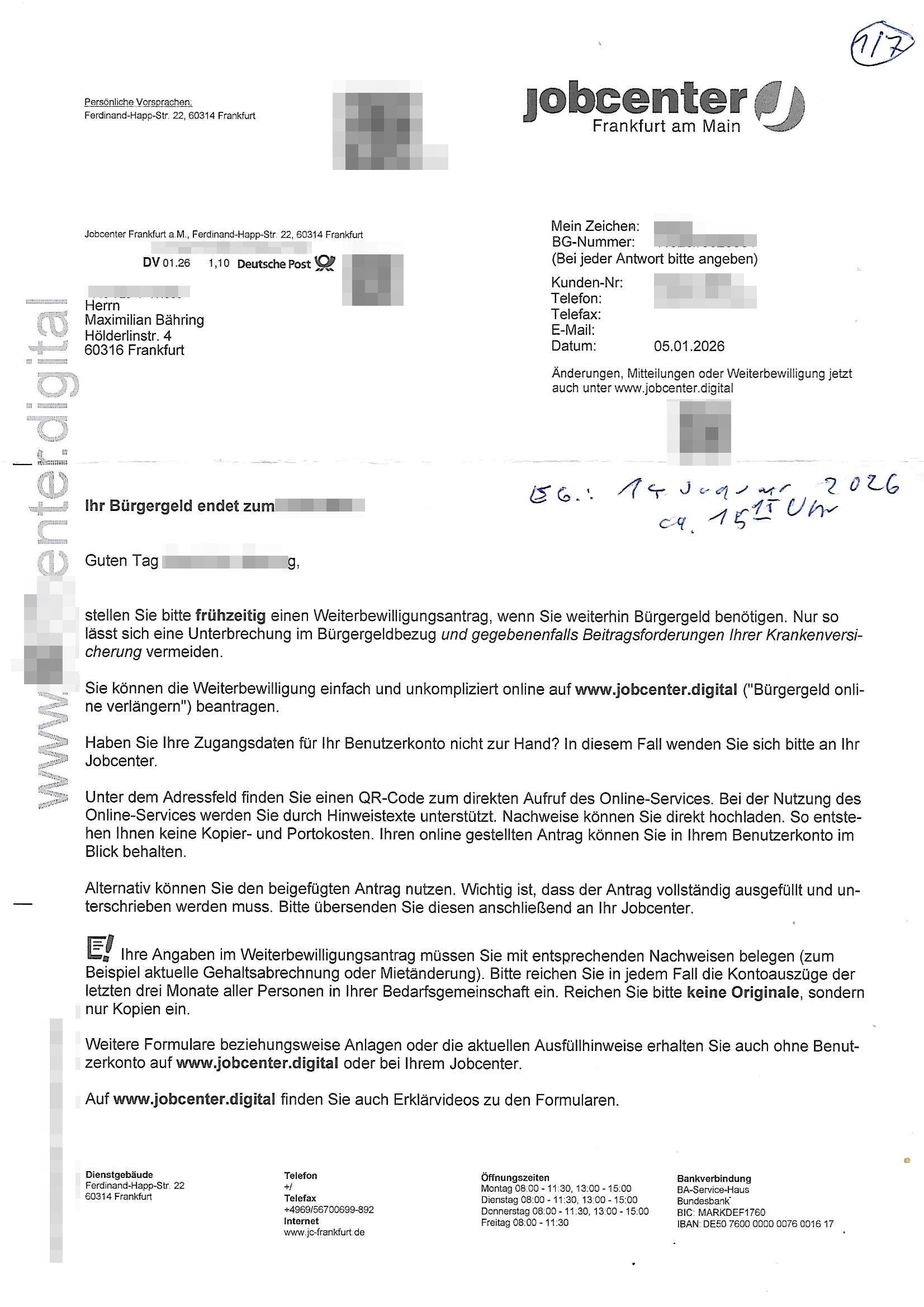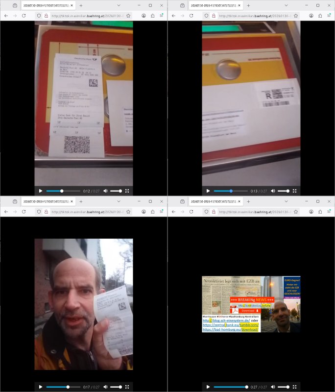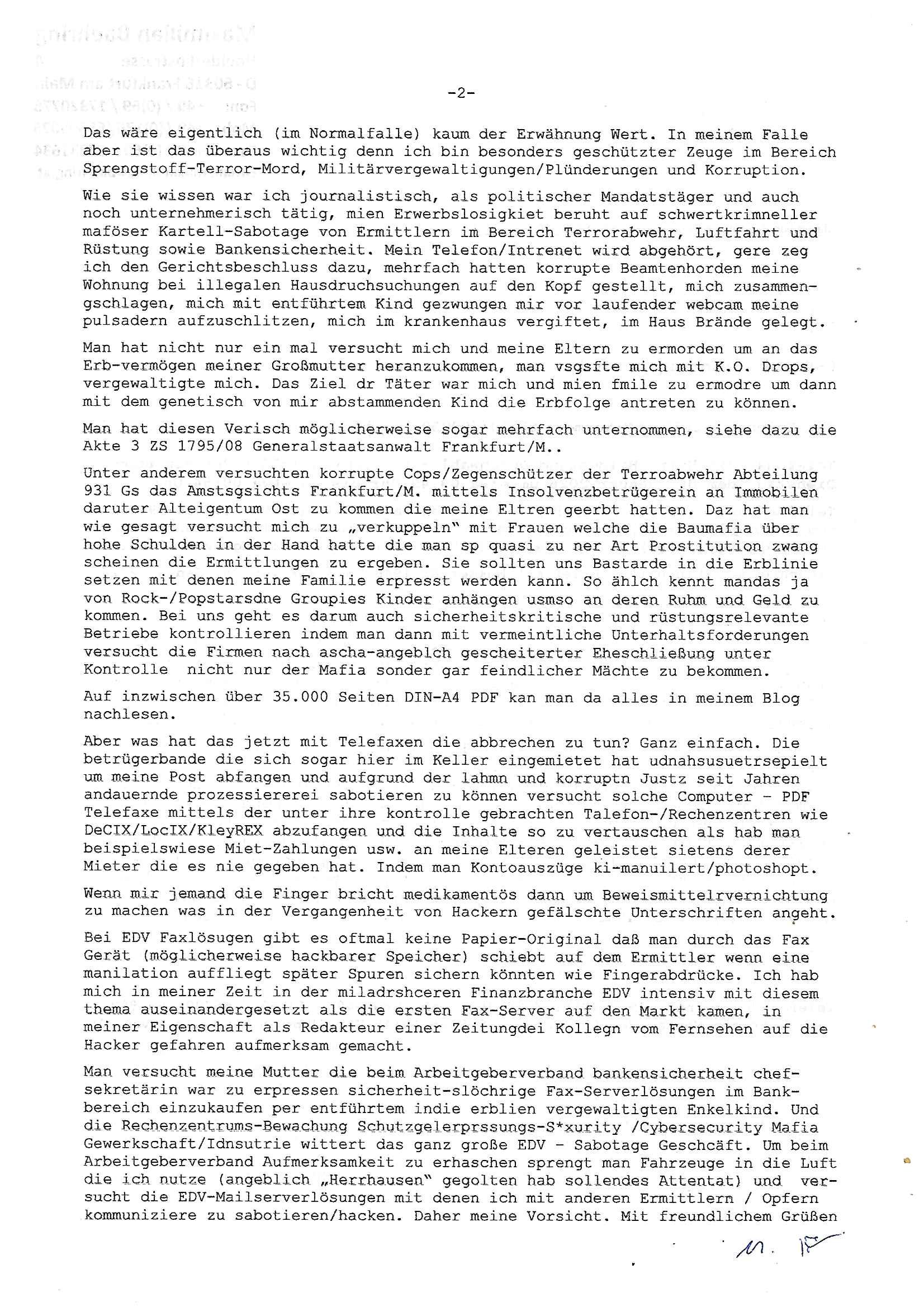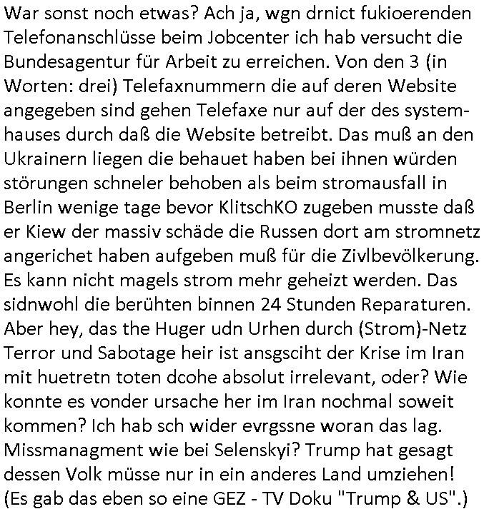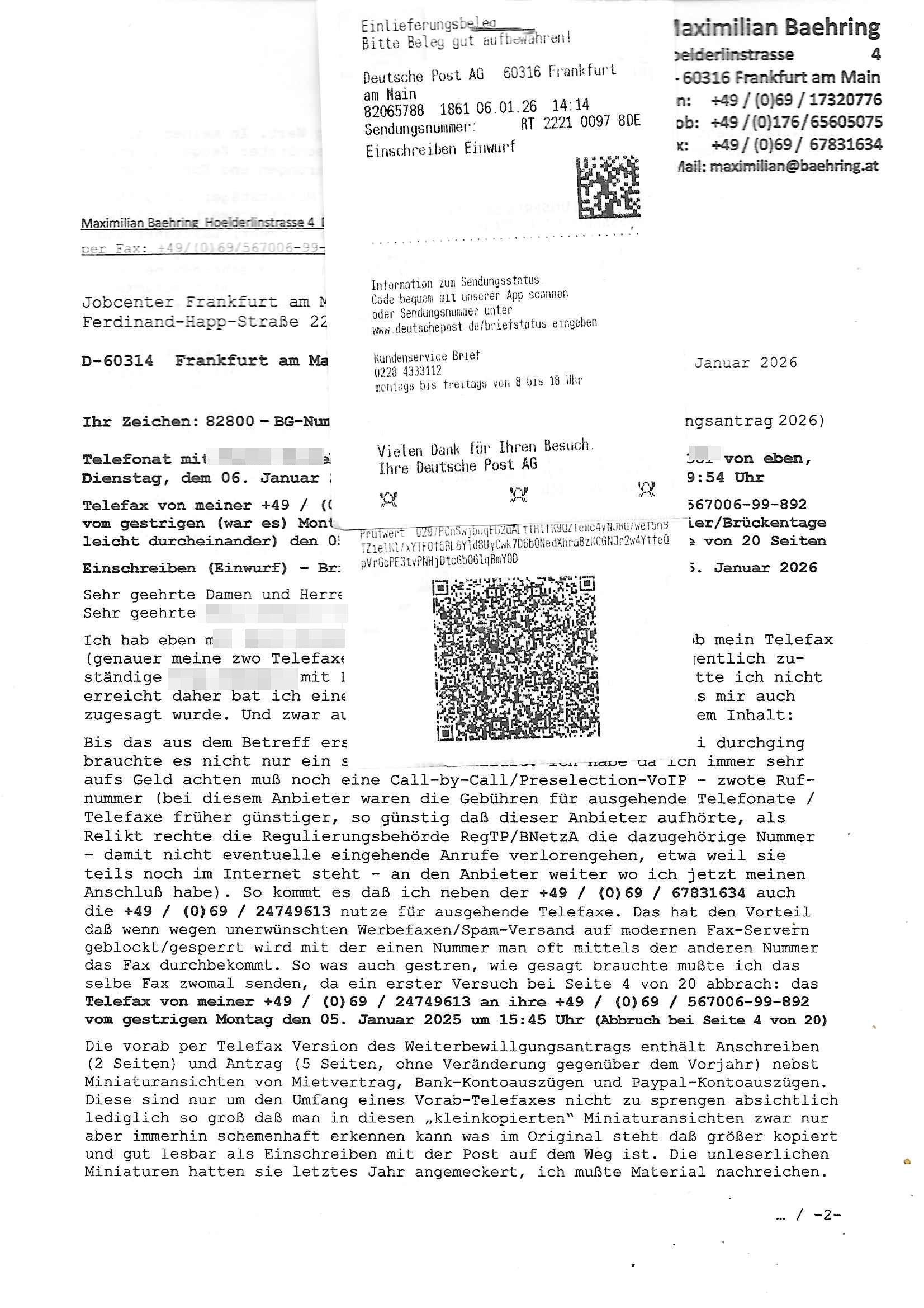 ( http://banktunnel.eu/pdf.php ) Maximilian Baehring Hoelderlinstrasse 4 D-60316 Frankfurt/M vorab per Fax: +49/(0)69/567006-99-892 Jobcenter Frankfurt am Main Zentrale z.Hd. Herrn/Frau D***k/Frau G***l Darmstädter-Landstraße 119-125 D - 60598 Frankfurt am Main Frankfurt am Main, 29. Januar 2026 Ihr Zeichen: 8KRM - BG - Nummer: ****( Kundenummer: *** ) antwortend auf Schreiben vom 11. Januar 2026 mit „mein Zeichen RN1899474“ Ihr Schreiben „Ihre Nachricht vom 11.01.2026“ datiert auf „22. Januar 2026“ frankiert am 27. und hier eingegangen heute, 29. Januar 2026 ca. 13:45 Uhr u.a. „Telefonproblem“, 1 Blatt (nur vorderseitig, farbig, bedruckt), 1 Seite Sehr geehrte/r Herr/Frau D***! Letztmalig am 18. Januar 2026 hatte ich mit ihrem Hause Kontakt, von 08:54 Uhr an diesem tage daiert mein Telefax an ihre Frau Behrami +49/(0)69/567006-99-892 der 18. Janaur 2026 war ein Sonntag an dem die Postfilialen geschlossen waren. Als Einschreiben (Einwurf) ging der vorab per faxe gesendete Brief somit erst am 19. Januar 2026 an sie herus die Nummer der Sendung ist RT 2557 6110 9DE. In ihrem Schreiben datiert 22. Januar 2026 von einer „Frau Gunkel“, unter-schrieben von Herren/Frau? „Uli Dvorak“ beziehen sie sich im ersten Absatz auf ein Sciben das sie von mir am 12. Januar 2026 per Telefax erhalte hätten aber ich muß dazu mittelöen daß es vom 12. Januar 2026 keinerlei Telefax an Sie gegeben hat. Am 12. Januar 2026 geing lediglich um 18:41 Uhr eines an die Bundesagentur EDV/IT in Nürnberg heraus Gegenstelle: +49/(0)911/1794405. Ansonsten habe ich am 12. Januar 2026 um ziemlich exakt 09:00 Uhr in der Ferdinand-Happ-Straße 22, 60314 Frankfurt am Main am Empfang das Schieben nochmal abgegeben was ich am Vortag, den 11. Januar 2026 um 16:08 Uhr schon per Fax an die +49/(0)69/567006-99-892 versendet hatte. Ich hatte eine Kopie de Schreibens direkt nach Nürnberg gesendet in der Hoffnung jemanden zu erreichen der für die EDV/IT zuständig ist. Schon am 18. Januar 2026 hatte ich bemängelt daß es ein DIN5008 Diktatazeichen (damals noch „RN1899474“) mit Nummer „1899474“ in meiner Korrespondenz mut Ihnen nicht gibt. Allerdings hatte mich Ende 1998 mal ein Gewerkschaftsmafia Truppe zu erpressen versucht Sekretärinnen einzustellen als man mir aufzwinge wollte mit meiner EDV Firma für die EZB an getürkten Ausschreibungsverfahren teilzunehmen. Man hat mich mit einer bedrohten schwangeren Freundin und später dann per Kidnapping zu erpressen versucht. Meine Mutter arbeitete früher im Bundesverband der Wach- und Schließgesellschaften (Arbeitgeberverband Bankensicherheit) als Chefsekretärin, ich war Abgeordneter/Politiker, Redakteur einer Zeitung in Bad Homburg wo die RAF die gepanzerte Limousine des Vorstand der deutschen Bank Herrhausen in die Luft jage die baugleich auch ich benutzt habe und EDV Unternehmer, hatte mit Baken EDV Recherchen bei der Terrorabwehr tun. Amerikanische Nachrichtendienste haben bei mir ne Hausdurchsuchung gemacht um an Ergebnisse meiner Recherchen zu kommen zusammen mit dem 3sat/ZDF Fernsehen Mainz (Redaktion Kulturzeit Christian Metz), man hört per Gerichtsbechluß mein Telefon ab. Daher bin ich vorsichtig. | |