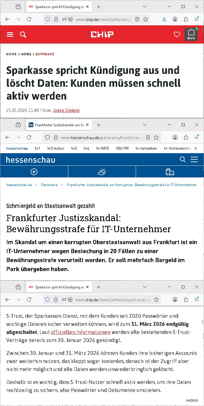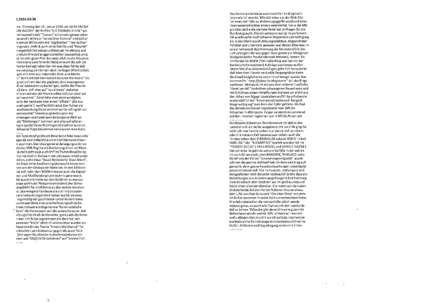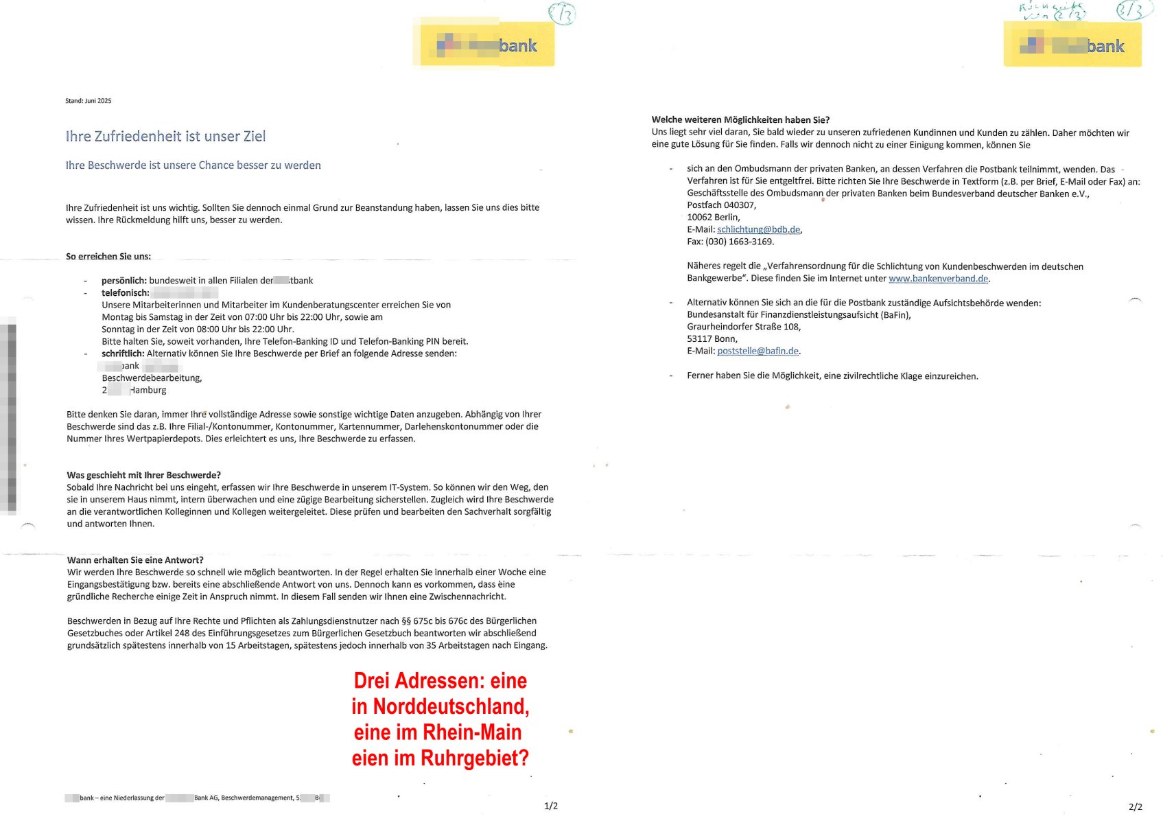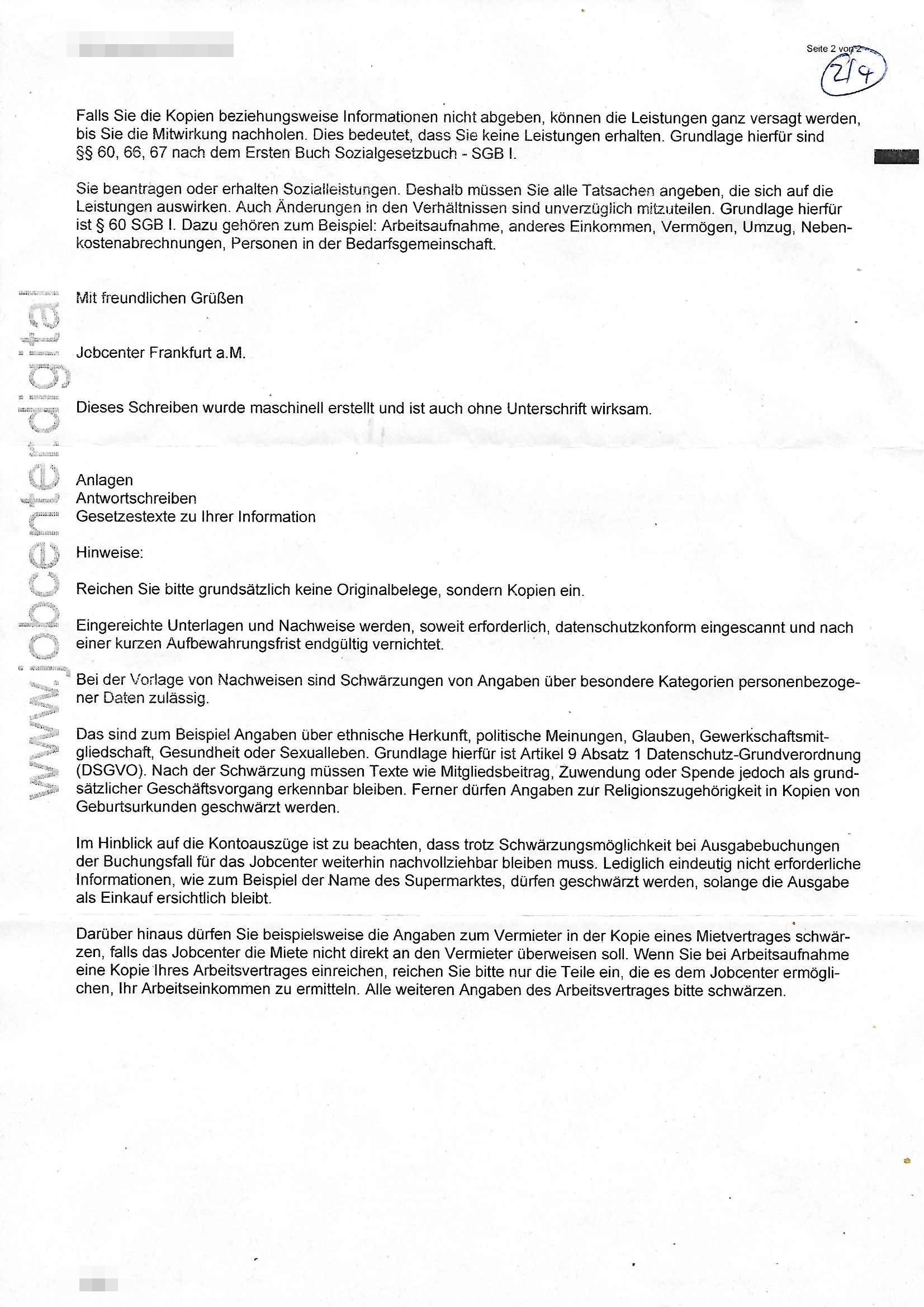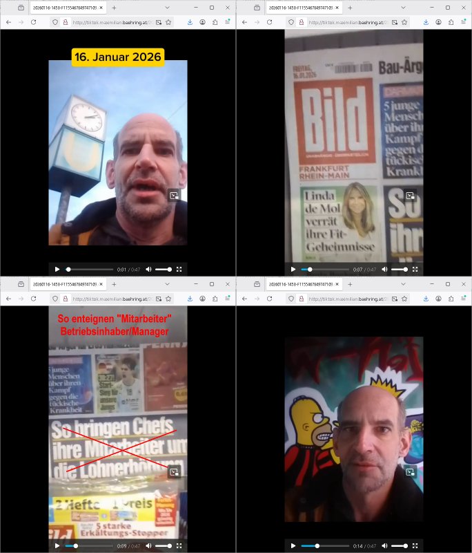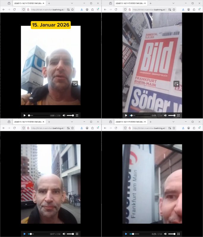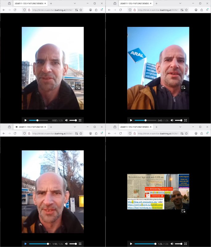 ( http://banktunnel.eu/pdf.php ) Maximilian Baehring Hoelderlinstrasse 4 D-60316 Frankfurt/M vorab per Fax: +49/(0)69/567006-99-892 Jobcenter Frankfurt am Main Zentrale z.Hd. Herrn/Frau D***k/Frau G***l Darmstädter-Landstraße 119-125 D - 60598 Frankfurt am Main Frankfurt am Main, 29. Januar 2026 Ihr Zeichen: 8KRM - BG - Nummer: ****( Kundenummer: *** ) antwortend auf Schreiben vom 11. Januar 2026 mit „mein Zeichen RN1899474“ Ihr Schreiben „Ihre Nachricht vom 11.01.2026“ datiert auf „22. Januar 2026“ frankiert am 27. und hier eingegangen heute, 29. Januar 2026 ca. 13:45 Uhr u.a. „Telefonproblem“, 1 Blatt (nur vorderseitig, farbig, bedruckt), 1 Seite Sehr geehrte/r Herr/Frau D***! Letztmalig am 18. Januar 2026 hatte ich mit ihrem Hause Kontakt, von 08:54 Uhr an diesem tage daiert mein Telefax an ihre Frau Behrami +49/(0)69/567006-99-892 der 18. Janaur 2026 war ein Sonntag an dem die Postfilialen geschlossen waren. Als Einschreiben (Einwurf) ging der vorab per faxe gesendete Brief somit erst am 19. Januar 2026 an sie herus die Nummer der Sendung ist RT 2557 6110 9DE. In ihrem Schreiben datiert 22. Januar 2026 von einer „Frau Gunkel“, unter-schrieben von Herren/Frau? „Uli Dvorak“ beziehen sie sich im ersten Absatz auf ein Sciben das sie von mir am 12. Januar 2026 per Telefax erhalte hätten aber ich muß dazu mittelöen daß es vom 12. Januar 2026 keinerlei Telefax an Sie gegeben hat. Am 12. Januar 2026 geing lediglich um 18:41 Uhr eines an die Bundesagentur EDV/IT in Nürnberg heraus Gegenstelle: +49/(0)911/1794405. Ansonsten habe ich am 12. Januar 2026 um ziemlich exakt 09:00 Uhr in der Ferdinand-Happ-Straße 22, 60314 Frankfurt am Main am Empfang das Schieben nochmal abgegeben was ich am Vortag, den 11. Januar 2026 um 16:08 Uhr schon per Fax an die +49/(0)69/567006-99-892 versendet hatte. Ich hatte eine Kopie de Schreibens direkt nach Nürnberg gesendet in der Hoffnung jemanden zu erreichen der für die EDV/IT zuständig ist. Schon am 18. Januar 2026 hatte ich bemängelt daß es ein DIN5008 Diktatazeichen (damals noch „RN1899474“) mit Nummer „1899474“ in meiner Korrespondenz mut Ihnen nicht gibt. Allerdings hatte mich Ende 1998 mal ein Gewerkschaftsmafia Truppe zu erpressen versucht Sekretärinnen einzustellen als man mir aufzwinge wollte mit meiner EDV Firma für die EZB an getürkten Ausschreibungsverfahren teilzunehmen. Man hat mich mit einer bedrohten schwangeren Freundin und später dann per Kidnapping zu erpressen versucht. Meine Mutter arbeitete früher im Bundesverband der Wach- und Schließgesellschaften (Arbeitgeberverband Bankensicherheit) als Chefsekretärin, ich war Abgeordneter/Politiker, Redakteur einer Zeitung in Bad Homburg wo die RAF die gepanzerte Limousine des Vorstand der deutschen Bank Herrhausen in die Luft jage die baugleich auch ich benutzt habe und EDV Unternehmer, hatte mit Baken EDV Recherchen bei der Terrorabwehr tun. Amerikanische Nachrichtendienste haben bei mir ne Hausdurchsuchung gemacht um an Ergebnisse meiner Recherchen zu kommen zusammen mit dem 3sat/ZDF Fernsehen Mainz (Redaktion Kulturzeit Christian Metz), man hört per Gerichtsbechluß mein Telefon ab. Daher bin ich vorsichtig. | |