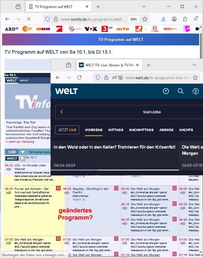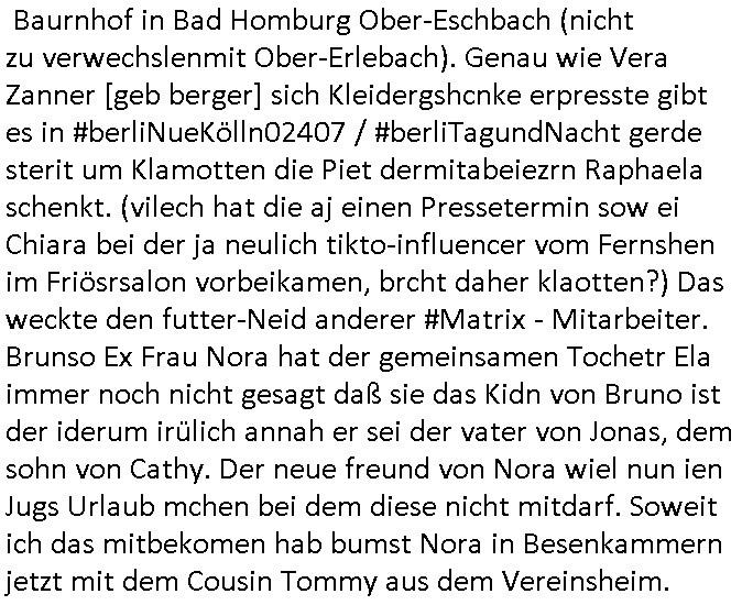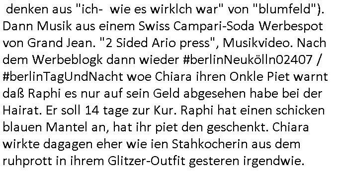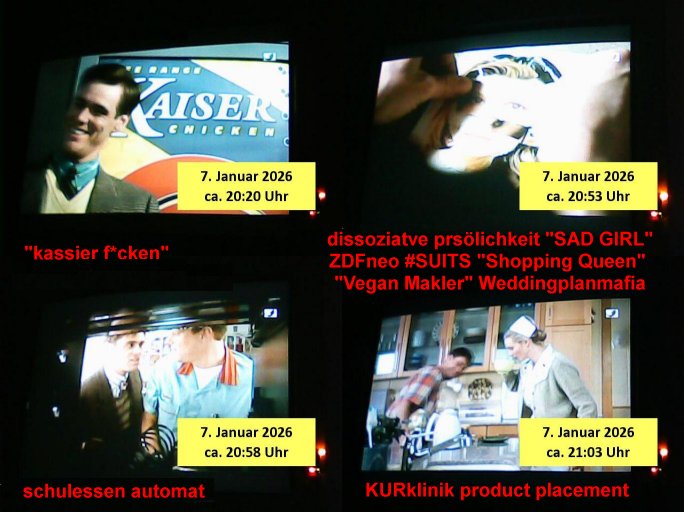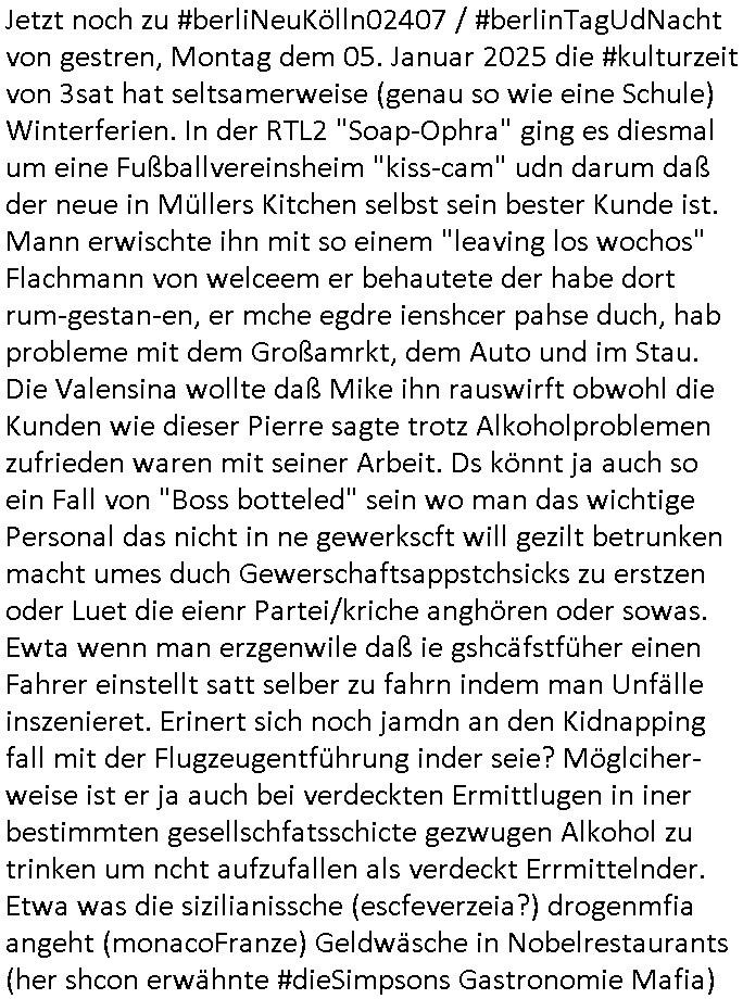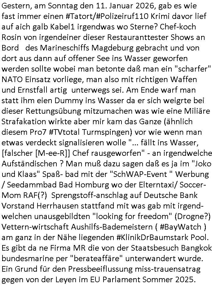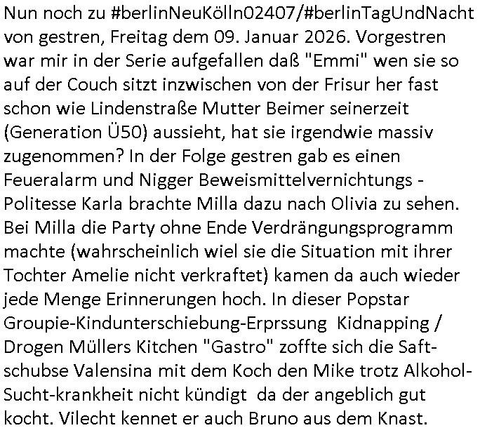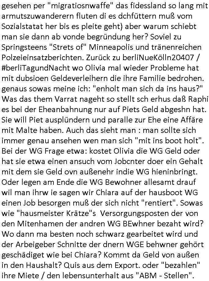 vom Skifahrn in den Bergen. Danach "Dnaile Sporri" eine Aussteluing "wenn alle künste untergehen" Gefolgt von einem Theaterstück "Hölle auf Erden". Es folget ei lager beeitrag üer den schauspieler/Regisseur/Drehbuchautr "Florian David Fitz" der in "Doctors Diaröh" mitgespielt hatte. Er hate ach ien Film zu "Tourette" gemacht und zu Gendergaga "Transsexualität". Dann folgte ien Song von "Bruce Sprgtseen" "Strest of" (diesesmal) "Minneapolis". In ihm gings um die Abschiebebehörde ICE Schießereien. Ich wieß ja nciht wie es mitder Wherpflicht aussieht in den USA aber mich wundert immer daß man Ausländer die sich hier teils vor der Wehrpflicht in ihrem heimat - land drücken beeisent und es normal findet ddaß die einheimischstämmgen ihren Kopf klagalos hinhalten. Man hat da etwas aus dem Blick verloren daß "über-läufer" wen sieien assbekomencuh Wehrpflichtig werden. Wenn man von BRD Duschne jahzstelang verlangt hat auf DDR Dusche zu shcißen dann fidne ic hta man damit aufdeben seitn des füheren "eisern vorhangs" die Frag eidsutg betsorte ob e zumtbar ist sogar auf die eignen lands-leute/satmme-"blutsbrüder" zu schießen. Ich hab da also ein Problem mit daß man Abschiebungen mit de rgfahr zu Tdoe zukomendaduch und Eirücken zum Wehr-dienst so stark unterschiedlich bewertet. Also fremd- stämmige Opfer besre bahdetl als den eignen Nach-wuchs. Ih frag mich ob das was damit zu tun hat daß man so der Gestiet sidflisetre irgendwelche Überläufer schützen will. Nach dem Motto "verrätst du als fremd-stämmiger dein land oder die auslädschen streitkräfte denendeu naghört hast an uns shützen wir dich als für unsre Site wertvolle Spionage Informtaionsquelle um jeden preis". Wenn ich also das Drama um von Militärs oder pOlize gestürmten Häuser sehe damn interessiert mich immer rorragig auf wessen Seite derjemige steht der da "agolt" wird. ist das ien "trump anhänger" der beim "sturm ausf Kapitol" dabei war, "reichsbürger" artig und damit ein "Patriot" der nicht unbedingt was böses im Schilde führt oder ist es ein kommuistoscher Saboteur. Ich ifnd es ist stchdiend zu klären aufwlcher site die luet stehen die wir ins land lassen. SInd das alles Kapitalsten? Demokraten? Let die ebrist wäre usner ladn gegns iens Feinde - ire landlsute - zu ervetfegn mit uns zusammen? Ich eriner da mal anden Fall des übergelaufen russischen Heli-Piloten asudemUkrien krieg den Rotemrist Greif-trupps in Portugal aufspürten und erschossen "weil er zu viel übe rmiläropetioen wusste / redete" nehm ich an. Wri habn glücklcerise eine Ausenandersetzung zwischen Rotarmsiten und ehemalige Waffebrüder alos DDR-NVA Soldaten vermeiden können bisher asl Zerreisprobe der Osterweiterten NATO/Budeswehr. Wenn man fiem wei "air force One" sieht udnsich dann nahört das "Kanzler Merz" Privatflugzeg angegriffn wurde von "Terroristen" asu dem Klim-Umfeld zetnah zu den Sabotageakten an der Stromversogung Berlins dann stellt ich die frage wie verlässlich und stabil könnte man sich gegen Sutauine shcützenwie eben den "surmf auf Kapitol" durchaus. Ob Merz sich gegen "richbüerge Sympathisanten" uter sien Bodguards / im Generalstab durchsetzen könnte wnn es zu einem ( etwa kommunistischen ) Putsch käme. Putin schürt ganz offen einen Bürgerkrieg in (ost-)Europa, er verscht die poltschen Lager udn Geznen aus der Zeit vor dem Mauer-fall wieder herzustellen und imWetsn boden gut zu machen was die russische Einflussphäre angeht. Er verhct sogar die Nato zu spalten und etwa Deutschland in ein neues "ost-Bündnis" ählch eienr "Warschauer Pakt" - Wetserterung zu integrieren. Und wenn dann die dafür zustädgen Behörden mal genauer hinschauen ob dieluet die zu uns komen udn asyl beantragen nicht Spione sind die man bessr shcbet, dannfide ich die berichterstattung üer die ICE - Asbchibepolizei Einsätze zu "pauschal". Es knnet aj auch sien daß man "Strom-Terroisten" abschiebt die asl Saboterue für Puins Kommusten gearbeitet haben. BI denjegen die inländer sind kann man es sich nichta ussuchen aber bei zuderern sollte man die "gesinnung" prüfen, obsie für unsere manshchaft sind oder die im uns shlistenflls feindlch gesinnten Herkunftsland. Ein Reichs-bürger/rchtsrdikaler Hooliganist für denwetsuropäre ungefährlich weil patriotisch. Wir lege da den fokus dehr daraf daß wir so tun als seien alle ausläder die "aus grüden" abgeschoben wrden pauschal immer nur "gute menschen die dem ladn nicht schaden" (ach wirscftlcih gesehen per "migratiosnwaffe" das fidessland so lang mit armutszuwanderern fluten di es dchfüttern muß vom Sozialstatat her bis es pleite geht) aber warum schiebt man sie dann ab vonde begründung her? Soviel zu Springsteens "Strets of" Minneapolis und tränenreichen Polzeieinsatzberichten. Zurück zu berliNueKölln20407 / #berliTagundNacht wo Olivia mal wieder Probleme hat mit dubsioen Geldeverleihern die ihre Familie bedrohen. genaus sowas meine ich: "enholt man sich da ins haus?" Was das them Varrat nageht so stellt sch erhus daß Raphi es bei der Eheanbahnung nur auf Piets Geld abgeshn hat. Sie will Piet ausplündern und paralle zur Ehe eine Affäre mit Malte haben. Auch das sieht man : man sollte sich immer genau ansehen wen man sich "mit ins boot holt". Bei der WG Frage etwa: kostet Olivia die WG Geld oder hat sie etwa einen ansuch vom Jobcnter doer ein Gehalt mit dem sie Geld ovn außenehr indie WG hieninbringt. Oder legen am Ende die WG Bewohner allesamt drauf wil man ihrw ie sagen wir Chiara auf der hausboot WG einen Job besorgen muß der sich nicht "rentiert". Sowas wie "hausmeister Krätze"s Versorgungsposten der von den Mitenhamen der andren WG BEwhner bezaht wird? Wo dann ma besten noch schwarz gearbeitet wird und der Arbeigeber Schnitte der dnern WGE behwner gehört geschädiget wie bei Chiara? Kommt da Geld von außen in den Haushalt? Quis aus dem Export. oder "bezahlen" ihre Miete / den lebensunterhalt aus "ABM - Stellen". https://tvinfo.de/fernsehprogramm/2290042151-d