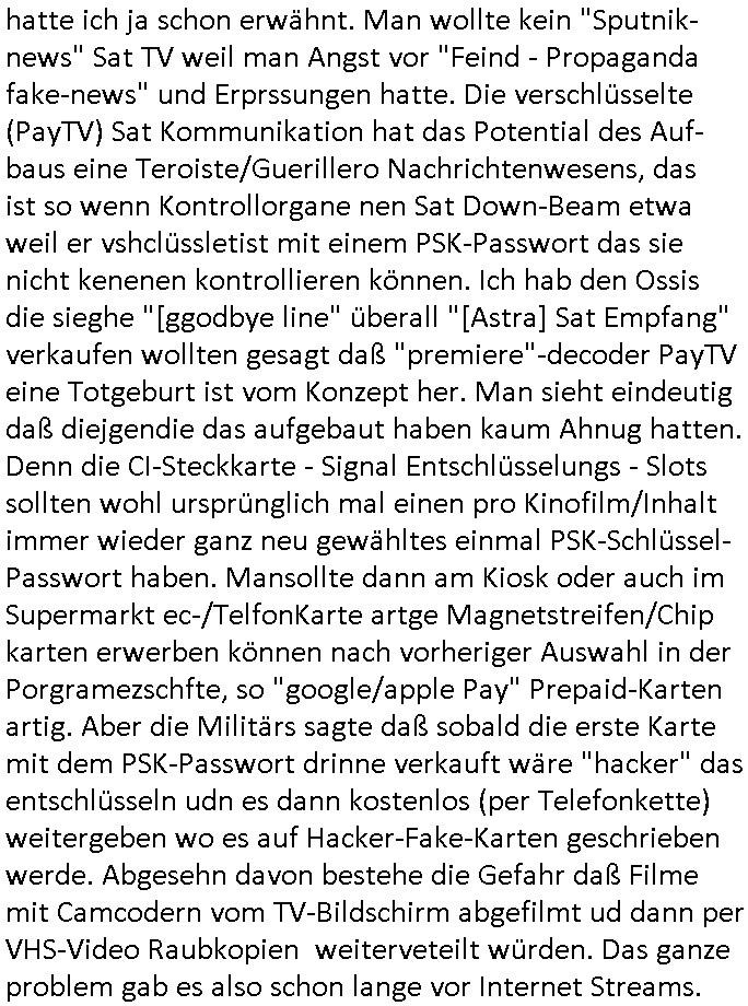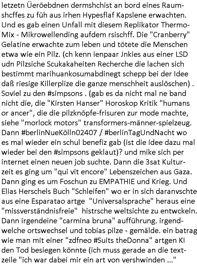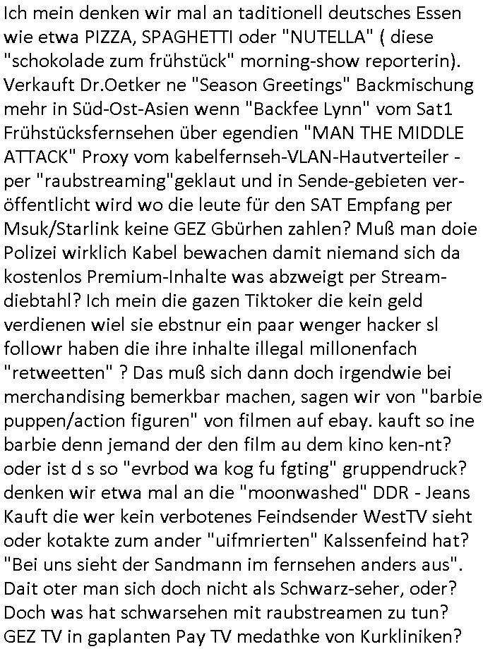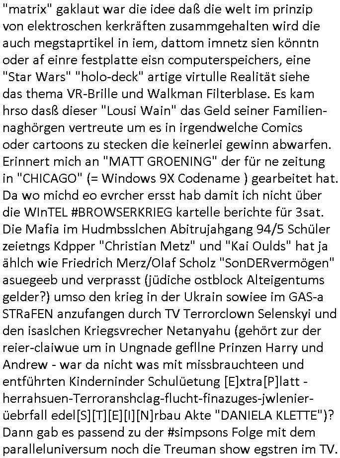 Wen man sieht wie särge in Frachträume galden werden am flughafen, vielleocht erinert sich noch jamdn an die diesbezüglichen Bemerkungen von mir auf dem presse-meeting im Shcüerztusgüro tewa zur Zeit des Mauerfalls. Diese "Musical HAIR" Filmszene "LET THE SUN SHINE IN" auf dem Flughafen. Wir hatten darüber geredet wegen dieser "GOOD MORNING STARSHINE" Kriegs-Reporter. Als wird die "A10 - Thunderbolt" Panzerknacker Fotos und die von der Verladung von "Atomwaffen-träger-systemen" bekommen sollten die abgefangen wurden. (Nicht abspielbare MP3 Datei auf nem iPod-Walkman). Wo es darum ging daß es kein deutschen Tornados sind die Belgrad bombardiert haben sondern wenn britische. In etwa zu der Zeit als #realityBites entstanden ist und #wagTheDog. (Da hatte ich mal irgndwas mit so einer vampyre records firma am Frankfirter hauptbanhof zu tun neben der AIDS-Hilfe, ggebüer ist ein Rockertreff). "Petsi Hohls" der "Booker" des "Gambrinus Musiklokal" (wo "Andrea Ressler" mal gearbeitet hat bevor sei den Hexenkessel amchte) am bad Homburger Fürstbahnhof hatte damals swot sich entsinne mit dem Bruder von Schülerzeitung "Monstermüsli" Autorin "Biggi" Braun irgendne Plattenfirma. Die wollten wie bei Grönemeyer musikvideos auf CD pressen zu einer zet wo noch nicht sicher war welcher Codec-Sandrad/MP4 sich duchsetzt. Damals waren Mutimedia Mixe-mdoe CD Bewegtsvideos rechenleistung ohne spezielle beschleunigerhardware bedingt 320 x 200 noch etwa Breifmarkenformat groß. Udn ikch riet dazu sowas wie youtube casting-shows zur nchschsfpderung aufzumahcn damals in der Redaktion. Die Debatte drehte sich um DRM - Endgeräte / Zensur und um Fan-Intermeforen-Communities. Nur weil wir das Thema "Rchenzentrum Bewchung" streiften. (Wenn man das Sat1 füshtsücskTV beim IP-geoblocking JOYN abfilmt per Webcam vom Schirm und die Moderatorin UNVERSCHLEIERT im IRANischen scoial Media Internet auftaucht per eMule/Dokey Tauschbörsen-Raubstream. Wir erinnern uns: "THE SUN ALWAYS SHINES ON TV" die "you are watching channel FREE" wie in DREI-sat aber auch in "FREE beer" Morning-Show Musiksendung. der ESCHATOLOGISCHE (WELT.tv) "ICH WAR DABEI BERICHT". ( "Sarah Hazel drink and schmink" / "Blumfeld - reflecting skin" respektive "Kelly Clarksons - since you been gone", und auchdie "online hate oma (80)" ketchup - expertin) Jedenfalls ging es dann noch um den "letzten ausweg: Hausnotruf", marge war eingesperrt, amazon ALEKSA hatte sie gekidnappt bei einem "Koch Duell" so ähnlich wie diese "Weihnachtbäckerei" Sendung mit "Marlene Lufen" "das große Knorr kochstudio backen" oder sowas es gab bei Böhmi "SAlaT von der ISS". Und kaum daß Böhmermann Alein Food gegessen hatte das ging es los daß alles gaz seltam wurde auf der Welt/im Fernsehen. Cooro udnsow. Ob es da einen Zusammenhang gibt? Womit wird dann wider bei den siposn waren wo die letzetn Üeröebdnen dermshchist an bord eines Raum-shcffes zu füh aus irhen Hypesflaf Kapslene erwachten. Und es gab einen Unfall mit diesem Replikator Thermo- Mix - Mikrowellending aufdem rsischff. Die "Cranberry" Gelatine erwachte zum leben und tötete die Menschen etwa wie ein Pilz. (ch kenn ienpaar Jnkies aus einer LSD udn Pilzsiche Scukakaheiten Recherche die lachen sich bestimmt marihuankosumabdinegt schepp bei der Idee daß riesige Killerplize die ganze menschheit auslöschen) . Soviel zu den #simpsons . (gab es da nicht mal ne band nicht die, die "Kirsten Hanser" Horoskop Kritik "humans or ancer", die die pilzknöpfe-frisuren zur mode machte, siehe "morlock motors" transformers-männer-spielzeug. Dann #berlinNueKölln02407 / #berlinTagUndNacht wo es mal wieder ein schul benefiz gab (ist die idee dazu mal wieder bei den #simpsons geklaut)? und mike sich per internet einen neuen job suchte. Dann die 3sat Kultur- zeit es ging um "qui vit encore" Lebenszeichen aus Gaza. Dann ging es um Foschun zu EMPATHIE und Krieg. Und Elias Herschels Buch "Schleifen" wo er in sich daranvschte aus eine Esparatao artge "Universalsprache" heraus eine "missverständnisfreie" histrsche weltsichte zu entwckeln. Dann irgendeine "carmina bruna" aufführung. irgend-welche ortswechsel und tobias pilze - gemälde. ein batrag wie man mit einer "zdfneo #Suits theDonna" artgen KI den Tod besiegen könnte (ich muss gerade an die text- zeile "ich war dabei mir ein art von vershwinden ..." denken aus "ich- wie es wirklch war" von "blumfeld"). Dann Musik aus einem Swiss Campari-Soda Werbespot von Grand Jean. "2 Sided Ario press", Musikvideo. Nach dem Werbeblogk dann wieder #berlinNeukölln02407 / #berlinTagUndNacht woe Chiara ihren Onkle Piet warnt daß Raphi es nur auf sein Geld abgesehen habe bei der Hairat. Er soll 14 tage zur Kur. Raphi hat einen schicken blauen Mantel an, hat ihr piet den geschenkt. Chiara wirkte dagagen eher wie ien Stahkocherin aus dem ruhprott in ihrem Glitzer-Outfit gesteren irgendwie. https://tvinfo.de/fernsehprogramm/2290042400-die-simpsons https://tvinfo.de/fernsehprogramm/2290042409-die-simpsons https://tvinfo.de/fernsehprogramm/2269348005-kulturzeit | |