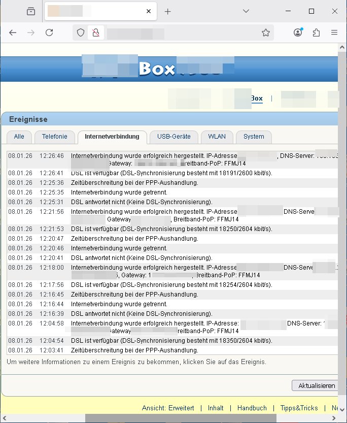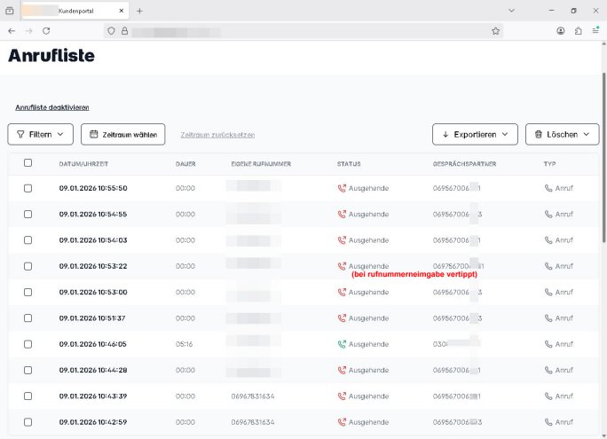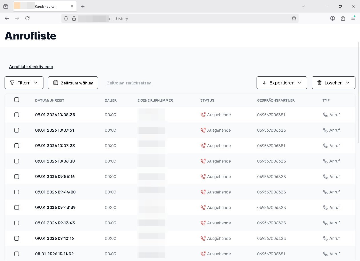 Datum Name / Rufnummer Dauer (hh:mm) 02.01.26 05:50 110 0:04 02.01.26 05:50 06975510100 0:01 02.01.26 05:50 06975510500 0:01 | |
