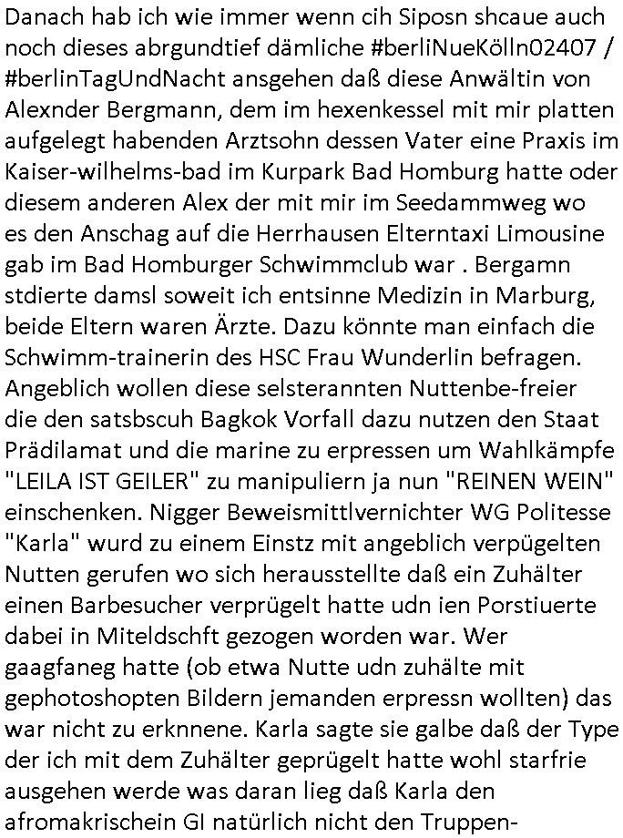 | Es reicht nicht nur daß sie einem die ererbten Ost-Immo-bioien wegnehmen wollen die Nigger-Kommisten Folter ("is it a cime" Sadistin Mona Offergled und Judparlament Waisenhaus-Sammy [great Phatsby Turhsuhmafia] und Drogendealer Fitz Ducary Bad Homburg die die "refugees welcome" kampagne für Ostpreussen Rückkehrer zur fremdtsämmge Asylbetrüger Rotarmistn Terroristen Saboteure Anwerbenkamapgen umdichteten) "rache für Rassmsu" Psycho-terror-folter geht prompt weiter. Man schafft HartzIV/Alg2/Bürgergeld ab und sankitoniert die Leute die wie ich per Blog die Presse up to date halten üer folter (Gutsl Mollath, Magnus Gäfgen, rEward Snow-[white]dent, Muriot Nazikur) Opfer weiter Stasi artig in FOLTER-Klinken sperren um sie weiter sadistischst quälen udn zwangsumsiedeln zu können in einen angeblichen "Zeugenschutz" der nur der bereicherung einer meist fremd-/oslcokstämmigen Helfermfia dient (wie etwa die harte Drogen konsumeirnden Krankeschwester Roljic). Das Stasi artge zu Toder foltern von fiden der korruten Eliten (siehe Polizeu EDV Beschaffsungsskandl inden mdien und Rzaia ggen Polizsten, Verurtielung von Staats-anwälten [wem nutzt die, Terroisten/Mafia]) geht weiter. Die neu "Grundsicherung" bekommt nur noch wer sich von selsbternnetn (gesrt Postel)"mediziner" foltenr lässt. Wer sich nicht foltern lassn oder in den krieg ums öl/gas im Kaukasus ziehen der mus verhungern wenner wie ich Regimekritiker (politiker/blogger/linksexterisches cbyer-