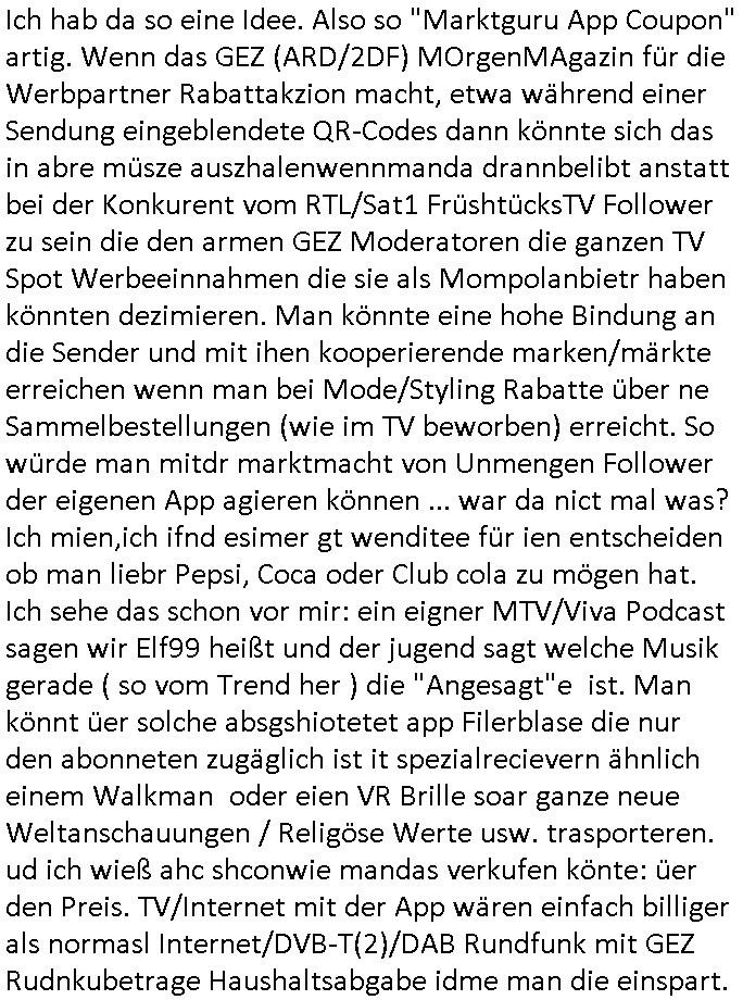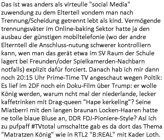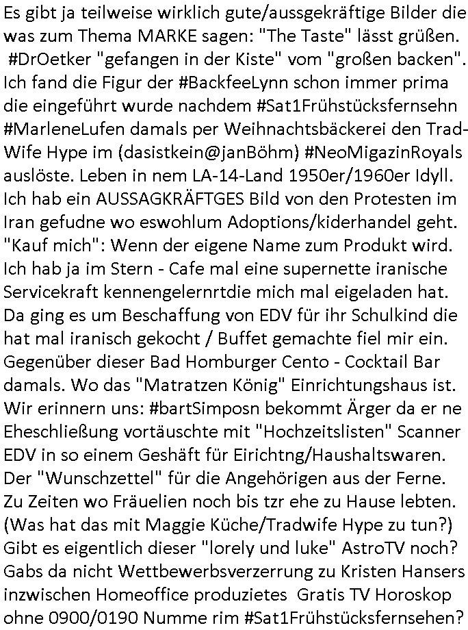 Automaten oder der Küche glaub ich oder so. Und ich sage asl klie kdie es gibt kein coke mehr nur noch Pepsi weil die den Vertrag geändert haben, da war ich dabei. Und da hat amn denkdern erkärt was Konkurenzkampf um Marktanteile ist. Ein Promi(?) Kind wollte Monopole schaffen wiel es nicht denuschide zwischen ständigem wettbewerb am amrke verstand udn so einer Art von "the winner takes iat all" Endsieg eine, Ausscheidungs-wettbwerb (Auscheidung wei Sportwettkapf-Finale nicht verchslen mit Cliparts zum ausschneiden aus Schüler-zeitungs-Layout-Schnippelbüchern ählch der Erpresser- briefe die kinder beimbsucshtierben lernen aus BILD - zeitungs bucshtaben die sie ausschnitten "scrabbelten"). Siehe "Scrabble" in "Sting and the Police" "Seven days". Udn die wollte dei frage McDoanlds versus Burger-King und "Kentucky Fried Chicken" per "Sammelbestellung"s "flash mob"s "Monopol"y klären indem sie per Telefon-kette gezilt zu Produktboykotts bstier marken aufrief. Und ich hab ihr gesagt das sei "schummeln" gehe nicht. Denn ein System wo sch am ende nur eine marke in ner art Sportwettwerb aufdemsirgterpüechen durchsetzt das nhem dem endkduendie WAHL-FREIHEIT ! Und s bagriff diencht wedie aus Asiens?-Ostblock kamen glaube ich. Sei dchte es gehe darum ein art Blidverksotung oder sowas zu machen im mcDondls TV-spot mit Stromberg. Das ist auch der Grund warum man "Moonwashed" Jeans trug inder Ostzone/DDR anders als im Westen. Siehe dazu "U. Plenzdorfs" "neue Leiden des jungen W.". Siehe "Du hast die Wahl" zwischen Hausmarke "Fanta4" und "PremiumMarke" Werbung von Supermarktketten. (Das ist der Unerschied Vollsortimenter zm Discounter: Discountr bedeutet quasi nur noch ein Eigen/Hausmarke Produkt zur Auwahl aber billiger, das ist Kommunismus). DA bsudte daß man an der Zahl dr coaSortan di es zur auswahl gibt wenn man imausldn utewges ist ablesen ann wie es umdie Marktfreiheit und Kartelle bestellt ist. Wir hab dasml extre einen Wirtschafts Porfessor geholt der denustchei zwschen Wiscftssissncaft in BRD und DDR erklärensollte woel die aus dem Ostblock das nicht kenen daß der satt für sie als vermelich unmündige und dumme konsumenten alles vorentscheidetsie Einparteiensystem. Dei wolltennicht glauben daß Überflusswirtschaft ttz der ineffizienz di in de rtehorei esthet wenn man von zwo Produkten die es zur Auswahl gibt im Regal am Ende nur eines kauft (womit sie mit dem irrglaueb alle habn den gslche geschmach annahmen daß dei andrene Pridukte adnn als unvrkäfich Ladenhüter im regsl stehenbeleiben) das wesltiche kaoitslschte Wirtschaftssystem (verteidigt gegn die tote Kommusten Gafhr duch die Nato Militärs) denncoh viel mehr wehlstnd genriert als diespereffkte die mah at wennmannur ien sorte im Regal stehen hat. Daß die kunst iMhdel darin besteht dem kuden seine Wünsche unasgspschen vonden augen abzuelsen und zu erfüllen daß kannten die drüben inder Form nicht. Srvicewüste dsuchalnd. Das ist eine "Mentalität"s-frage. Wer erfolgereich sien will muß dem andern dienlich sein. Im Westen muß man Wünsche/Bedürfnisse der anderen achten. "wer tinkegeld / f*ckn will muß freundlich sien". Dieses Trinkgeldgesicht aus "Gerhart Polt"s "Herr Ober". Daran (neben "wo waren sie am 31. Dezember 1999" / amtag als Kenned ershosn wurde ) musste ich gestren mittag denken im TV von "Abba" "Happy New Year" lief (ich glaube innme Film in dem Anke Engelke dem bürger- meister seienn Pillermenn aus der Hose holen sollte, ich weiß jetzt aber auch nicht mehr wie ich asusgschnet das von ForrestGump her darauf komme, wahrscheinlich ist das wegen "lecker Kaffetrinken mit der Beatrix" war da nicht auch irgendwas im TV Programm gestren?). --- https://en.wikipedia.org/wiki/Happy_New_Year_(song) war der song "happy new year" von "abba" irgendwo hier zu hören ? https://tvinfo.de/fernsehprogramm/2260871668-kurzschluss https://tvinfo.de/fernsehprogramm/2260871672-der-zweite-kurzschluss https://tvinfo.de/fernsehprogramm/2260871675-kurzschluss-hoch-drei | |