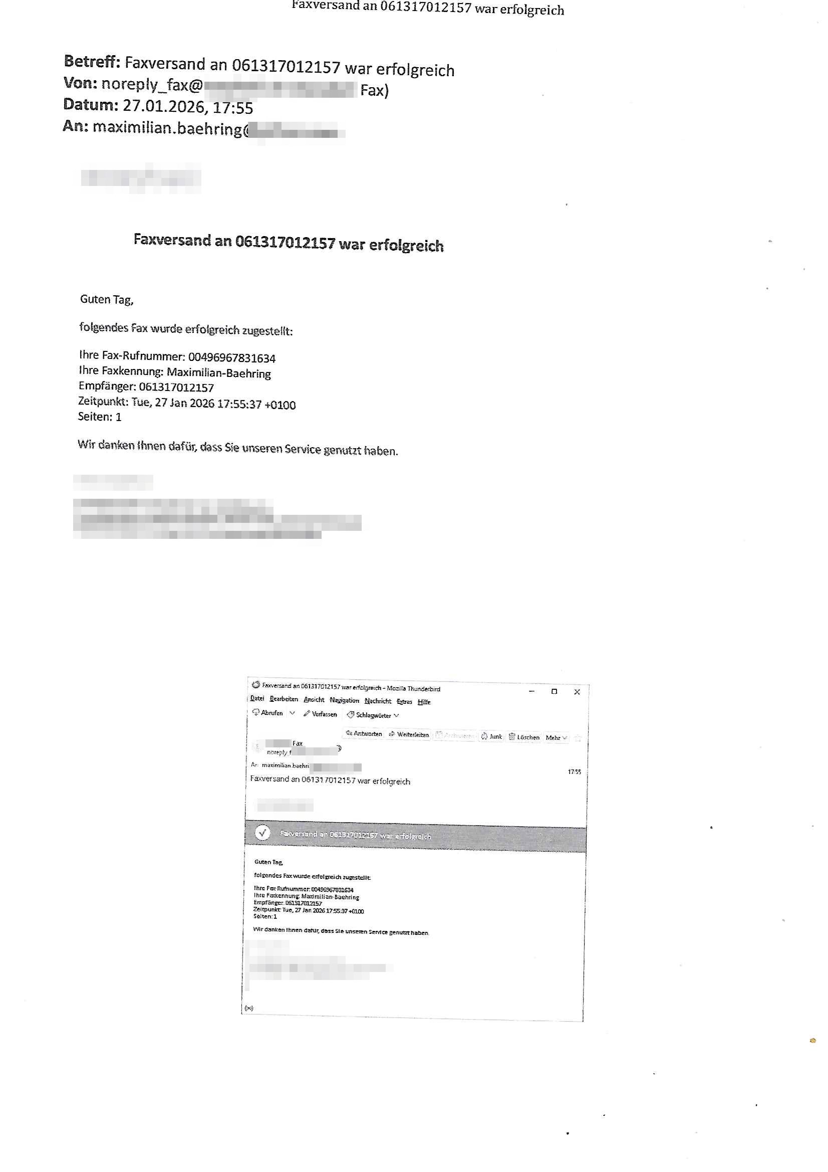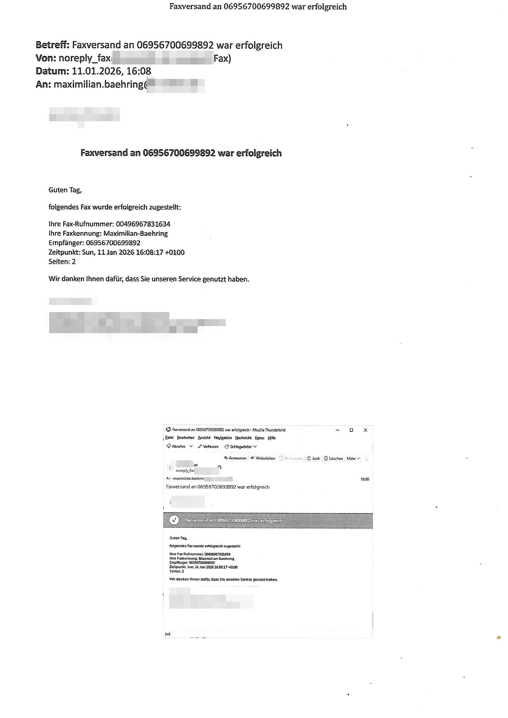 Betreff: Faxversand an 06956700699892 war erfolgreich Datum: Thu, 29 Jan 2026 17:25:53 +0000 (UTC) Von: Fax <noreply_fax@> An: maximilian.baehring@ Web2Fax Faxversand an 06956700699892 war erfolgreich Guten Tag, folgendes Fax wurde erfolgreich zugestellt: Ihre Fax-Rufnummer: 00496924749613 Ihre Faxkennung: Maximilian-Baehring Empfänger: 06956700699892 Zeitpunkt: Thu, 29 Jan 2026 18:25:53 +0100 Seiten: 1 Wir danken Ihnen dafür, dass Sie unseren Service genutzt haben. | |