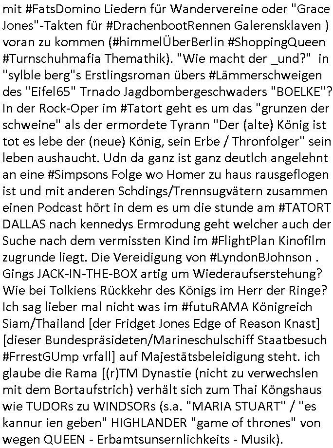 Herstellern WWW Flugunfalluntersuchungsdatenbanken. (Sitzen die noch an der Alten Oper Frankfurt am Main?) Daran daß mir "Mile" mal von kaputten Helis erzählt hat und dem Heliflugschien den "Felix" machte als wir uns über "Rotorways Exec" Bausätze unterhalten haben. Und das Thema mit der Umwandlung des Sportplatzes unter-halb der Erlöserkirche in Bad Homburg in ein Baugebiet. Wohin die U2 aus Gonzeheim verlängert werden sollte. Und dann wieder Botscaft Bangkok, Thailand. Deutscher Liederabend (siehe heinz rudolf kunze posting) oder so. Analog zu Alfrd Hitchcoks "der mann der zuviel wusste". Wo es um diesen "Amadeus" Kinofilm geht wo Mozart sein eigens Requiem schreibt und sein Kokurrent Salieri im Irrenhaus erzählt wie er dort gelandet ist. Und dann wieder die #Simpsons der Podcast vom Tode kennedys. Ich hatte ja angefragt warum der dsuche bundpräsident in Bangkok im Krankenhaus war beim marineschulschiff Besuch. Das hab ich jezt qausi als Plardois/post-It's an die Pinn-wand geklebt die dann mit rotem wollfaden mit-einander verwobe werden zu einem "bewegt Bild". So wie wnn man bei fukionaler magtresonaztomgrahie im CT menshcn "live" beim denken zusieht (ienguste bidl steht im Kopf zitierte die "kluager kopf" faz glaube ich mal kino-filmer "broccolli"?). die meisten dieser bilder udn tetxfragment hab ich im Kopf gehabt bei der Frage an die ZDF/3sat "Final Cut" Redaktion für Nachrufe wie sie in so kurzer Zeit nachdem jemand gestorben ist beim Spgrstffanschg inabd homburg einen Beitrag für dei TV Abendnachrichten produzieren können. "wenn man stirbt dann sieht man das gesamte leben nochmal als film an einem vorbei-ziehen" heißt es ja. un ich w llte wissen ob die da irgndwecleh "Bipic"/"dossier"s auf vorrat herum-ligen haben vorproduziert quasi, atrial das die schüler-zeitungen per geplantem WWW mitbenutzen könnten. Materialsammlungen zu eosn wie ein Wikipedia artikel. der Rgeriunsgchef/"hitler als mensch" (aus der Sicht seines Leibarztes) um es mit "hermann Ville (mit Accent auf dem E)" zu formuliern. wie komme ich jetzt darauf wegen diesem "20 tage" mit "Melania Trump" Film und diese "Cuba Krise" / "venezuela Öltanker Embargo". der "air foce one: hijacked" "friedrich merz - privatflugzeug" themathik ("george bush" als "stuhlkris kinderbuch vorleser" "mission accomplished") und "Bettina Wulff ud dIhr bodygard" Artikeln über die ich sprach? ich hab die security luete gefragt damals beim "sprengrsfftnschlag auf die bakvostand limousine in bad homburg" wie das denn aussieht, ob sie "jamand prominentes wird bald streben" mozart/salieri artig vorbereitungen treffen für den fall daß es "in the line of fire" artig mal schiefgeht mit dem personenschutz udnien Attentat nicht vereitelt werden kann. im blog irgendwo bei "they fade to grey" abagalget. cihw lt ja egslch heuet morgn mal in diesen "backstage" bereich beim sat1 fühstcülsfsrehn schauen ob es schon kritiken gibt zum "MELANIA (trump)" film. daher ging mir der "pet shop boys/minallei" "loosing my mind" song aus "follies" durch den kopf vorhin. und ich musste an die "30 jahr frühstücksfernsehen" denken. wo alle andern sender mit live schalten gratuliert haben. und ich hab mir noch so überlegt wie "die Gestalkte" "morning show" Moderatorin in dieser "backstage" kino Kritik über einen Film sprechen muß in dem ihr diese Rality "Aniston" (aus der happy meals packung) die show stiehlt. udn daß sich das ungefähr so anfühlen muss wie wenn man als "palmina merkel" sehr gute kinokritiken zu "#morningGlory" verkraften muss (das ist diese "fridget Jones" koch show , mit präsidntendarsteller "ford") die aus boulevardmagazinen und kuresndung kommen so ählöch wie be de rlive schate "30 jahre frühstücks-TV". Wenn Marlene eLufen die Kekse backt bei Böhmi im 2DF Neo migazin royals aber Kolegin karen heirichs dafür den ganzen Ruhm erntet. Und dann diese "Ketchupexpertin Stalkerin" von dieser "Sat1 Akte Sodnersedung" "Online Hate Oma (80)" getauft damals. Und die past überhaupt nicht in dieses Präsidentenbesuch / Weihanchtsbäckerei in der Kita Tham mit dem Heli und dem sicherheitshalber im frachtraum dermshcine mitfliegendem Sarg hinein. dieses "präsdient johnson" erdigung TV interview zu beginn des fatboy slim "bird of prey" videos vor diesem aufsteigen lassen der kampfjets währen der "cuba krise". diese sache mit dem "don't sop me now" "flugeuige einweisen" lichtschwert bei der afroamreikanerin mit #Simpsons Fatsby "diss rap" "rammstein" ritterrüstung. ich mienwiepackt mansowas um ien webrpause für den "mc donalds" chili-fastfoode das so scharf ist daß die (medizinisch begleiteten) testesser davon diese "es ist wirk-lich war" tränen in den augen haben? und jetzt ZDF TV Autorinnen bleistifte angespitzt: wie macht der Hund? https://www.mcdonalds.com/de/de-de/GermanyNewsroom/article/mcspicy.html https://decl-war.tumblr.com/post/143224309678/german-electronic-resist-ances-nuclear-football | |