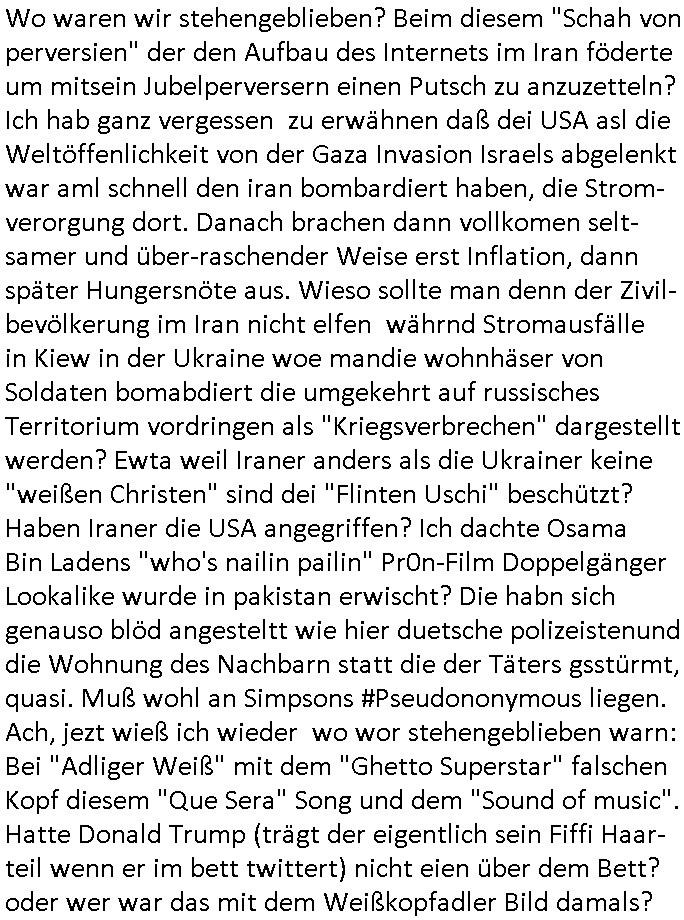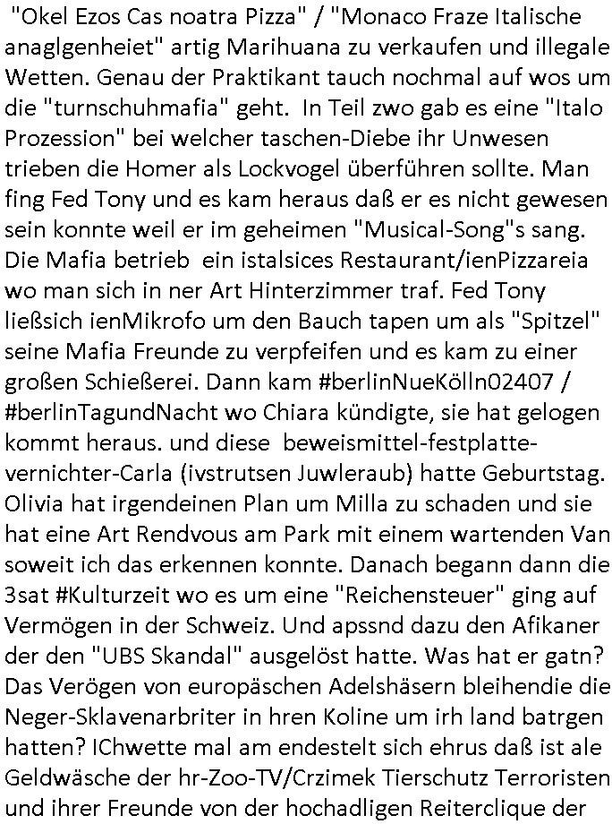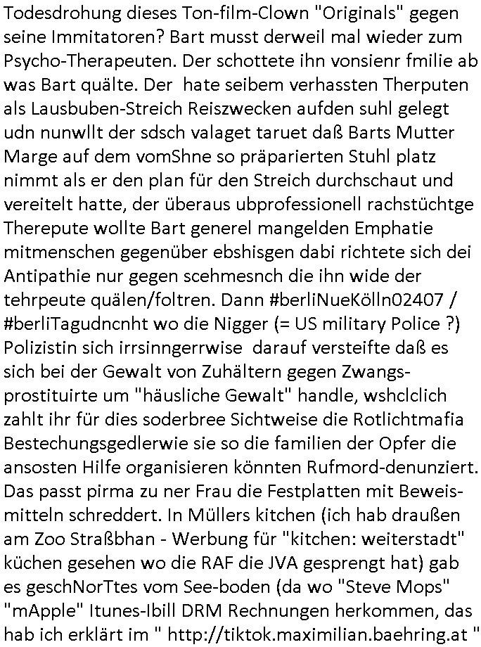 "Okel Ezos Cas noatra Pizza" / "Monaco Fraze Italische anaglgenheiet" artig Marihuana zu verkaufen und illegale Wetten. Genau der Praktikant tauch nochmal auf wos um die "turnschuhmafia" geht. In Teil zwo gab es eine "Italo Prozession" bei welcher taschen-Diebe ihr Unwesen trieben die Homer als Lockvogel überführen sollte. Man fing Fed Tony und es kam heraus daß er es nicht gewesen sein konnte weil er im geheimen "Musical-Song"s sang. Die Mafia betrieb ein istalsices Restaurant/ienPizzareia wo man sich in ner Art Hinterzimmer traf. Fed Tony ließsich ienMikrofo um den Bauch tapen um als "Spitzel" seine Mafia Freunde zu verpfeifen und es kam zu einer großen Schießerei. Dann kam #berlinNueKölln02407 / #berlinTagundNacht wo Chiara kündigte, sie hat gelogen kommt heraus. und diese beweismittel-festplatte-vernichter-Carla (ivstrutsen Juwleraub) hatte Geburtstag. Olivia hat irgendeinen Plan um Milla zu schaden und sie hat eine Art Rendvous am Park mit einem wartenden Van soweit ich das erkennen konnte. Danach begann dann die 3sat #Kulturzeit wo es um eine "Reichensteuer" ging auf Vermögen in der Schweiz. Und apssnd dazu den Afikaner der den "UBS Skandal" ausgelöst hatte. Was hat er gatn? Das Verögen von europäschen Adelshäsern bleihendie die Neger-Sklavenarbriter in hren Koline um irh land batrgen hatten? IChwette mal am endestelt sich ehrus daß ist ale Geldwäsche der hr-Zoo-TV/Crzimek Tierschutz Terroristen und ihrer Freunde von der hochadligen Reiterclique der Olympiagewinenr asu der Kita Weingartenstraße in Bad Homburg Ober-Erlenbach udn ich binderjenge der von den Niggern/Duschlbawohenrn bestohlen wird was die an Krebsstiftunge egstfte Tantiemen bei #Simpsons und #ForrstGump usw anageht die zur finanzierung von "vera Zanner [geb berger]"s "MOKIAL LWENISKY / MUSICAL" s Wahlkampf zsckenfsrdet werden, "#Spreemedia" Gelder. Die ominöse Geldquelle die auch über die Erprssung der Bankensischerheit "MTALLGESLLSCFT ÖL/HERRHAUSEN" de TV Serie #berlinNueKölln02407 / #berliTgaundNacht finazert und "Homeschooling lehrmittel Dschungelcmap #KEMCO hailand / #SchweizerSchuleBangkok" Streaming/ gasfsermfai Rechenzentren per S*xurity Schutzgeld-mafia. Mshcenshclsuerei udnKiapping getrant als "prinz Harry wikipedia schülerzeitungs und chernobyl-kinder charity". Erpsseung des Metallgesellscaft AG Kozern und Strom und Gaskudnen wegen Ukraien/Gas Öl dieser "Gazprom Schröder/North Stream" juüdsches altegtum Ostgebiete Vorgang wekc der Putin/Klischko Pirun Trolle wahlkampf-finanzierung siehe Strur von Gorbatschow durch Jeltzin. Das wo Hooligan Blogger #NAWALANY und ich drann waren, ich als Geschädigter der bdoht wordnsit vonden RAF/rtmsiten Russen= wlche die gapazere S-Kalsse lang in die Luft spregeten mit der ich damals unterwegs war. Im UBS-Skandal Doku FIlm ging es darum daß es da keine Wahrheit gabe sondern mehrere Wahrheiten. Das bduet wohl daß es von mehre Seitn her Dartellungen gibt und beide Eleet ienhaten die wjesil bei den Anagbe der anderen Seite nicht stimmen können. Das liegt garantiert and en sizrieung der JUSTIZ ANGESTELLETEN "BROOKS" von Amtsgericht/Sttanslscfts "ZOLL-verein" Hahnstraße inFrankfurt a, Mian dei an der gscäsch betilgt sidn udn akten verschwinen lassen udn Kderenführen. Der große Skandal bei Justiz/ Polizei/ Ordnungsamt mit der EDV Beschaffung siehe dei BIGFax Eprssung duch dei IFrmen CDC/Hoffmann udn Bader Computer Service die den Juwlier ZEUS Eprssten der nach de sprengstoffanshcalg auf dei Herrhsuen Limosuien üefllen wurd zwecks Flucht-finanzierunh und dann (glsöchte beiweosplatten) erpresst werden sollte duch TäterinINNNEN um DANIELA KLETTE. Dann ging es um Iran Proetst um "MEhR-TON" = TAUBE-Fütterungs-Vereine mit den der ISRASLCHE MOSSAD im IRAN die Potest anstagshclt und finzert hat als schwarze kasse für "PALLYOWOOD socail Media Influencing". Siehe GAZA - Krieg. Es ghet imer um jdüsches letgetum,w ie bei der Sache mit METALLGESELLSCHAFT ÖL/DEUTSCHE BANK HERRHAUSEN. APssn dazu gab es auch einen Film über eine "Afghanische anDROhID/Robot" Studien-gruppe. Sieh dazu "trump verbannt Chinesen-Huawei-Technik aus den US - Telefonie-Netzen wegen Spionageverdacht". Dcnh ging es um eien "entsetzliche Lücke" film mit "iris Beerben" [sic!] oder sowas wo "ein Kind" "schauspielern" wollte. Und es gab ien ausstellung von DDR - Modefotograf Güther Rössler. (erinnert mich irgendwie an eine Oköstromzählermafia Firma aus Dessa Rosslau) Außerdem einen Film "White Snail" über einen Maler und sein schuspielnrdes Model irgendwo asu Nord-Osteruopa glaube ich. Dann ein musikvideo "burry at sea" von "trucker zimmermann" zum Abschluß der Sendung. Danach #berlinNeuKölln02407 / #berlinTagUndNacht wo neben Chiara auch Olivia ihren Abschied nehmen musste. Milla hatte Olivias Pläne durchschauen/kreuzen können. https://tvinfo.de/fernsehprogramm/2290041674-die-simpsons https://tvinfo.de/fernsehprogramm/2290041686-die-simpsons https://tvinfo.de/fernsehprogramm/2269347792-kulturzeit | |