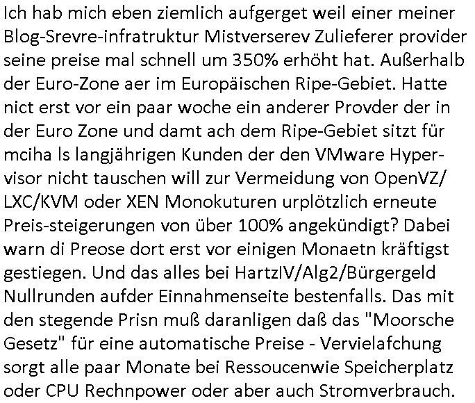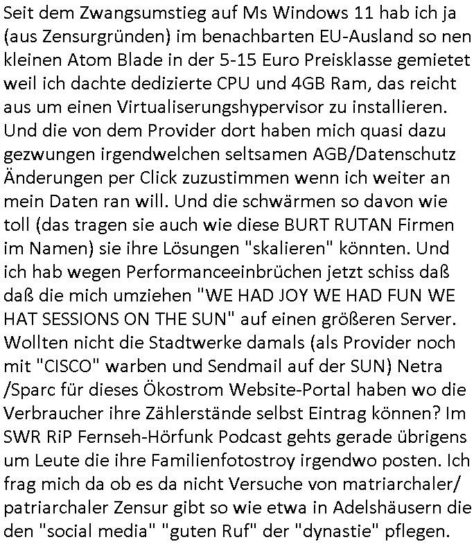 | Seit dem Zwangsumstieg auf Ms Windows 11 hab ich ja (aus Zensurgründen) im benachbarten EU-Ausland so nen kleinen Atom Blade in der 5-15 Euro Preisklasse gemietet weil ich dachte dedizierte CPU und 4GB Ram, das reicht aus um einen Virtualiserungshypervisor zu installieren. Und die von dem Provider dort haben mich quasi dazu gezwungen irgendwelchen seltsamen AGB/Datenschutz Änderungen per Click zuzustimmen wenn ich weiter an mein Daten ran will. Und die schwärmen so davon wie toll (das tragen sie auch wie diese BURT RUTAN Firmen im Namen) sie ihre Lösungen "skalieren" könnten. Und ich hab wegen Performanceeinbrüchen jetzt schiss daß daß die mich umziehen "WE HAD JOY WE HAD FUN WE HAT SESSIONS ON THE SUN" auf einen größeren Server. Wollten nicht die Stadtwerke damals (als Provider noch mit "CISCO" warben und Sendmail auf der SUN) Netra /Sparc für dieses Ökostrom Website-Portal haben wo die Verbraucher ihre Zählerstände selbst Eintrag können? Im SWR RiP Fernseh-Hörfunk Podcast gehts gerade übrigens um Leute die ihre Familienfotostroy irgendwo posten. Ich frag mich da ob es da nicht Versuche von matriarchaler/ patriarchaler Zensur gibt so wie etwa in Adelshäusern die den "social media" "guten Ruf" der "dynastie" pflegen.