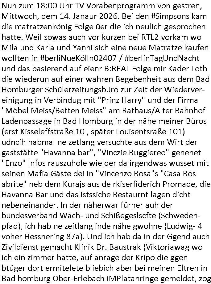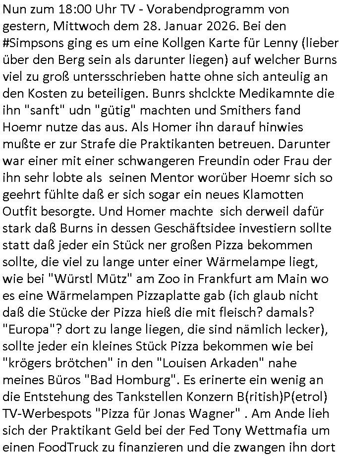 | Nun zum 18:00 Uhr TV - Vorabendprogramm von gestern, Mittwoch dem 28. Januar 2026. Bei den #Simpsons ging es um eine Kollgen Karte für Lenny (lieber über den Berg sein als darunter liegen) auf welcher Burns viel zu groß untersschrieben hatte ohne sich anteulig an den Kosten zu beteiligen. Bunrs shclckte Medikamnte die ihn "sanft" udn "gütig" machten und Smithers fand Hoemr nutze das aus. Als Homer ihn darauf hinwies mußte er zur Strafe die Praktikanten betreuen. Darunter war einer mit einer schwangeren Freundin oder Frau der ihn sehr lobte als seinen Mentor worüber Hoemr sich so geehrt fühlte daß er sich sogar ein neues Klamotten Outfit besorgte. Und Homer machte sich derweil dafür stark daß Burns in dessen Geschäftsidee investiern sollte statt daß jeder ein Stück ner großen Pizza bekommen sollte, die viel zu lange unter einer Wärmelampe liegt, wie bei "Würstl Mütz" am Zoo in Frankfurt am Main wo es eine Wärmelampen Pizzaplatte gab (ich glaub nicht daß die Stücke der Pizza hieß die mit fleisch? damals? "Europa"? dort zu lange liegen, die sind nämlich lecker), sollte jeder ein kleines Stück Pizza bekommen wie bei "krögers brötchen" in den "Louisen Arkaden" nahe meines Büros "Bad Homburg". Es erinerte ein wenig an die Entstehung des Tankstellen Konzern B(ritish)P(etrol) TV-Werbespots "Pizza für Jonas Wagner" . Am Ande lieh sich der Praktikant Geld bei der Fed Tony Wettmafia um einen FoodTruck zu finanzieren und die zwangen ihn dort