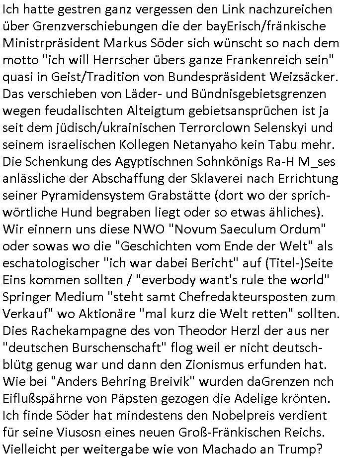 Ich mein die Jungprlemtartier wissen ja worüber sie da abstimmen, oder? "Warmer Abbruch" war damals sehr beliebt vor allem in der Gastro Szene in Bad Homburg. Habich egelch erzählt daß die dame welche das Cent-O betrieb die Erebin/Tochter vom Busunternehmer war? Wir erinenr uns ich sollte im Parlament einen Ausshuss für den ÖPNV zusmenstellen (mit nem Polizistensohn?). "In Bad Homburg, in Bad Homburg ist wider jemand in eine allee gegurkt" (die an der Autbahnabfahrt, "Disco - Unfall") udn daher wollte man "don't drink and drive" daß die "jugdn udn firzet" Ausschuss Jugenparlamtarier Förderung machen für "Angebote vor Ort". Ich hab mich daher ja auch mal mit Suchtproblematiken beschäftigt da Junkies in Frankfurt/M. Bahöfe ungemütlich machen, siehe die RTL2 "hartest Deutschland" scripted reality diese "No Go Areas" für "Briten Hooligans" bei der EM. Aebr was hatte das naochmal mit den Molotov Cocktails aus der Hausbesetzer-Szene Musik (Ton Steine Scherben/ "köng vonduschaldn" rio riser) und Alteigentum zu tun? Die Exkursionen nach Hamburg wos um Strukturwandel im Hafen-Rotlicht Viertel ging siehe "Sudfass" an der EZB (europäischen zentral-bank) von wegen der Staatsbesuch Bangkok Vorfall der ins Protituiertenschutzgesetz endete? Ich hab gelese Frankfurts Ex-Ob Feldmann tritt nach der AWO - Kindergarten Affäre wieder an zu whl,siemla für dei Romarpist..., pardon igdlceh auslands-Kommunisten. "Happy, New Year, Happy, New Year, ..." (Abba) *träller* https://www.bild.de/news/ausland/ermittler-ueberzeugt-feuerfontaene-loeste-das-schweiz-inferno-aus-6957d7ba392c7b91b7cd28d9 https://www.fr.de/frankfurt/zurueck-frankfurter-ex-ob-peter-feldmann-will-in-die-politik-94095189.html | |