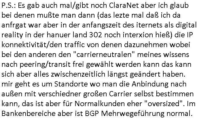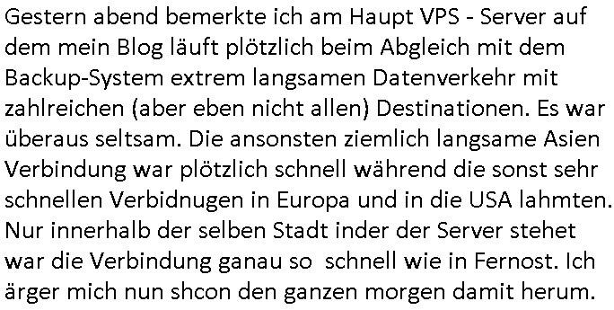 | bei mis ist heute morgen schon wieder der VPS Server frü mein Blog im Moment des hochladens / abgleichens von Daten (nach dene ersten zwo Vildern) sabotagebedingt in die Knie gegangen von der Anbindung her wieder nur teils erreichbar. Eine unglaubloche Frechheit. Es gibt hier ja zunehmend LOW COST Rechenzentren wie interwerk betrieben von irgendienr (Achung!) "ROTORfly" Firma die sich ne Faser zum interxion Digital Reality / Siemens RZ gelegt haben wo in der Hanauer-Land- 30X dei WISAG in gazer Kasernenstärke sitzt was den Wachschutz angeht. Für alle die nicht vom "Ordungsamt"/"KleyReX" Skandal betroffen sein möchten die "millionenschwere Korrution bei der beschaffung von Justz/Polzei EDVIn Frankfurt/M. " ist es besser nicht dort zu hosten/routen wo Frankfurter Ordnungsamtschefs Büros quasi im DeCIX-Ring-Knoten- pukt Rechenzentrum haben. Hanaur-Land- 29X oder so in Richtung DKRZ Offnbch raus ist da im Moment wohl die bessrre wahl woebi ich mich frage ob dieses neue(?) "Tornado" RZ nahe SAP/Flughafen und BFS in Langen da am Privatflughafen Egelsbach in der Nähe ne gute Wahl wäre wenn man für ne zeitlang vom Hautpbahnhof mit der GPS/Rail Arcor Infratruktur weg will staatsanwalt- licehr Ermittlungen bedingt asl AntiKorruption-Journalist. Nord-West Frankfurt Kalbach wollte ich ja "aus Gründen" nicht (siehe der "Keppler RZ" Verkauf artikl) auch Nord- östlich von Frankfurt gibt es ja Peripehrie - Datacenter. Hatte gerade mitei nem Typen zu tun dessen Name mir