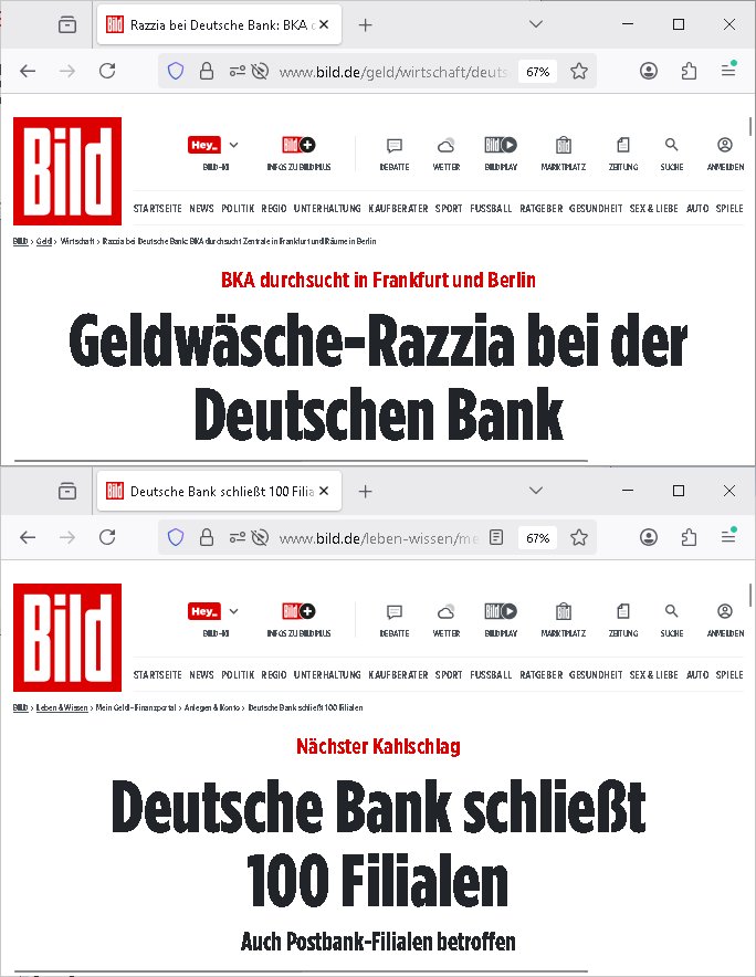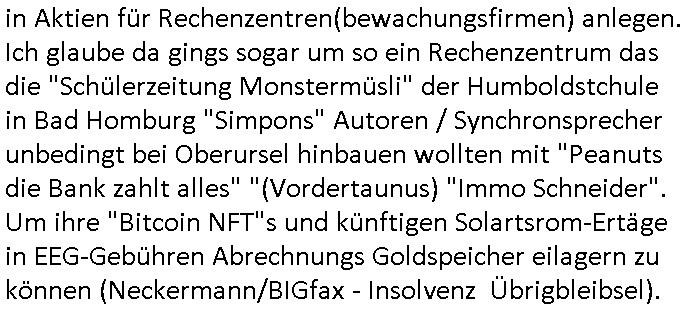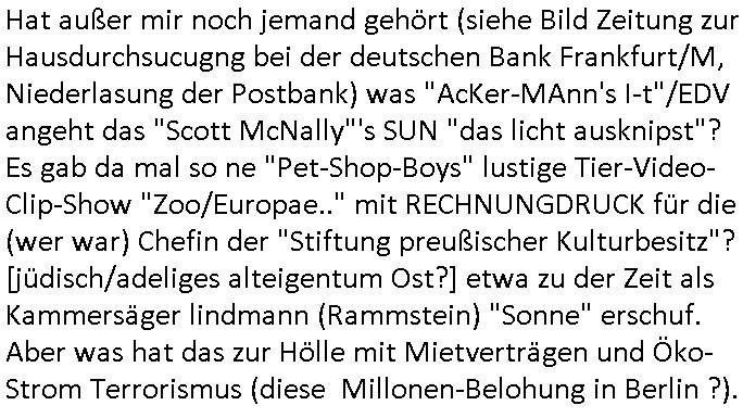 Hat außer mir noch jemand gehört (siehe Bild Zeitung zur Hausdurchsucugng bei der deutschen Bank Frankfurt/M, Niederlasung der Postbank) was "AcKer-MAnn's I-t"/EDV angeht das "Scott McNally"'s SUN "das licht ausknipst"? Es gab da mal so ne "Pet-Shop-Boys" lustige Tier-Video- Clip-Show "Zoo/Europae.." mit RECHNUNGDRUCK für die (wer war) Chefin der "Stiftung preußischer Kulturbesitz"? [jüdisch/adeliges alteigentum Ost?] etwa zu der Zeit als Kammersäger lindmann (Rammstein) "Sonne" erschuf. https://tvinfo.de/fernsehprogramm/2278360271-swr3-fit-rp | |
