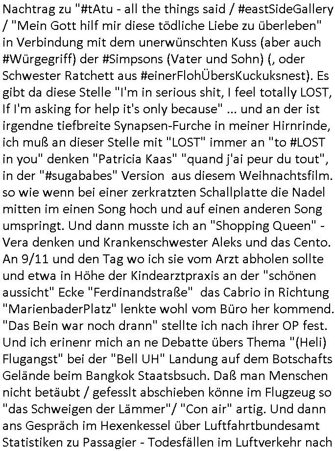 | Nachtrag zu "#tAtu - all the things said / #eastSideGallery / "Mein Gott hilf mir diese tödliche Liebe zu überleben" in Verbindung mit dem unerwünschten Kuss (aber auch #Würgegriff) der #Simpsons (Vater und Sohn) (, oder Schwester Ratchett aus #einerFlohÜbersKuckuksnest). Es gibt da diese Stelle "I'm in serious shit, I feel totally LOST, If I'm asking for help it's only because" ... und an der ist irgendne tiefbreite Synapsen-Furche in meiner Hirnrinde, ich muß an dieser Stelle mit "LOST" immer an "to #LOST in you" denken "Patricia Kaas" "quand j'ai peur du tout", in der "#sugababes" Version aus diesem Weihnachtsfilm. so wie wenn bei einer zerkratzten Schallplatte die Nadel mitten im einen Song hoch und auf einen anderen Song umspringt. Und dann musste ich an "Shopping Queen" - Vera denken und Krankenschwester Aleks und das Cento. An 9/11 und den Tag wo ich sie vom Arzt abholen sollte und etwa in Höhe der Kindearztpraxis an der "schönen aussicht" Ecke "Ferdinandstraße" das Cabrio in Richtung "MarienbaderPlatz" lenkte wohl vom Büro her kommend. "Das Bein war noch drann" stellte ich nach ihrer OP fest. Und ich erinenr mich an ne Debatte übers Thema "(Heli) Flugangst" bei der "Bell UH" Landung auf dem Botschafts Gelände beim Bangkok Staatsbsuch. Daß man Menschen nicht betäubt / gefesslt abschieben könne im Flugzeug so "das Schweigen der Lämmer"/ "Con air" artig. Und dann ans Gespräch im Hexenkessel über Luftfahrtbundesamt Statistiken zu Passagier - Todesfällen im Luftverkehr nach