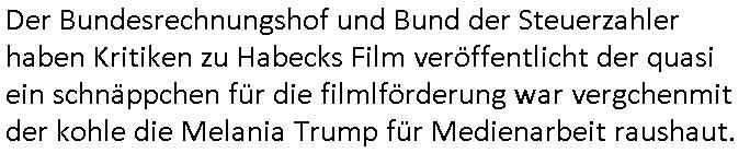 | Der Bundesrechnungshof und Bund der Steuerzahler haben Kritiken zu Habecks Film veröffentlicht der quasi ein schnäppchen für die filmlförderung war vergchenmit der kohle die Melania Trump für Medienarbeit raushaut.