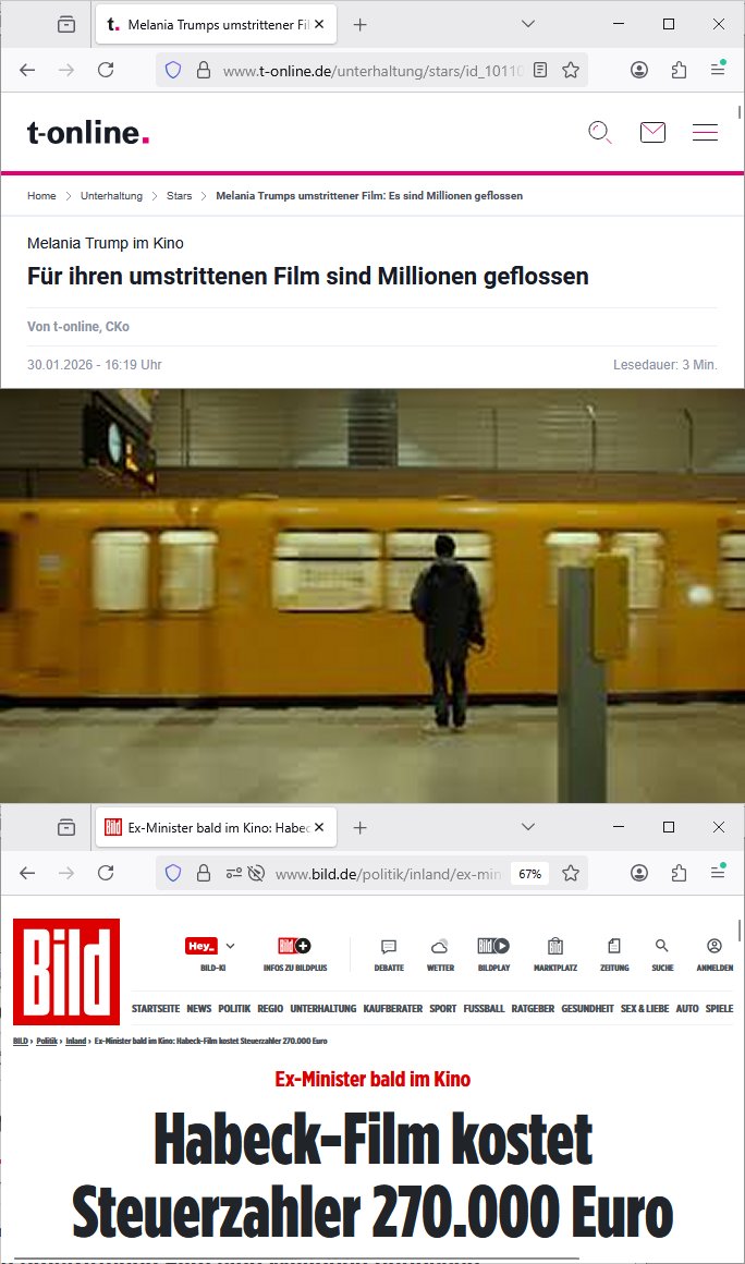 https://www.t-online.de/unterhaltung/stars/id_101107464/melania-trumps-umstrittener-film-es-sind-millionen-geflossen.html https://www.bild.de/politik/inland/ex-minister-bald-im-kino-habeck-film-kostet-steuerzahler-270-000-euro-692b21323b1644718b3b3422 | |