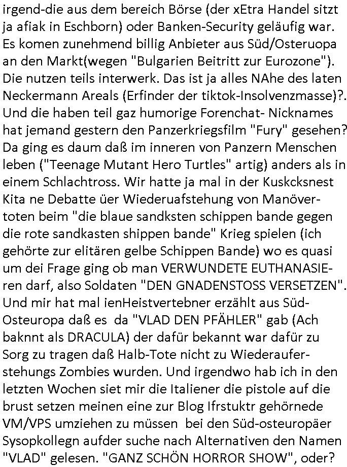 irgend-die aus dem bereich Börse (der xEtra Handel sitzt ja afiak in Eschborn) oder Banken-Security geläufig war. Es komen zunehmend billig Anbieter aus Süd/Osteruopa an den Markt(wegen "Bulgarien Beitritt zur Eurozone"). Die nutzen teils interwerk. Das ist ja alles NAhe des laten Neckermann Areals (Erfinder der tiktok-Insolvenzmasse)?. Und die haben teil gaz humorige Forenchat- Nicknames hat jemand gestern den Panzerkriegsfilm "Fury" gesehen? Da ging es daum daß im inneren von Panzern Menschen leben ("Teenage Mutant Hero Turtles" artig) anders als in einem Schlachtross. Wir hatte ja mal in der Kuskcksnest Kita ne Debatte üer Wiederuafstehung von Manöver-toten beim "die blaue sandksten schippen bande gegen die rote sandkasten shippen bande" Krieg spielen (ich gehörte zur elitären gelbe Schippen Bande) wo es quasi um dei Frage ging ob man VERWUNDETE EUTHANASIE-ren darf, also Soldaten "DEN GNADENSTOSS VERSETZEN". Und mir hat mal ienHeistvertebner erzählt aus Süd-Osteuropa daß es da "VLAD DEN PFÄHLER" gab (Ach baknnt als DRACULA) der dafür bekannt war dafür zu Sorg zu tragen daß Halb-Tote nicht zu Wiederaufer-stehungs Zombies wurden. Und irgendwo hab ich in den letzten Wochen siet mir die Italiener die pistole auf die brust setzen meinen eine zur Blog Ifrstuktr gehörnede VM/VPS umziehen zu müssen bei den Süd-osteuropäer Sysopkollegn aufder suche nach Alternativen den Namen "VLAD" gelesen. "GANZ SCHÖN HORROR SHOW", oder? https://looking.house/looking-glass/countries/germany/frankfurt https://tvinfo.de/fernsehprogramm/2290041246-herz-aus-stahl | |