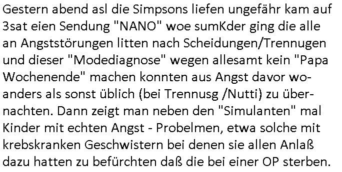 | Gestern abend asl die Simpsons liefen ungefähr kam auf 3sat eien Sendung "NANO" woe sumKder ging die alle an Angststörungen litten nach Scheidungen/Trennugenund dieser "Modediagnose" wegen allesamt kein "Papa Wochenende" machen konnten aus Angst davor wo-anders als sonst üblich (bei Trennusg /Nutti) zu über-nachten. Dann zeigt man neben den "Simulanten" mal Kinder mit echten Angst - Probelmen, etwa solche mit krebskranken Geschwistern bei denen sie allen Anlaß dazu hatten zu befürchten daß die bei einer OP sterben.