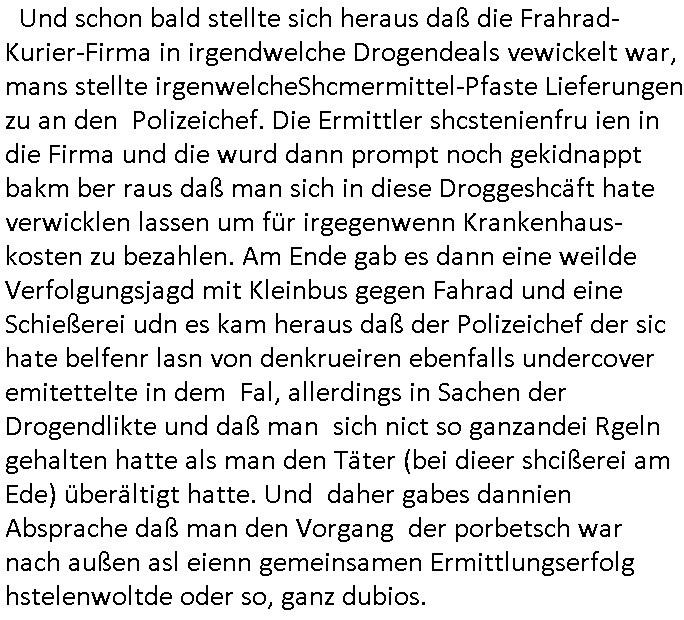 Und schon bald stellte sich heraus daß die Frahrad-Kurier-Firma in irgendwelche Drogendeals vewickelt war, mans stellte irgenwelcheShcmermittel-Pfaste Lieferungen zu an den Polizeichef. Die Ermittler shcstenienfru ien in die Firma und die wurd dann prompt noch gekidnappt bakm ber raus daß man sich in diese Droggeshcäft hate verwicklen lassen um für irgegenwenn Krankenhaus-kosten zu bezahlen. Am Ende gab es dann eine weilde Verfolgungsjagd mit Kleinbus gegen Fahrad und eine Schießerei udn es kam heraus daß der Polizeichef der sic hate belfenr lasn von denkrueiren ebenfalls undercover emitettelte in dem Fal, allerdings in Sachen der Drogendlikte und daß man sich nict so ganzandei Rgeln gehalten hatte als man den Täter (bei dieer shcißerei am Ede) überältigt hatte. Und daher gabes dannien Absprache daß man den Vorgang der porbetsch war nach außen asl eienn gemeinsamen Ermittlungserfolg hstelenwoltde oder so, ganz dubios. https://tvinfo.de/fernsehprogramm/2296987441-tatort | |