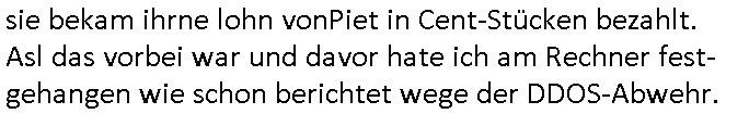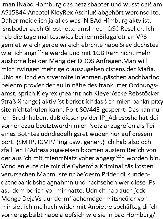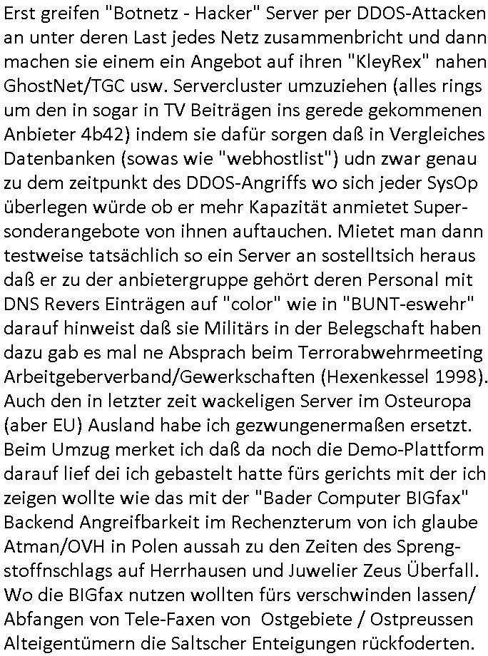 | Erst greifen "Botnetz - Hacker" Server per DDOS-Attacken an unter deren Last jedes Netz zusammenbricht und dann machen sie einem ein Angebot auf ihren "KleyRex" nahen GhostNet/TGC usw. Servercluster umzuziehen (alles rings um den in sogar in TV Beiträgen ins gerede gekommenen Anbieter 4b42) indem sie dafür sorgen daß in Vergleiches Datenbanken (sowas wie "webhostlist") udn zwar genau zu dem zeitpunkt des DDOS-Angriffs wo sich jeder SysOp überlegen würde ob er mehr Kapazität anmietet Super-sonderangebote von ihnen auftauchen. Mietet man dann testweise tatsächlich so ein Server an sostelltsich heraus daß er zu der anbietergruppe gehört deren Personal mit DNS Revers Einträgen auf "color" wie in "BUNT-eswehr" darauf hinweist daß sie Militärs in der Belegschaft haben dazu gab es mal ne Absprach beim Terrorabwehrmeeting Arbeitgeberverband/Gewerkschaften (Hexenkessel 1998). Auch den in letzter zeit wackeligen Server im Osteuropa (aber EU) Ausland habe ich gezwungenermaßen ersetzt. Beim Umzug merket ich daß da noch die Demo-Plattform darauf lief dei ich gebastelt hatte fürs gerichts mit der ich zeigen wollte wie das mit der "Bader Computer BIGfax" Backend Angreifbarkeit im Rechenzterum von ich glaube Atman/OVH in Polen aussah zu den Zeiten des Spreng-stoffnschlags auf Herrhausen und Juwelier Zeus Überfall. Wo die BIGfax nutzen wollten fürs verschwinden lassen/ Abfangen von Tele-Faxen von Ostgebiete / Ostpreussen Alteigentümern die Saltscher Enteigungen rückfoderten.