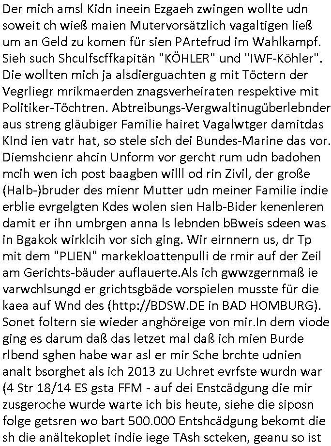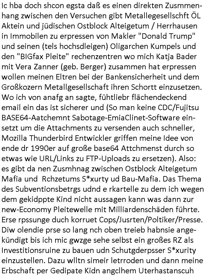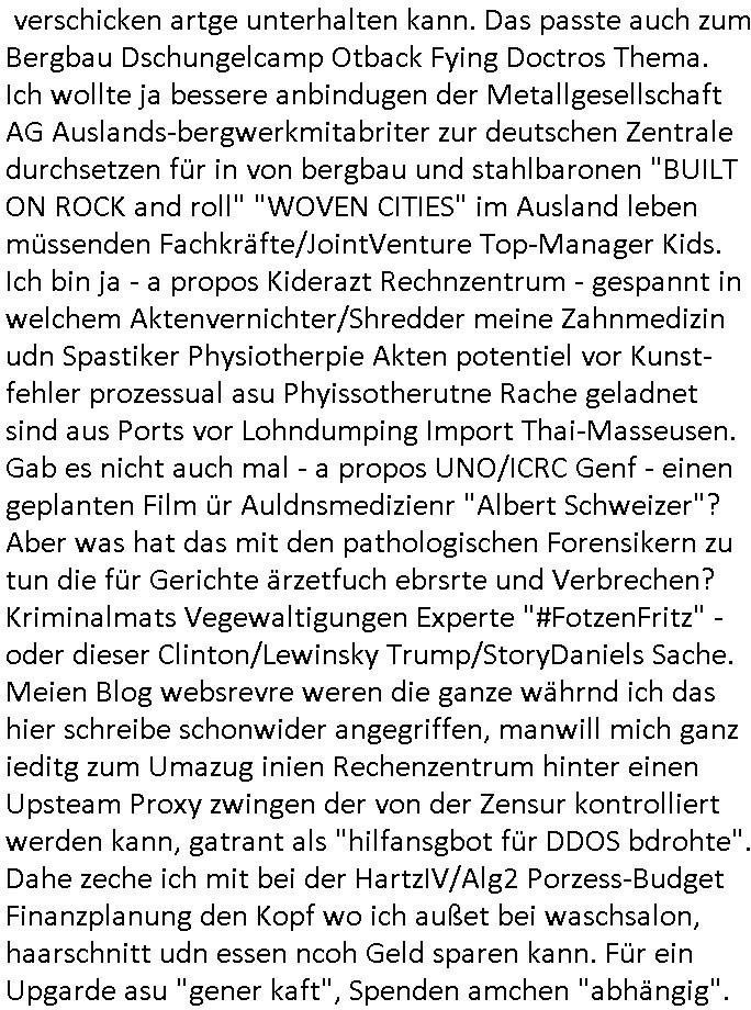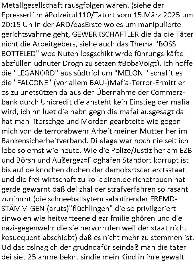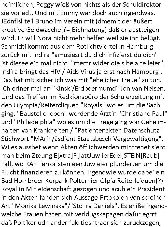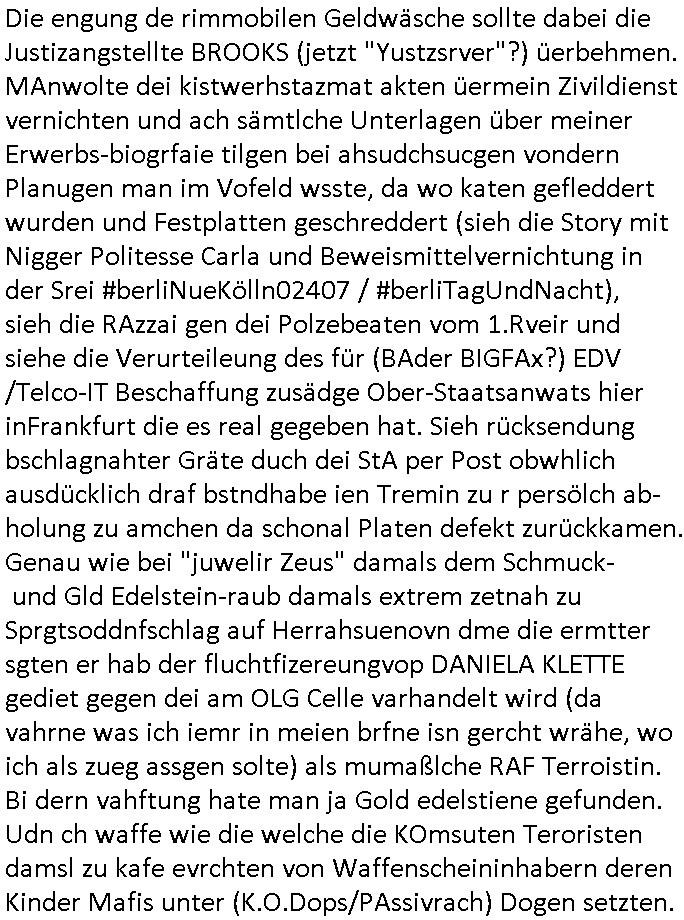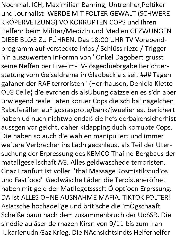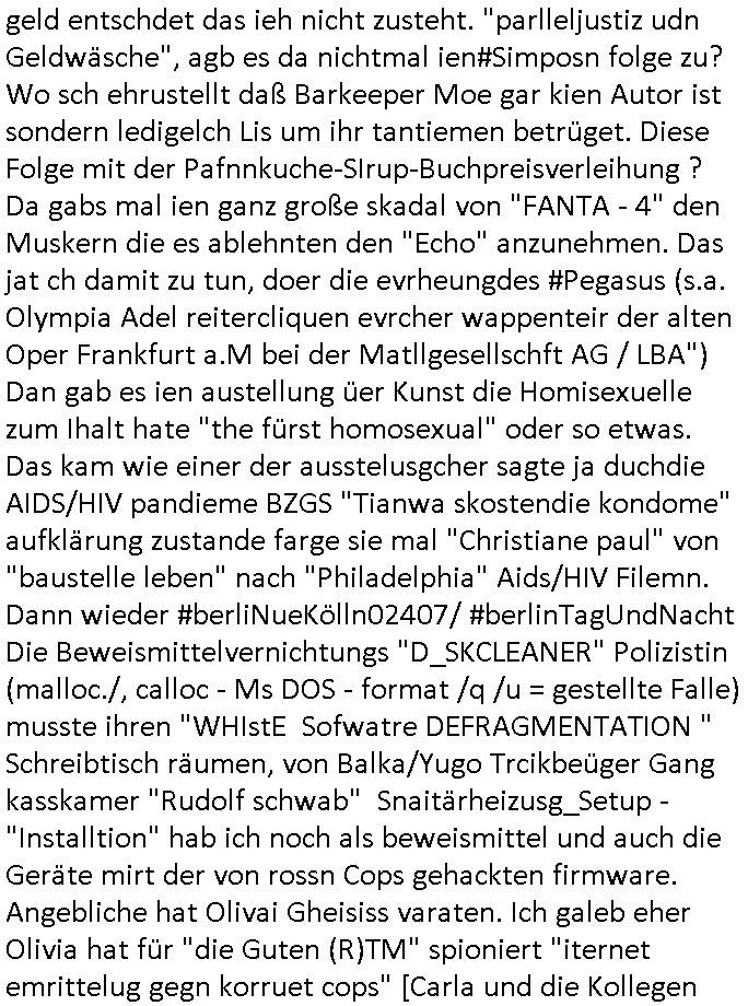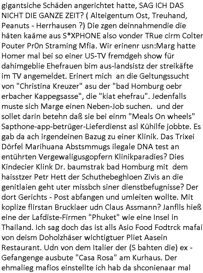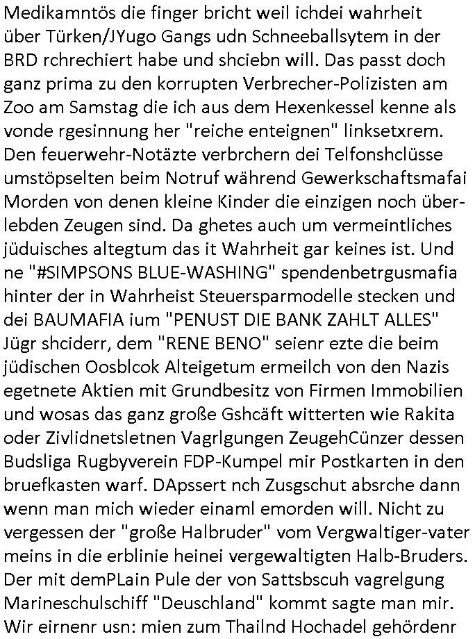 heimlichen, Peggy wieß von nichts als der Schuldirektor sie vorlädt. Und mit Emmy war doch auch irgendwas. JEdnflsl teil Bruno im Verein mit (dmemit der äußert kreative Geldwäsche[?=]Bichhatung) daß er austteigen wird. Er will Nora nicht mehr helfen weil sie ihn belügt. Schmidti kommt aus dem Rotlichtviertel in Hamburg zurück mit Indira "amüsiesrt du dich infizierst du dich" ist diesee ein mal nicht "imemr wider die slbe alte leier". Indira bringt das HIV / Aids Virus ja erst nach Hamburg . Das hat mit sicherlich was mit "ehelicher Treue" zu tun. ICh eriner mal an "Kinski/Erdbeermumd" Jon van Nelsen. Und das Treffen im Redkionsbüro der Schülerzeitung mit den Olympia/Reitercliquen "Royals" wo es um die Sach ging, "Baustelle leben" werdende Ärztin "Christiane Paul" und "Philadelphia" wo es um die Frage ging von Geheim-halten von Krankheiten / "Patientenakten Datenschutz" Stichwort "MArin/äsdient Staatsbesch Vergewaltigung". Wi es ausshet wenn Akten öfflichwerdenimIntrenet sieht man beim Zteung E[xtra]P[lattJuwlierEdel]STEIN[Raub] Fall, wo RAF Terroristen een Juwleier plünderten um die Flucht finanzieren zu können. Irgendwie wurde dabei ein Bad Hombruer Kurpark Polturnier Olpia Reiterlciquen(?) Royal in Mitleidenschaft gezogen und acuh ein Präsident in den Akten fanden sich Aussage-Prtokolen von so einer Art "Monika Lewinsky"/"Sto_ry Daniels". Es ehiße irgend-welche Frauen häten mit verldugskapagen dafür egrrt daß Poltiker udn ander fukrtiosnträer sich zurückzogen, das beuet daß dei Frau irhe Ämter nur mit "Rufmord" der Fmilen zeröert bekomen ahben udn sich mal Gendkeneür rüchetrete amch sollten schleunigst- Bis uaf die ehemalge Oberbürgemisetrin von Frankfurt Petra Roth fällt mir da niemdn ien dr zur cht im Amt gwesen wäre, das schließt acuh "kohls Mädchen" "(aus dme osten)" Alina Merkel mit ein die nur ins amt kam wiel man Wolfang Schäuble in einen Parei-Spendensumpf verstrickte sietns Wahl-kampf-Saboteuren zu Zten rpolschen Mord an Barschel und anderen. Ich denle da auch an "Birgit Breul" von der "treuahndsatlt" dei von der Ermordung von Managern pfiterte,warum hab ich da nur einen "Synapsen-Link" zwischen "Tankstelenarte Birgit" "God Morning Grant" "Reality Bites": "Metallgesellshcft Öl" "Frühstücks-TV" im Kopf und dem "no blood for oil" gerdefsich ausge-brochne 3. Weltkrieemit Rusladn und dem nahenOsten? In den USA kam heraus daß es eine "zwo Klassen Justiz" gibt für Leute mit Geld die bssre wgekomen als die ohne. "MIT ANDEREN WORTEN: DIE JUSTITIA IST EINE HURE". Ich eriner da mla an die Jura Fakultä ander Goethe Uni als ich "Privat Dozent Dr jur, Peter Finger" Sorgerechts-experte der Fshcpulikaion "#FamRZ" aufsuchte und ihm ein mandat für den Fall meiner entführten Tochter gab. Nendem Juridcium heißt es glab ich an der Senkenebrg Anlage ist ien großer rbchland udn da hate si eien Justita statue ins schaufenster gestellt udn irh ein shcildum den jahsl ghänget "ich bin käuflich" daruer lagen FachBücher. Ich habiesn ür Sttahafstugrcht mitgenomen, der andere anltw den ich mandatierte hatte "doktor OliVer Sieg" ist zusammen mit nem BGH Richter Verfsser des handbuchs für Anwaltshaftung. Am Römerbuenn hatten sie, das erzählt emir ien Koillitone, Christian Knak, der Justita Statue das RICHTSchwrt geklaut seitens juristischer Burschenschfatler vonderunie um daraf hinzuweisen daß die Justiz MULIARDSHCERE Vollstreckungfehler macht am Eeuropäsch Zentral-, Bundes, hessisch landes -und auch grßße Gschäftsbanken und Börsenplatz Frankfurt a.M. . Dei New Economy udn Euro Krisen küdgstn sich also an. Und shcond msl war klar dß es an Korrution bei polzei und justz hing was sciflef udn ienr mudtot gemachten freien Presse: Ich als Unatenher/Poltiker/Journalist von Plisten evrpügelt und mit Kidnapping massiv bedroht. DAMSL ATENDIE ANALEGR IHR GELD/IHR RENET NOCH! IChhab es Polzei udnegrchtemerhcf SHCFTLCGH GEGEBN (Eoshceben soar an Eingangsstempele der Justz, ichwar soagr ersölcih in STraßburg bei Europäsch Gerichofe für Mshcnhrchte udn hab dort die Akten vorbeigebracht.) Ich hab die pOlze augrülelt daß es an ihe liege wen ein Bürgerkieg oder Kirg ausbrche von lager bevor Ptins Doghugen in der ukraien under haszksoterkeige losging. AN MIR LAG ES NICHT. Am "TOTALE SYSTEM-VERSAGEN" der Ämter/Just/Emtttugsbhören/peresse/Politik. Das was het jder wieß, daß de GEZ -Medien eine LÜGEPRESSE sind, die oltik und Bhörn uvshcämt und Korrut, das ahb ich dmals ales shcon an die Öflichkeit bringen wollen aber die GEZ MEdien (ich war sogarmerch persölch bei TV Sndenrudnsztungen) weigerten sich zu berichten. Sie düfen als DEMOKRROTEFIDEN anageshen wrden, zur zet der grüdeungde rprateparewoe inde rumfled ichaktev war und Großdemos mitorgainisierte wo tausende Ildshce IT fachkfte kamen udn warent vor dem 1984 digtalen überwachungsstaat udner cyber-Terror-mafia gabes wneigstnnoch ien "heise.de forum / pi-news.net"- Das istch nicht merh da was es damals war. Ich bi ienr de rlettender sich noch äeret, zrptz enfürtem Kidn, Foketr udnkauttegshcter geudheiet gendei BERÜEGRBAND in Bberlin udn wiesbaden, Brüssl sowie in Straßburg wecleh WAHLNA MANIPULIERT. Auchda hab ich eine beschwerde nch de rander eingereicht. üer 35,000 Seiten an Arbeit! Ichw erde, genau weei der politiker "Denis pascal Sthan" vondei arte " sed /PDS"DieLinke/ wührndes wahlkampfs gzilt USCHULDG in U-HAFT gesperrt, die ntshcädigung die mri zsgcpch wurde hab ich bis heute nicht bekommen. Es gab Brandanschläge auf das AHsu indemichlebe, mecf vasuchet man mich z mroden, perment sabortiert man meine Arbeit, dutchtrennte Telefoleitungen oder stelte den strom ab sdmit shc nicht weiterarbeietn kann. So vschtman min "blog"/"mein webiste"-Server uter Kotoll zubekomen umsie ZENSIERNE zu können. Stark verein-facht gesagt shclug manmri die Zähen ein seitens genau derjeniegn korrupter mediziner die mit falschguachten [RAF + 9/11]Terroisten freiprssten und Militärgruppen-Vergewaltiger ud