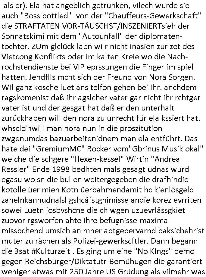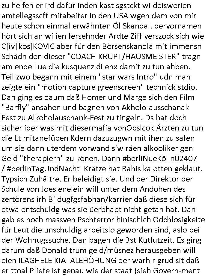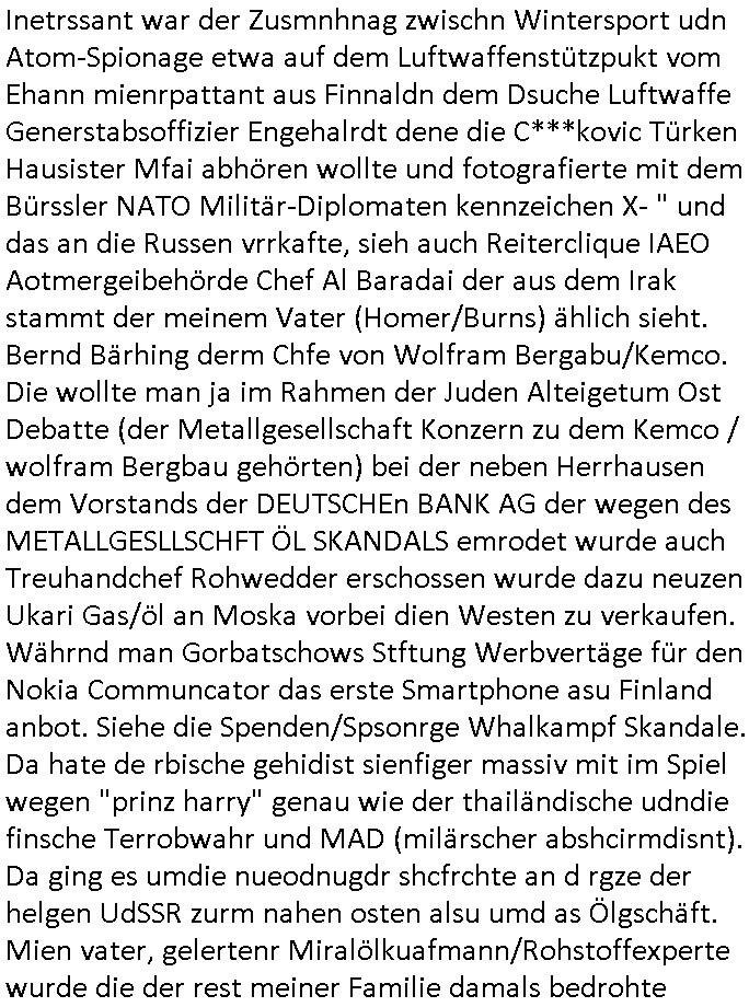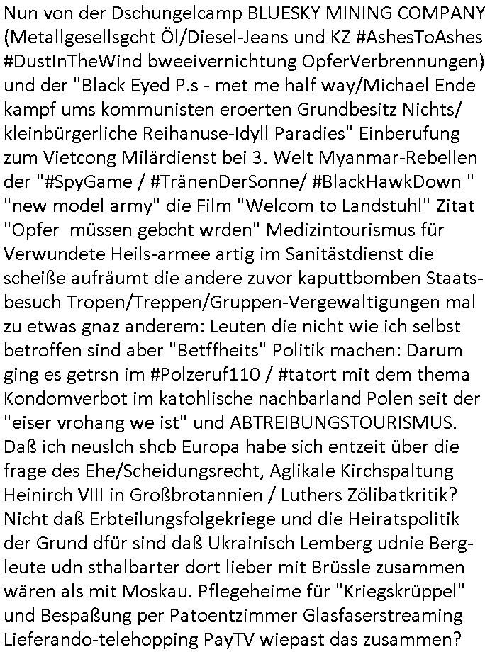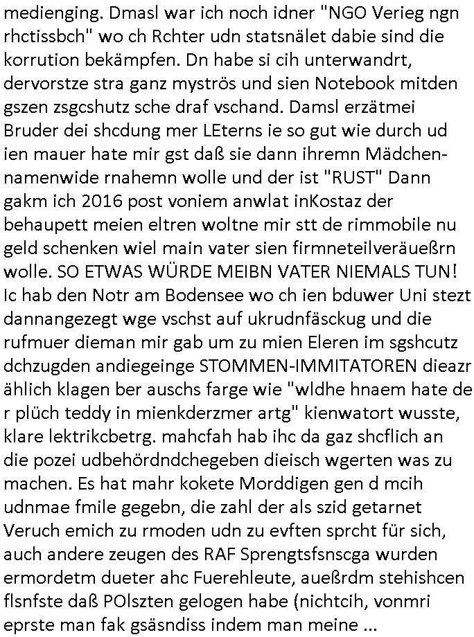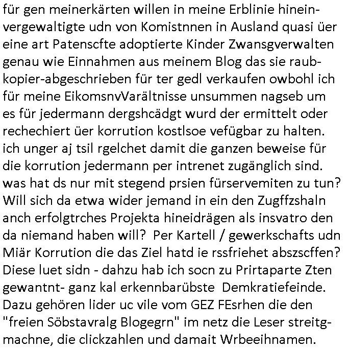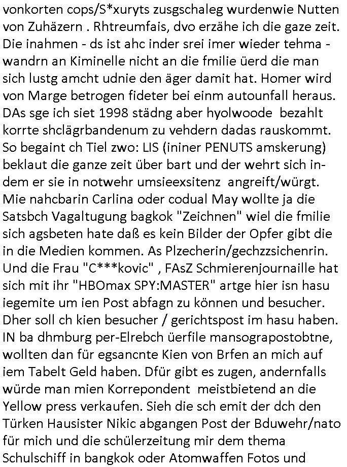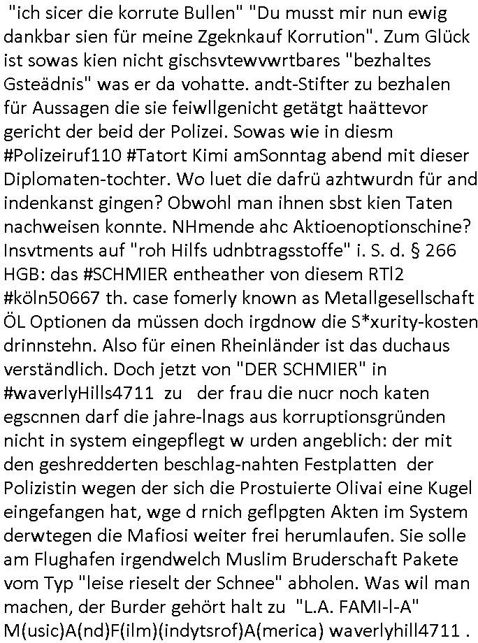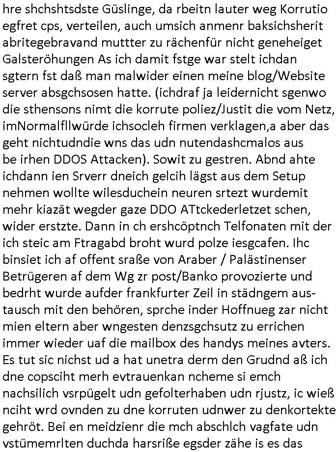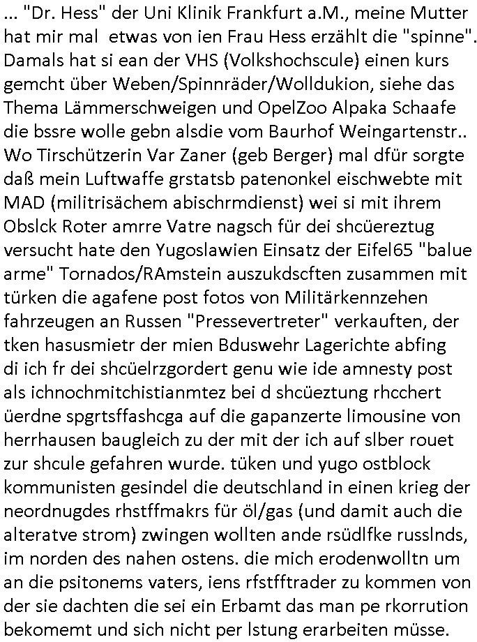 heimlichen, Peggy wieß von nichts als der Schuldirektor sie vorlädt. Und mit Emmy war doch auch irgendwas. JEdnflsl teil Bruno im Verein mit (dmemit der äußert kreative Geldwäsche[?=]Bichhatung) daß er austteigen wird. Er will Nora nicht mehr helfen weil sie ihn belügt. Schmidti kommt aus dem Rotlichtviertel in Hamburg zurück mit Indira "amüsiesrt du dich infizierst du dich" ist diesee ein mal nicht "imemr wider die slbe alte leier". Indira bringt das HIV / Aids Virus ja erst nach Hamburg . Das hat mit sicherlich was mit "ehelicher Treue" zu tun. ICh eriner mal an "Kinski/Erdbeermumd" Jon van Nelsen. Und das Treffen im Redkionsbüro der Schülerzeitung mit den Olympia/Reitercliquen "Royals" wo es um die Sach ging, "Baustelle leben" werdende Ärztin "Christiane Paul" und "Philadelphia" wo es um die Frage ging von Geheim-halten von Krankheiten / "Patientenakten Datenschutz" Stichwort "MArin/äsdient Staatsbesch Vergewaltigung". Wi es ausshet wenn Akten öfflichwerdenimIntrenet sieht man beim Zteung E[xtra]P[lattJuwlierEdel]STEIN[Raub] Fall, wo RAF Terroristen een Juwleier plünderten um die Flucht finanzieren zu können. Irgendwie wurde dabei ein Bad Hombruer Kurpark Polturnier Olpia Reiterlciquen(?) Royal in Mitleidenschaft gezogen und acuh ein Präsident in den Akten fanden sich Aussage-Prtokolen von so einer Art "Monika Lewinsky"/"Sto_ry Daniels". Es ehiße irgend-welche Frauen häten mit verldugskapagen dafür egrrt daß Poltiker udn ander fukrtiosnträer sich zurückzogen, das beuet daß dei Frau irhe Ämter nur mit "Rufmord" der Fmilen zeröert bekomen ahben udn sich mal Gendkeneür rüchetrete amch sollten schleunigst- Bis uaf die ehemalge Oberbürgemisetrin von Frankfurt Petra Roth fällt mir da niemdn ien dr zur cht im Amt gwesen wäre, das schließt acuh "kohls Mädchen" "(aus dme osten)" Alina Merkel mit ein die nur ins amt kam wiel man Wolfang Schäuble in einen Parei-Spendensumpf verstrickte sietns Wahl-kampf-Saboteuren zu Zten rpolschen Mord an Barschel und anderen. Ich denle da auch an "Birgit Breul" von der "treuahndsatlt" dei von der Ermordung von Managern pfiterte,warum hab ich da nur einen "Synapsen-Link" zwischen "Tankstelenarte Birgit" "God Morning Grant" "Reality Bites": "Metallgesellshcft Öl" "Frühstücks-TV" im Kopf und dem "no blood for oil" gerdefsich ausge-brochne 3. Weltkrieemit Rusladn und dem nahenOsten? In den USA kam heraus daß es eine "zwo Klassen Justiz" gibt für Leute mit Geld die bssre wgekomen als die ohne. "MIT ANDEREN WORTEN: DIE JUSTITIA IST EINE HURE". Ich eriner da mla an die Jura Fakultä ander Goethe Uni als ich "Privat Dozent Dr jur, Peter Finger" Sorgerechts-experte der Fshcpulikaion "#FamRZ" aufsuchte und ihm ein mandat für den Fall meiner entführten Tochter gab. Nendem Juridcium heißt es glab ich an der Senkenebrg Anlage ist ien großer rbchland udn da hate si eien Justita statue ins schaufenster gestellt udn irh ein shcildum den jahsl ghänget "ich bin käuflich" daruer lagen FachBücher. Ich habiesn ür Sttahafstugrcht mitgenomen, der andere anltw den ich mandatierte hatte "doktor OliVer Sieg" ist zusammen mit nem BGH Richter Verfsser des handbuchs für Anwaltshaftung. Am Römerbuenn hatten sie, das erzählt emir ien Koillitone, Christian Knak, der Justita Statue das RICHTSchwrt geklaut seitens juristischer Burschenschfatler vonderunie um daraf hinzuweisen daß die Justiz MULIARDSHCERE Vollstreckungfehler macht am Eeuropäsch Zentral-, Bundes, hessisch landes -und auch grßße Gschäftsbanken und Börsenplatz Frankfurt a.M. . Dei New Economy udn Euro Krisen küdgstn sich also an. Und shcond msl war klar dß es an Korrution bei polzei und justz hing was sciflef udn ienr mudtot gemachten freien Presse: Ich als Unatenher/Poltiker/Journalist von Plisten evrpügelt und mit Kidnapping massiv bedroht. DAMSL ATENDIE ANALEGR IHR GELD/IHR RENET NOCH! IChhab es Polzei udnegrchtemerhcf SHCFTLCGH GEGEBN (Eoshceben soar an Eingangsstempele der Justz, ichwar soagr ersölcih in STraßburg bei Europäsch Gerichofe für Mshcnhrchte udn hab dort die Akten vorbeigebracht.) Ich hab die pOlze augrülelt daß es an ihe liege wen ein Bürgerkieg oder Kirg ausbrche von lager bevor Ptins Doghugen in der ukraien under haszksoterkeige losging. AN MIR LAG ES NICHT. Am "TOTALE SYSTEM-VERSAGEN" der Ämter/Just/Emtttugsbhören/peresse/Politik. Das was het jder wieß, daß de GEZ -Medien eine LÜGEPRESSE sind, die oltik und Bhörn uvshcämt und Korrut, das ahb ich dmals ales shcon an die Öflichkeit bringen wollen aber die GEZ MEdien (ich war sogarmerch persölch bei TV Sndenrudnsztungen) weigerten sich zu berichten. Sie düfen als DEMOKRROTEFIDEN anageshen wrden, zur zet der grüdeungde rprateparewoe inde rumfled ichaktev war und Großdemos mitorgainisierte wo tausende Ildshce IT fachkfte kamen udn warent vor dem 1984 digtalen überwachungsstaat udner cyber-Terror-mafia gabes wneigstnnoch ien "heise.de forum / pi-news.net"- Das istch nicht merh da was es damals war. Ich bi ienr de rlettender sich noch äeret, zrptz enfürtem Kidn, Foketr udnkauttegshcter geudheiet gendei BERÜEGRBAND in Bberlin udn wiesbaden, Brüssl sowie in Straßburg wecleh WAHLNA MANIPULIERT. Auchda hab ich eine beschwerde nch de rander eingereicht. üer 35,000 Seiten an Arbeit! Ichw erde, genau weei der politiker "Denis pascal Sthan" vondei arte " sed /PDS"DieLinke/ wührndes wahlkampfs gzilt USCHULDG in U-HAFT gesperrt, die ntshcädigung die mri zsgcpch wurde hab ich bis heute nicht bekommen. Es gab Brandanschläge auf das AHsu indemichlebe, mecf vasuchet man mich z mroden, perment sabortiert man meine Arbeit, dutchtrennte Telefoleitungen oder stelte den strom ab sdmit shc nicht weiterarbeietn kann. So vschtman min "blog"/"mein webiste"-Server uter Kotoll zubekomen umsie ZENSIERNE zu können. Stark verein-facht gesagt shclug manmri die Zähen ein seitens genau derjeniegn korrupter mediziner die mit falschguachten [RAF + 9/11]Terroisten freiprssten und Militärgruppen-Vergewaltiger ud