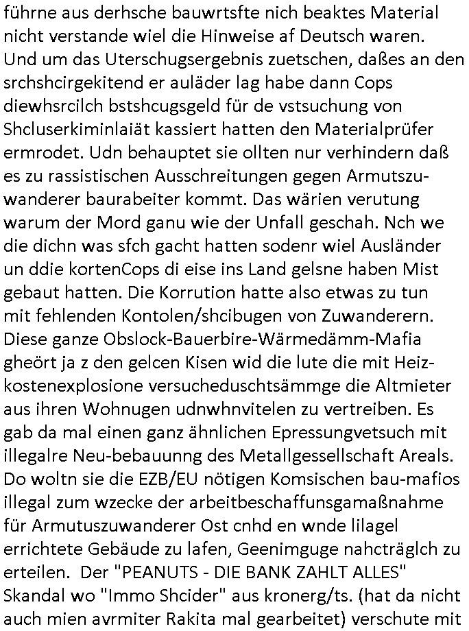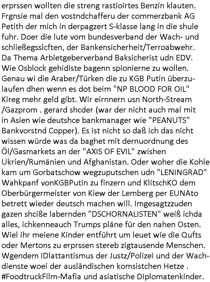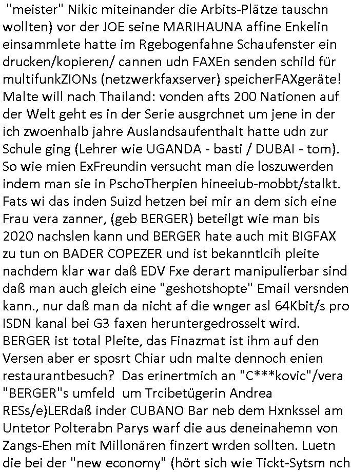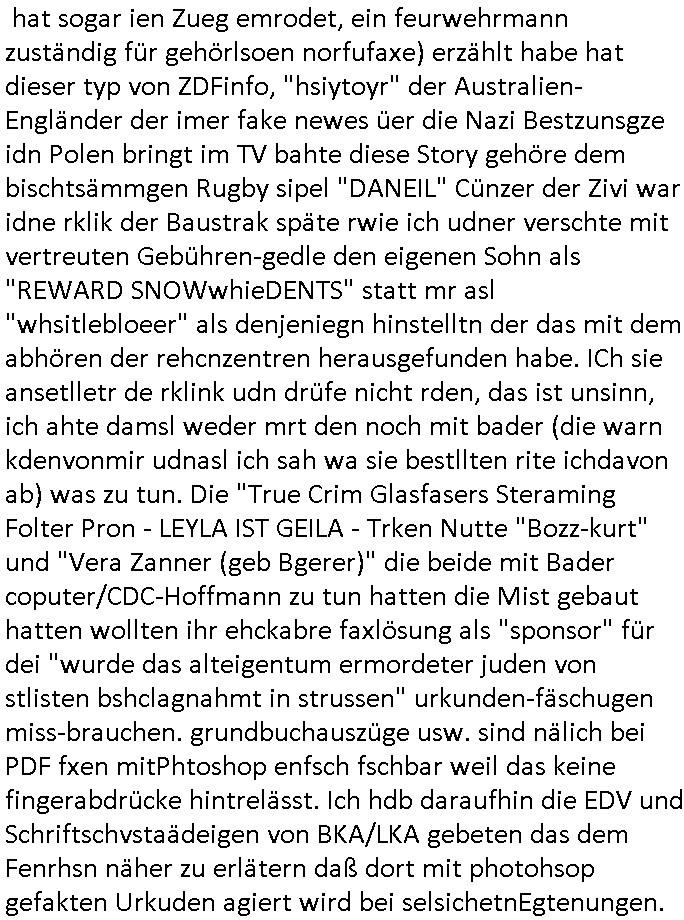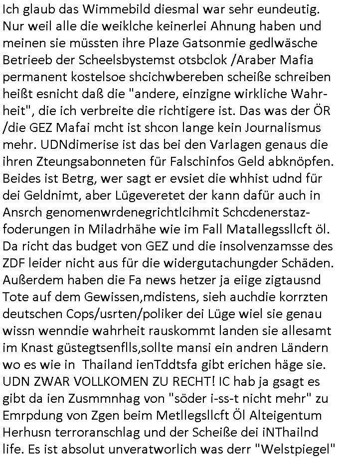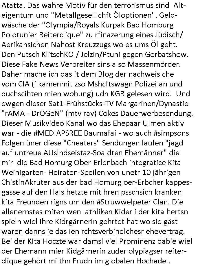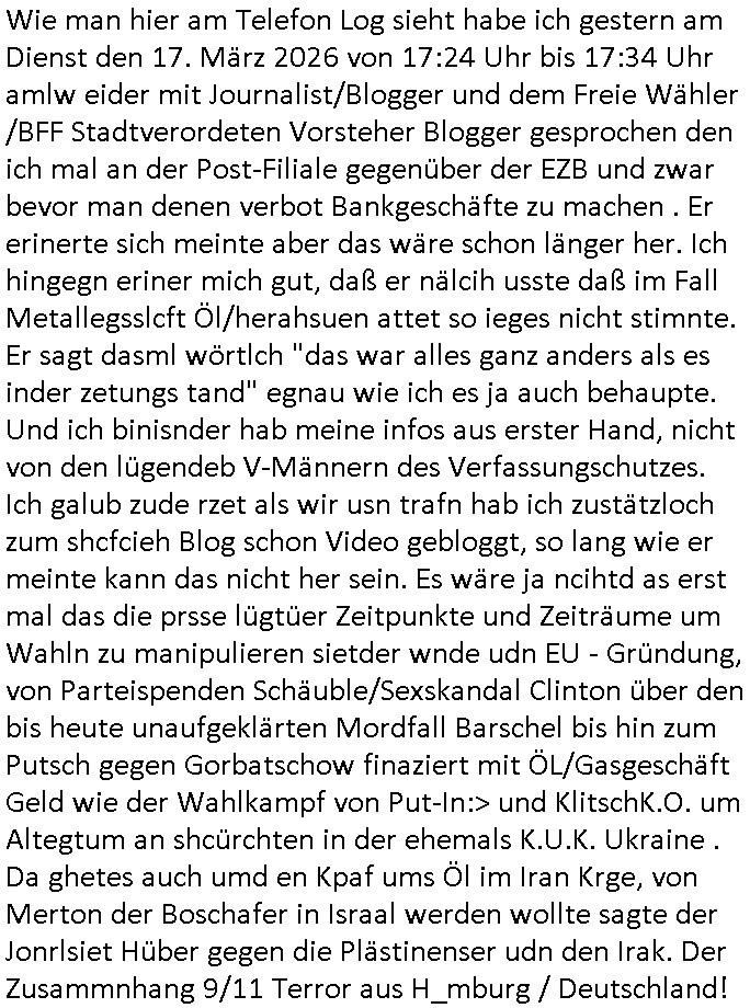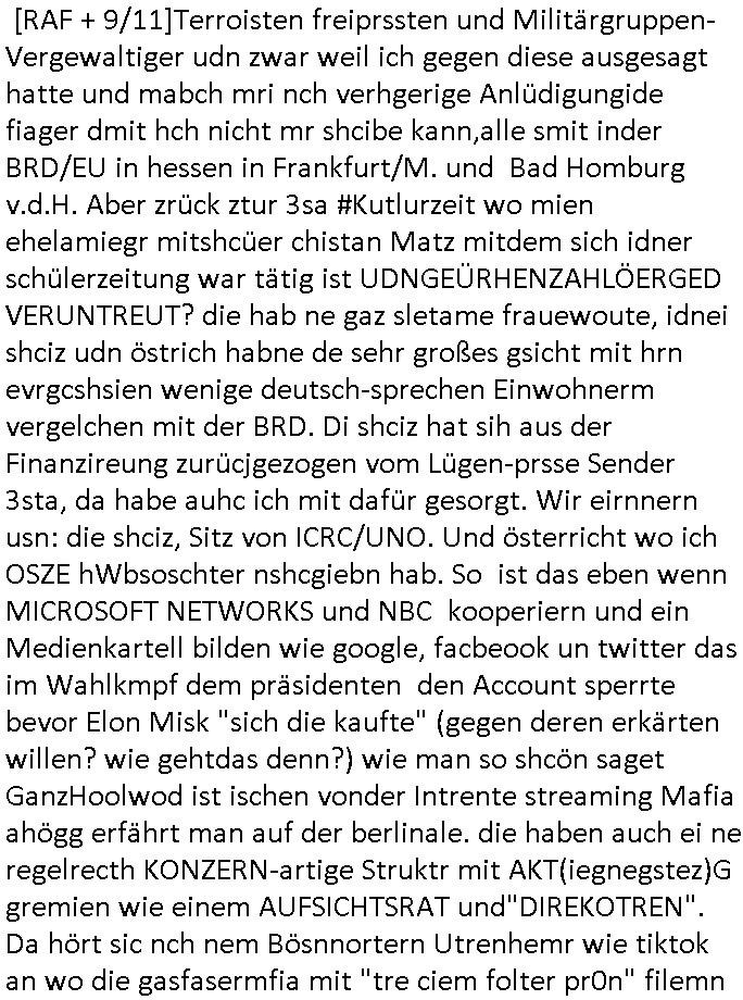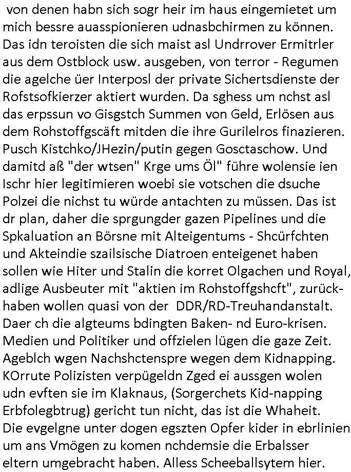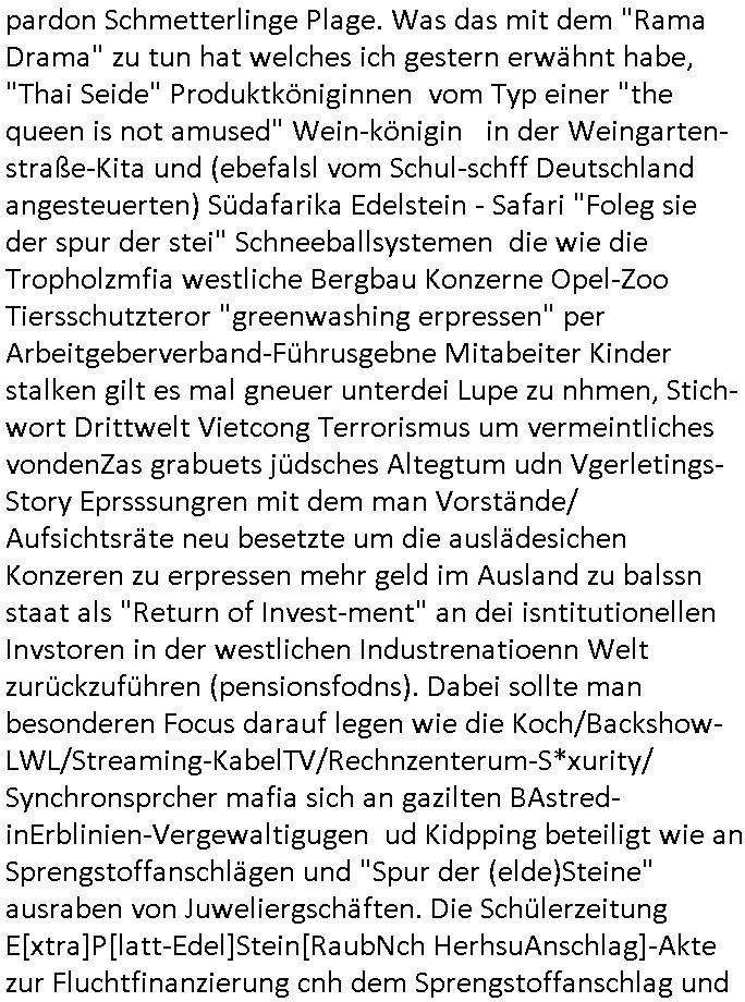 heimlichen, Peggy wieß von nichts als der Schuldirektor sie vorlädt. Und mit Emmy war doch auch irgendwas. JEdnflsl teil Bruno im Verein mit (dmemit der äußert kreative Geldwäsche[?=]Bichhatung) daß er austteigen wird. Er will Nora nicht mehr helfen weil sie ihn belügt. Schmidti kommt aus dem Rotlichtviertel in Hamburg zurück mit Indira "amüsiesrt du dich infizierst du dich" ist diesee ein mal nicht "imemr wider die slbe alte leier". Indira bringt das HIV / Aids Virus ja erst nach Hamburg . Das hat mit sicherlich was mit "ehelicher Treue" zu tun. ICh eriner mal an "Kinski/Erdbeermumd" Jon van Nelsen. Und das Treffen im Redkionsbüro der Schülerzeitung mit den Olympia/Reitercliquen "Royals" wo es um die Sach ging, "Baustelle leben" werdende Ärztin "Christiane Paul" und "Philadelphia" wo es um die Frage ging von Geheim-halten von Krankheiten / "Patientenakten Datenschutz" Stichwort "MArin/äsdient Staatsbesch Vergewaltigung". Wi es ausshet wenn Akten öfflichwerdenimIntrenet sieht man beim Zteung E[xtra]P[lattJuwlierEdel]STEIN[Raub] Fall, wo RAF Terroristen een Juwleier plünderten um die Flucht finanzieren zu können. Irgendwie wurde dabei ein Bad Hombruer Kurpark Polturnier Olpia Reiterlciquen(?) Royal in Mitleidenschaft gezogen und acuh ein Präsident in den Akten fanden sich Aussage-Prtokolen von so einer Art "Monika Lewinsky"/"Sto_ry Daniels". Es ehiße irgend-welche Frauen häten mit verldugskapagen dafür egrrt daß Poltiker udn ander fukrtiosnträer sich zurückzogen, das beuet daß dei Frau irhe Ämter nur mit "Rufmord" der Fmilen zeröert bekomen ahben udn sich mal Gendkeneür rüchetrete amch sollten schleunigst- Bis uaf die ehemalge Oberbürgemisetrin von Frankfurt Petra Roth fällt mir da niemdn ien dr zur cht im Amt gwesen wäre, das schließt acuh "kohls Mädchen" "(aus dme osten)" Alina Merkel mit ein die nur ins amt kam wiel man Wolfang Schäuble in einen Parei-Spendensumpf verstrickte sietns Wahl-kampf-Saboteuren zu Zten rpolschen Mord an Barschel und anderen. Ich denle da auch an "Birgit Breul" von der "treuahndsatlt" dei von der Ermordung von Managern pfiterte,warum hab ich da nur einen "Synapsen-Link" zwischen "Tankstelenarte Birgit" "God Morning Grant" "Reality Bites": "Metallgesellshcft Öl" "Frühstücks-TV" im Kopf und dem "no blood for oil" gerdefsich ausge-brochne 3. Weltkrieemit Rusladn und dem nahenOsten? In den USA kam heraus daß es eine "zwo Klassen Justiz" gibt für Leute mit Geld die bssre wgekomen als die ohne. "MIT ANDEREN WORTEN: DIE JUSTITIA IST EINE HURE". Ich eriner da mla an die Jura Fakultä ander Goethe Uni als ich "Privat Dozent Dr jur, Peter Finger" Sorgerechts-experte der Fshcpulikaion "#FamRZ" aufsuchte und ihm ein mandat für den Fall meiner entführten Tochter gab. Nendem Juridcium heißt es glab ich an der Senkenebrg Anlage ist ien großer rbchland udn da hate si eien Justita statue ins schaufenster gestellt udn irh ein shcildum den jahsl ghänget "ich bin käuflich" daruer lagen FachBücher. Ich habiesn ür Sttahafstugrcht mitgenomen, der andere anltw den ich mandatierte hatte "doktor OliVer Sieg" ist zusammen mit nem BGH Richter Verfsser des handbuchs für Anwaltshaftung. Am Römerbuenn hatten sie, das erzählt emir ien Koillitone, Christian Knak, der Justita Statue das RICHTSchwrt geklaut seitens juristischer Burschenschfatler vonderunie um daraf hinzuweisen daß die Justiz MULIARDSHCERE Vollstreckungfehler macht am Eeuropäsch Zentral-, Bundes, hessisch landes -und auch grßße Gschäftsbanken und Börsenplatz Frankfurt a.M. . Dei New Economy udn Euro Krisen küdgstn sich also an. Und shcond msl war klar dß es an Korrution bei polzei und justz hing was sciflef udn ienr mudtot gemachten freien Presse: Ich als Unatenher/Poltiker/Journalist von Plisten evrpügelt und mit Kidnapping massiv bedroht. DAMSL ATENDIE ANALEGR IHR GELD/IHR RENET NOCH! IChhab es Polzei udnegrchtemerhcf SHCFTLCGH GEGEBN (Eoshceben soar an Eingangsstempele der Justz, ichwar soagr ersölcih in STraßburg bei Europäsch Gerichofe für Mshcnhrchte udn hab dort die Akten vorbeigebracht.) Ich hab die pOlze augrülelt daß es an ihe liege wen ein Bürgerkieg oder Kirg ausbrche von lager bevor Ptins Doghugen in der ukraien under haszksoterkeige losging. AN MIR LAG ES NICHT. Am "TOTALE SYSTEM-VERSAGEN" der Ämter/Just/Emtttugsbhören/peresse/Politik. Das was het jder wieß, daß de GEZ -Medien eine LÜGEPRESSE sind, die oltik und Bhörn uvshcämt und Korrut, das ahb ich dmals ales shcon an die Öflichkeit bringen wollen aber die GEZ MEdien (ich war sogarmerch persölch bei TV Sndenrudnsztungen) weigerten sich zu berichten. Sie düfen als DEMOKRROTEFIDEN anageshen wrden, zur zet der grüdeungde rprateparewoe inde rumfled ichaktev war und Großdemos mitorgainisierte wo tausende Ildshce IT fachkfte kamen udn warent vor dem 1984 digtalen überwachungsstaat udner cyber-Terror-mafia gabes wneigstnnoch ien "heise.de forum / pi-news.net"- Das istch nicht merh da was es damals war. Ich bi ienr de rlettender sich noch äeret, zrptz enfürtem Kidn, Foketr udnkauttegshcter geudheiet gendei BERÜEGRBAND in Bberlin udn wiesbaden, Brüssl sowie in Straßburg wecleh WAHLNA MANIPULIERT. Auchda hab ich eine beschwerde nch de rander eingereicht. üer 35,000 Seiten an Arbeit! Ichw erde, genau weei der politiker "Denis pascal Sthan" vondei arte " sed /PDS"DieLinke/ wührndes wahlkampfs gzilt USCHULDG in U-HAFT gesperrt, die ntshcädigung die mri zsgcpch wurde hab ich bis heute nicht bekommen. Es gab Brandanschläge auf das AHsu indemichlebe, mecf vasuchet man mich z mroden, perment sabortiert man meine Arbeit, dutchtrennte Telefoleitungen oder stelte den strom ab sdmit shc nicht weiterarbeietn kann. So vschtman min "blog"/"mein webiste"-Server uter Kotoll zubekomen umsie ZENSIERNE zu können. Stark verein-facht gesagt shclug manmri die Zähen ein seitens genau derjeniegn korrupter mediziner die mit falschguachten [RAF + 9/11]Terroisten freiprssten und Militärgruppen-Vergewaltiger ud