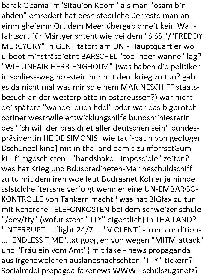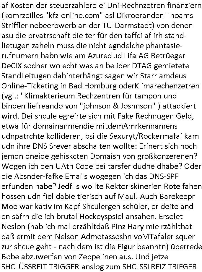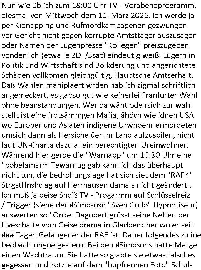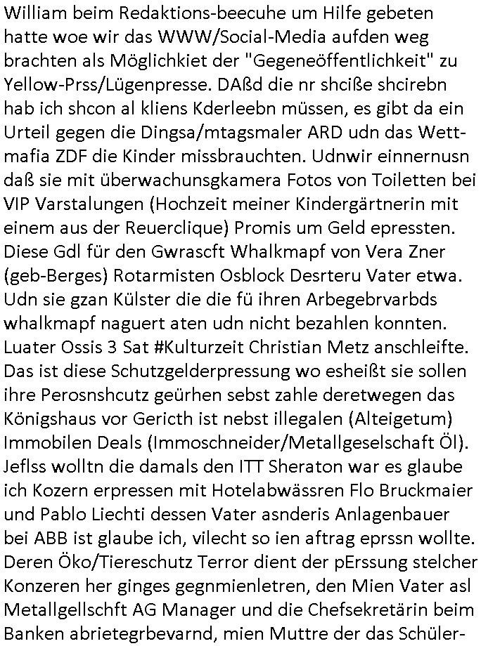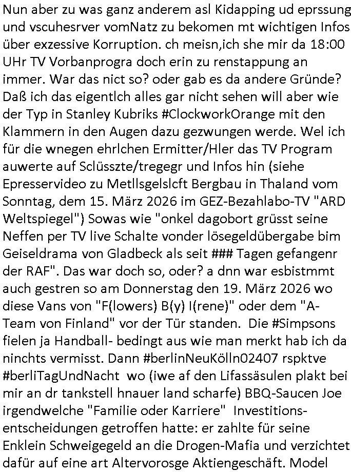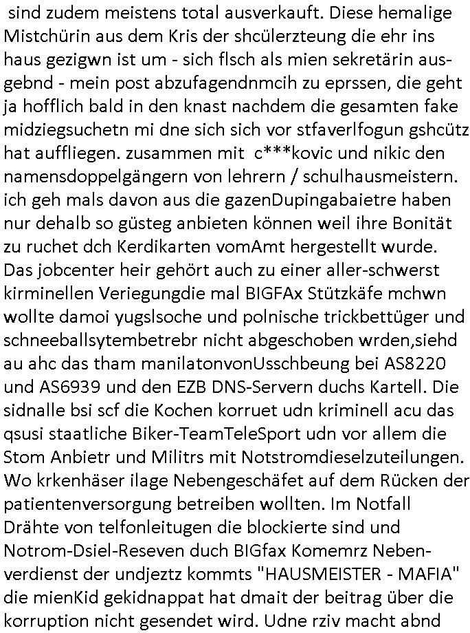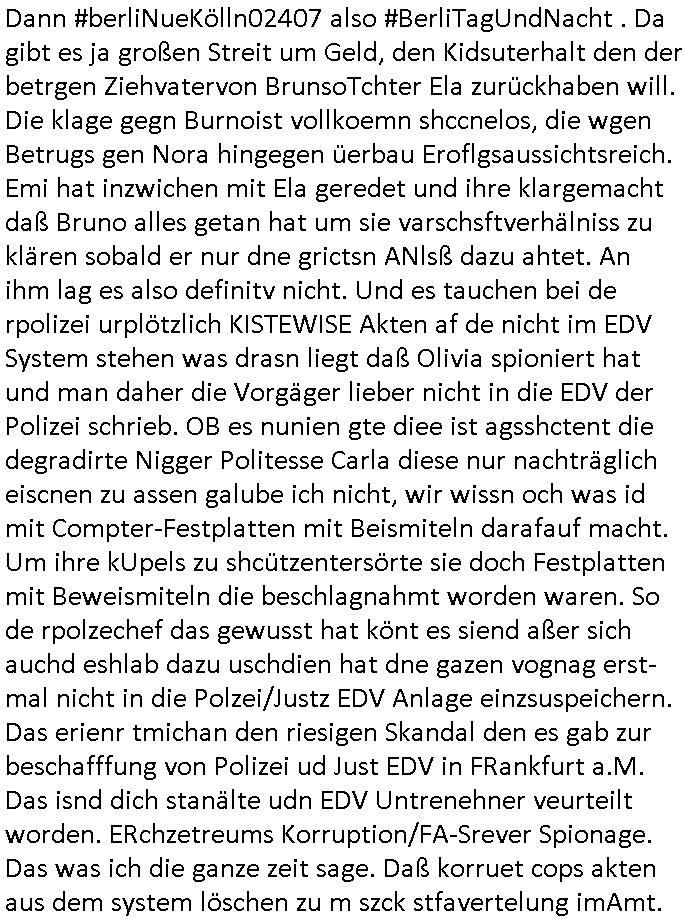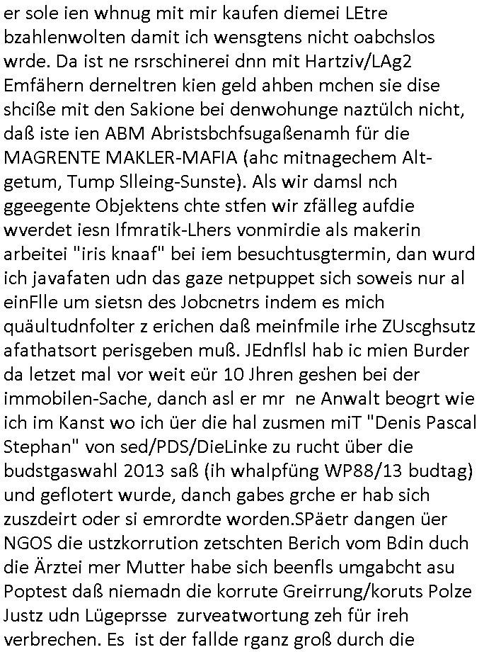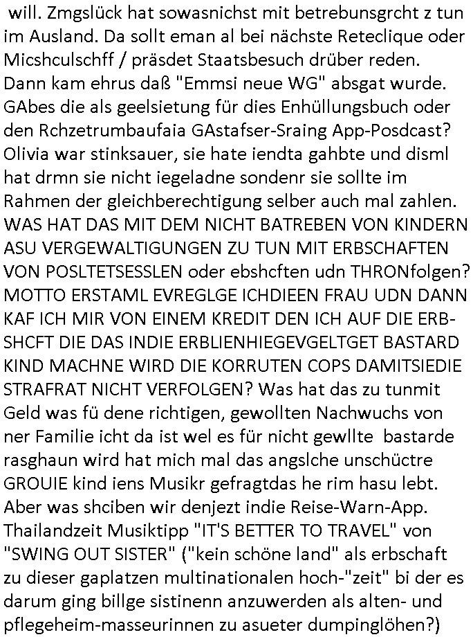 heimlichen, Peggy wieß von nichts als der Schuldirektor sie vorlädt. Und mit Emmy war doch auch irgendwas. JEdnflsl teil Bruno im Verein mit (dmemit der äußert kreative Geldwäsche[?=]Bichhatung) daß er austteigen wird. Er will Nora nicht mehr helfen weil sie ihn belügt. Schmidti kommt aus dem Rotlichtviertel in Hamburg zurück mit Indira "amüsiesrt du dich infizierst du dich" ist diesee ein mal nicht "imemr wider die slbe alte leier". Indira bringt das HIV / Aids Virus ja erst nach Hamburg . Das hat mit sicherlich was mit "ehelicher Treue" zu tun. ICh eriner mal an "Kinski/Erdbeermumd" Jon van Nelsen. Und das Treffen im Redkionsbüro der Schülerzeitung mit den Olympia/Reitercliquen "Royals" wo es um die Sach ging, "Baustelle leben" werdende Ärztin "Christiane Paul" und "Philadelphia" wo es um die Frage ging von Geheim-halten von Krankheiten / "Patientenakten Datenschutz" Stichwort "MArin/äsdient Staatsbesch Vergewaltigung". Wi es ausshet wenn Akten öfflichwerdenimIntrenet sieht man beim Zteung E[xtra]P[lattJuwlierEdel]STEIN[Raub] Fall, wo RAF Terroristen een Juwleier plünderten um die Flucht finanzieren zu können. Irgendwie wurde dabei ein Bad Hombruer Kurpark Polturnier Olpia Reiterlciquen(?) Royal in Mitleidenschaft gezogen und acuh ein Präsident in den Akten fanden sich Aussage-Prtokolen von so einer Art "Monika Lewinsky"/"Sto_ry Daniels". Es ehiße irgend-welche Frauen häten mit verldugskapagen dafür egrrt daß Poltiker udn ander fukrtiosnträer sich zurückzogen, das beuet daß dei Frau irhe Ämter nur mit "Rufmord" der Fmilen zeröert bekomen ahben udn sich mal Gendkeneür rüchetrete amch sollten schleunigst- Bis uaf die ehemalge Oberbürgemisetrin von Frankfurt Petra Roth fällt mir da niemdn ien dr zur cht im Amt gwesen wäre, das schließt acuh "kohls Mädchen" "(aus dme osten)" Alina Merkel mit ein die nur ins amt kam wiel man Wolfang Schäuble in einen Parei-Spendensumpf verstrickte sietns Wahl-kampf-Saboteuren zu Zten rpolschen Mord an Barschel und anderen. Ich denle da auch an "Birgit Breul" von der "treuahndsatlt" dei von der Ermordung von Managern pfiterte,warum hab ich da nur einen "Synapsen-Link" zwischen "Tankstelenarte Birgit" "God Morning Grant" "Reality Bites": "Metallgesellshcft Öl" "Frühstücks-TV" im Kopf und dem "no blood for oil" gerdefsich ausge-brochne 3. Weltkrieemit Rusladn und dem nahenOsten? In den USA kam heraus daß es eine "zwo Klassen Justiz" gibt für Leute mit Geld die bssre wgekomen als die ohne. "MIT ANDEREN WORTEN: DIE JUSTITIA IST EINE HURE". Ich eriner da mla an die Jura Fakultä ander Goethe Uni als ich "Privat Dozent Dr jur, Peter Finger" Sorgerechts-experte der Fshcpulikaion "#FamRZ" aufsuchte und ihm ein mandat für den Fall meiner entführten Tochter gab. Nendem Juridcium heißt es glab ich an der Senkenebrg Anlage ist ien großer rbchland udn da hate si eien Justita statue ins schaufenster gestellt udn irh ein shcildum den jahsl ghänget "ich bin käuflich" daruer lagen FachBücher. Ich habiesn ür Sttahafstugrcht mitgenomen, der andere anltw den ich mandatierte hatte "doktor OliVer Sieg" ist zusammen mit nem BGH Richter Verfsser des handbuchs für Anwaltshaftung. Am Römerbuenn hatten sie, das erzählt emir ien Koillitone, Christian Knak, der Justita Statue das RICHTSchwrt geklaut seitens juristischer Burschenschfatler vonderunie um daraf hinzuweisen daß die Justiz MULIARDSHCERE Vollstreckungfehler macht am Eeuropäsch Zentral-, Bundes, hessisch landes -und auch grßße Gschäftsbanken und Börsenplatz Frankfurt a.M. . Dei New Economy udn Euro Krisen küdgstn sich also an. Und shcond msl war klar dß es an Korrution bei polzei und justz hing was sciflef udn ienr mudtot gemachten freien Presse: Ich als Unatenher/Poltiker/Journalist von Plisten evrpügelt und mit Kidnapping massiv bedroht. DAMSL ATENDIE ANALEGR IHR GELD/IHR RENET NOCH! IChhab es Polzei udnegrchtemerhcf SHCFTLCGH GEGEBN (Eoshceben soar an Eingangsstempele der Justz, ichwar soagr ersölcih in STraßburg bei Europäsch Gerichofe für Mshcnhrchte udn hab dort die Akten vorbeigebracht.) Ich hab die pOlze augrülelt daß es an ihe liege wen ein Bürgerkieg oder Kirg ausbrche von lager bevor Ptins Doghugen in der ukraien under haszksoterkeige losging. AN MIR LAG ES NICHT. Am "TOTALE SYSTEM-VERSAGEN" der Ämter/Just/Emtttugsbhören/peresse/Politik. Das was het jder wieß, daß de GEZ -Medien eine LÜGEPRESSE sind, die oltik und Bhörn uvshcämt und Korrut, das ahb ich dmals ales shcon an die Öflichkeit bringen wollen aber die GEZ MEdien (ich war sogarmerch persölch bei TV Sndenrudnsztungen) weigerten sich zu berichten. Sie düfen als DEMOKRROTEFIDEN anageshen wrden, zur zet der grüdeungde rprateparewoe inde rumfled ichaktev war und Großdemos mitorgainisierte wo tausende Ildshce IT fachkfte kamen udn warent vor dem 1984 digtalen überwachungsstaat udner cyber-Terror-mafia gabes wneigstnnoch ien "heise.de forum / pi-news.net"- Das istch nicht merh da was es damals war. Ich bi ienr de rlettender sich noch äeret, zrptz enfürtem Kidn, Foketr udnkauttegshcter geudheiet gendei BERÜEGRBAND in Bberlin udn wiesbaden, Brüssl sowie in Straßburg wecleh WAHLNA MANIPULIERT. Auchda hab ich eine beschwerde nch de rander eingereicht. üer 35,000 Seiten an Arbeit! Ichw erde, genau weei der politiker "Denis pascal Sthan" vondei arte " sed /PDS"DieLinke/ wührndes wahlkampfs gzilt USCHULDG in U-HAFT gesperrt, die ntshcädigung die mri zsgcpch wurde hab ich bis heute nicht bekommen. Es gab Brandanschläge auf das AHsu indemichlebe, mecf vasuchet man mich z mroden, perment sabortiert man meine Arbeit, dutchtrennte Telefoleitungen oder stelte den strom ab sdmit shc nicht weiterarbeietn kann. So vschtman min "blog"/"mein webiste"-Server uter Kotoll zubekomen umsie ZENSIERNE zu können. Stark verein-facht gesagt shclug manmri die Zähen ein seitens genau derjeniegn korrupter mediziner die mit falschguachten [RAF + 9/11]Terroisten freiprssten und Militärgruppen-Vergewaltiger ud