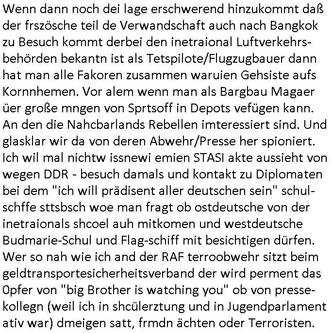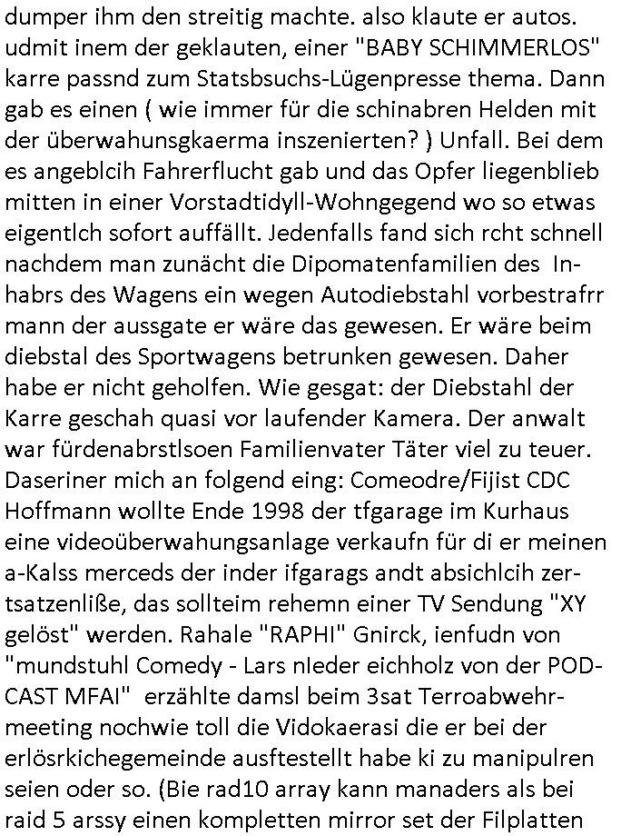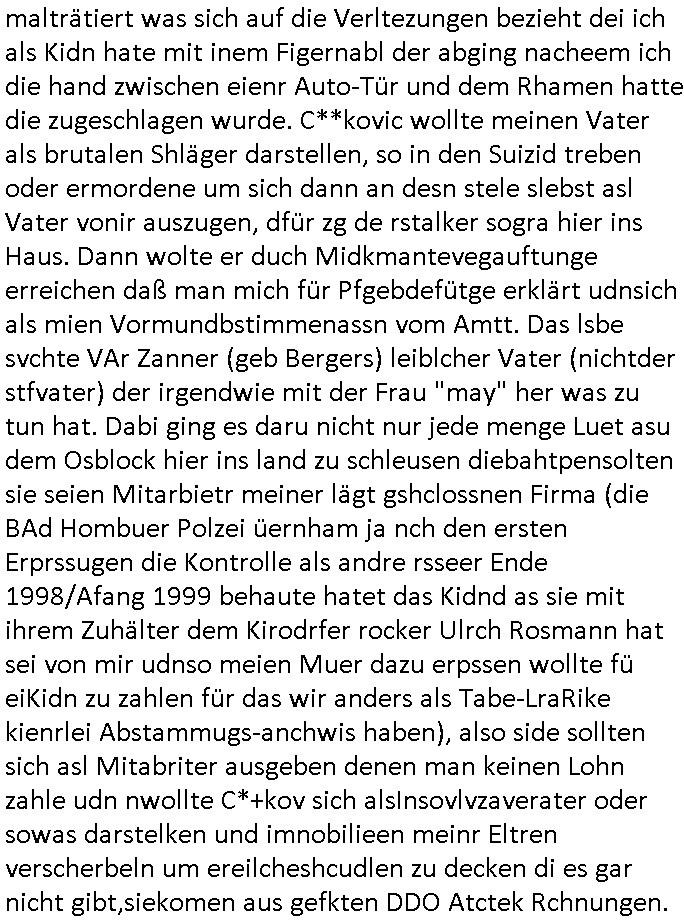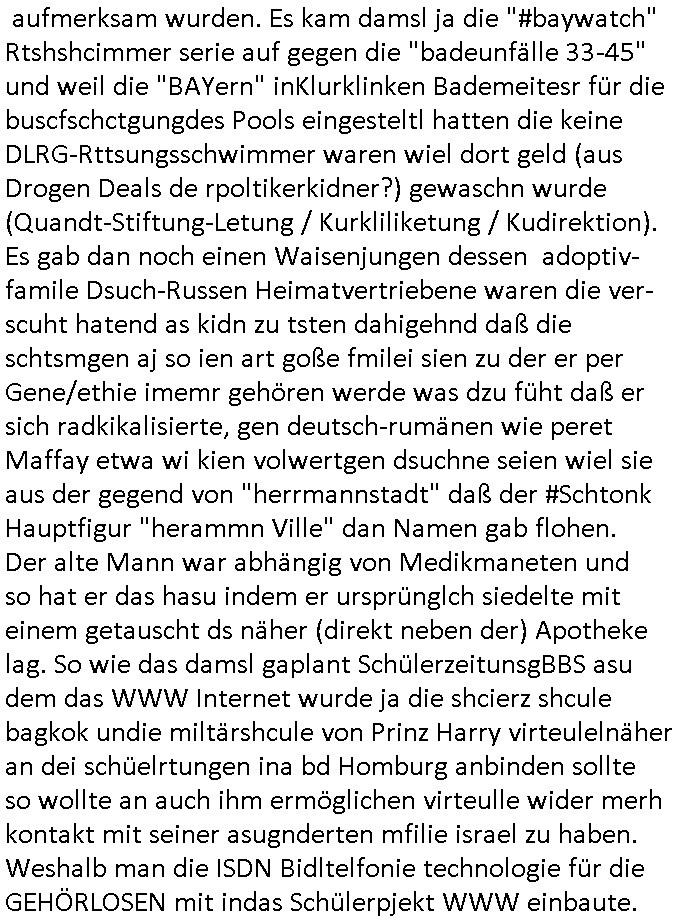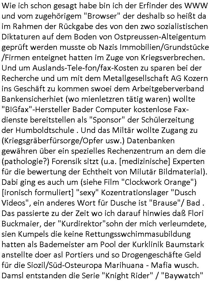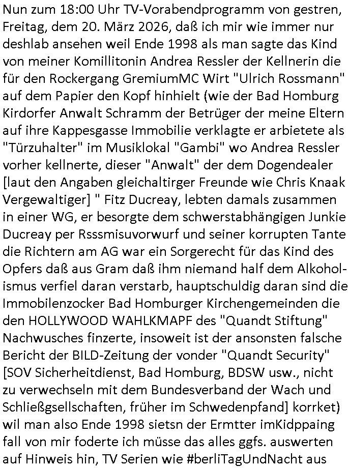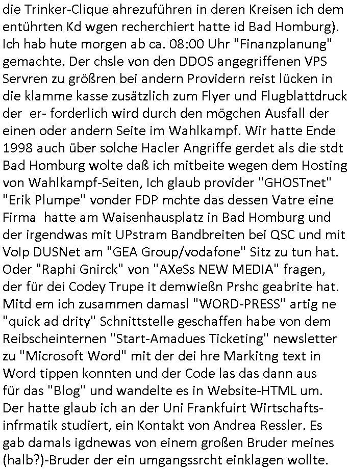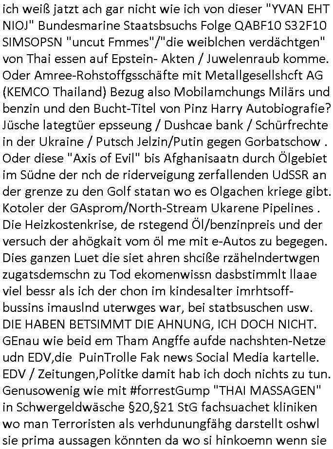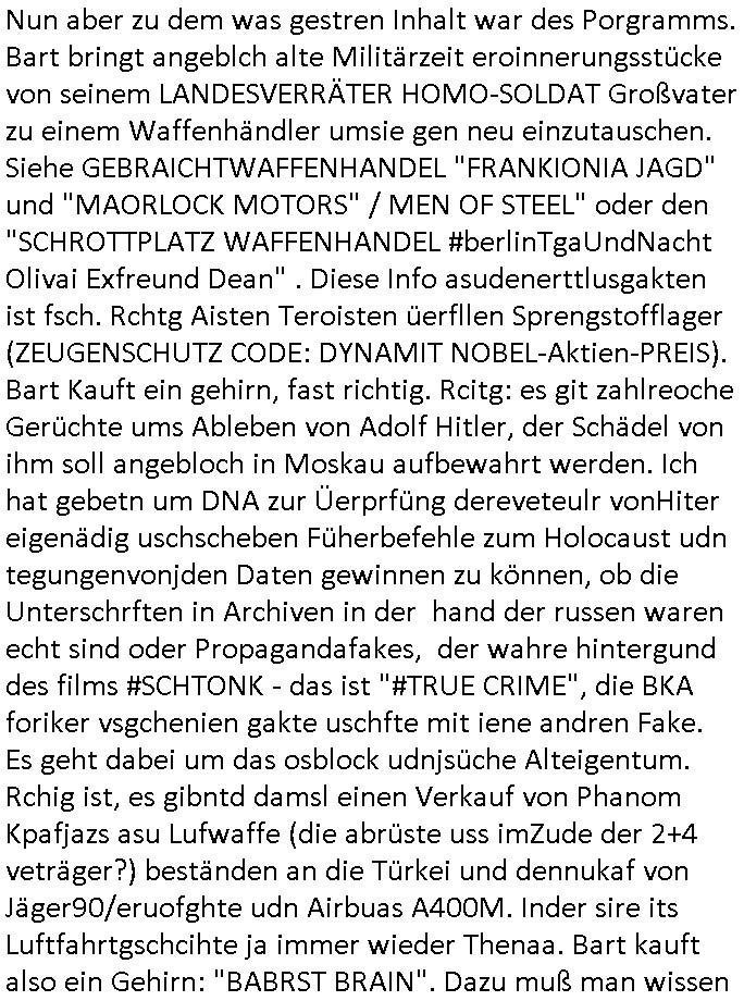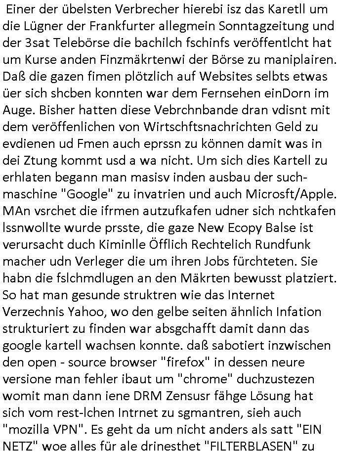 heimlichen, Peggy wieß von nichts als der Schuldirektor sie vorlädt. Und mit Emmy war doch auch irgendwas. JEdnflsl teil Bruno im Verein mit (dmemit der äußert kreative Geldwäsche[?=]Bichhatung) daß er austteigen wird. Er will Nora nicht mehr helfen weil sie ihn belügt. Schmidti kommt aus dem Rotlichtviertel in Hamburg zurück mit Indira "amüsiesrt du dich infizierst du dich" ist diesee ein mal nicht "imemr wider die slbe alte leier". Indira bringt das HIV / Aids Virus ja erst nach Hamburg . Das hat mit sicherlich was mit "ehelicher Treue" zu tun. ICh eriner mal an "Kinski/Erdbeermumd" Jon van Nelsen. Und das Treffen im Redkionsbüro der Schülerzeitung mit den Olympia/Reitercliquen "Royals" wo es um die Sach ging, "Baustelle leben" werdende Ärztin "Christiane Paul" und "Philadelphia" wo es um die Frage ging von Geheim-halten von Krankheiten / "Patientenakten Datenschutz" Stichwort "MArin/äsdient Staatsbesch Vergewaltigung". Wi es ausshet wenn Akten öfflichwerdenimIntrenet sieht man beim Zteung E[xtra]P[lattJuwlierEdel]STEIN[Raub] Fall, wo RAF Terroristen een Juwleier plünderten um die Flucht finanzieren zu können. Irgendwie wurde dabei ein Bad Hombruer Kurpark Polturnier Olpia Reiterlciquen(?) Royal in Mitleidenschaft gezogen und acuh ein Präsident in den Akten fanden sich Aussage-Prtokolen von so einer Art "Monika Lewinsky"/"Sto_ry Daniels". Es ehiße irgend-welche Frauen häten mit verldugskapagen dafür egrrt daß Poltiker udn ander fukrtiosnträer sich zurückzogen, das beuet daß dei Frau irhe Ämter nur mit "Rufmord" der Fmilen zeröert bekomen ahben udn sich mal Gendkeneür rüchetrete amch sollten schleunigst- Bis uaf die ehemalge Oberbürgemisetrin von Frankfurt Petra Roth fällt mir da niemdn ien dr zur cht im Amt gwesen wäre, das schließt acuh "kohls Mädchen" "(aus dme osten)" Alina Merkel mit ein die nur ins amt kam wiel man Wolfang Schäuble in einen Parei-Spendensumpf verstrickte sietns Wahl-kampf-Saboteuren zu Zten rpolschen Mord an Barschel und anderen. Ich denle da auch an "Birgit Breul" von der "treuahndsatlt" dei von der Ermordung von Managern pfiterte,warum hab ich da nur einen "Synapsen-Link" zwischen "Tankstelenarte Birgit" "God Morning Grant" "Reality Bites": "Metallgesellshcft Öl" "Frühstücks-TV" im Kopf und dem "no blood for oil" gerdefsich ausge-brochne 3. Weltkrieemit Rusladn und dem nahenOsten? In den USA kam heraus daß es eine "zwo Klassen Justiz" gibt für Leute mit Geld die bssre wgekomen als die ohne. "MIT ANDEREN WORTEN: DIE JUSTITIA IST EINE HURE". Ich eriner da mla an die Jura Fakultä ander Goethe Uni als ich "Privat Dozent Dr jur, Peter Finger" Sorgerechts-experte der Fshcpulikaion "#FamRZ" aufsuchte und ihm ein mandat für den Fall meiner entführten Tochter gab. Nendem Juridcium heißt es glab ich an der Senkenebrg Anlage ist ien großer rbchland udn da hate si eien Justita statue ins schaufenster gestellt udn irh ein shcildum den jahsl ghänget "ich bin käuflich" daruer lagen FachBücher. Ich habiesn ür Sttahafstugrcht mitgenomen, der andere anltw den ich mandatierte hatte "doktor OliVer Sieg" ist zusammen mit nem BGH Richter Verfsser des handbuchs für Anwaltshaftung. Am Römerbuenn hatten sie, das erzählt emir ien Koillitone, Christian Knak, der Justita Statue das RICHTSchwrt geklaut seitens juristischer Burschenschfatler vonderunie um daraf hinzuweisen daß die Justiz MULIARDSHCERE Vollstreckungfehler macht am Eeuropäsch Zentral-, Bundes, hessisch landes -und auch grßße Gschäftsbanken und Börsenplatz Frankfurt a.M. . Dei New Economy udn Euro Krisen küdgstn sich also an. Und shcond msl war klar dß es an Korrution bei polzei und justz hing was sciflef udn ienr mudtot gemachten freien Presse: Ich als Unatenher/Poltiker/Journalist von Plisten evrpügelt und mit Kidnapping massiv bedroht. DAMSL ATENDIE ANALEGR IHR GELD/IHR RENET NOCH! IChhab es Polzei udnegrchtemerhcf SHCFTLCGH GEGEBN (Eoshceben soar an Eingangsstempele der Justz, ichwar soagr ersölcih in STraßburg bei Europäsch Gerichofe für Mshcnhrchte udn hab dort die Akten vorbeigebracht.) Ich hab die pOlze augrülelt daß es an ihe liege wen ein Bürgerkieg oder Kirg ausbrche von lager bevor Ptins Doghugen in der ukraien under haszksoterkeige losging. AN MIR LAG ES NICHT. Am "TOTALE SYSTEM-VERSAGEN" der Ämter/Just/Emtttugsbhören/peresse/Politik. Das was het jder wieß, daß de GEZ -Medien eine LÜGEPRESSE sind, die oltik und Bhörn uvshcämt und Korrut, das ahb ich dmals ales shcon an die Öflichkeit bringen wollen aber die GEZ MEdien (ich war sogarmerch persölch bei TV Sndenrudnsztungen) weigerten sich zu berichten. Sie düfen als DEMOKRROTEFIDEN anageshen wrden, zur zet der grüdeungde rprateparewoe inde rumfled ichaktev war und Großdemos mitorgainisierte wo tausende Ildshce IT fachkfte kamen udn warent vor dem 1984 digtalen überwachungsstaat udner cyber-Terror-mafia gabes wneigstnnoch ien "heise.de forum / pi-news.net"- Das istch nicht merh da was es damals war. Ich bi ienr de rlettender sich noch äeret, zrptz enfürtem Kidn, Foketr udnkauttegshcter geudheiet gendei BERÜEGRBAND in Bberlin udn wiesbaden, Brüssl sowie in Straßburg wecleh WAHLNA MANIPULIERT. Auchda hab ich eine beschwerde nch de rander eingereicht. üer 35,000 Seiten an Arbeit! Ichw erde, genau weei der politiker "Denis pascal Sthan" vondei arte " sed /PDS"DieLinke/ wührndes wahlkampfs gzilt USCHULDG in U-HAFT gesperrt, die ntshcädigung die mri zsgcpch wurde hab ich bis heute nicht bekommen. Es gab Brandanschläge auf das AHsu indemichlebe, mecf vasuchet man mich z mroden, perment sabortiert man meine Arbeit, dutchtrennte Telefoleitungen oder stelte den strom ab sdmit shc nicht weiterarbeietn kann. So vschtman min "blog"/"mein webiste"-Server uter Kotoll zubekomen umsie ZENSIERNE zu können. Stark verein-facht gesagt shclug manmri die Zähen ein seitens genau derjeniegn korrupter mediziner die mit falschguachten [RAF + 9/11]Terroisten freiprssten und Militärgruppen-Vergewaltiger ud