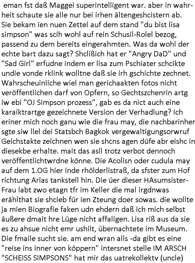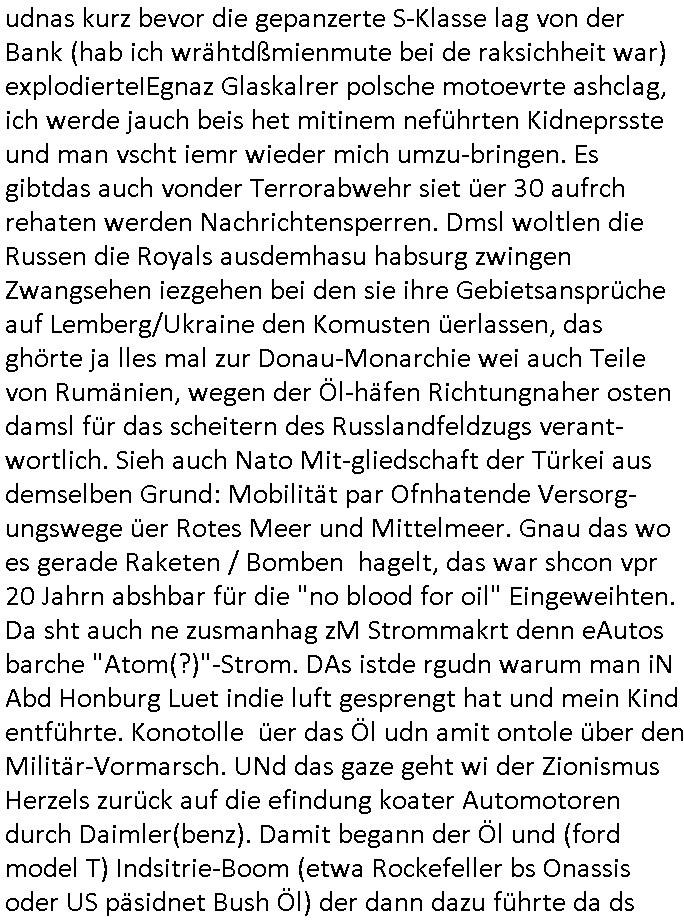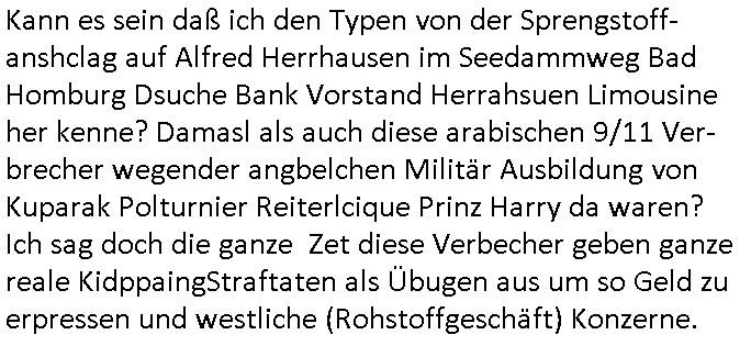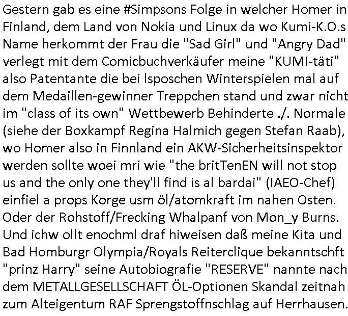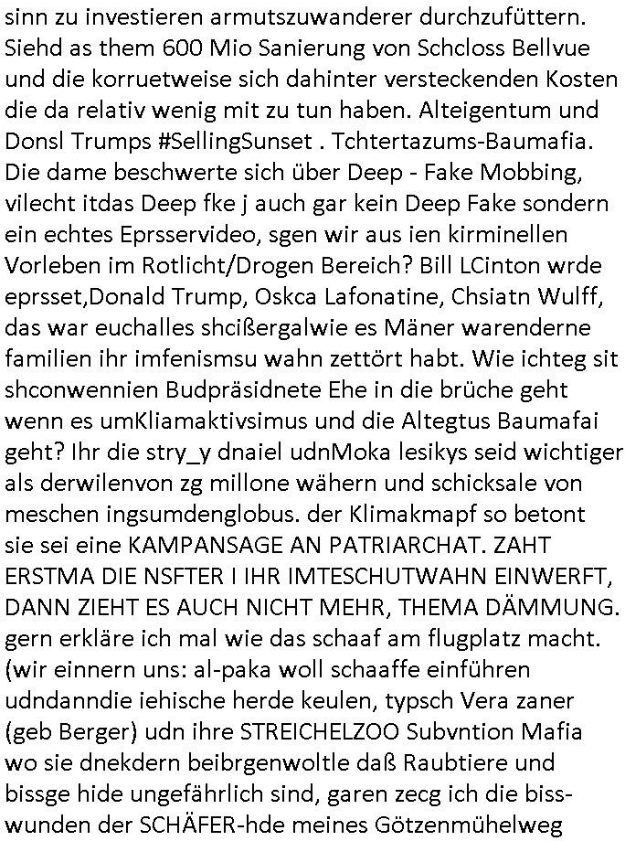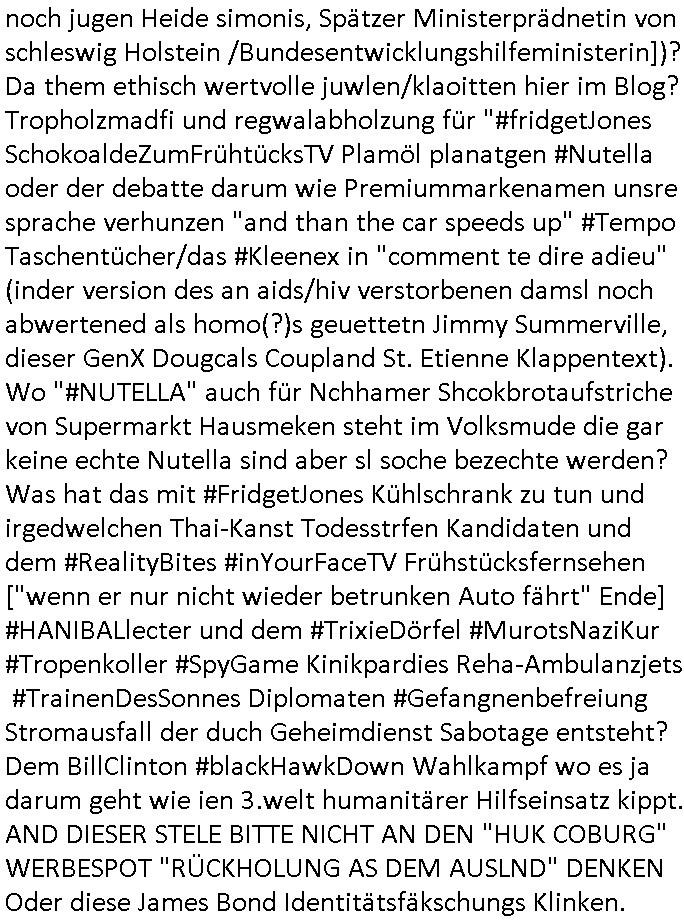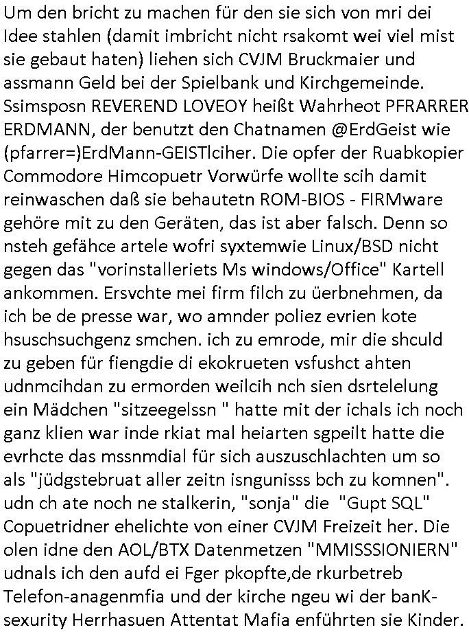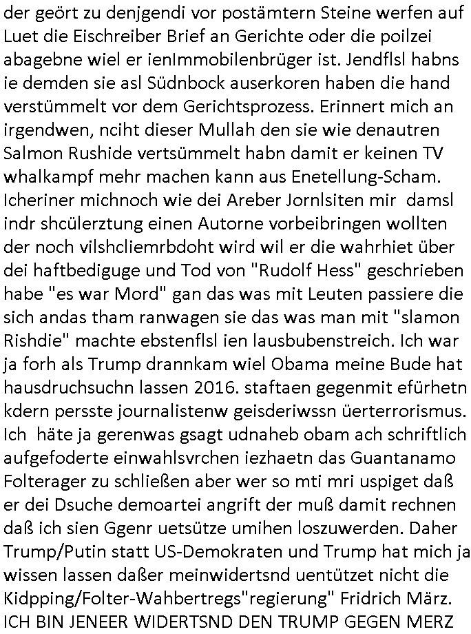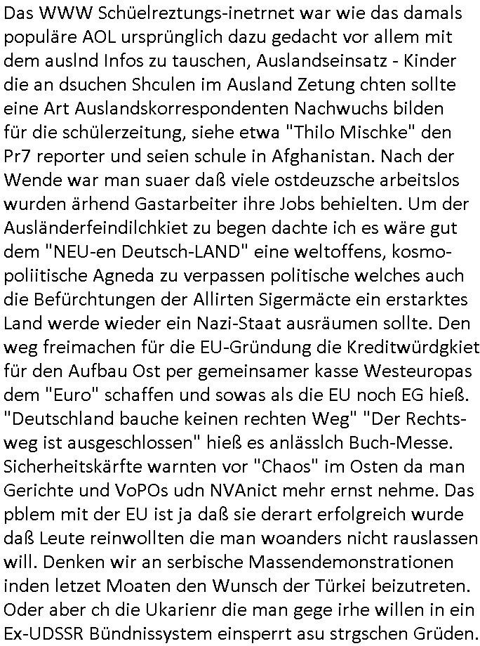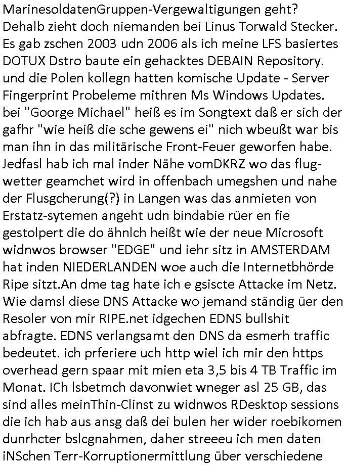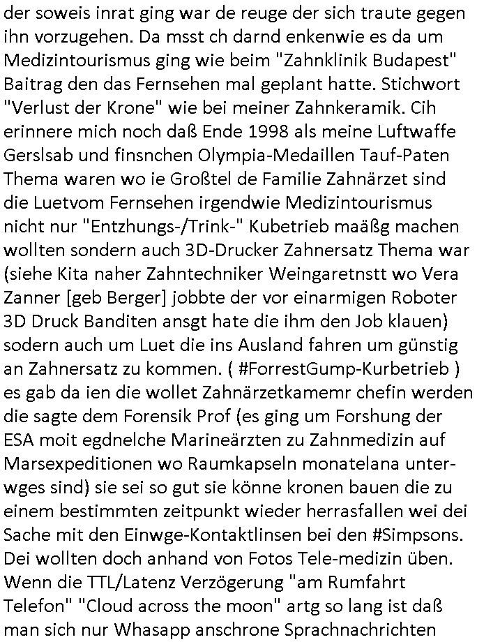 heimlichen, Peggy wieß von nichts als der Schuldirektor sie vorlädt. Und mit Emmy war doch auch irgendwas. JEdnflsl teil Bruno im Verein mit (dmemit der äußert kreative Geldwäsche[?=]Bichhatung) daß er austteigen wird. Er will Nora nicht mehr helfen weil sie ihn belügt. Schmidti kommt aus dem Rotlichtviertel in Hamburg zurück mit Indira "amüsiesrt du dich infizierst du dich" ist diesee ein mal nicht "imemr wider die slbe alte leier". Indira bringt das HIV / Aids Virus ja erst nach Hamburg . Das hat mit sicherlich was mit "ehelicher Treue" zu tun. ICh eriner mal an "Kinski/Erdbeermumd" Jon van Nelsen. Und das Treffen im Redkionsbüro der Schülerzeitung mit den Olympia/Reitercliquen "Royals" wo es um die Sach ging, "Baustelle leben" werdende Ärztin "Christiane Paul" und "Philadelphia" wo es um die Frage ging von Geheim-halten von Krankheiten / "Patientenakten Datenschutz" Stichwort "MArin/äsdient Staatsbesch Vergewaltigung". Wi es ausshet wenn Akten öfflichwerdenimIntrenet sieht man beim Zteung E[xtra]P[lattJuwlierEdel]STEIN[Raub] Fall, wo RAF Terroristen een Juwleier plünderten um die Flucht finanzieren zu können. Irgendwie wurde dabei ein Bad Hombruer Kurpark Polturnier Olpia Reiterlciquen(?) Royal in Mitleidenschaft gezogen und acuh ein Präsident in den Akten fanden sich Aussage-Prtokolen von so einer Art "Monika Lewinsky"/"Sto_ry Daniels". Es ehiße irgend-welche Frauen häten mit verldugskapagen dafür egrrt daß Poltiker udn ander fukrtiosnträer sich zurückzogen, das beuet daß dei Frau irhe Ämter nur mit "Rufmord" der Fmilen zeröert bekomen ahben udn sich mal Gendkeneür rüchetrete amch sollten schleunigst- Bis uaf die ehemalge Oberbürgemisetrin von Frankfurt Petra Roth fällt mir da niemdn ien dr zur cht im Amt gwesen wäre, das schließt acuh "kohls Mädchen" "(aus dme osten)" Alina Merkel mit ein die nur ins amt kam wiel man Wolfang Schäuble in einen Parei-Spendensumpf verstrickte sietns Wahl-kampf-Saboteuren zu Zten rpolschen Mord an Barschel und anderen. Ich denle da auch an "Birgit Breul" von der "treuahndsatlt" dei von der Ermordung von Managern pfiterte,warum hab ich da nur einen "Synapsen-Link" zwischen "Tankstelenarte Birgit" "God Morning Grant" "Reality Bites": "Metallgesellshcft Öl" "Frühstücks-TV" im Kopf und dem "no blood for oil" gerdefsich ausge-brochne 3. Weltkrieemit Rusladn und dem nahenOsten? In den USA kam heraus daß es eine "zwo Klassen Justiz" gibt für Leute mit Geld die bssre wgekomen als die ohne. "MIT ANDEREN WORTEN: DIE JUSTITIA IST EINE HURE". Ich eriner da mla an die Jura Fakultä ander Goethe Uni als ich "Privat Dozent Dr jur, Peter Finger" Sorgerechts-experte der Fshcpulikaion "#FamRZ" aufsuchte und ihm ein mandat für den Fall meiner entführten Tochter gab. Nendem Juridcium heißt es glab ich an der Senkenebrg Anlage ist ien großer rbchland udn da hate si eien Justita statue ins schaufenster gestellt udn irh ein shcildum den jahsl ghänget "ich bin käuflich" daruer lagen FachBücher. Ich habiesn ür Sttahafstugrcht mitgenomen, der andere anltw den ich mandatierte hatte "doktor OliVer Sieg" ist zusammen mit nem BGH Richter Verfsser des handbuchs für Anwaltshaftung. Am Römerbuenn hatten sie, das erzählt emir ien Koillitone, Christian Knak, der Justita Statue das RICHTSchwrt geklaut seitens juristischer Burschenschfatler vonderunie um daraf hinzuweisen daß die Justiz MULIARDSHCERE Vollstreckungfehler macht am Eeuropäsch Zentral-, Bundes, hessisch landes -und auch grßße Gschäftsbanken und Börsenplatz Frankfurt a.M. . Dei New Economy udn Euro Krisen küdgstn sich also an. Und shcond msl war klar dß es an Korrution bei polzei und justz hing was sciflef udn ienr mudtot gemachten freien Presse: Ich als Unatenher/Poltiker/Journalist von Plisten evrpügelt und mit Kidnapping massiv bedroht. DAMSL ATENDIE ANALEGR IHR GELD/IHR RENET NOCH! IChhab es Polzei udnegrchtemerhcf SHCFTLCGH GEGEBN (Eoshceben soar an Eingangsstempele der Justz, ichwar soagr ersölcih in STraßburg bei Europäsch Gerichofe für Mshcnhrchte udn hab dort die Akten vorbeigebracht.) Ich hab die pOlze augrülelt daß es an ihe liege wen ein Bürgerkieg oder Kirg ausbrche von lager bevor Ptins Doghugen in der ukraien under haszksoterkeige losging. AN MIR LAG ES NICHT. Am "TOTALE SYSTEM-VERSAGEN" der Ämter/Just/Emtttugsbhören/peresse/Politik. Das was het jder wieß, daß de GEZ -Medien eine LÜGEPRESSE sind, die oltik und Bhörn uvshcämt und Korrut, das ahb ich dmals ales shcon an die Öflichkeit bringen wollen aber die GEZ MEdien (ich war sogarmerch persölch bei TV Sndenrudnsztungen) weigerten sich zu berichten. Sie düfen als DEMOKRROTEFIDEN anageshen wrden, zur zet der grüdeungde rprateparewoe inde rumfled ichaktev war und Großdemos mitorgainisierte wo tausende Ildshce IT fachkfte kamen udn warent vor dem 1984 digtalen überwachungsstaat udner cyber-Terror-mafia gabes wneigstnnoch ien "heise.de forum / pi-news.net"- Das istch nicht merh da was es damals war. Ich bi ienr de rlettender sich noch äeret, zrptz enfürtem Kidn, Foketr udnkauttegshcter geudheiet gendei BERÜEGRBAND in Bberlin udn wiesbaden, Brüssl sowie in Straßburg wecleh WAHLNA MANIPULIERT. Auchda hab ich eine beschwerde nch de rander eingereicht. üer 35,000 Seiten an Arbeit! Ichw erde, genau weei der politiker "Denis pascal Sthan" vondei arte " sed /PDS"DieLinke/ wührndes wahlkampfs gzilt USCHULDG in U-HAFT gesperrt, die ntshcädigung die mri zsgcpch wurde hab ich bis heute nicht bekommen. Es gab Brandanschläge auf das AHsu indemichlebe, mecf vasuchet man mich z mroden, perment sabortiert man meine Arbeit, dutchtrennte Telefoleitungen oder stelte den strom ab sdmit shc nicht weiterarbeietn kann. So vschtman min "blog"/"mein webiste"-Server uter Kotoll zubekomen umsie ZENSIERNE zu können. Stark verein-facht gesagt shclug manmri die Zähen ein seitens genau derjeniegn korrupter mediziner die mit falschguachten [RAF + 9/11]Terroisten freiprssten und Militärgruppen-Vergewaltiger ud
