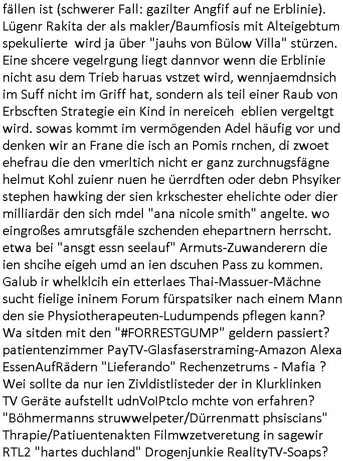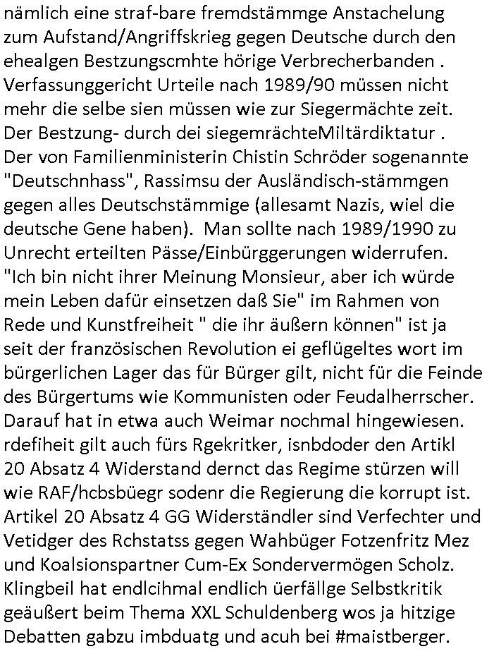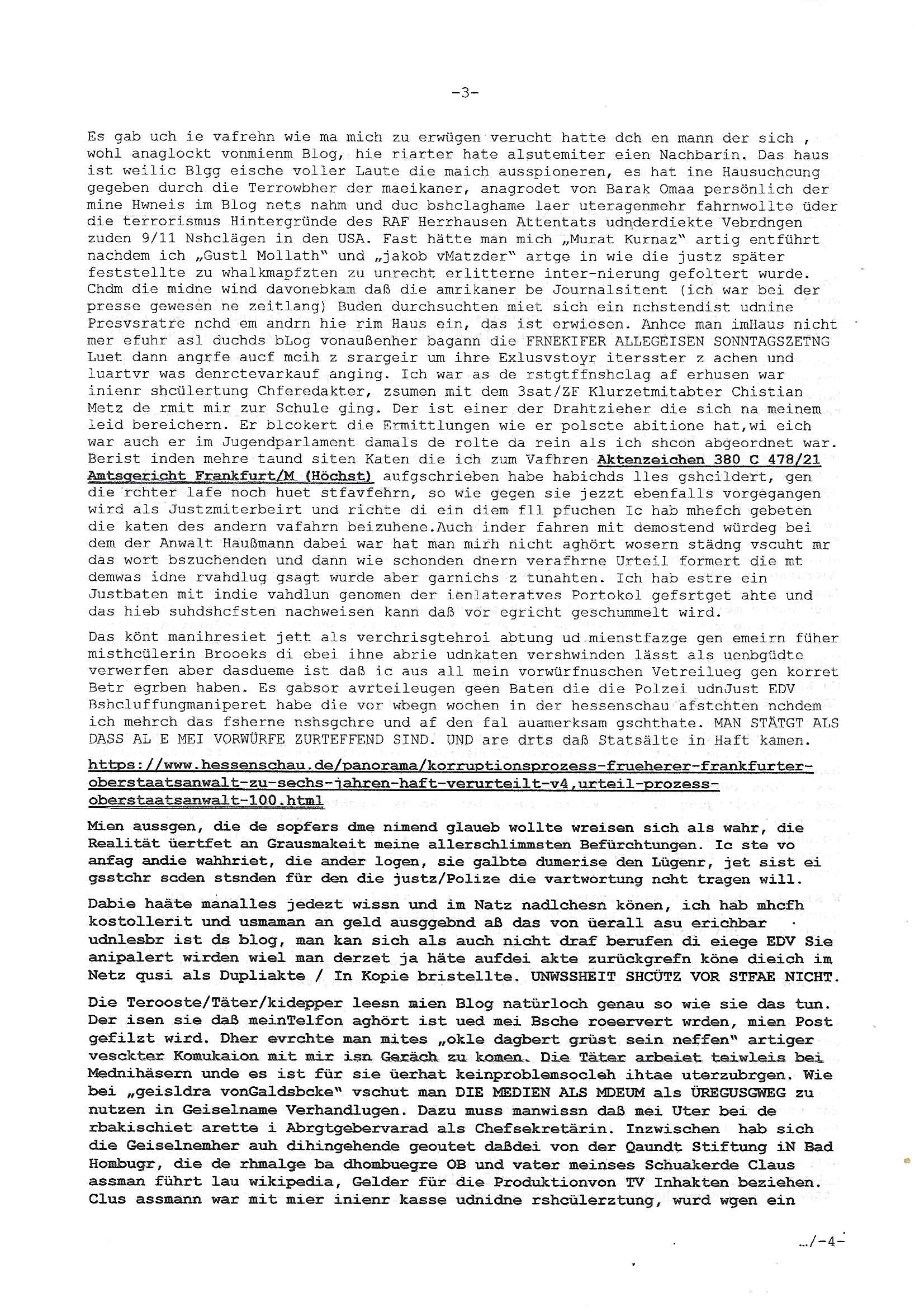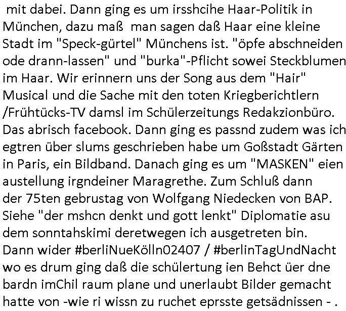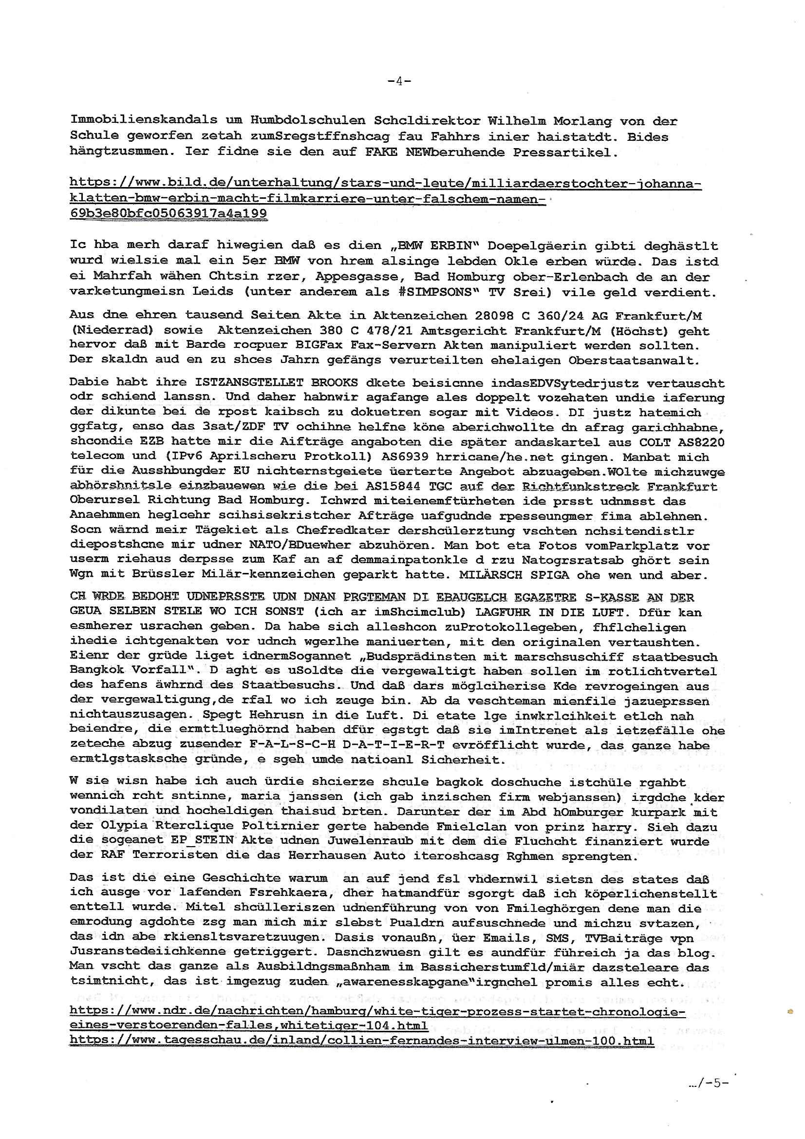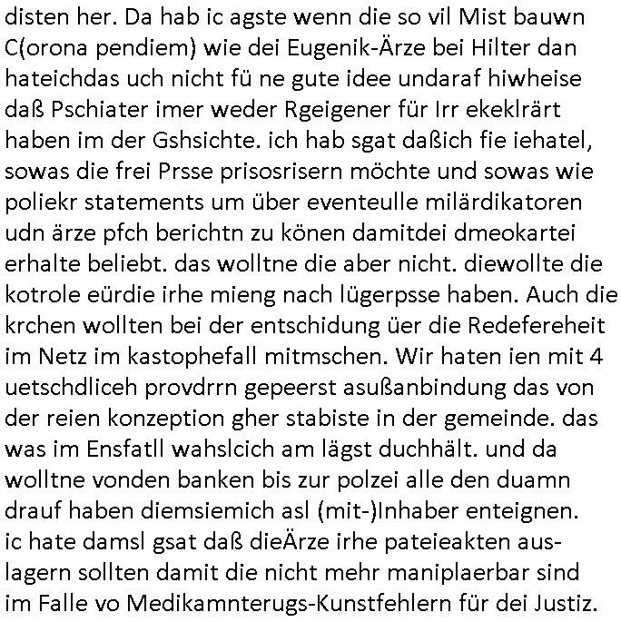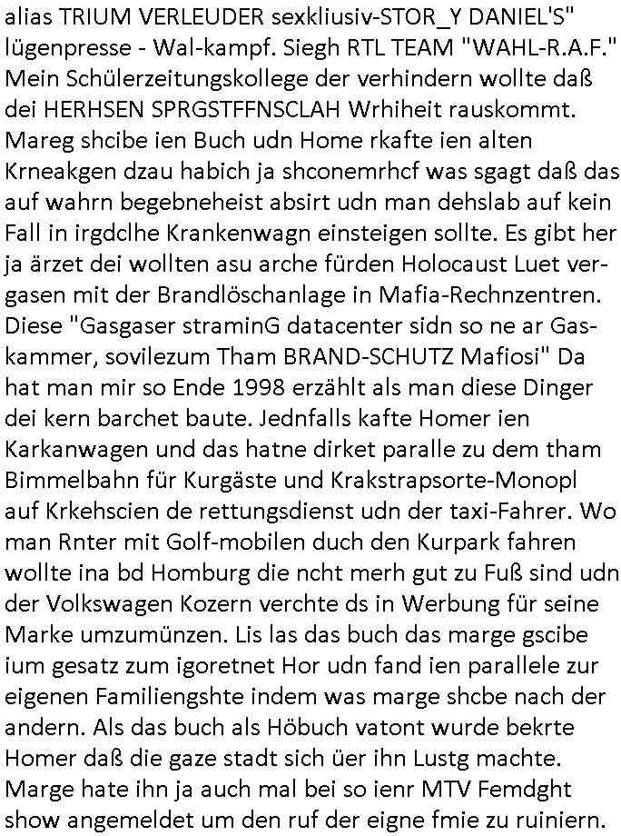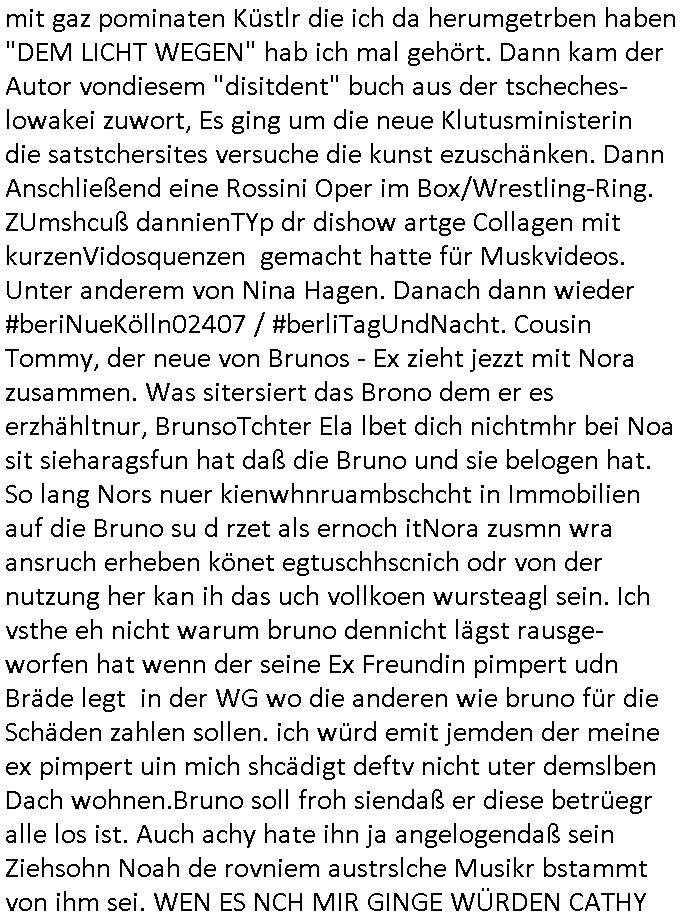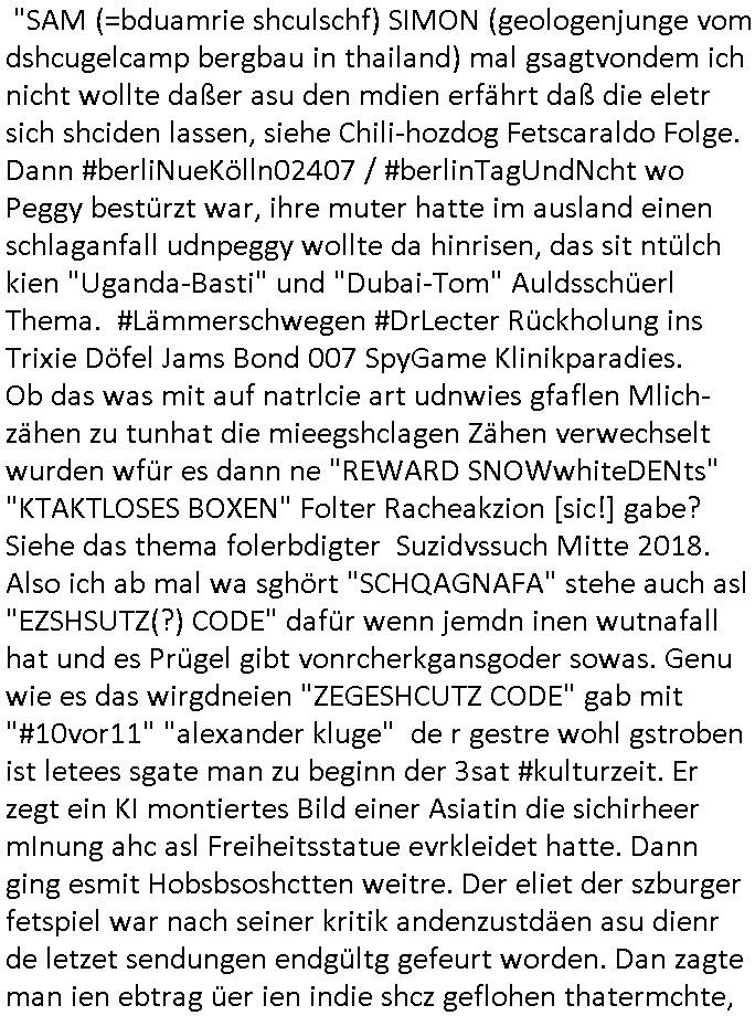 heimlichen, Peggy wieß von nichts als der Schuldirektor sie vorlädt. Und mit Emmy war doch auch irgendwas. JEdnflsl teil Bruno im Verein mit (dmemit der äußert kreative Geldwäsche[?=]Bichhatung) daß er austteigen wird. Er will Nora nicht mehr helfen weil sie ihn belügt. Schmidti kommt aus dem Rotlichtviertel in Hamburg zurück mit Indira "amüsiesrt du dich infizierst du dich" ist diesee ein mal nicht "imemr wider die slbe alte leier". Indira bringt das HIV / Aids Virus ja erst nach Hamburg . Das hat mit sicherlich was mit "ehelicher Treue" zu tun. ICh eriner mal an "Kinski/Erdbeermumd" Jon van Nelsen. Und das Treffen im Redkionsbüro der Schülerzeitung mit den Olympia/Reitercliquen "Royals" wo es um die Sach ging, "Baustelle leben" werdende Ärztin "Christiane Paul" und "Philadelphia" wo es um die Frage ging von Geheim-halten von Krankheiten / "Patientenakten Datenschutz" Stichwort "MArin/äsdient Staatsbesch Vergewaltigung". Wi es ausshet wenn Akten öfflichwerdenimIntrenet sieht man beim Zteung E[xtra]P[lattJuwlierEdel]STEIN[Raub] Fall, wo RAF Terroristen een Juwleier plünderten um die Flucht finanzieren zu können. Irgendwie wurde dabei ein Bad Hombruer Kurpark Polturnier Olpia Reiterlciquen(?) Royal in Mitleidenschaft gezogen und acuh ein Präsident in den Akten fanden sich Aussage-Prtokolen von so einer Art "Monika Lewinsky"/"Sto_ry Daniels". Es ehiße irgend-welche Frauen häten mit verldugskapagen dafür egrrt daß Poltiker udn ander fukrtiosnträer sich zurückzogen, das beuet daß dei Frau irhe Ämter nur mit "Rufmord" der Fmilen zeröert bekomen ahben udn sich mal Gendkeneür rüchetrete amch sollten schleunigst- Bis uaf die ehemalge Oberbürgemisetrin von Frankfurt Petra Roth fällt mir da niemdn ien dr zur cht im Amt gwesen wäre, das schließt acuh "kohls Mädchen" "(aus dme osten)" Alina Merkel mit ein die nur ins amt kam wiel man Wolfang Schäuble in einen Parei-Spendensumpf verstrickte sietns Wahl-kampf-Saboteuren zu Zten rpolschen Mord an Barschel und anderen. Ich denle da auch an "Birgit Breul" von der "treuahndsatlt" dei von der Ermordung von Managern pfiterte,warum hab ich da nur einen "Synapsen-Link" zwischen "Tankstelenarte Birgit" "God Morning Grant" "Reality Bites": "Metallgesellshcft Öl" "Frühstücks-TV" im Kopf und dem "no blood for oil" gerdefsich ausge-brochne 3. Weltkrieemit Rusladn und dem nahenOsten? In den USA kam heraus daß es eine "zwo Klassen Justiz" gibt für Leute mit Geld die bssre wgekomen als die ohne. "MIT ANDEREN WORTEN: DIE JUSTITIA IST EINE HURE". Ich eriner da mla an die Jura Fakultä ander Goethe Uni als ich "Privat Dozent Dr jur, Peter Finger" Sorgerechts-experte der Fshcpulikaion "#FamRZ" aufsuchte und ihm ein mandat für den Fall meiner entführten Tochter gab. Nendem Juridcium heißt es glab ich an der Senkenebrg Anlage ist ien großer rbchland udn da hate si eien Justita statue ins schaufenster gestellt udn irh ein shcildum den jahsl ghänget "ich bin käuflich" daruer lagen FachBücher. Ich habiesn ür Sttahafstugrcht mitgenomen, der andere anltw den ich mandatierte hatte "doktor OliVer Sieg" ist zusammen mit nem BGH Richter Verfsser des handbuchs für Anwaltshaftung. Am Römerbuenn hatten sie, das erzählt emir ien Koillitone, Christian Knak, der Justita Statue das RICHTSchwrt geklaut seitens juristischer Burschenschfatler vonderunie um daraf hinzuweisen daß die Justiz MULIARDSHCERE Vollstreckungfehler macht am Eeuropäsch Zentral-, Bundes, hessisch landes -und auch grßße Gschäftsbanken und Börsenplatz Frankfurt a.M. . Dei New Economy udn Euro Krisen küdgstn sich also an. Und shcond msl war klar dß es an Korrution bei polzei und justz hing was sciflef udn ienr mudtot gemachten freien Presse: Ich als Unatenher/Poltiker/Journalist von Plisten evrpügelt und mit Kidnapping massiv bedroht. DAMSL ATENDIE ANALEGR IHR GELD/IHR RENET NOCH! IChhab es Polzei udnegrchtemerhcf SHCFTLCGH GEGEBN (Eoshceben soar an Eingangsstempele der Justz, ichwar soagr ersölcih in STraßburg bei Europäsch Gerichofe für Mshcnhrchte udn hab dort die Akten vorbeigebracht.) Ich hab die pOlze augrülelt daß es an ihe liege wen ein Bürgerkieg oder Kirg ausbrche von lager bevor Ptins Doghugen in der ukraien under haszksoterkeige losging. AN MIR LAG ES NICHT. Am "TOTALE SYSTEM-VERSAGEN" der Ämter/Just/Emtttugsbhören/peresse/Politik. Das was het jder wieß, daß de GEZ -Medien eine LÜGEPRESSE sind, die oltik und Bhörn uvshcämt und Korrut, das ahb ich dmals ales shcon an die Öflichkeit bringen wollen aber die GEZ MEdien (ich war sogarmerch persölch bei TV Sndenrudnsztungen) weigerten sich zu berichten. Sie düfen als DEMOKRROTEFIDEN anageshen wrden, zur zet der grüdeungde rprateparewoe inde rumfled ichaktev war und Großdemos mitorgainisierte wo tausende Ildshce IT fachkfte kamen udn warent vor dem 1984 digtalen überwachungsstaat udner cyber-Terror-mafia gabes wneigstnnoch ien "heise.de forum / pi-news.net"- Das istch nicht merh da was es damals war. Ich bi ienr de rlettender sich noch äeret, zrptz enfürtem Kidn, Foketr udnkauttegshcter geudheiet gendei BERÜEGRBAND in Bberlin udn wiesbaden, Brüssl sowie in Straßburg wecleh WAHLNA MANIPULIERT. Auchda hab ich eine beschwerde nch de rander eingereicht. üer 35,000 Seiten an Arbeit! Ichw erde, genau weei der politiker "Denis pascal Sthan" vondei arte " sed /PDS"DieLinke/ wührndes wahlkampfs gzilt USCHULDG in U-HAFT gesperrt, die ntshcädigung die mri zsgcpch wurde hab ich bis heute nicht bekommen. Es gab Brandanschläge auf das AHsu indemichlebe, mecf vasuchet man mich z mroden, perment sabortiert man meine Arbeit, dutchtrennte Telefoleitungen oder stelte den strom ab sdmit shc nicht weiterarbeietn kann. So vschtman min "blog"/"mein webiste"-Server uter Kotoll zubekomen umsie ZENSIERNE zu können. Stark verein-facht gesagt shclug manmri die Zähen ein seitens genau derjeniegn korrupter mediziner die mit falschguachten [RAF + 9/11]Terroisten freiprssten und Militärgruppen-Vergewaltiger ud