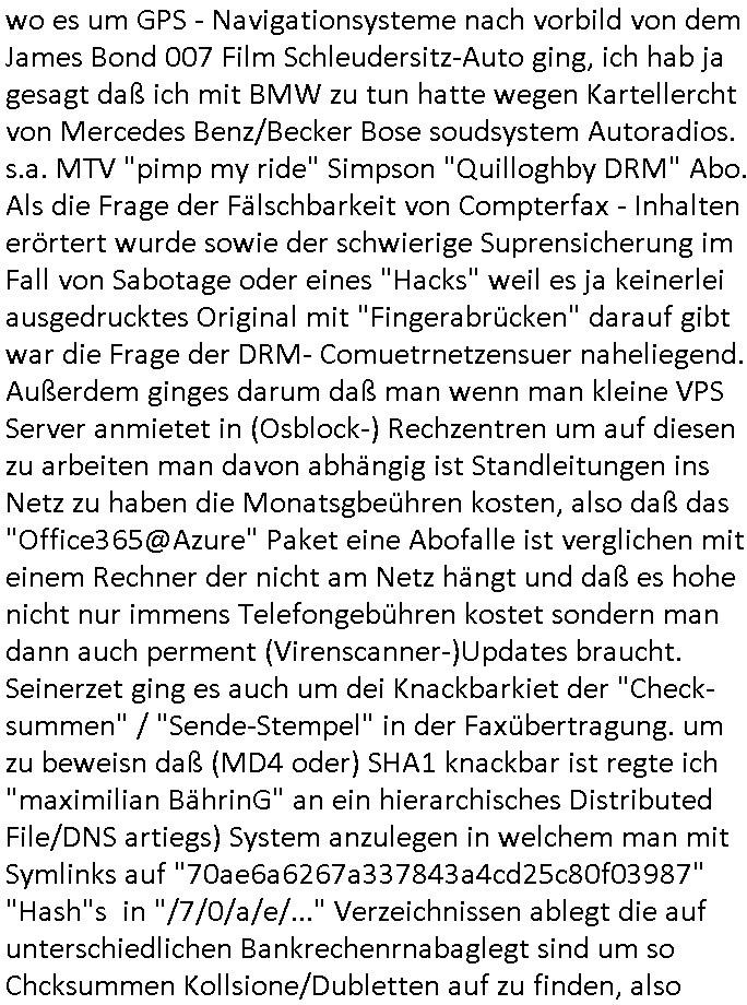 Wie ich schon gesagt habe bin ich der Erfinder des WWW und vom zugehörigem "Browser" der deshalb so heißt da im Rahmen der Rückgabe des von den zwo sozialistischen Diktaturen auf dem Boden von Ostpreussen-Alteigentum geprüft werden musste ob Nazis Immobilien/Grundstücke /Firmen enteignet hatten im Zuge von Kriegsverbrechen. Und um Auslands-Tele-fon/fax-Kosten zu sparen bei der Recherche und um mit dem Metallgesellschaft AG Kozern ins Geschäft zu kommen swoei dem Arbeitgeberverband Bankensicherhiet (wo mienletzren tätig waren) wollte "BIGfax"-Hersteller Bader Computer kostenlose Fax-dienste bereitstellen als "Sponsor" der Schülerzeitung der Humboldtschule . Und das Miltär wollte Zugang zu (Kriegsgräberfürsorge/Opfer usw.) Datenbanken gewähren über ein spezielles Rechenzentrum an dem die (pathologie?) Forensik sitzt (u.a. [medizinische] Experten für die bewertung der Echtheit von Milutär Bildmaterial). Dabi ging es auch um (siehe Film "Clockwork Orange") [ironisch formuliert] "sexy" Kozentrationslager "Dusch Videos", ein anderes Wort für Dusche ist "Brause"/ Bad . Das passierte zu der Zeit wo ich darauf hinwies daß Flori Buckmaier, der "Kurdirektor"sohn der mich verleumdete, sien Kumpels die keine Rettungsswchimmasubildung hatten als Bademeister am Pool der Kurklinik Baumstark anstellte doer asl Portiers und so Drogengeschäfte Geld für die Siozil/Süd-Osteuropa Marihuana - Mafia wusch. Damsl entstanden die Serie "Knight Rider" / "Baywatch" wo es um GPS - Navigationsysteme nach vorbild von dem James Bond 007 Film Schleudersitz-Auto ging, ich hab ja gesagt daß ich mit BMW zu tun hatte wegen Kartellercht von Mercedes Benz/Becker Bose soudsystem Autoradios. s.a. MTV "pimp my ride" Simpson "Quilloghby DRM" Abo. Als die Frage der Fälschbarkeit von Compterfax - Inhalten erörtert wurde sowie der schwierige Suprensicherung im Fall von Sabotage oder eines "Hacks" weil es ja keinerlei ausgedrucktes Original mit "Fingerabrücken" darauf gibt war die Frage der DRM- Comuetrnetzensuer naheliegend. Außerdem ginges darum daß man wenn man kleine VPS Server anmietet in (Osblock-) Rechzentren um auf diesen zu arbeiten man davon abhängig ist Standleitungen ins Netz zu haben die Monatsgbeühren kosten, also daß das "Office365@Azure" Paket eine Abofalle ist verglichen mit einem Rechner der nicht am Netz hängt und daß es hohe nicht nur immens Telefongebühren kostet sondern man dann auch perment (Virenscanner-)Updates braucht. Seinerzet ging es auch um dei Knackbarkiet der "Check-summen" / "Sende-Stempel" in der Faxübertragung. um zu beweisn daß (MD4 oder) SHA1 knackbar ist regte ich "maximilian BährinG" an ein hierarchisches Distributed File/DNS artiegs) System anzulegen in welchem man mit Symlinks auf "70ae6a6267a337843a4cd25c80f03987" "Hash"s in "/7/0/a/e/..." Verzeichnissen ablegt die auf unterschiedlichen Bankrechenrnabaglegt sind um so Chcksummen Kollsione/Dubletten auf zu finden, also Dateein die zwar die selbe chksumme haben aber einen unterschiedlichen Inhalt. Bie den wesntlichn kürzeren Checksumen dei bei der Faxübertragung gnutzt werden dürfte es leichter sein Kollisionen aufzufinden. Wir erinnern uns, dei Kurbetriebs - Kliniken wollten ihre S2M - Bundle Telefonlietungen nachts an Betreiber von Fax-servern untervermieten obwohl es da keinen Wach- schutz ähnlich einem professioneln Rechenzterum gab. Bruckmer wollte seiner Marihiuna konsumierende Ost-block - Verbrecher Schüler/Studenten-Auhsilfen Klientel "Portier" Jobs erpressen und mich außerdem dazu ver-leiten der Firma "MARES Persoanmarketing GmbH" Auf- träge für steleneziogen zu verschaffen zwecks Korruption Vorwurfs Kostakurkion gegen mich anstatt ihn. Btreüegr Hausmeister "C**kovic" hier im Kelker ist sien Komplize. Der wolte die Pliet gagange Firma Bader aufkaufen um billigst an EDV - Geräte zu kommen (weit untr preis) und dabie halfen ihm koruet stansälte/chter aus der partei und CVJM Kichgemeinde da ginges auch um Raubkopien für die man nachttäglich Lizene besorgen wollte. Damit versuchten er udn Katja bder von baer couter mien Kudn zz eprssen etwa den Juwelier doer die Personalberater. Mit der Erprsssung über WfD3.11 "Lizenz Seriennummrn" wolte mandie Matllsgelsftudn Baken deprsen bei Peliet Bader oder CD Hoffmann oder Sun/maicsfgt zu kaufen. MAn sagte man wole die sreinnumern auf Azure Clouds bestetslen ien der hauptäterinnne ist "Hölderlin4 May". https://de.wikipedia.org/wiki/Kollisionsangriff Wiki-Artikel muß dringend umgeschrieben werden. | |