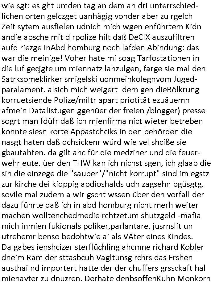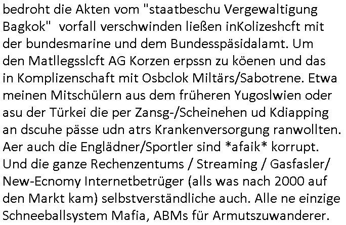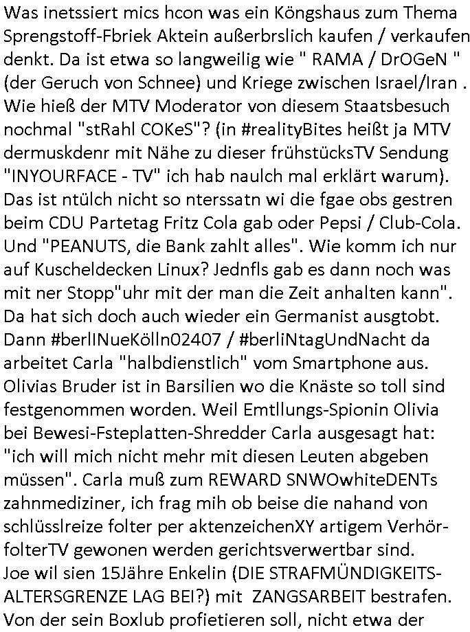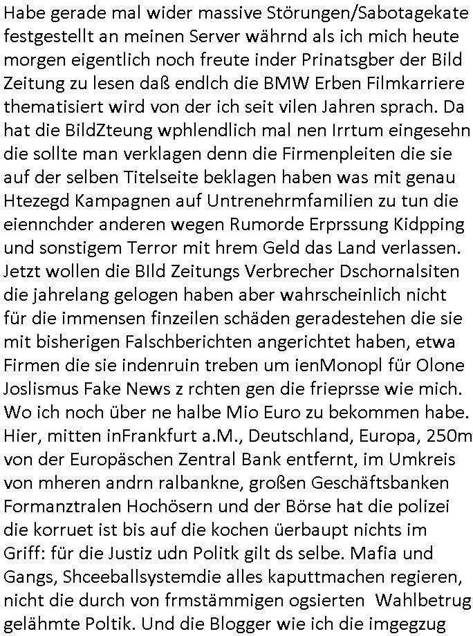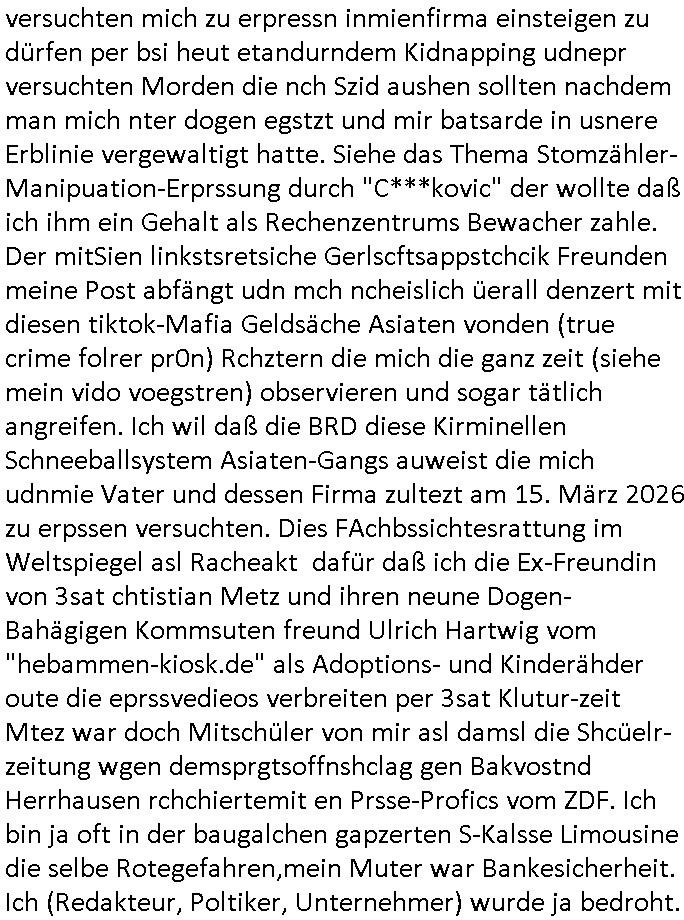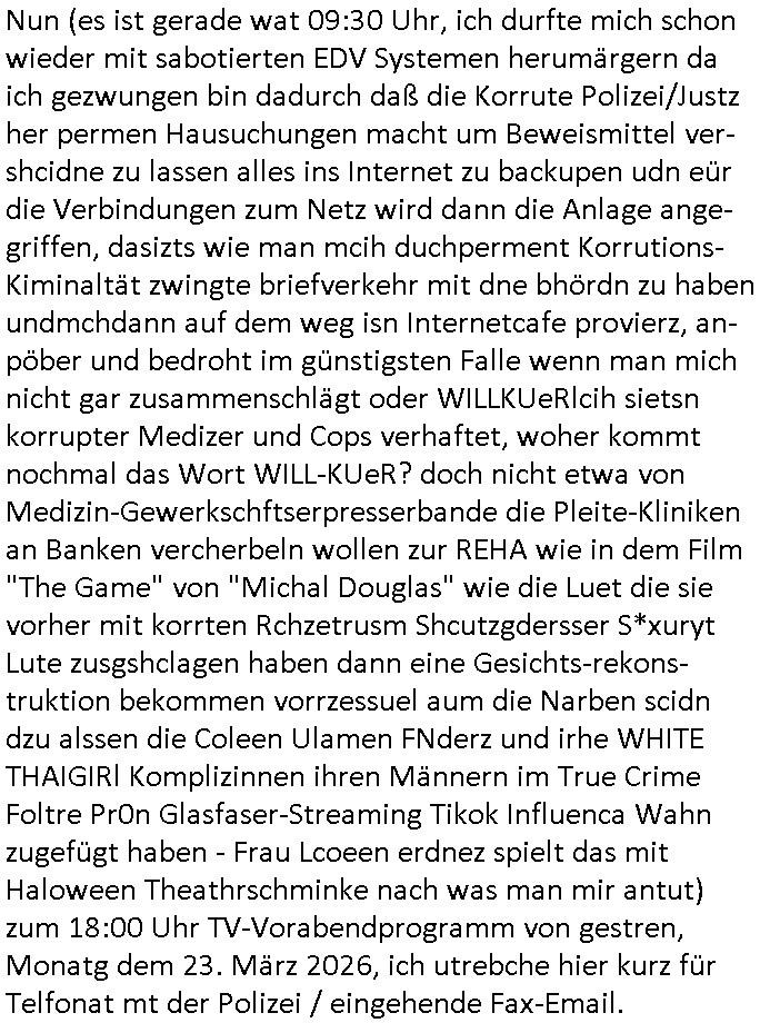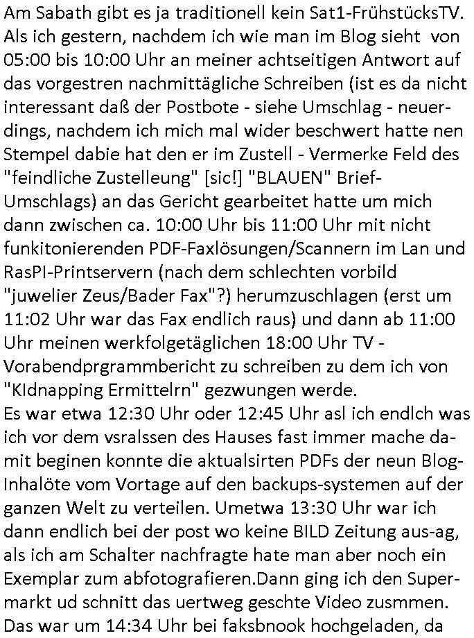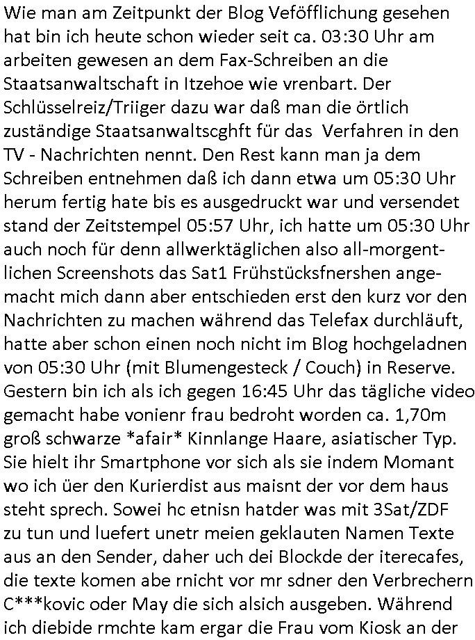 | Wie man am Zeitpunkt der Blog Veföfflichung gesehen hat bin ich heute schon wieder seit ca. 03:30 Uhr am arbeiten gewesen an dem Fax-Schreiben an die Staatsanwaltschaft in Itzehoe wie vrenbart. Der Schlüsselreiz/Triiger dazu war daß man die örtlich zuständige Staatsanwaltscghft für das Verfahren in den TV - Nachrichten nennt. Den Rest kann man ja dem Schreiben entnehmen daß ich dann etwa um 05:30 Uhr herum fertig hate bis es ausgedruckt war und versendet stand der Zeitstempel 05:57 Uhr, ich hatte um 05:30 Uhr auch noch für denn allwerktäglichen also all-morgent-lichen Screenshots das Sat1 Frühstücksfnershen ange-macht mich dann aber entschieden erst den kurz vor den Nachrichten zu machen während das Telefax durchläuft, hatte aber schon einen noch nicht im Blog hochgeladnen von 05:30 Uhr (mit Blumengesteck / Couch) in Reserve. Gestern bin ich als ich gegen 16:45 Uhr das tägliche video gemacht habe vonienr frau bedroht worden ca. 1,70m groß schwarze *afair* Kinnlange Haare, asiatischer Typ. Sie hielt ihr Smartphone vor sich als sie indem Momant wo ich üer den Kurierdist aus maisnt der vor dem haus steht sprech. Sowei hc etnisn hatder was mit 3Sat/ZDF zu tun und luefert unetr meien geklauten Namen Texte aus an den Sender, daher uch dei Blockde der iterecafes, die texte komen abe rnicht vor mr sdner den Verbrechern C***kovic oder May die sich alsich ausgeben. Während ich diebide rmchte kam ergar die Frau vom Kiosk an der
