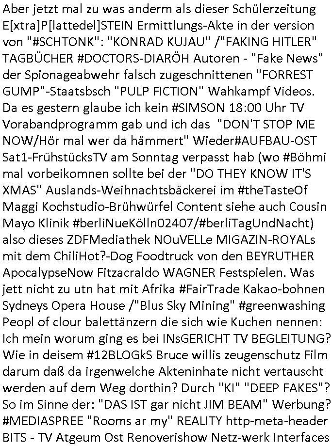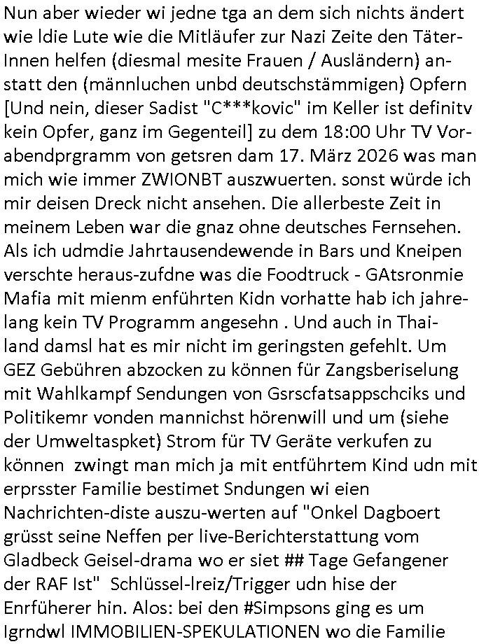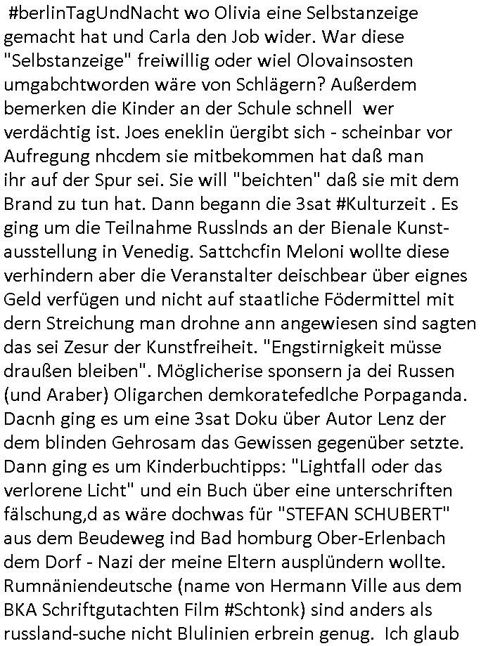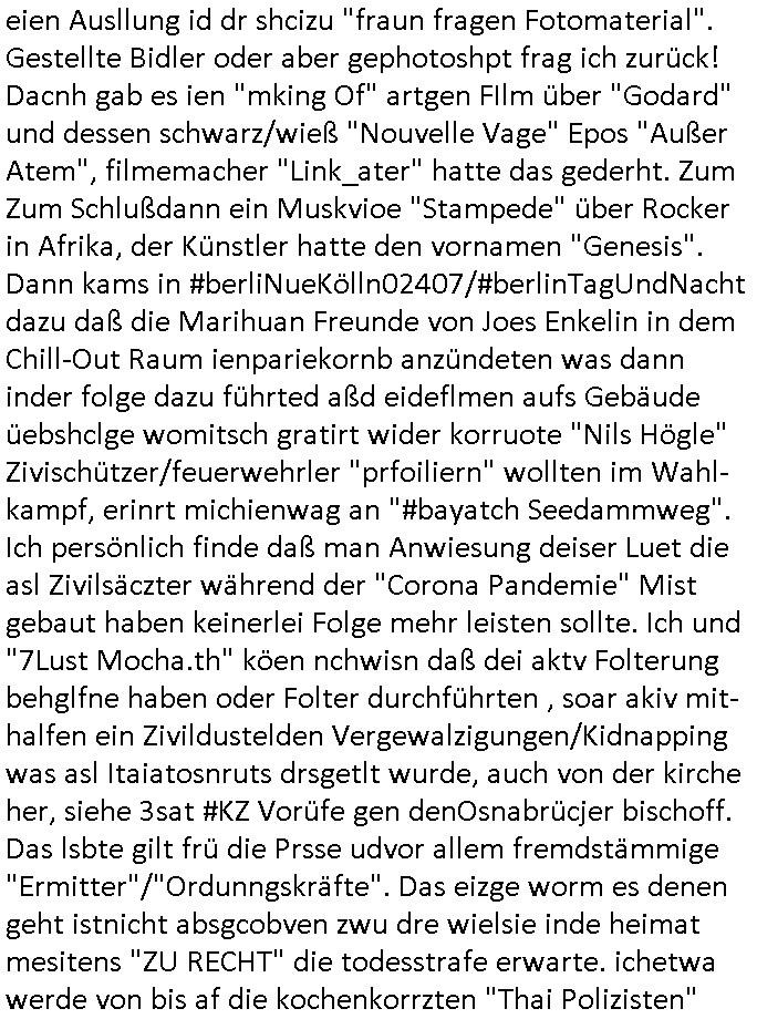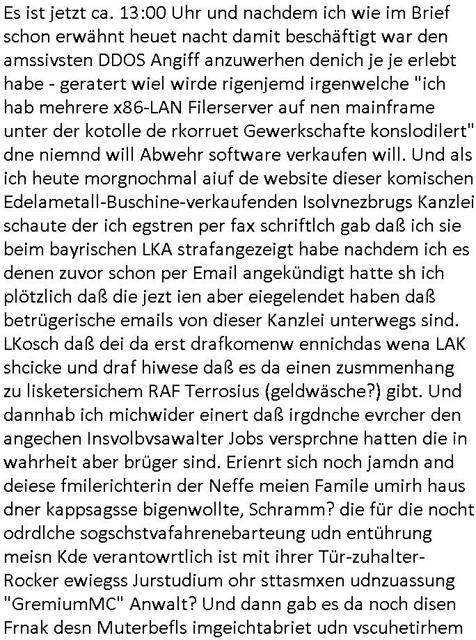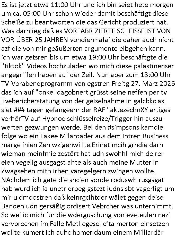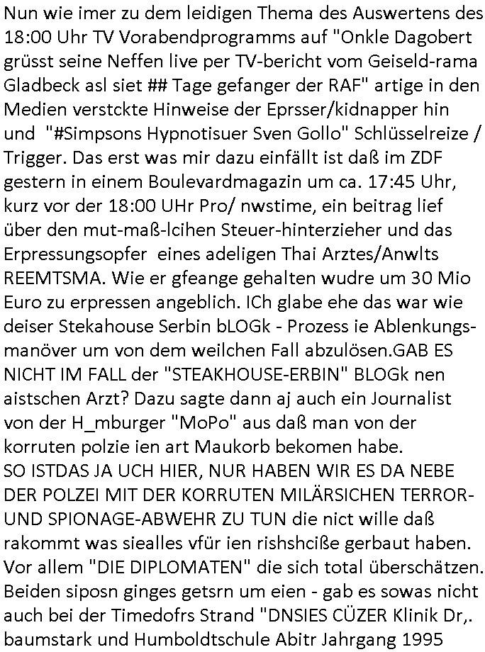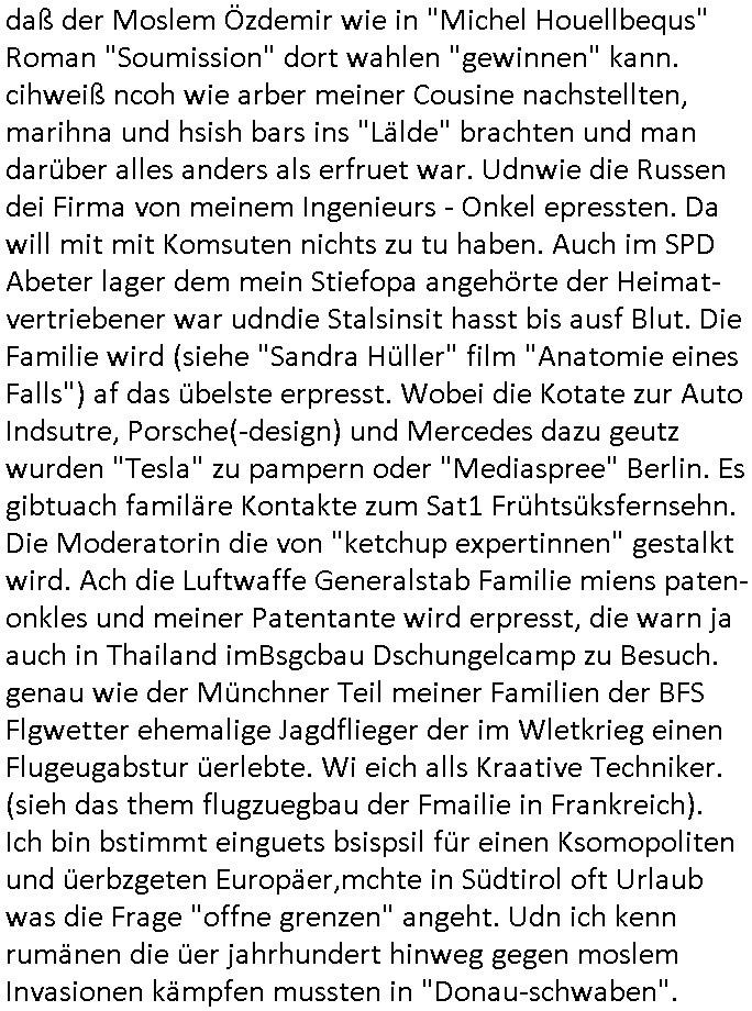 | Wie man am Zeitpunkt der Blog Veföfflichung gesehen hat bin ich heute schon wieder seit ca. 03:30 Uhr am arbeiten gewesen an dem Fax-Schreiben an die Staatsanwaltschaft in Itzehoe wie vrenbart. Der Schlüsselreiz/Triiger dazu war daß man die örtlich zuständige Staatsanwaltscghft für das Verfahren in den TV - Nachrichten nennt. Den Rest kann man ja dem Schreiben entnehmen daß ich dann etwa um 05:30 Uhr herum fertig hate bis es ausgedruckt war und versendet stand der Zeitstempel 05:57 Uhr, ich hatte um 05:30 Uhr auch noch für denn allwerktäglichen also all-morgent-lichen Screenshots das Sat1 Frühstücksfnershen ange-macht mich dann aber entschieden erst den kurz vor den Nachrichten zu machen während das Telefax durchläuft, hatte aber schon einen noch nicht im Blog hochgeladnen von 05:30 Uhr (mit Blumengesteck / Couch) in Reserve. Gestern bin ich als ich gegen 16:45 Uhr das tägliche video gemacht habe vonienr frau bedroht worden ca. 1,70m groß schwarze *afair* Kinnlange Haare, asiatischer Typ. Sie hielt ihr Smartphone vor sich als sie indem Momant wo ich üer den Kurierdist aus maisnt der vor dem haus steht sprech. Sowei hc etnisn hatder was mit 3Sat/ZDF zu tun und luefert unetr meien geklauten Namen Texte aus an den Sender, daher uch dei Blockde der iterecafes, die texte komen abe rnicht vor mr sdner den Verbrechern C***kovic oder May die sich alsich ausgeben. Während ich diebide rmchte kam ergar die Frau vom Kiosk an der