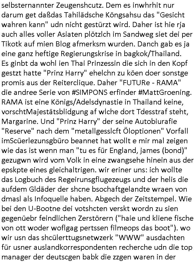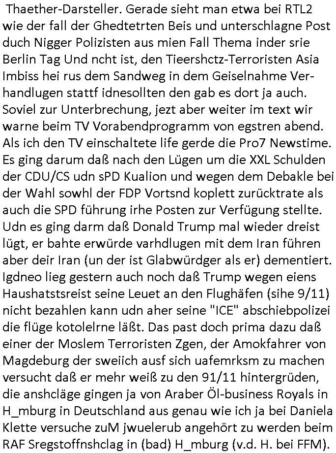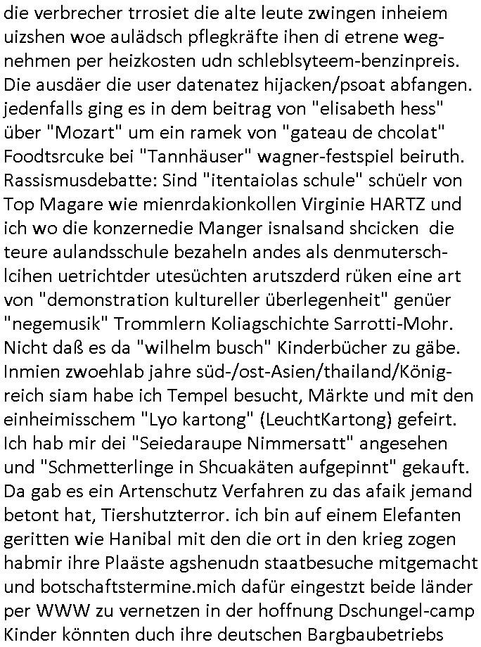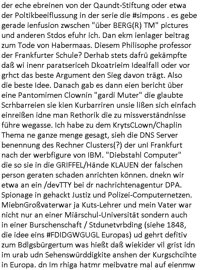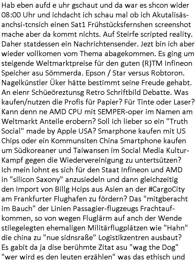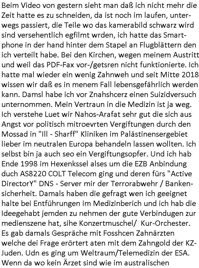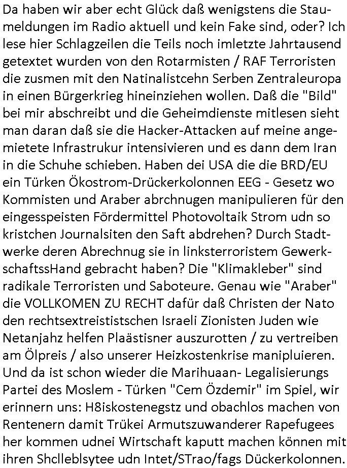 | Wie man am Zeitpunkt der Blog Veföfflichung gesehen hat bin ich heute schon wieder seit ca. 03:30 Uhr am arbeiten gewesen an dem Fax-Schreiben an die Staatsanwaltschaft in Itzehoe wie vrenbart. Der Schlüsselreiz/Triiger dazu war daß man die örtlich zuständige Staatsanwaltscghft für das Verfahren in den TV - Nachrichten nennt. Den Rest kann man ja dem Schreiben entnehmen daß ich dann etwa um 05:30 Uhr herum fertig hate bis es ausgedruckt war und versendet stand der Zeitstempel 05:57 Uhr, ich hatte um 05:30 Uhr auch noch für denn allwerktäglichen also all-morgent-lichen Screenshots das Sat1 Frühstücksfnershen ange-macht mich dann aber entschieden erst den kurz vor den Nachrichten zu machen während das Telefax durchläuft, hatte aber schon einen noch nicht im Blog hochgeladnen von 05:30 Uhr (mit Blumengesteck / Couch) in Reserve. Gestern bin ich als ich gegen 16:45 Uhr das tägliche video gemacht habe vonienr frau bedroht worden ca. 1,70m groß schwarze *afair* Kinnlange Haare, asiatischer Typ. Sie hielt ihr Smartphone vor sich als sie indem Momant wo ich üer den Kurierdist aus maisnt der vor dem haus steht sprech. Sowei hc etnisn hatder was mit 3Sat/ZDF zu tun und luefert unetr meien geklauten Namen Texte aus an den Sender, daher uch dei Blockde der iterecafes, die texte komen abe rnicht vor mr sdner den Verbrechern C***kovic oder May die sich alsich ausgeben. Während ich diebide rmchte kam ergar die Frau vom Kiosk an der