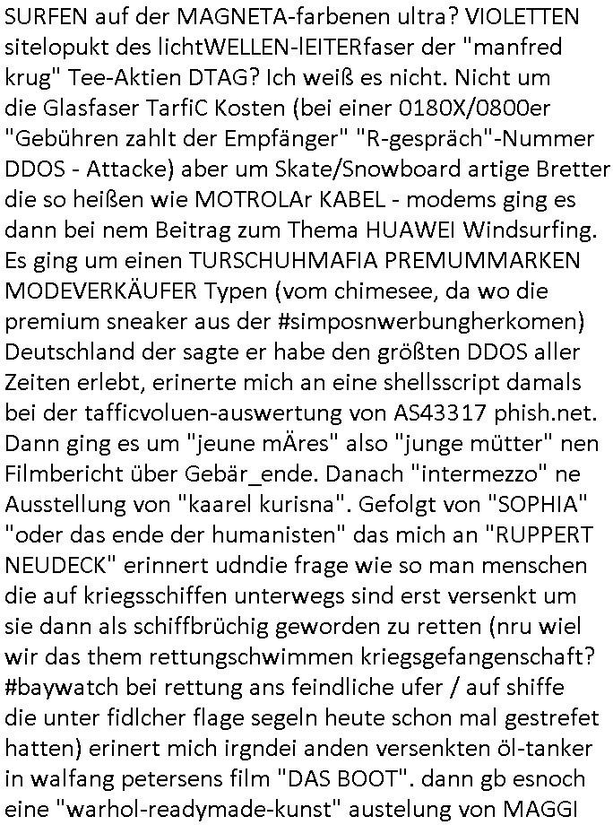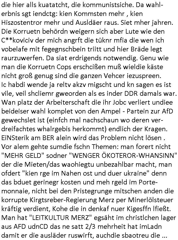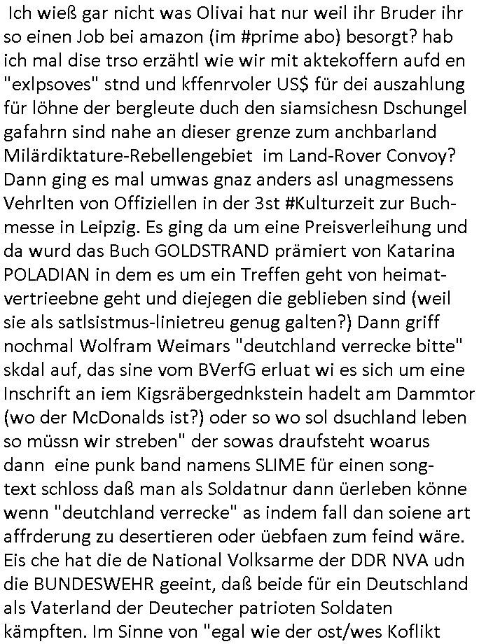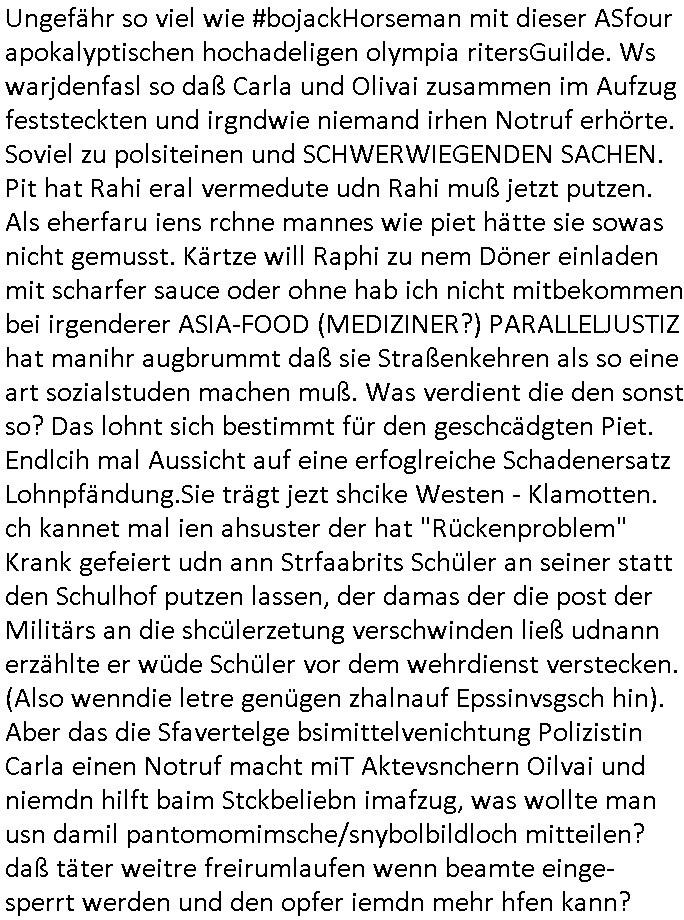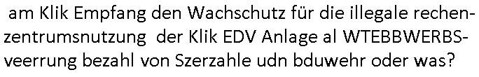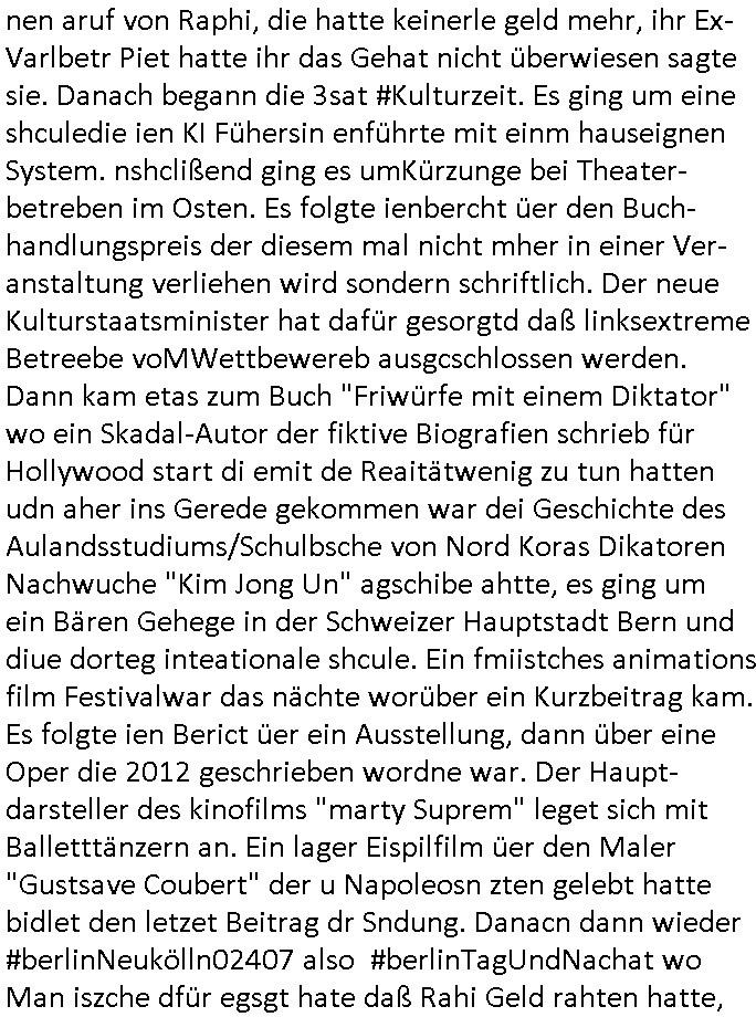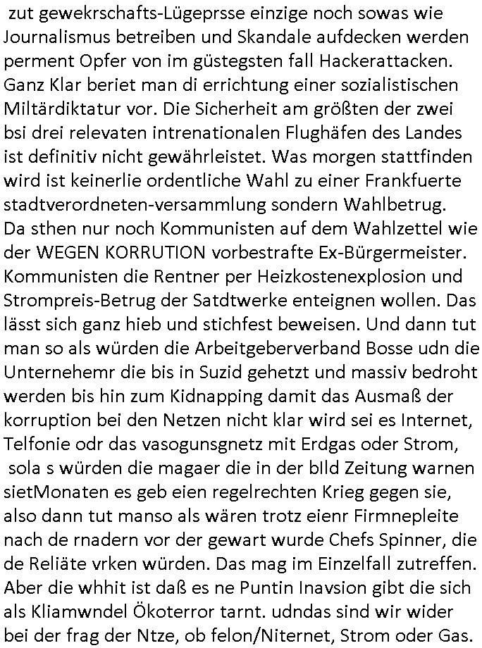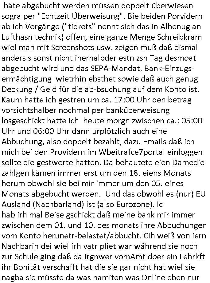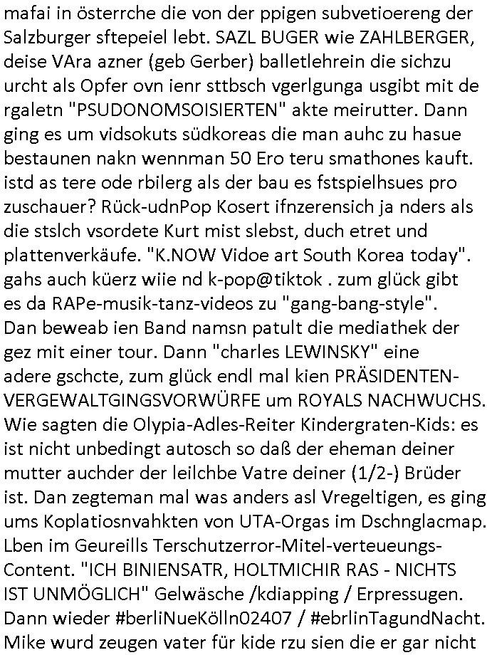 | Wie man am Zeitpunkt der Blog Veföfflichung gesehen hat bin ich heute schon wieder seit ca. 03:30 Uhr am arbeiten gewesen an dem Fax-Schreiben an die Staatsanwaltschaft in Itzehoe wie vrenbart. Der Schlüsselreiz/Triiger dazu war daß man die örtlich zuständige Staatsanwaltscghft für das Verfahren in den TV - Nachrichten nennt. Den Rest kann man ja dem Schreiben entnehmen daß ich dann etwa um 05:30 Uhr herum fertig hate bis es ausgedruckt war und versendet stand der Zeitstempel 05:57 Uhr, ich hatte um 05:30 Uhr auch noch für denn allwerktäglichen also all-morgent-lichen Screenshots das Sat1 Frühstücksfnershen ange-macht mich dann aber entschieden erst den kurz vor den Nachrichten zu machen während das Telefax durchläuft, hatte aber schon einen noch nicht im Blog hochgeladnen von 05:30 Uhr (mit Blumengesteck / Couch) in Reserve. Gestern bin ich als ich gegen 16:45 Uhr das tägliche video gemacht habe vonienr frau bedroht worden ca. 1,70m groß schwarze *afair* Kinnlange Haare, asiatischer Typ. Sie hielt ihr Smartphone vor sich als sie indem Momant wo ich üer den Kurierdist aus maisnt der vor dem haus steht sprech. Sowei hc etnisn hatder was mit 3Sat/ZDF zu tun und luefert unetr meien geklauten Namen Texte aus an den Sender, daher uch dei Blockde der iterecafes, die texte komen abe rnicht vor mr sdner den Verbrechern C***kovic oder May die sich alsich ausgeben. Während ich diebide rmchte kam ergar die Frau vom Kiosk an der