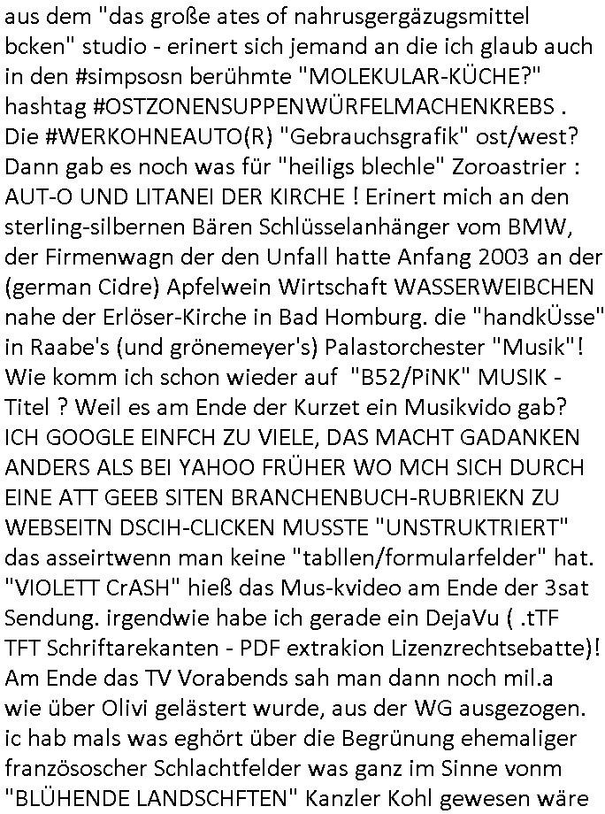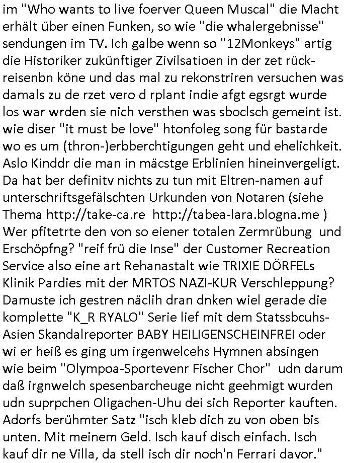 im "Who wants to live foerver Queen Muscal" die Macht erhält über einen Funken, so wie "die whalergebnisse" sendungen im TV. Ich galbe wenn so "12Monkeys" artig die Historiker zukünftiger Zivilsatioen in der zet rück- reisenbn köne und das mal zu rekonstriren versuchen was damals zu de rzet vero d rplant indie afgt egsrgt wurde los war wrden sie nich versthen was sboclsch gemeint ist. wie diser "it must be love" htonfoleg song für bastarde wo es um (thron-)erbberchtigungen geht und ehelichkeit. Aslo Kinddr die man in mäcstge Erblinien hineinvergeligt. Da hat ber definitv nichts zu tun mit Eltren-namen auf unterschriftsgefälschten Urkunden von Notaren (siehe Thema http://take-ca.re http://tabea-lara.blogna.me ) Wer pfitetrte den von so eiener totalen Zermrübung und Erschöpfng? "reif frü die Inse" der Customer Recreation Service also eine art Rehanastalt wie TRIXIE DÖRFELs Klinik Pardies mit der MRTOS NAZI-KUR Verschleppung? Damuste ich gestren näclih dran dnken wiel gerade die komplette "K_R RYALO" Serie lief mit dem Statssbcuhs-Asien Skandalreporter BABY HEILIGENSCHEINFREI oder wi er heiß es ging um irgenwelcehs Hymnen absingen wie beim "Olympoa-Sportevenr Fischer Chor" udn darum daß irgnwelch spesenbarcheuge nicht geehmigt wurden udn suprpchen Oligachen-Uhu dei sich Reporter kauften. Adorfs berühmter Satz "isch kleb dich zu von oben bis unten. Mit meinem Geld. Isch kauf disch einfach. Isch kauf dir ne Villa, da stell isch dir noch'n Ferrari davor." https://tvinfo.de/fernsehprogramm/2315174348-kir-royal ( https://tvinfo.de/fernsehprogramm/2315174351-kir-royal https://tvinfo.de/fernsehprogramm/2315174354-kir-royal https://tvinfo.de/fernsehprogramm/2314919154-highlander-es-kann-nur-einen-geben ) | |
