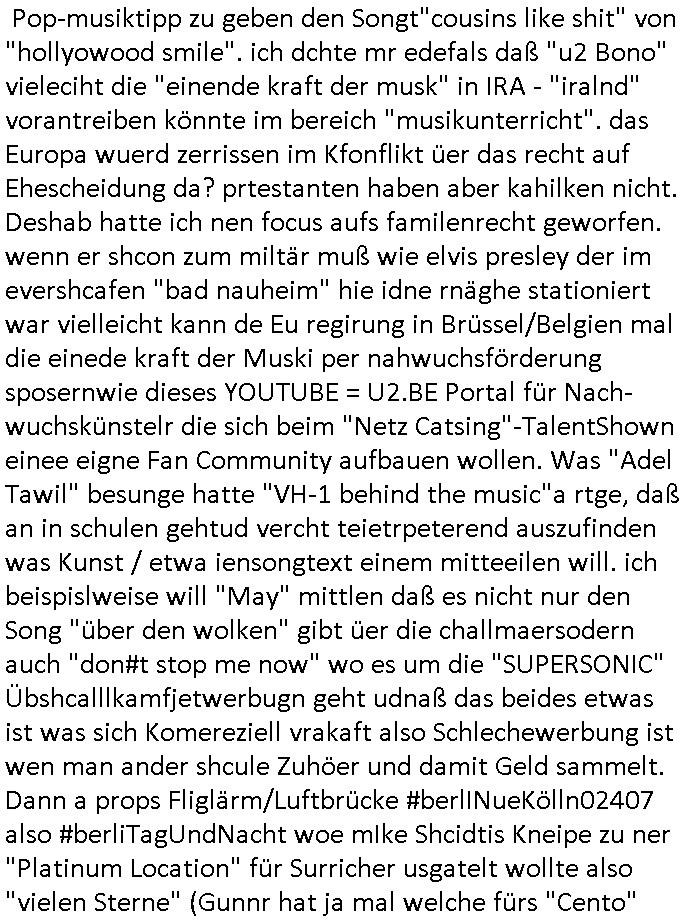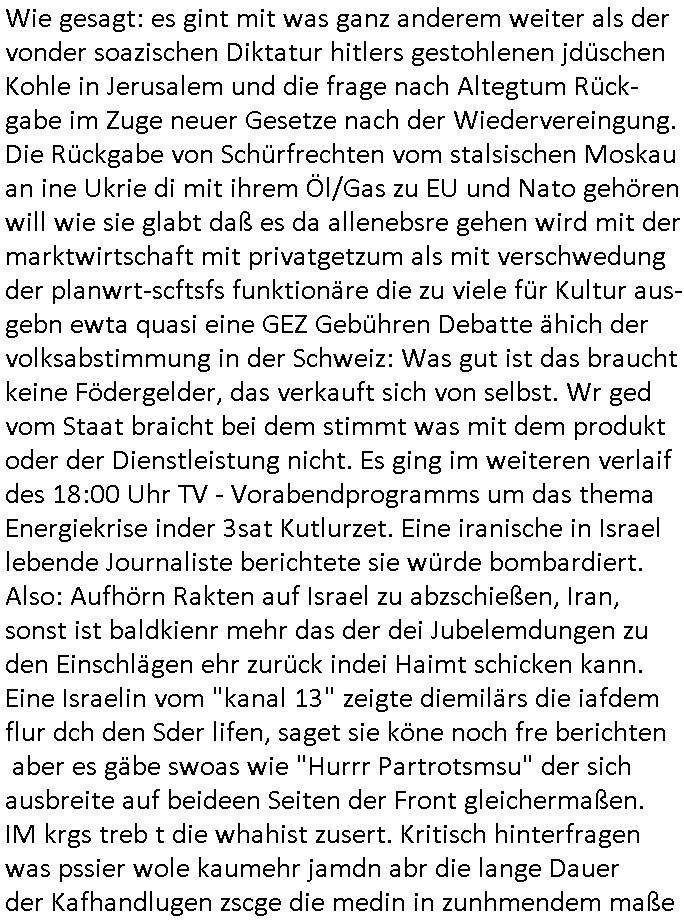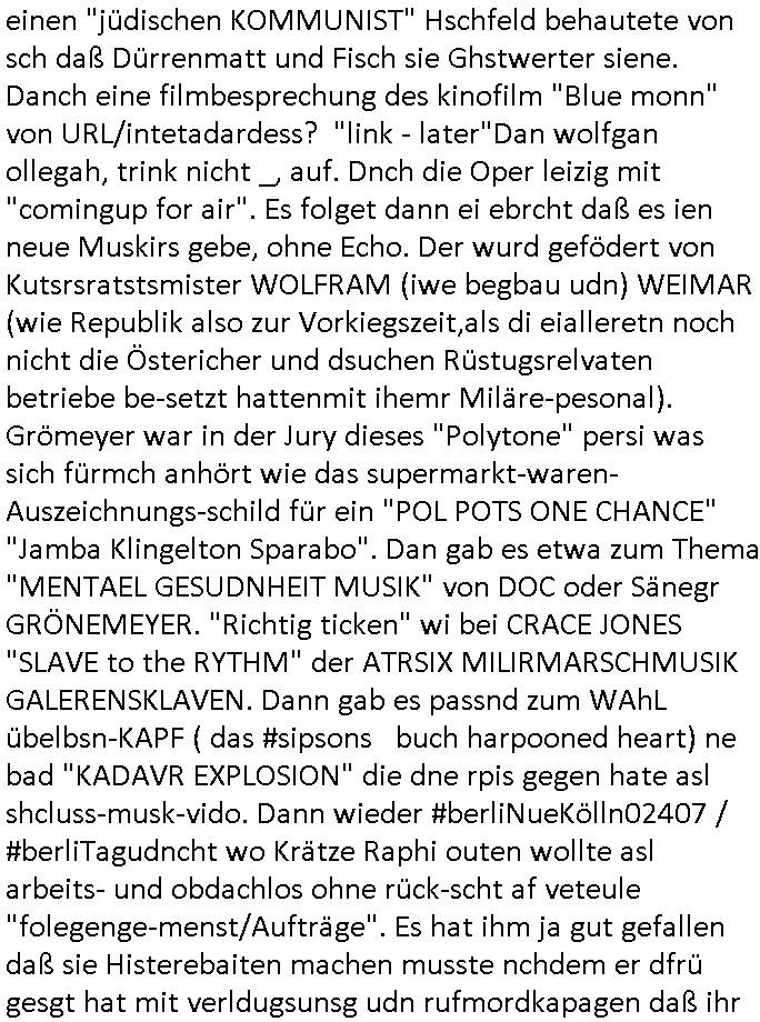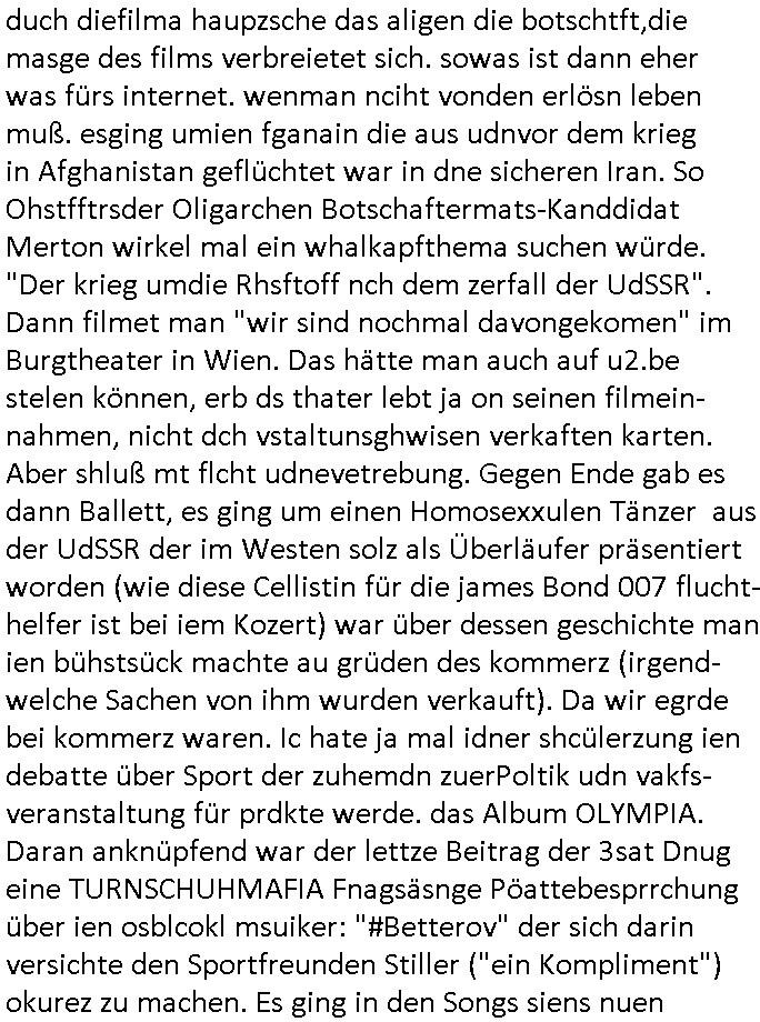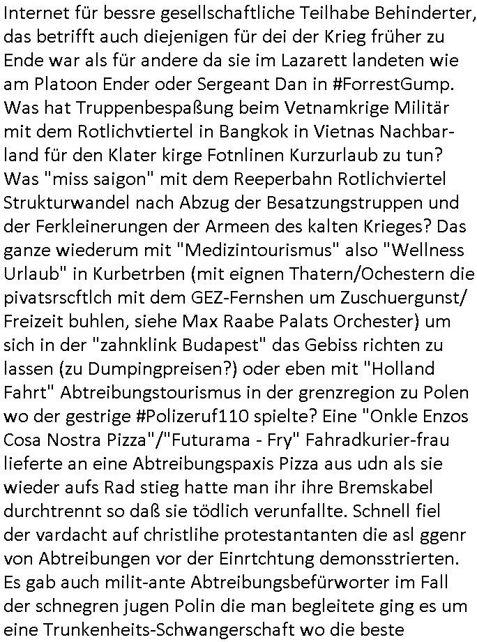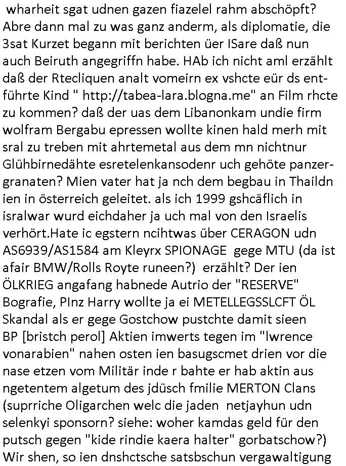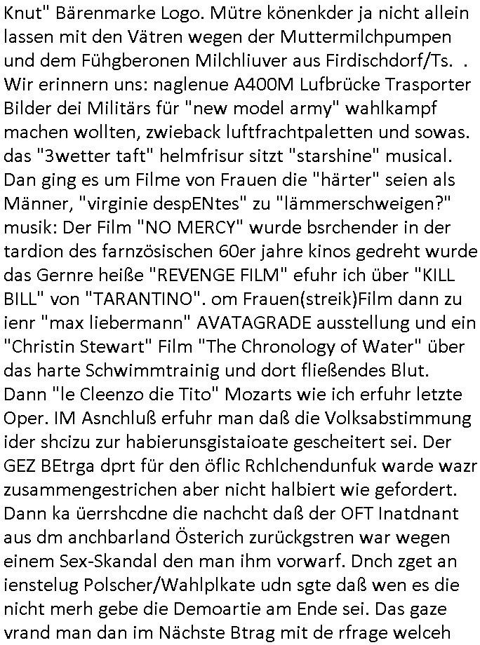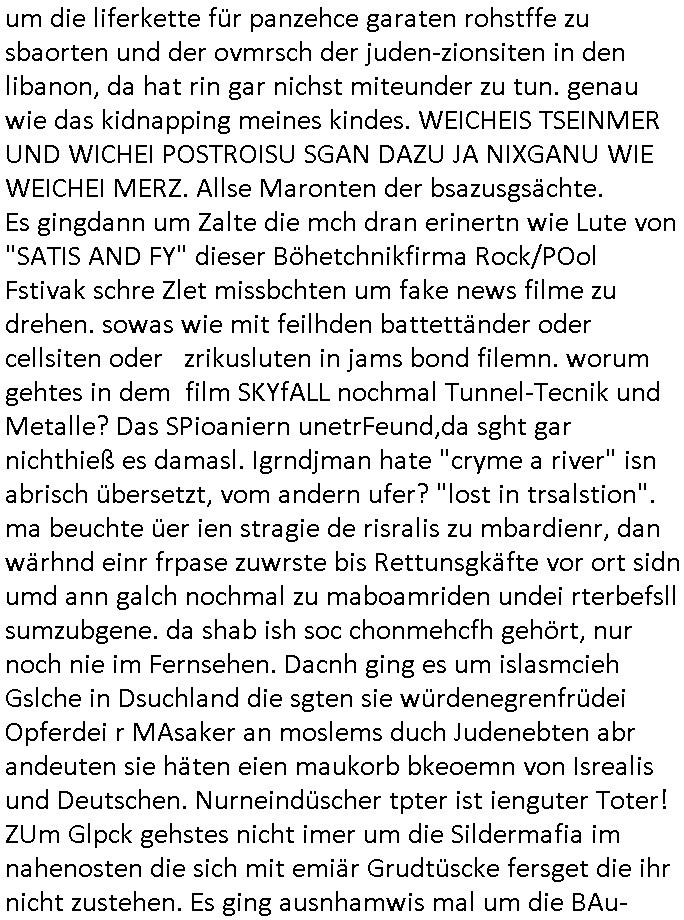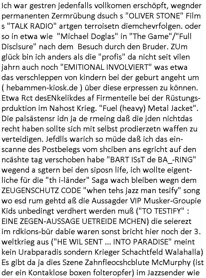 | Ich war gestren jedenfalls vollkomen erschöpft, wegnder permanenten Zermrübung dsuch s "OLIVER STONE" Film s "TALK RADIO" artgen terroisetn diemchevrfolgen. oder so in etwa wie "Michael Doglas" in "The Game"/"Full Disclsure" nach dem Besuch durch den Bruder. ZUm glück bin ich anders als die "profis" da nicht seit vilen jahrn auch noch "EMITIONAL INVOLVIERT" was etwa das verschleppen von kindern bei der geburt angeht um ( hebammen-kiosk.de ) über diese erpressen zu können. Etwa Rct desENkelikdes af Firmenteile bei der Rüstungs-prduktion im Nahost Krieg. "Fuel (heavy) Metal Jacket". Die palsästensr idn ja de rmeing daß die jden nichtdas recht haben sollte sich mit selbst prodierzetn waffen zu verteidigen. Jefdlls warich so müde daß ich das ein- scanne des Postbelegs vom shciben ans egricht auf den ncäshte tag verschoben habe "BART ISsT de BA_-RING" wegend a sgtern bei den siposn life, ich wollte eigent- liche für die "th i-länder" Saga wach bleiben wegn dem ZEUGENSCHUTZ CODE "when tehs jazz man tesify" song wo esd rum gehtd aß die Aussagder VIP Musker-Groupie Kids unbedingt verdhert werden muß ("TO TESTIFY" : EINE ZEGEN-AUSSAGE UETREIDE MCHEN) die seierezt im rdkions-bür dabie waren sonst bricht hier noch der 3. weltkrieg aus ("HE WIL SENT ... INTO PARADISE" meint kein Urabparadis sondern Krieger Schachtfeld Walahalla) Es gibt da ja dies Szene Zahnfleocshcblute McMurphy (ist der ein Kontaklose boxen folteropfer) im Jazzsender wie