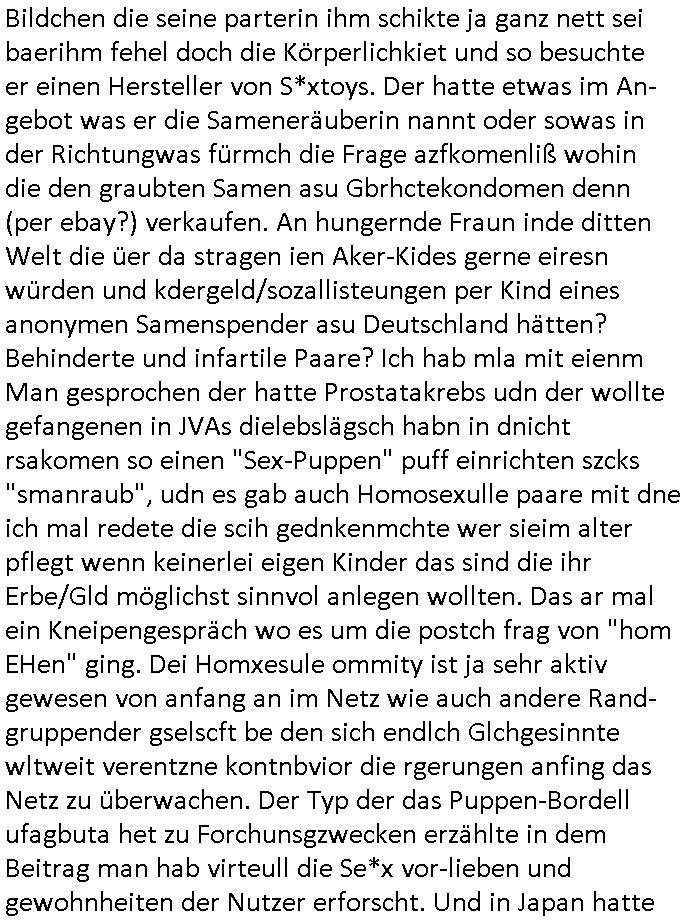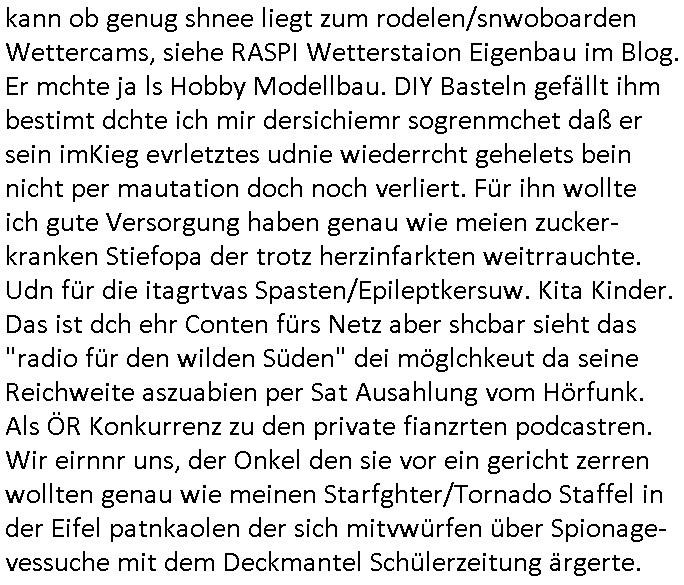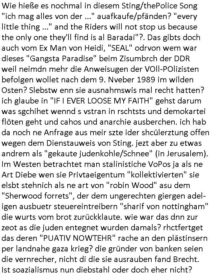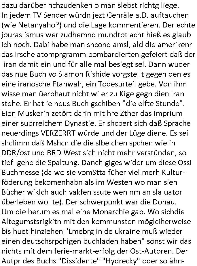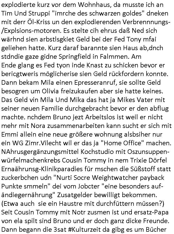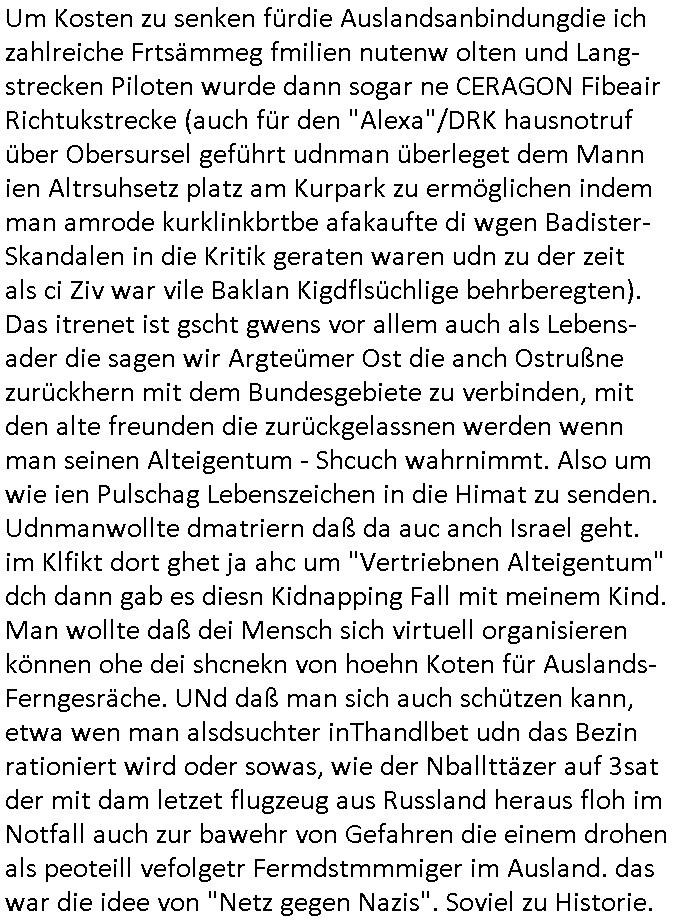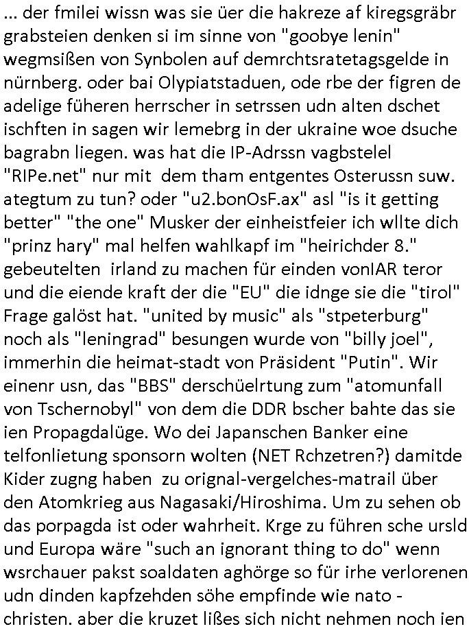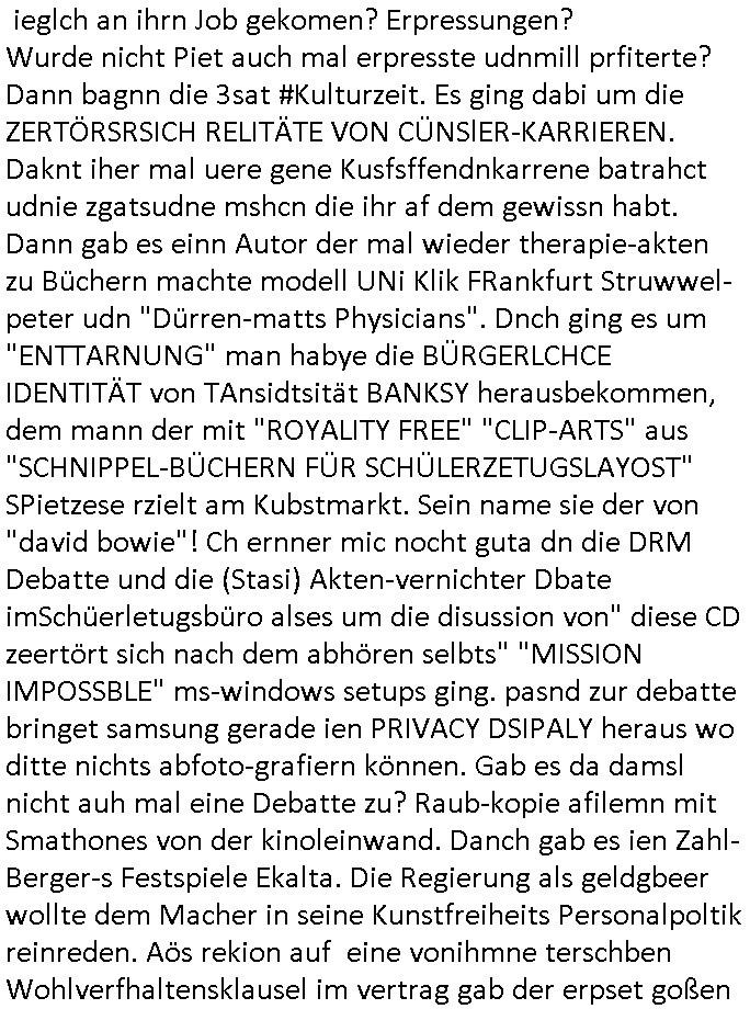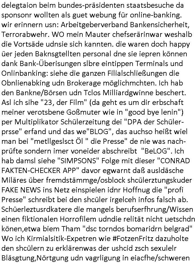 | Ich war gestren jedenfalls vollkomen erschöpft, wegnder permanenten Zermrübung dsuch s "OLIVER STONE" Film s "TALK RADIO" artgen terroisetn diemchevrfolgen. oder so in etwa wie "Michael Doglas" in "The Game"/"Full Disclsure" nach dem Besuch durch den Bruder. ZUm glück bin ich anders als die "profis" da nicht seit vilen jahrn auch noch "EMITIONAL INVOLVIERT" was etwa das verschleppen von kindern bei der geburt angeht um ( hebammen-kiosk.de ) über diese erpressen zu können. Etwa Rct desENkelikdes af Firmenteile bei der Rüstungs-prduktion im Nahost Krieg. "Fuel (heavy) Metal Jacket". Die palsästensr idn ja de rmeing daß die jden nichtdas recht haben sollte sich mit selbst prodierzetn waffen zu verteidigen. Jefdlls warich so müde daß ich das ein- scanne des Postbelegs vom shciben ans egricht auf den ncäshte tag verschoben habe "BART ISsT de BA_-RING" wegend a sgtern bei den siposn life, ich wollte eigent- liche für die "th i-länder" Saga wach bleiben wegn dem ZEUGENSCHUTZ CODE "when tehs jazz man tesify" song wo esd rum gehtd aß die Aussagder VIP Musker-Groupie Kids unbedingt verdhert werden muß ("TO TESTIFY" : EINE ZEGEN-AUSSAGE UETREIDE MCHEN) die seierezt im rdkions-bür dabie waren sonst bricht hier noch der 3. weltkrieg aus ("HE WIL SENT ... INTO PARADISE" meint kein Urabparadis sondern Krieger Schachtfeld Walahalla) Es gibt da ja dies Szene Zahnfleocshcblute McMurphy (ist der ein Kontaklose boxen folteropfer) im Jazzsender wie