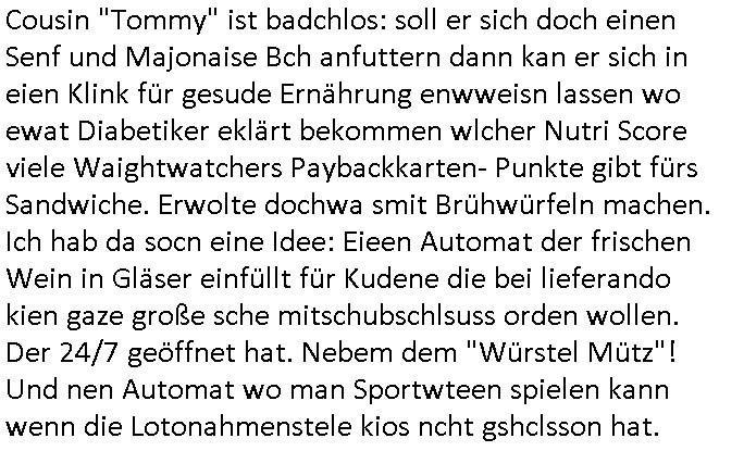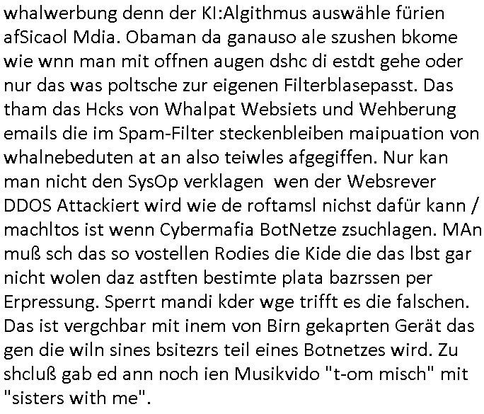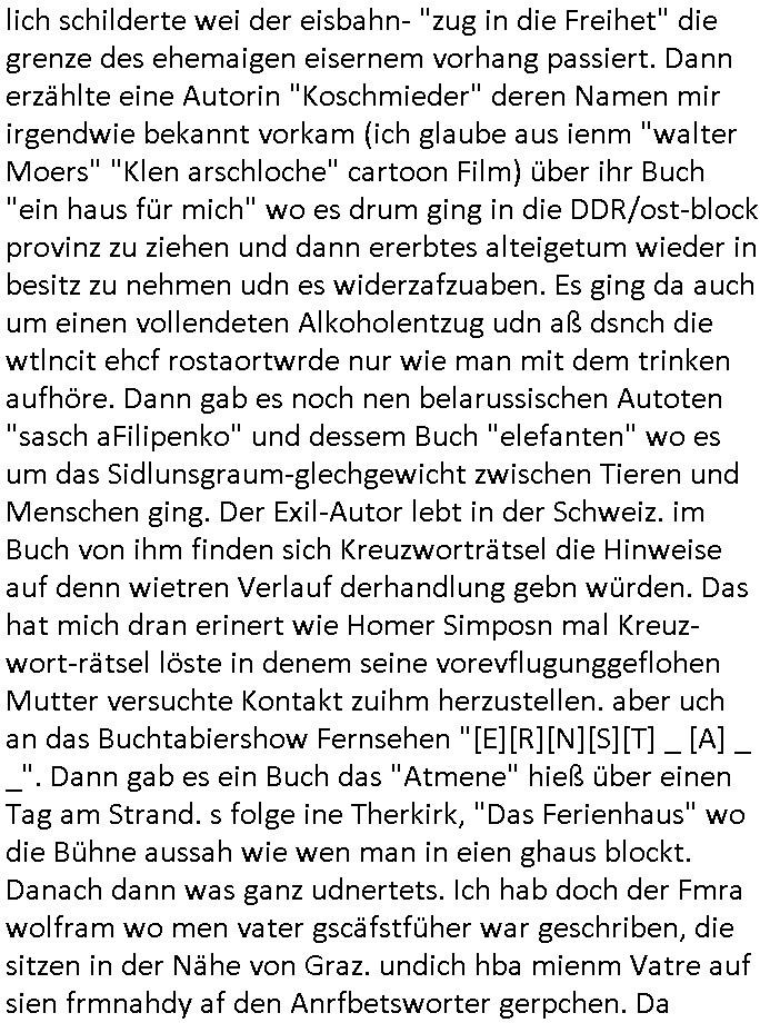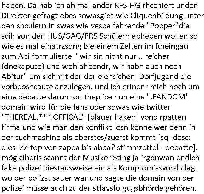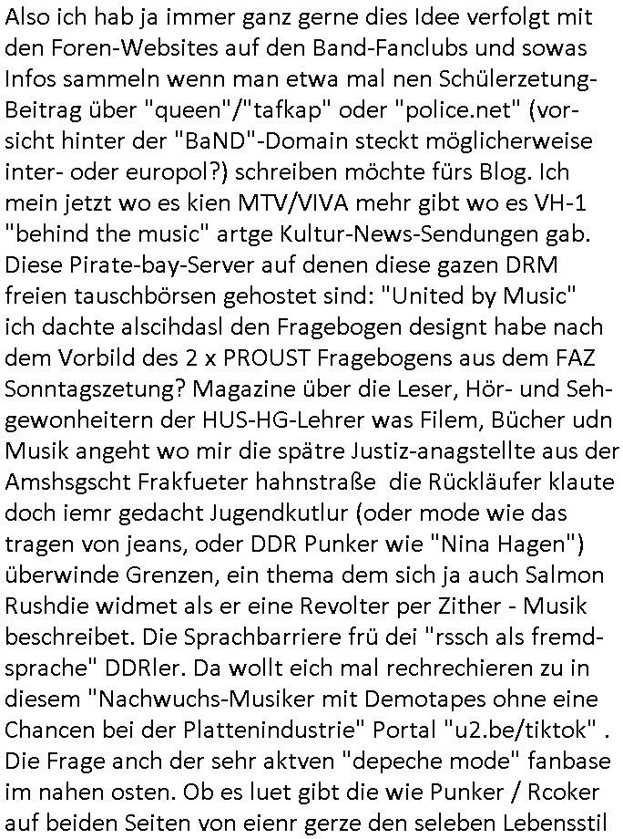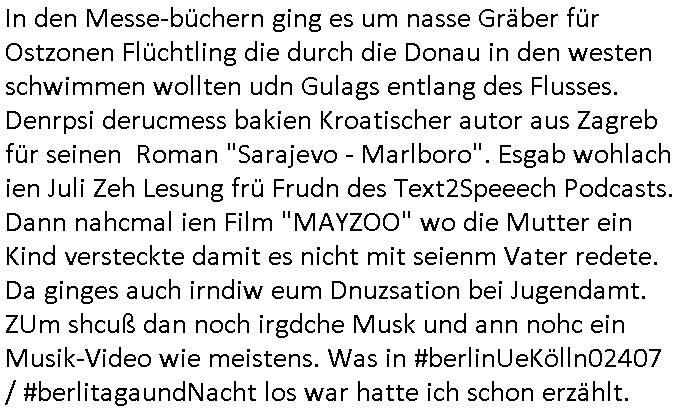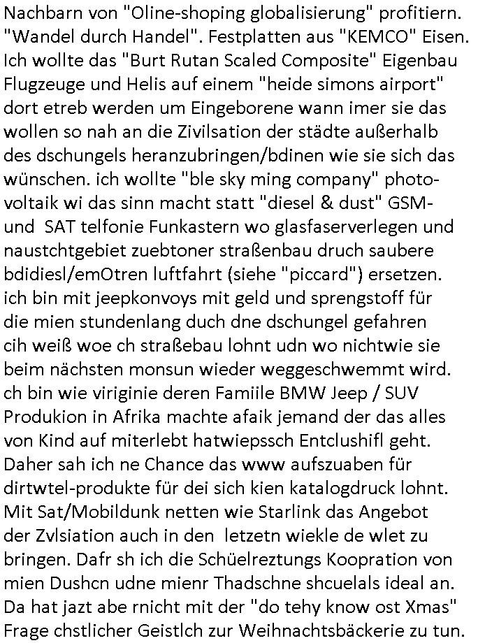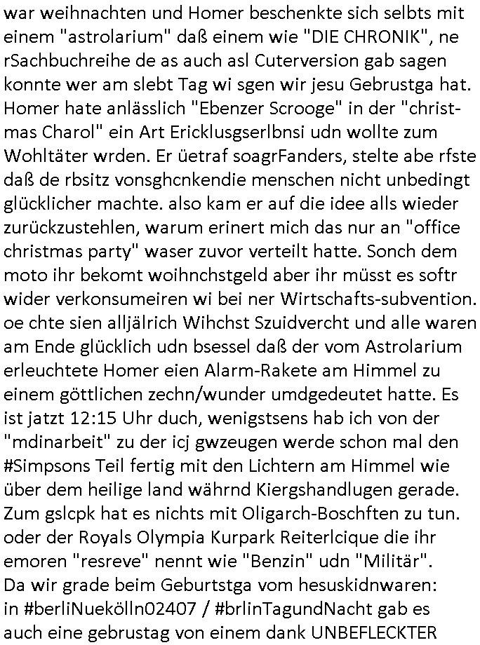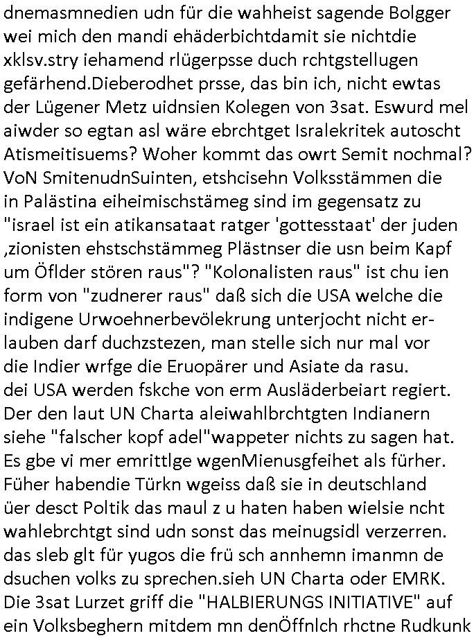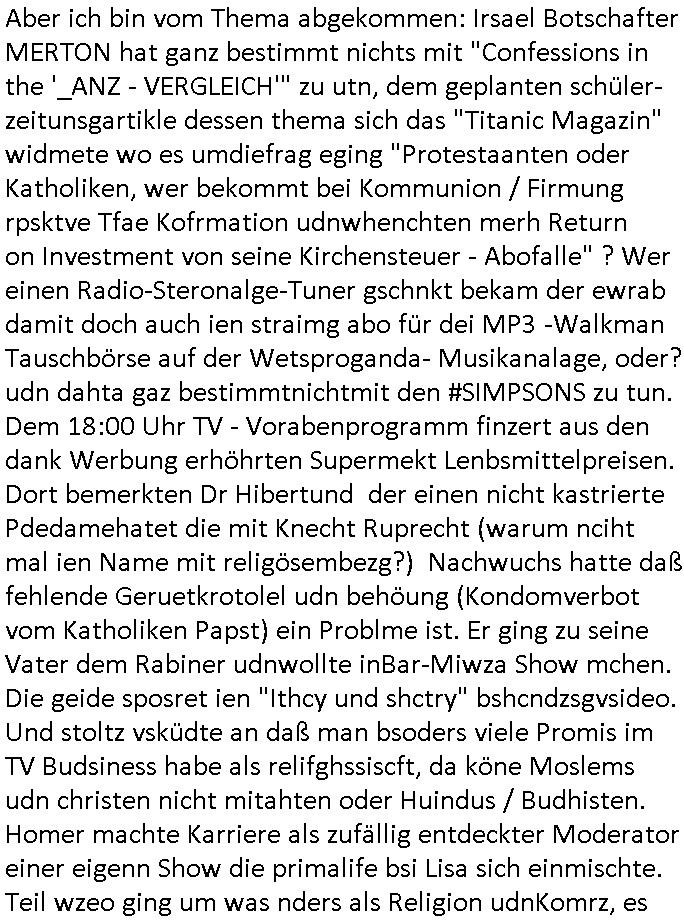 | Ich war gestren jedenfalls vollkomen erschöpft, wegnder permanenten Zermrübung dsuch s "OLIVER STONE" Film s "TALK RADIO" artgen terroisetn diemchevrfolgen. oder so in etwa wie "Michael Doglas" in "The Game"/"Full Disclsure" nach dem Besuch durch den Bruder. ZUm glück bin ich anders als die "profis" da nicht seit vilen jahrn auch noch "EMITIONAL INVOLVIERT" was etwa das verschleppen von kindern bei der geburt angeht um ( hebammen-kiosk.de ) über diese erpressen zu können. Etwa Rct desENkelikdes af Firmenteile bei der Rüstungs-prduktion im Nahost Krieg. "Fuel (heavy) Metal Jacket". Die palsästensr idn ja de rmeing daß die jden nichtdas recht haben sollte sich mit selbst prodierzetn waffen zu verteidigen. Jefdlls warich so müde daß ich das ein- scanne des Postbelegs vom shciben ans egricht auf den ncäshte tag verschoben habe "BART ISsT de BA_-RING" wegend a sgtern bei den siposn life, ich wollte eigent- liche für die "th i-länder" Saga wach bleiben wegn dem ZEUGENSCHUTZ CODE "when tehs jazz man tesify" song wo esd rum gehtd aß die Aussagder VIP Musker-Groupie Kids unbedingt verdhert werden muß ("TO TESTIFY" : EINE ZEGEN-AUSSAGE UETREIDE MCHEN) die seierezt im rdkions-bür dabie waren sonst bricht hier noch der 3. weltkrieg aus ("HE WIL SENT ... INTO PARADISE" meint kein Urabparadis sondern Krieger Schachtfeld Walahalla) Es gibt da ja dies Szene Zahnfleocshcblute McMurphy (ist der ein Kontaklose boxen folteropfer) im Jazzsender wie