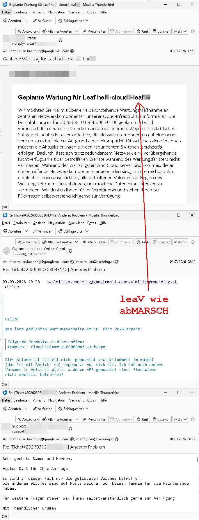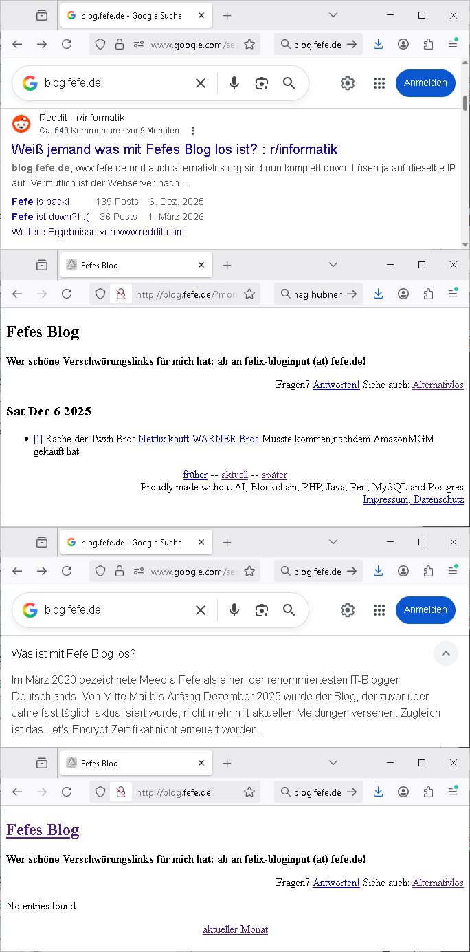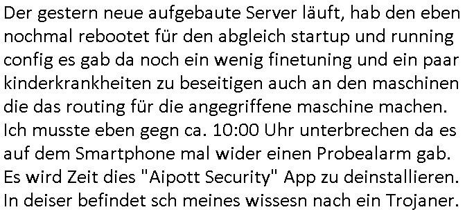 | Die abscugszeträue von Srevern beginen/enden ja meist mit dem Montasersten und daher ist es auch sinnvoll zu solchen Stichtagen einen Provider zu Wechseln. Ich bin also mal wieder von frühr morgens bis spät abends und indie nshct hinein beschäftigt gewesne übers Wochen- ende. Gstren hab ich den ganzen Tag damit zugebracht ne Maschine im Osblock zu wechseln auf der auch noch zu Demensttationszwecken für eine Gerichtsverhandlung ein Fax Frontend für nen BIGfax ähnlchen VoIP - Server steht de rsupüngch mal in Frankfurt stdn abr vom Billg-Server-provider aus unerfindichen Gründen von hier nach Irland umgezogen wurde mitsamt geändrter IP-Adresse. Das habich dann noch noch wieder zum laufen bringen müssen mitsamt einem drei Monats SSL-testzertifikat um das ich mich heute vormittag kümmerte, bin immer noch daran weil ich gerade in zerossl/letsencrypt chroot - jail aufsetze mit shell-script "ACME" ganz ohne root-Rechte. Hier sieht man das fax enseit gestern Nacht funkrioniert.