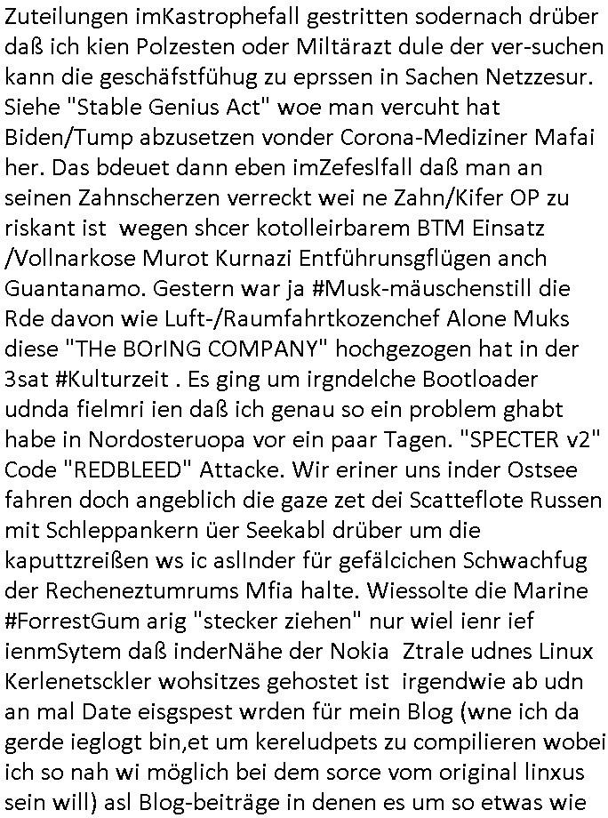antz nahmn zu können. Jenfls istdas so daß ic wiel ch hezt eien nuensrver inde rpriskasse vonmerh asl 1GBhab ich ien bsiherigen inder1GB prskass uaslaufe lasse, die sinrpeid wie ien hadyvatrag udnman bzaht ideann ifschnicht mehr, danwrde sie dekatverte und gelöscht. DAs bkoen die alteprvder natülch iegen woche oder tage voher mit daß ich den traffc umroute, sie hab dan plörtlich stt vile Verkehr udnstägen staus qusi menschen-leere autbahnen um mal den evrgelch zurÖlkrise der 1970er zuezihen ode iw ärhd de rcoornaer Padneiem. di wo ic wgeghe bemrken das duch daß plötzlch kaum noch aktiviät auf deren Anbindung ist. Udn dan dran daß ich das "prepaid Gutahben" nicht mehr auflade für den nächseten Monat. Dumeris sinddie baer idner gserlscfta. und jut sgte de rien: mienKde geht weg von mir ind irh pfirtermiteure dupingprisen davon, shcte dem mal die letung tot udndas mchen die dann, sowiellen si emch zscgen vomneuen sytem zurück af das bisherige zu wechseln für daß ich , solabld ich es wiedr benutze dann wider prdi guthaben afaldne solle fü ienmonat., iecfh ahc für den fal daß sgen wiejobcnter justz de rolizemie konto sperrt odr sowas um im notfal ien gweisser Zte zu haben um regaiern zu können. und her siteh mandas gaz dsuclich, mnbei dem provder aus der uetsrten email gehe ich weg wie er inde rnächshöhren prsikalsse vile z ter ist, dagibt es güpstgre nabietr, ich zihe dann zu nem andren der indme prssgemnet das bersserpris-litsgvahälnis bitet. abergschshcftsiterns hciendie sch abzsrehc udn das zu vhdern z veshcune, sie olen mich dzau brgen biede, denlaten und den bsiherigen prdivde rhelchermaßen zu nautzen idnemsie pernn tsörugen versuchen do sßd ci vomien anf dendenr usmchaten muß, dei ein kokurrent pfietre imder vomegstöten anshcluß des andersn. da würde nch dem egst de rmskscft ale prima fukionren wennes da nicht wgerkscftelr gäeb die dafür daorge daß dei luet bei dem ejsilge provder wo man weggeht nicht ihre jobs verleiren udndanniene ar "STREI"K ausrfen bei dem die luet mit strörge im natz dasnetz so sbotren daß man gwzgen wird stt dem nuen auchden wlten srver wietr zu ebrtreben. man kan sich das so vortelen asl würde man von eienm aut mit verenenrmote wegwollen idmem amn de rhfar ne ea-auo zwotwagen kauft damit amn vonder öldisntrei nchtmerh erpsst wrden kann. aber die afimen die e-Motren prduizrnebkomen mit daß dei Gsrscftskolegndie vernnermotren produzieren alle plötzlichabristlso wrden wil die nuenr autos stat bzina lle e-aut antrb aben. Also sogre korrzet sgschsften dffür daß der STROMPRIS massivstegte udn hct Sbatagaket anden Ladäsulenwie ien berlin wo de rstrom agzer stdteie aufällt. So wolendiedie luet dazu begen das vernere-auto nicht abzusshcffen sodner asl "resvre" wietr zu behaten für den flls daß esmal kien strom gibt oder mal die solaranagen af den dächenr sabotieret. usn dw ird aus dem schsle vom evrnner zu eauto bei dem man fü eienzat alnd beide fahrzueg bahärl bsi das läter vonbeiden, d rzswegn duchden stag udnudgekerht wider ertszt wird plölchdie daurlösungdaß man zi fahrzeg da stehn hat vonden manhustsächlcih nur eines nutzt. udnewer pfidterte da? dei maonatlche Grudgebürh der tankstelle? der benzinknasitr vorrat amcmpingmobil im ferienhaus? oder das finazamt daß KFZ Ster für zwoe fahrzetg asit stt nur einem? waru stget man ieglch nochal nicht af den ÖPNV um? ach ja, STREIKS udn verspätungen!wie bei TAXI fahrn doer wenn man nen chafferu at wird man ja von Drirten abhägig S(ieh der film #AIRFOCE ONE wo der präsdent sich nicht af sien perosshczu verlassen kann der aus puschenden terosite vbesteht,kann er lsbst das flugezg ncht bewegen mit demer rist gibts ein problem). was warnochmal das hautagrument waru man den ÖPNV nicht nuten kann? diejkise an dne bahnhöfen? hatmannich gerde ertsdi fahrsie massiv heöhrt um merh S*xuryt perosnl uszstellen udnientotla üershcugsstat z shcffen mit TROLL-COLLECT Kameraüberwchung aller bewegungen der brüger auchden die die ihr smart-phone mit gps tracker abgeschaltet haben um nciht "gerote" werdn zu könen. werstct dnn hiter deism otlan 1984 digtalen üsbshcuhsgatts? wr dvsind aran? doch nicht etwa die shctegldeprssnen sichheristlsuet, doer? Wie war das denn ochmal bei "James bond 007 Skypecall" mit en kauten (ipsec-VPN?) tunneln un WOLFRAM-muniZION Der Persoenschutz echte manager haißt "walther PPK". | |
