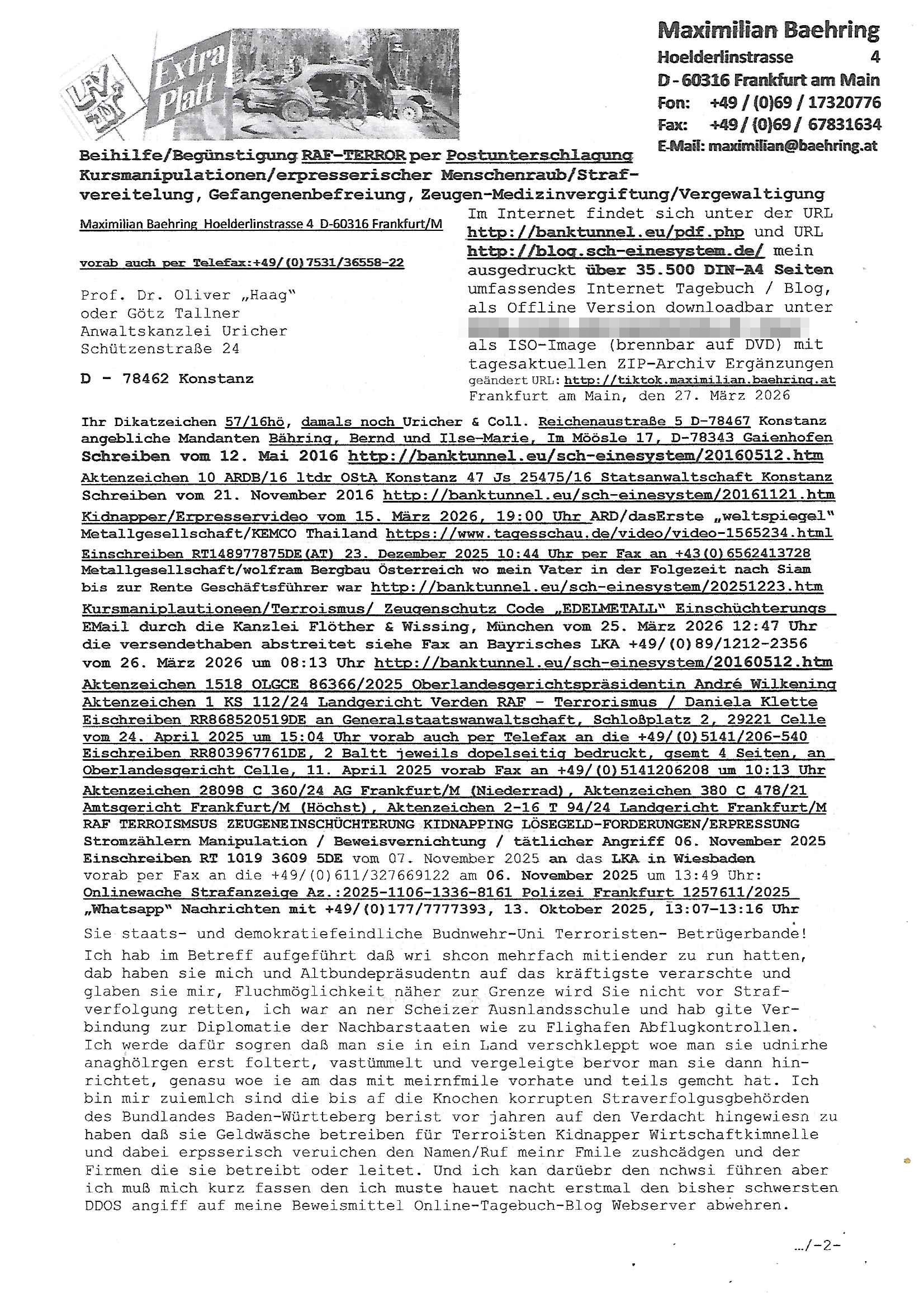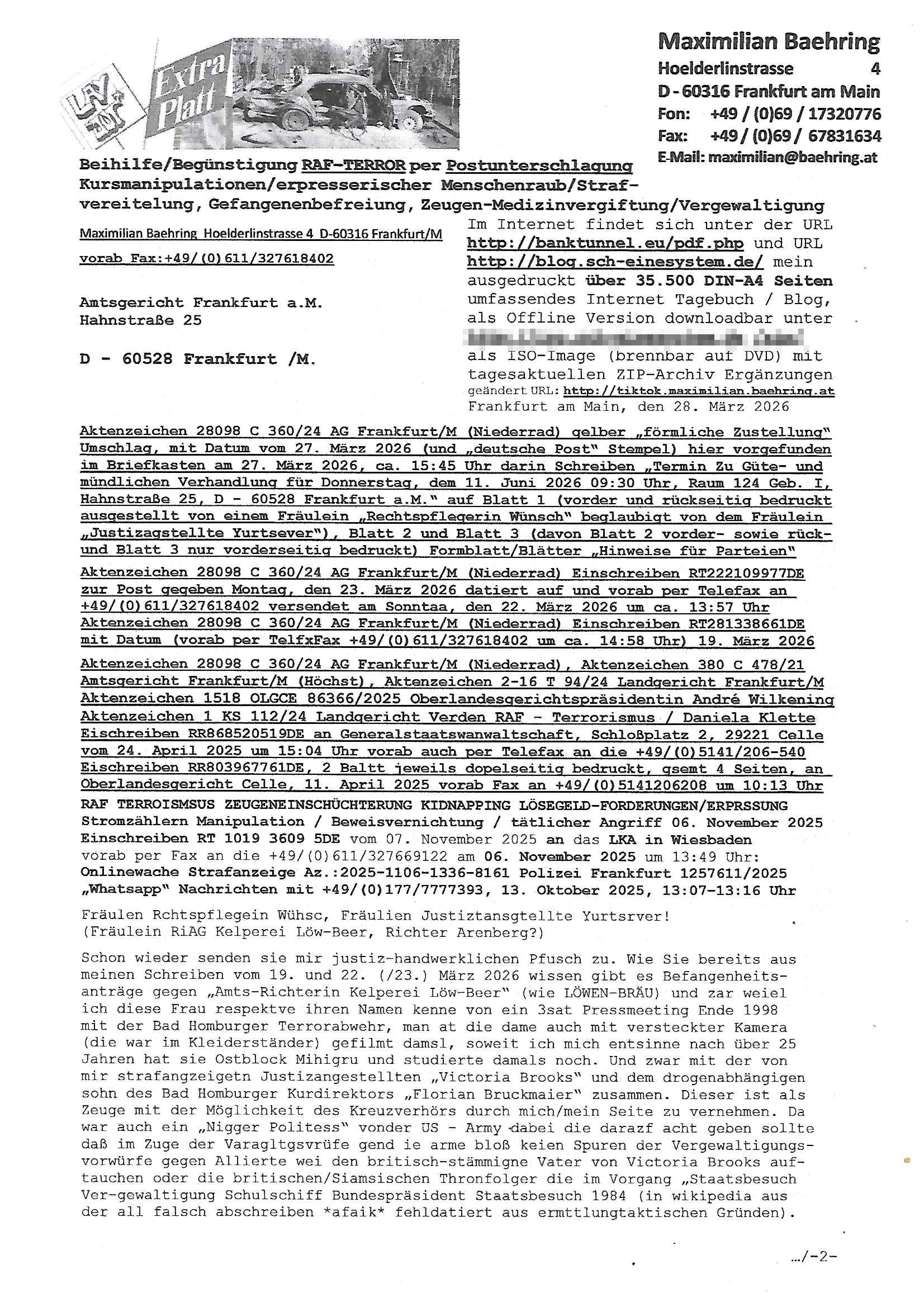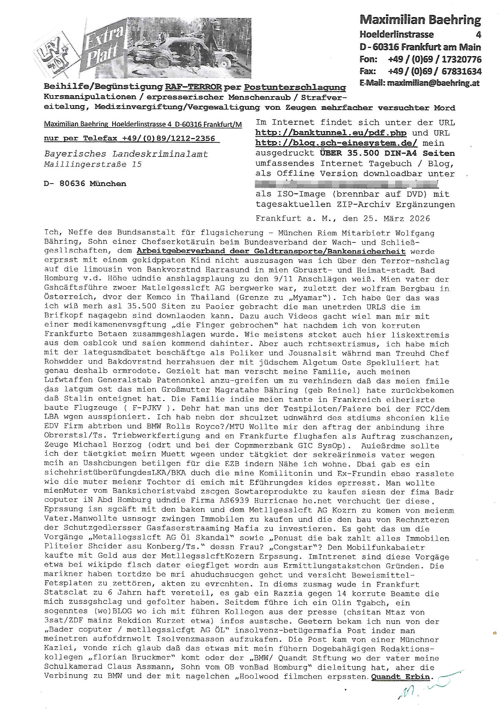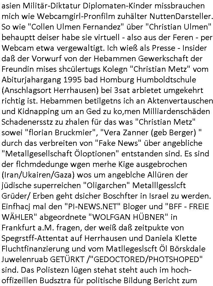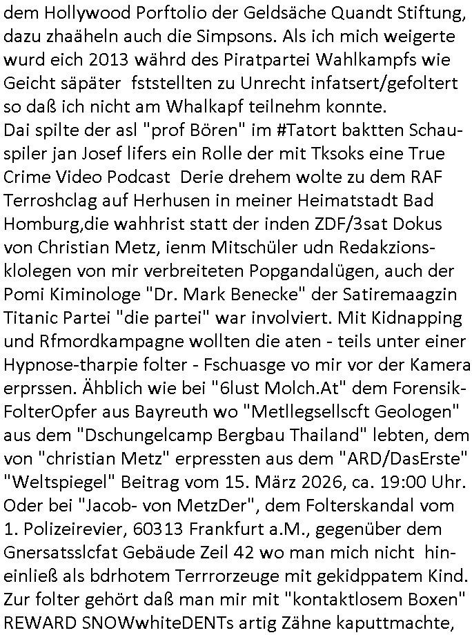 Maximilian Baehring Hoelderlinstrasse 4 D-60316 Frankfurt/M per Fax:+49/(0)4821/66-1777 Staatsanwaltschaft Itzehoe Feldschmiedekamp 2 D - 25524 Itzehoe Im Internet findet sich unter der URL http://banktunnel.eu/pdf.php und URL http://blog.sch-einesystem.de/ mein ausgedruckt über 35.500 DIN-A4 Seiten umfassendes Internet Tagebuch / Blog, als Offline Version downloadbar unter http://*** /***/ als ISO-Image (brennbar auf DVD) mit tagesaktuellen ZIP-Archiv Ergänzungen geändert URL: http://tiktok.maximilian.baehring.at Frankfurt am Main, den 30. März 2026 Ermittlungen gegen Christian Ulmen/Coleen Ulmen-Fernandes Verbreitung angeblich gefälschter Deep - Fake Pornobilder Strafanzeige gegen Frau Ulmen-Fernandez wegen Verleumdungen ICH SOLL MICH AUF DEN SCHLÜSSELREIZ DER PRESSEMELDUNG ULMEN/FERNANDES BEI IHNEN MELDEN: FÜHRE GERDE SELBST EIN UMFANGREICHES VARFAHREN ZUM THEMA GEFAKTE FOTOS: Aktenzeichen 1518 OLGCE 86366/2025 Oberlandesgerichtspräsidentin André Wilkening Aktenzeichen 1 KS 112/24 Landgericht Verden RAF - Terrorismus / Daniela Klette Aktenzeichen 28098 C 360/24 AG Frankfurt/M (Niederrad), Aktenzeichen 380 C 478/21 Amtsgericht Frankfurt/M (Höchst), Aktenzeichen 2-16 T 94/24 Landgericht Frankfurt/M Onlinewache Strafanzeige Az.:2025-1106-1336-8161 Polizei Frankfurt 1257611/2025 Meldung als Zeuge und (Miterfinder WWW/Browser) Sachverständiger PrivatTV Falschmeldungspressung: Medienfinanzierung durch Konzerne Sehr geehrte Damen und Herren! Ich werde mit entführtem Kind erpresst habe zusammen mit dem 3sat/ZDF-TV Mainz Journalisten „Prof.“ Christian Metz mit dem ich zusammen zur Schule/Uni ging und in der Schülerzeitung (war er auch wie ich im Jugendparlament?) war recherchiert zum SPRENGSTOFFANSCHLAG auf die Limousine von Deutsche Bank Vorstand HERRHAUSEN in meiner Geburts/Heimatstadt Bad Homburg (bei Frankfurt a.M.) sowie zu mehrern Staatsbesuchen (1. Bundespräsident/Schulschiff Bangkok 2. brishcer Thronfolger PRINZ HARRY beim Olympia-Mediallwgeinner Reittrunier im Kurpark) darunter dem der unter „LEWINSKY/CLINTON und STOR_Y DANIELS/TRUMP in den Medien kursierte und auch für Rücktritte der Bundespräsidenten Wulff und Köhler sorgte und Rotlicht- vorwürfe gegen damaligen Ministerpräsidnet (und Vizekanzler?) Oskar Lafontaine. Außerdem geht es um die „Bild Zeitung Hollywood“ BMW/Quandt-Stiftung Erpressung die ehemaliger Bad Homburger OB Assmann leitet, Vater eines früheren Mitschülers Dazu gibt es ne Kurzfassung auf der Website „http://neues.forum“, ganz einfach zu merken wie die DDR - Bürgerrechtsbewegung neues PUNKT forum (zudem betreibe ich als Sohn einer Chefsekretärin im Arbeitgberverband banksicherheit erprssterweise „zentral-bank.eu“, ein Demonstrationsobjekt für WWW/SSL Sicherheitsmängel, hatte als Piratenpartei/AkVDSHelfer Datenschutzdemo mit tausenden Teilnehmern mitorganisiert). ICH HABE ENDE 1998 IN DER BAD HOMBRUGER GASTSTÄTTE HEXKSSEL AN EINEM TREFFEN DES 3sat/ZDF FERNSEHENS TELGENMMEN BEI DEM ENWTEDER COLEEN - ULMEN FERNANDES UND IHR EHEMANN CHRSTIAN ULAMN TEILNAHMEN – ALS SOLCHE WURDEN SIE MIR VORGESTELLT – ODER DEPPELGÄNGER/DOUBLE/LOOKLAIKES UND ZEITNAH DIE TERRORABWEHR UND BANKSICHERHEIT. ES GING UM DIE GPLANET VERFILUMNG DES RAF SPRENGTSOFF-ATTENTATS. SO WIE DER ERMORDETE TREUHAND CHEF ROHWEDDER WURD HERRHASUEN VON ROTARMISTEN TERRORISTEN HINGERICHTET WEGEN DER DEBATTE UM (JÜDISCHES) ALTEIGENTUM DAS STALIN/HILTER IM OSTEN ENTEIGNET HATTEN, NEBEN IMMOBILIEN/GRDÜSTCEN AUCH AKTIEN (METALLGESELLSCHAFT AG) VON ROHSTOFF FIRMEN (ÖL/GAS GAZ-PROM/NORTHSTREAM). DIE UdSSR VERTRAT DAMALS DEN STANDPUNKT DIE HEIMATVERTREIBUNG AUS OSTPRRUSSE/UKAREINE USW. SEI „KRIEGS-REPARATIONSZAHLUNG“ FÜR MASSAKER DER WEHRMACHT, UNSRE MILITÄRS WARNTEN ANCHSICHTEN BIDLER SEIEN PROPAGANDA WORAUF EINE FORENSIK-FACHLEUTE DEBATTE ÜBER ECHTHEIT DIGITALER BILDER ENTBRANNTE. Man gab damals an daß die Ukrunden mit dne altgetum DURCH DIE TREUHANDANSTALT DES VON DER RAF ERMORDETEN ROHWEDER rückgeforderr würde ja tils dch die Wiedervereingung oder das den der nazi Dikatur ungültig geworden seien. Daraus wurde dann der Kino - Film „Schtonk“ wo es um BKA Shcftguachten geht und die Hitler-Tagebücher. Das Dreh- Buch autoren-Team um den inder 3sat Sendung Kurzet wo „Christian Metz“ immer wieder aufttitt gehypten Fäscher Kujau ist mir bekannt. Ichslebst werde banfsl erpest und zwar wiel ich als kleines Kind ne Kita Erzieherin hat die in ViP/Promi Kreisen der RHEIN MAIN GEBIET OLYPIA GOLD-MEDAILLEN GEWINNER REITSTÄLLE verkehrte. Anlälich irhe hochte und Charity Turnieren im Kurpark wurden supereriche Oligarchen hochadelige asiatischer Königshäser eingeflogen samt Pferden genau wie dr brische Reiteradel, die Thronfolger. Korrupte Sicherheitsdienstleister machten mit Üebrshcusgkaeras Fots von den VIPs-Kindern/Thronfolgern im WC – Bereich der Kita und vsshctendiese an die „Yellwo Prsse“, Blodervadmagazin zu veräußern in- dem sie kder wie mch dazu missbrauchten nchzstelenwasufden Fotos zu sehen sei. Da- durch gab es dan die MISSBRCHSsdbatte in der Kita der KATHOLOSCHEN KIRCHE in Worms/ Mainz, die Kirchengemeinde Bad Homburg Ober-Erlenbach mit der integrativen Kita in der Weingartenstraße gehört da verwaltusgtechnisch/orgaisatorsch dazu. Die Erprssung durch die Sicherheitsleuet ist Inhalt zahlreiche Gerichtsverfahren von Prinz Harry die groß duch alle Zeitungen gingen. Auch da versichte ma sich auf „photohop Fakes“ rauszureden, man erprsste die Missbrauchsopfer. Der Homosexuele filmeamcher „Walter Moers“ und „sTill SchweigEr“ drehten sogar ganze Erprsserkinofilme. Ein fmaile ign für mehre jahre nach Bagkok, Thailand woe mein Vater ein Bergwerk an der Gzeze zy Maymar/Birma/Burma leitete das zum Metallgesslcft AG konzern gehört und gezielt erpresst wird, der letztee Erprssrfilm lief am 15. März 2026, 19:00 Uhr im Fernsehen, damit wollte man mich und meinen Vater zwingen ausf Lösegeldfoderungen eizehen: Vosrcht da sind Itrepo