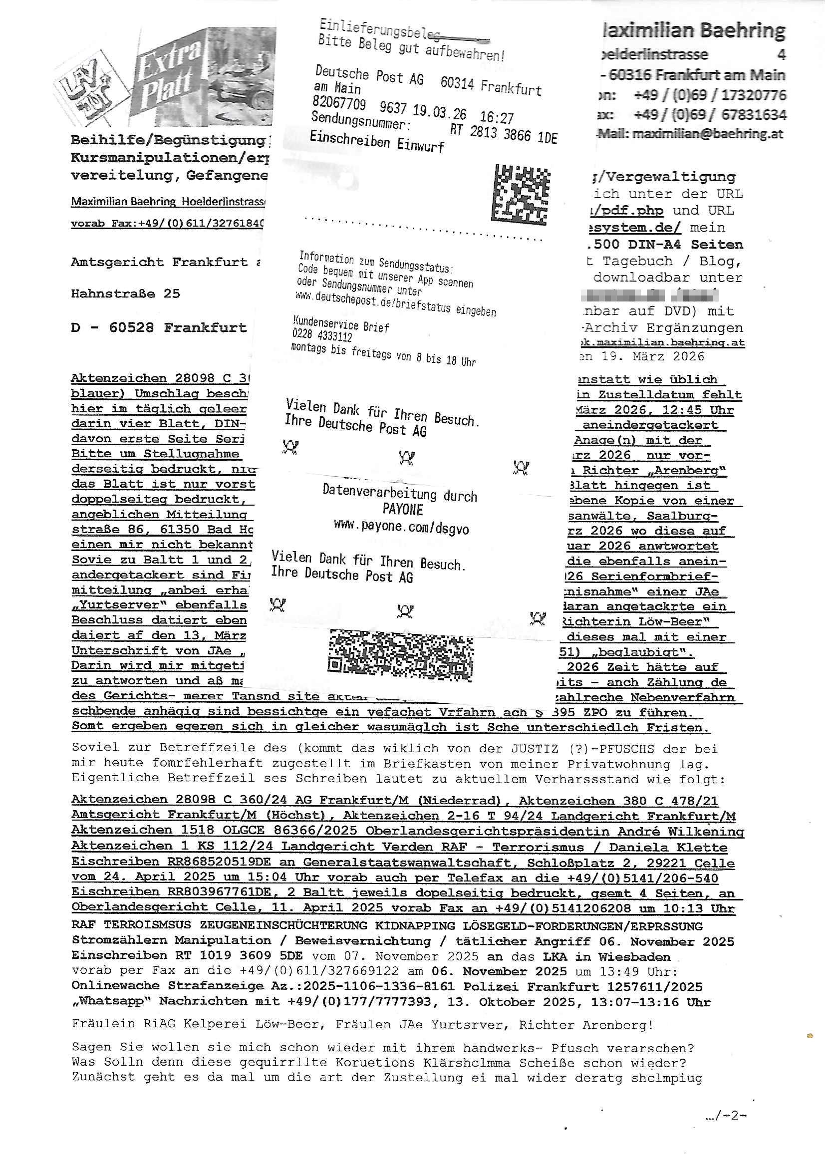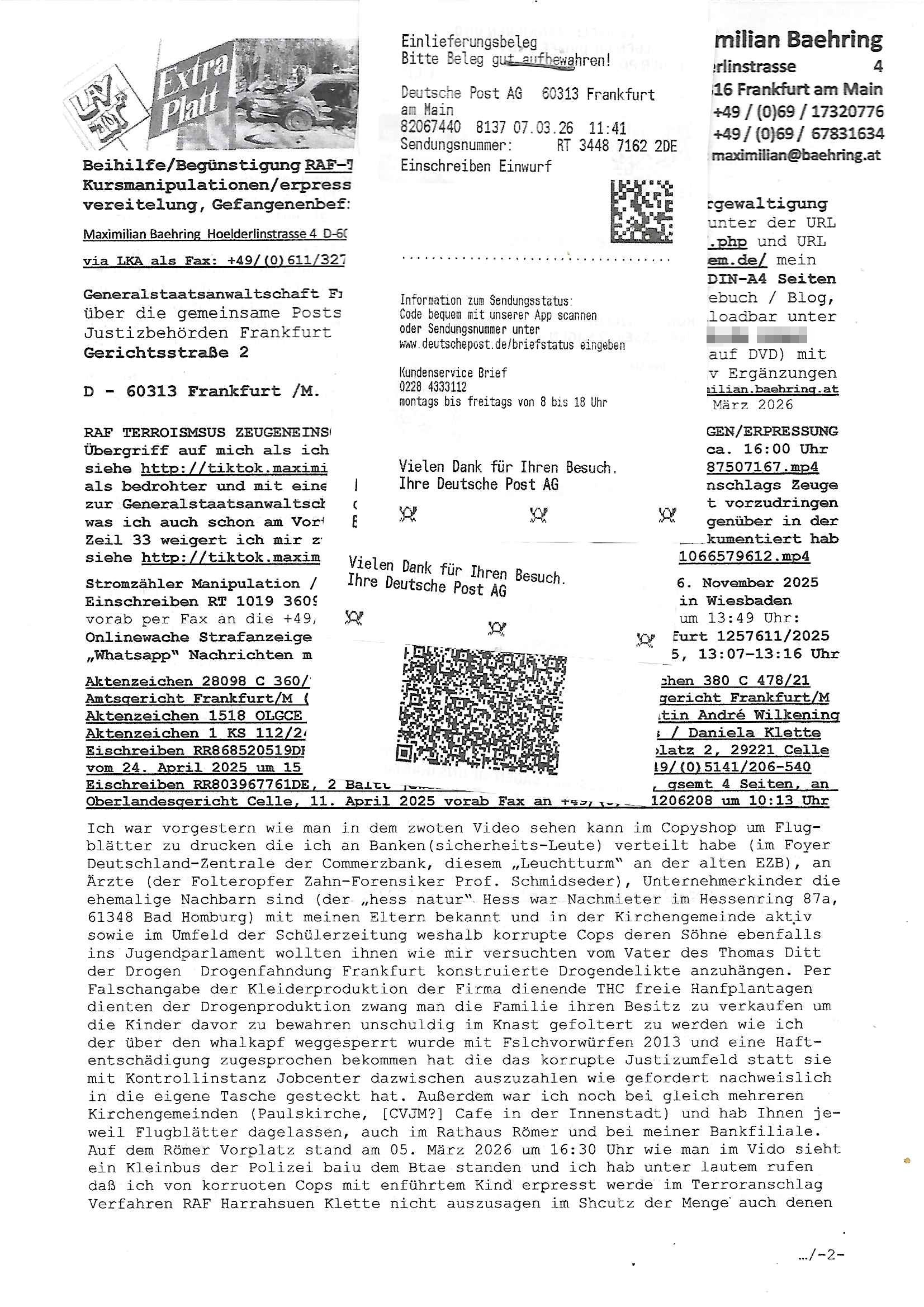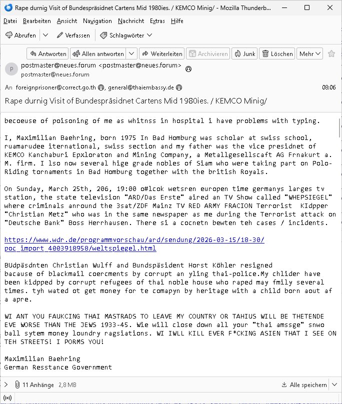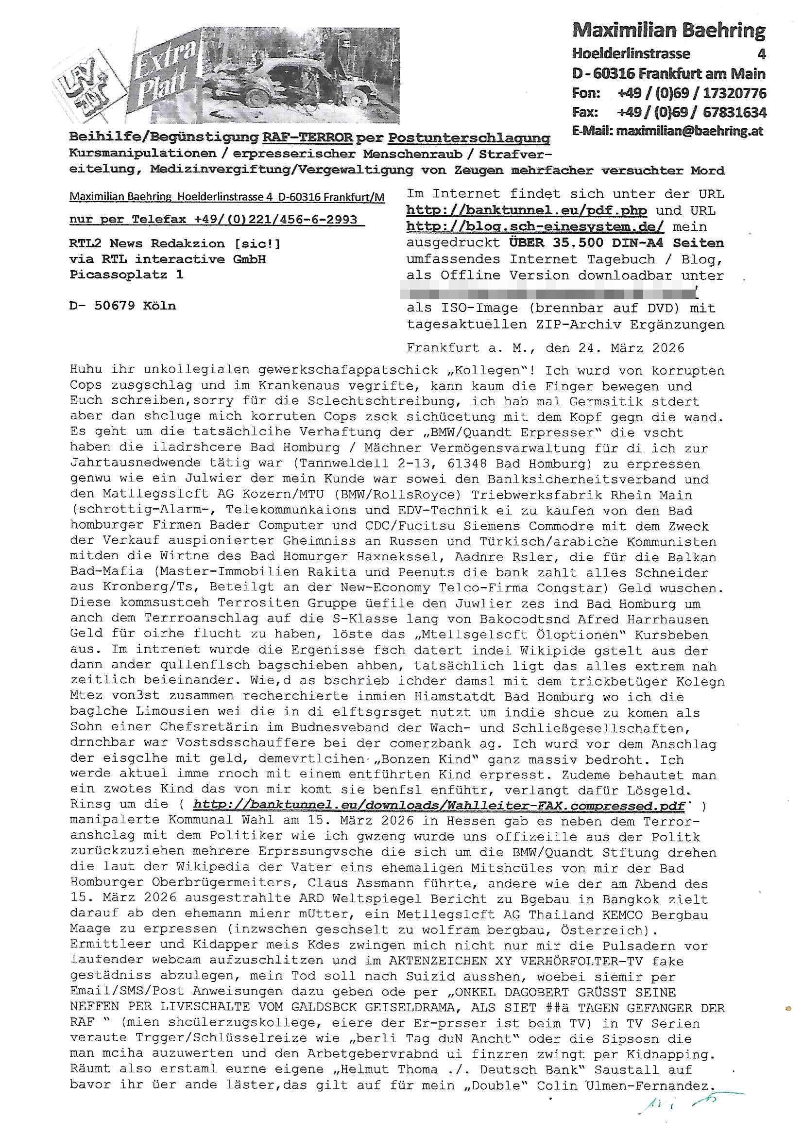Maximilian Baehring Hoelderlinstrasse 4 D-60316 Frankfurt/M per Fax:+49/(0)4821/66-1777 Staatsanwaltschaft Itzehoe Feldschmiedekamp 2 D - 25524 Itzehoe Im Internet findet sich unter der URL http://banktunnel.eu/pdf.php und URL http://blog.sch-einesystem.de/ mein ausgedruckt über 35.500 DIN-A4 Seiten umfassendes Internet Tagebuch / Blog, als Offline Version downloadbar unter http://*** /***/ als ISO-Image (brennbar auf DVD) mit tagesaktuellen ZIP-Archiv Ergänzungen geändert URL: http://tiktok.maximilian.baehring.at Frankfurt am Main, den 30. März 2026 Ermittlungen gegen Christian Ulmen/Coleen Ulmen-Fernandes Verbreitung angeblich gefälschter Deep - Fake Pornobilder Strafanzeige gegen Frau Ulmen-Fernandez wegen Verleumdungen ICH SOLL MICH AUF DEN SCHLÜSSELREIZ DER PRESSEMELDUNG ULMEN/FERNANDES BEI IHNEN MELDEN: FÜHRE GERDE SELBST EIN UMFANGREICHES VARFAHREN ZUM THEMA GEFAKTE FOTOS: Aktenzeichen 1518 OLGCE 86366/2025 Oberlandesgerichtspräsidentin André Wilkening Aktenzeichen 1 KS 112/24 Landgericht Verden RAF - Terrorismus / Daniela Klette Aktenzeichen 28098 C 360/24 AG Frankfurt/M (Niederrad), Aktenzeichen 380 C 478/21 Amtsgericht Frankfurt/M (Höchst), Aktenzeichen 2-16 T 94/24 Landgericht Frankfurt/M Onlinewache Strafanzeige Az.:2025-1106-1336-8161 Polizei Frankfurt 1257611/2025 Meldung als Zeuge und (Miterfinder WWW/Browser) Sachverständiger PrivatTV Falschmeldungspressung: Medienfinanzierung durch Konzerne Sehr geehrte Damen und Herren! Ich werde mit entführtem Kind erpresst habe zusammen mit dem 3sat/ZDF-TV Mainz Journalisten „Prof.“ Christian Metz mit dem ich zusammen zur Schule/Uni ging und in der Schülerzeitung (war er auch wie ich im Jugendparlament?) war recherchiert zum SPRENGSTOFFANSCHLAG auf die Limousine von Deutsche Bank Vorstand HERRHAUSEN in meiner Geburts/Heimatstadt Bad Homburg (bei Frankfurt a.M.) sowie zu mehrern Staatsbesuchen (1. Bundespräsident/Schulschiff Bangkok 2. brishcer Thronfolger PRINZ HARRY beim Olympia-Mediallwgeinner Reittrunier im Kurpark) darunter dem der unter „LEWINSKY/CLINTON und STOR_Y DANIELS/TRUMP in den Medien kursierte und auch für Rücktritte der Bundespräsidenten Wulff und Köhler sorgte und Rotlicht- vorwürfe gegen damaligen Ministerpräsidnet (und Vizekanzler?) Oskar Lafontaine. Außerdem geht es um die „Bild Zeitung Hollywood“ BMW/Quandt-Stiftung Erpressung die ehemaliger Bad Homburger OB Assmann leitet, Vater eines früheren Mitschülers Dazu gibt es ne Kurzfassung auf der Website „http://neues.forum“, ganz einfach zu merken wie die DDR - Bürgerrechtsbewegung neues PUNKT forum (zudem betreibe ich als Sohn einer Chefsekretärin im Arbeitgberverband banksicherheit erprssterweise „zentral-bank.eu“, ein Demonstrationsobjekt für WWW/SSL Sicherheitsmängel, hatte als Piratenpartei/AkVDSHelfer Datenschutzdemo mit tausenden Teilnehmern mitorganisiert). ICH HABE ENDE 1998 IN DER BAD HOMBRUGER GASTSTÄTTE HEXKSSEL AN EINEM TREFFEN DES 3sat/ZDF FERNSEHENS TELGENMMEN BEI DEM ENWTEDER COLEEN - ULMEN FERNANDES UND IHR EHEMANN CHRSTIAN ULAMN TEILNAHMEN – ALS SOLCHE WURDEN SIE MIR VORGESTELLT – ODER DEPPELGÄNGER/DOUBLE/LOOKLAIKES UND ZEITNAH DIE TERRORABWEHR UND BANKSICHERHEIT. ES GING UM DIE GPLANET VERFILUMNG DES RAF SPRENGTSOFF-ATTENTATS. SO WIE DER ERMORDETE TREUHAND CHEF ROHWEDDER WURD HERRHASUEN VON ROTARMISTEN TERRORISTEN HINGERICHTET WEGEN DER DEBATTE UM (JÜDISCHES) ALTEIGENTUM DAS STALIN/HILTER IM OSTEN ENTEIGNET HATTEN, NEBEN IMMOBILIEN/GRDÜSTCEN AUCH AKTIEN (METALLGESELLSCHAFT AG) VON ROHSTOFF FIRMEN (ÖL/GAS GAZ-PROM/NORTHSTREAM). DIE UdSSR VERTRAT DAMALS DEN STANDPUNKT DIE HEIMATVERTREIBUNG AUS OSTPRRUSSE/UKAREINE USW. SEI „KRIEGS-REPARATIONSZAHLUNG“ FÜR MASSAKER DER WEHRMACHT, UNSRE MILITÄRS WARNTEN ANCHSICHTEN BIDLER SEIEN PROPAGANDA WORAUF EINE FORENSIK-FACHLEUTE DEBATTE ÜBER ECHTHEIT DIGITALER BILDER ENTBRANNTE. Man gab damals an daß die Ukrunden mit dne altgetum DURCH DIE TREUHANDANSTALT DES VON DER RAF ERMORDETEN ROHWEDER rückgeforderr würde ja tils dch die Wiedervereingung oder das den der nazi Dikatur ungültig geworden seien. Daraus wurde dann der Kino - Film „Schtonk“ wo es um BKA Shcftguachten geht und die Hitler-Tagebücher. Das Dreh- Buch autoren-Team um den inder 3sat Sendung Kurzet wo „Christian Metz“ immer wieder aufttitt gehypten Fäscher Kujau ist mir bekannt. Ichslebst werde banfsl erpest und zwar wiel ich als kleines Kind ne Kita Erzieherin hat die in ViP/Promi Kreisen der RHEIN MAIN GEBIET OLYPIA GOLD-MEDAILLEN GEWINNER REITSTÄLLE verkehrte. Anlälich irhe hochte und Charity Turnieren im Kurpark wurden supereriche Oligarchen hochadelige asiatischer Königshäser eingeflogen samt Pferden genau wie dr brische Reiteradel, die Thronfolger. Korrupte Sicherheitsdienstleister machten mit Üebrshcusgkaeras Fots von den VIPs-Kindern/Thronfolgern im WC – Bereich der Kita und vsshctendiese an die „Yellwo Prsse“, Blodervadmagazin zu veräußern in- dem sie kder wie mch dazu missbrauchten nchzstelenwasufden Fotos zu sehen sei. Da- durch gab es dan die MISSBRCHSsdbatte in der Kita der KATHOLOSCHEN KIRCHE in Worms/ Mainz, die Kirchengemeinde Bad Homburg Ober-Erlenbach mit der integrativen Kita in der Weingartenstraße gehört da verwaltusgtechnisch/orgaisatorsch dazu. Die Erprssung durch die Sicherheitsleuet ist Inhalt zahlreiche Gerichtsverfahren von Prinz Harry die groß duch alle Zeitungen gingen. Auch da versichte ma sich auf „photohop Fakes“ rauszureden, man erprsste die Missbrauchsopfer. Der Homosexuele filmeamcher „Walter Moers“ und „sTill SchweigEr“ drehten sogar ganze Erprsserkinofilme. Ein fmaile ign für mehre jahre nach Bagkok, Thailand woe mein Vater ein Bergwerk an der Gzeze zy Maymar/Birma/Burma leitete das zum Metallgesslcft AG konzern gehört und gezielt erpresst wird, der letztee Erprssrfilm lief am 15. März 2026, 19:00 Uhr im Fernsehen, damit wollte man mich und meinen Vater zwingen ausf Lösegeldfoderungen eizehen: Vosrcht da sind Itrepo
