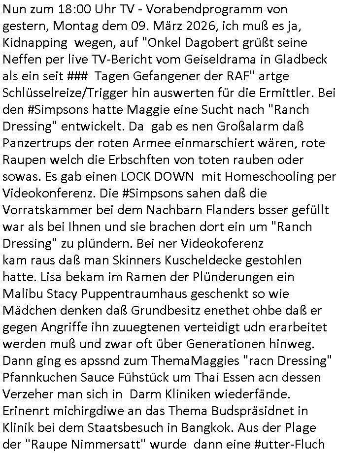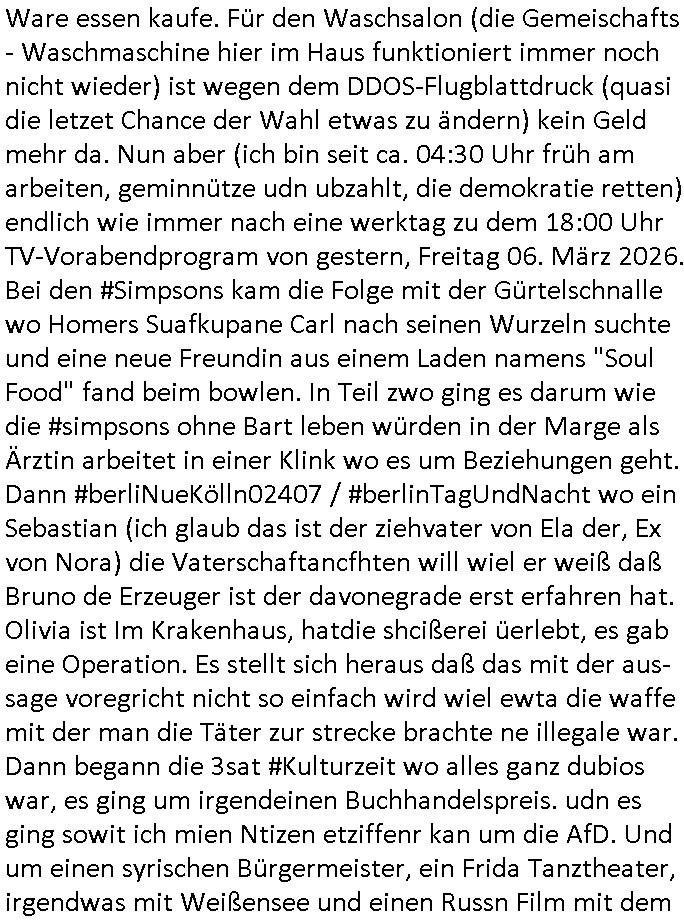 | Zum 18:00 Uhr TV - Vorabendprogramm vom gestrigen, Dienstag dem 03. März 2026 ist folgendes zu sagen: Bei den #Simpsons kam die Folge wo Homer mit einem Bett- nässer Kind mit Krone daß Teirpräperate pachte schlief. Und Lisa und Bart machten geimeinsam Party im Heim. In Teil zwo kam die Folge wo Lisa in der Zukuft in einem Zug Nelson trifft der mit ner Kopfgedljägerin verheiratet ist und es um irgclhes Glockengbimmel ging. Diese mit dieser "Queen/Biohemaina Rhapsody" Abschiedsszene. Dann #berliNueKölln02407 / #berlinNeuKölln02407: Der (siehe was ich zum Thema "Schweizer Shcule Bangokok" am Vorgae sagte) Asien Lehrkraft "Lebach" fiel auf daß die "WG" observiert wird. Sie zog Carlas Kollegen von der Polizei hinzu und der traf auf Milla und er erinnerte sich softr daß die ihn dreistes belogen hatte von wgen "olivialügt" - Mila lügt selbstedie ganze Zeit rum. Und im ABC/ Alphabet Verien ist komischerweise alles ganz "friedlich" udn das obgleich Nora Burno udnsie leibliche Tochter Ela belogen und betrogen hat, jahr(zehnt)elang üerienander. Man kann eigentlich sagen daß alle Frauen in der Serie lügen, ic denkd a uch an Chiara die schwarz arbeitet und irhen abrietgbr schädigt. Was war eigentlich der Grund daß Sarah von Nuri verlassen wurde? "Pistolen - Peggy" hat doch Familienmitglied Theo ermordet. Raphi ist ne Heiratsschwindlerin und Jose Enkelin gleitet gerade ab in die Drogensucht wei sie an irer shcule eien kriminelles Umfeld hat, auch sie fängt ja deshalb an Sachen zu ver-