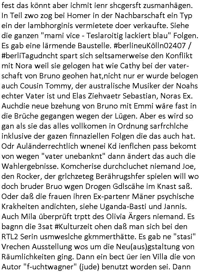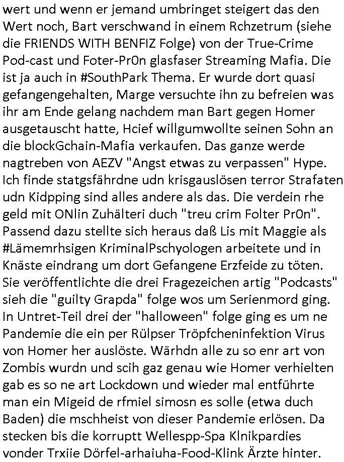 Und da hat man dann spürhunde auf die angesetzt udn rausgefunden daß ienr der täter blut verlor aufderflucht und obdachlos war, er übernchte in einem park. kan gut sien daß es hestretgkiten zu hause gab oder sowas. und dan fand manihn am end in soe einer gartenlabe was jabeknntlch gar kien gartnäsersind sodenr die gheiemsn slums indenstchen großtsädten we die "trailor mom"s leben wie die Mutter von #dieSimpons Nelson denen der Ehemann abhanden gekommen is tbeim Zigarettenholn. Wen man anc thaland jezte mit zwischstop in newdhli oder baombay sieht man die klegartesidlugen dort aus dem flugzeug. #urbanGardening #slumdogMillionaire #boomtownRats . Siehe dazu das thema bad homburger #Brunnenalle wo heilwasser-trinker zur kur gehen. da wo dr könig von Thaildn einen klien Temple gsstiftet hat beim "KIR ROYL = KUR ROYAL" Hochldge retcliqe Staatsbesuch irgendwann mal zu zeiten vom "letzten kaiser". das ist natülch mal wider so ne randbemerkung die nur mich intressirt sl hemalge tahlands/shcuzer auslandsschüler. es gab da uch mal ien thai fst mit singha/kloster beer nach deushcem rezpt für das rod stewart werbung macht. "warum ist es am rhein so schön, ... galopper de jahres" #fragwürdig/"kinder an die mcht" hergottKrümelmonster (sagte mein bruder als er noch klien war mal) geht mir da gerade durch den kopf wo dieser "royal" vera zanner (geb berger) durch einen abstatfödernden auftritt in der kiepe wo sie kllenert half ihren job zu be-halten asl nach ostblock scheidung alleinverdienerin? darauf ein #Köpi mit "kron-korken". wir erinnern uns der "kir royal RÖMERBRUNNEN" und Italo-Soldaten Weinbau an der zonen-grenze "MAUER" dem "LIMES". was hat das jetzt mit bergbau #fairtrade diamanten zu tun und "NEGER-Musik"-KuLTUrinvasion? Promi Kider Erbfolge Kupark Sakralbuaten und sowas? Dem "Slumdog Millionaire" Kleingarten Grudtsückspreis un der mietentwockling in New-Dehli oder Bombay. Der liskstermen jdsücheslategtum hausbestzer Szene im Rotlichtvierte am Hambuger hafen wo die Staatsyachten Ozeanriesen anlegen? Prostitution / Me_rSchiffsverkehr und dem Puff den sie abgerissn haben nach dem Abzug der Bestungssoldten wegn der E_RO_CENT_R -albank? die dank intrenet 24/7 geöffnte auch wenn der schalter wo boten die immer wieder überfalle werden von den urwehneren die gegen einen eisnbahn-bau sind post aus den kutschen ablieferen längst feierband hat? das ist antülch jeut keine frage asu dem zusammenhag juwelen-trasporteraub."wie stehn sie persölich zum ladneschluß" oder "hsc auf dem wgeben wagen" / "fremdknutschen". ci binshcn wodier vollkomen ab vom thema, jwuelen als "sory aber ich bin vergeben" schutz vor unerwünschtem annäherunsgaversuchen. / in - erblinien vergelgungen. ich kom au sienr zet da war "fräulein" asl Bref-Anrede noch durchaus gebräuchlich uen id uneheliches kind galt als fast genauso eine Schande wie ien außerheliches. Es gab dan irgendeine spur die führt zu einer single mom und deren Kind und dort war dann die beute versteckt. In so einer Art Sack oder Tasche, mir fehlt das Wort grade, also es fällt mir nicht ein. Ich werde eben auch Älter. Und es kam herus daß der Vater des kidnes jemand war der was mit Autmaten machte wo man so Paare rsushcne musßte wie bei memyry-Spiel oder Puzzel die zueinder passen oder im Schuhgschäft, ic hweiß nicht mehr so genau wie das war, es gab da zwo untrschidliche Schreib-weisen mehrere im Sinne von viele oder zwo exkat zu-einanderpassende für "ein Paar". Und der hatte um diese Elektronikautomaten zur PAaR(tner)SUCHE zu finanzieren irgendwie asl Clawn anonymisiert verkleidet den Über- fall verübet. Und so wurd er dann seine "übermächtige mutter" los am Ende gabs nochmal Schusswaffeneinsatz. ch wieß ga nicht merwie ic vonder "deep fake" KI Video Bläsgung debtaen Brief von zum Ulmen ./. Fernandez debatt zu dem überwachungsvideo Sonntagskrimi kam. oder dieses Thron/ Erbflogekrige Blutdiamanten Thema. https://tvinfo.de/fernsehprogramm/2314279665-polizeiruf-110 | |