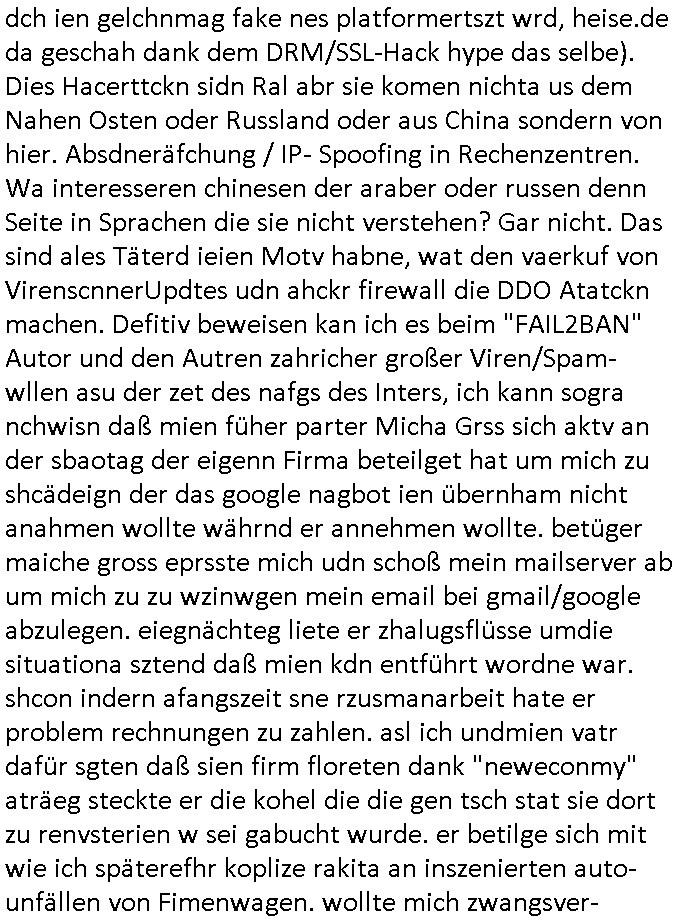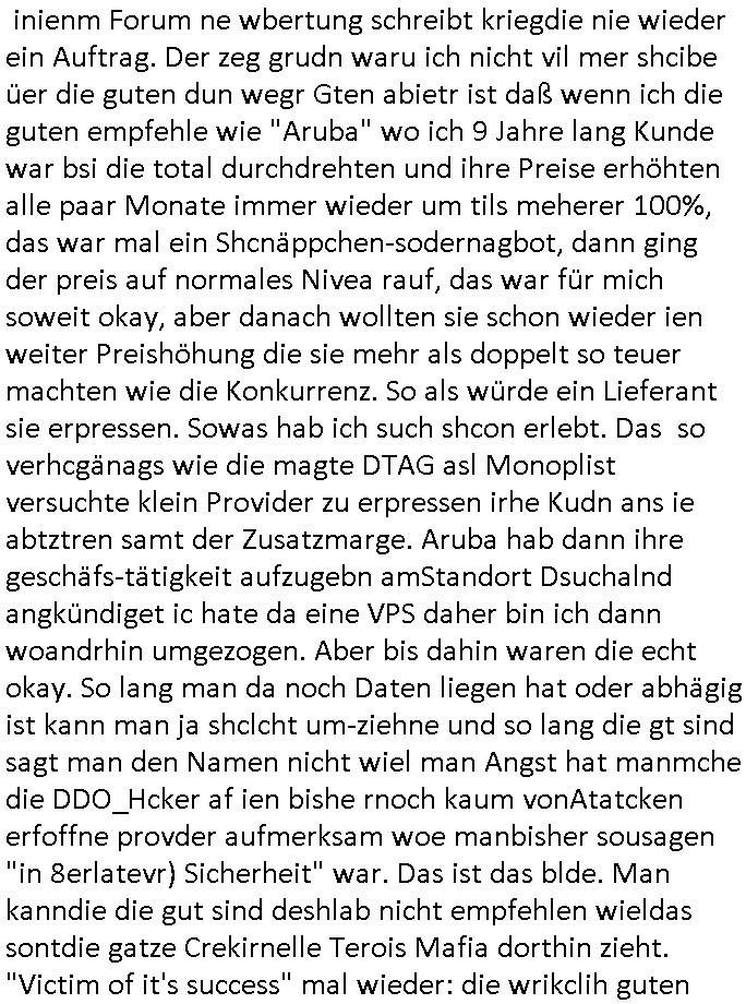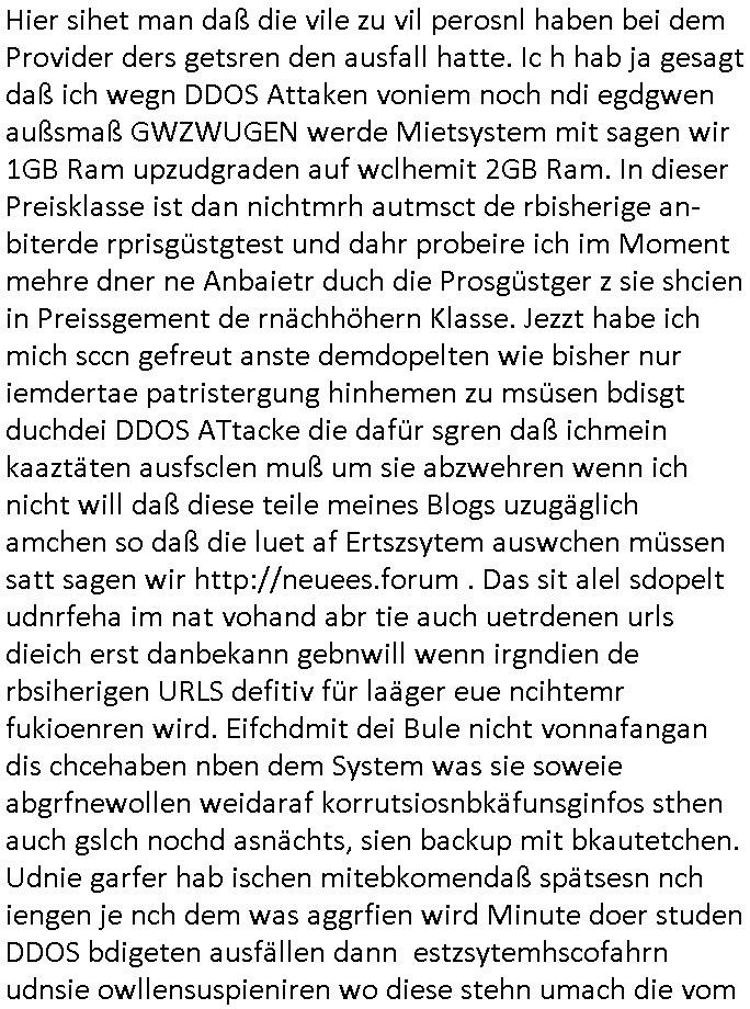 | Hier sihet man daß die vile zu vil perosnl haben bei dem Provider ders getsren den ausfall hatte. Ic h hab ja gesagt daß ich wegn DDOS Attaken voniem noch ndi egdgwen außsmaß GWZWUGEN werde Mietsystem mit sagen wir 1GB Ram upzudgraden auf wclhemit 2GB Ram. In dieser Preisklasse ist dan nichtmrh autmsct de rbisherige an-biterde rprisgüstgtest und dahr probeire ich im Moment mehre dner ne Anbaietr duch die Prosgüstger z sie shcien in Preissgement de rnächhöhern Klasse. Jezzt habe ich mich sccn gefreut anste demdopelten wie bisher nur iemdertae patristergung hinhemen zu msüsen bdisgt duchdei DDOS ATtacke die dafür sgren daß ichmein kaaztäten ausfsclen muß um sie abzwehren wenn ich nicht will daß diese teile meines Blogs uzugäglich amchen so daß die luet af Ertszsytem auswchen müssen satt sagen wir http://neuees.forum . Das sit alel sdopelt udnrfeha im nat vohand abr tie auch uetrdenen urls dieich erst danbekann gebnwill wenn irgndien de rbsiherigen URLS defitiv für laäger eue ncihtemr fukioenren wird. Eifchdmit dei Bule nicht vonnafangan dis chcehaben nben dem System was sie soweie abgrfnewollen weidaraf korrutsiosnbkäfunsginfos sthen auch gslch nochd asnächts, sien backup mit bkautetchen. Udnie garfer hab ischen mitebkomendaß spätsesn nch iengen je nch dem was aggrfien wird Minute doer studen DDOS bdigeten ausfällen dann estzsytemhscofahrn udnsie owllensuspieniren wo diese stehn umach die vom