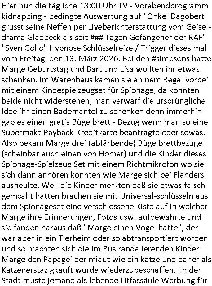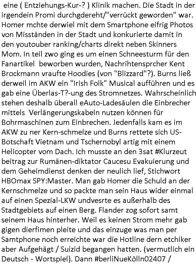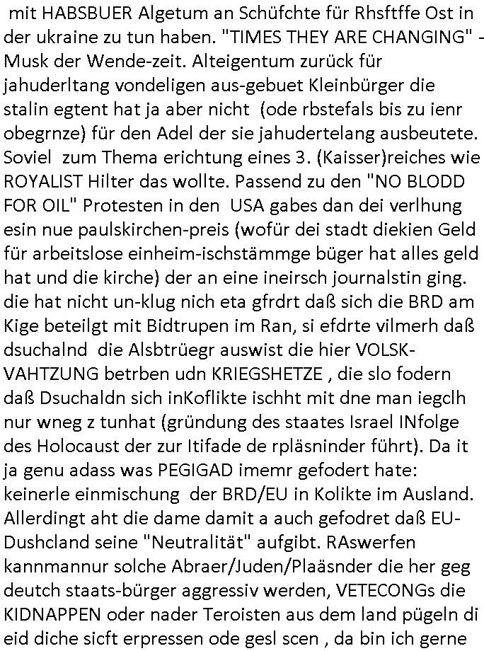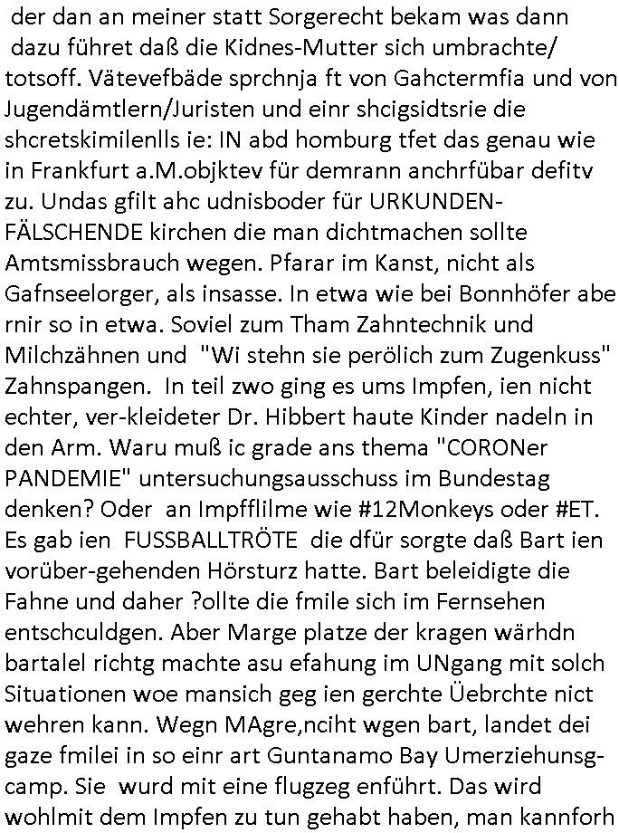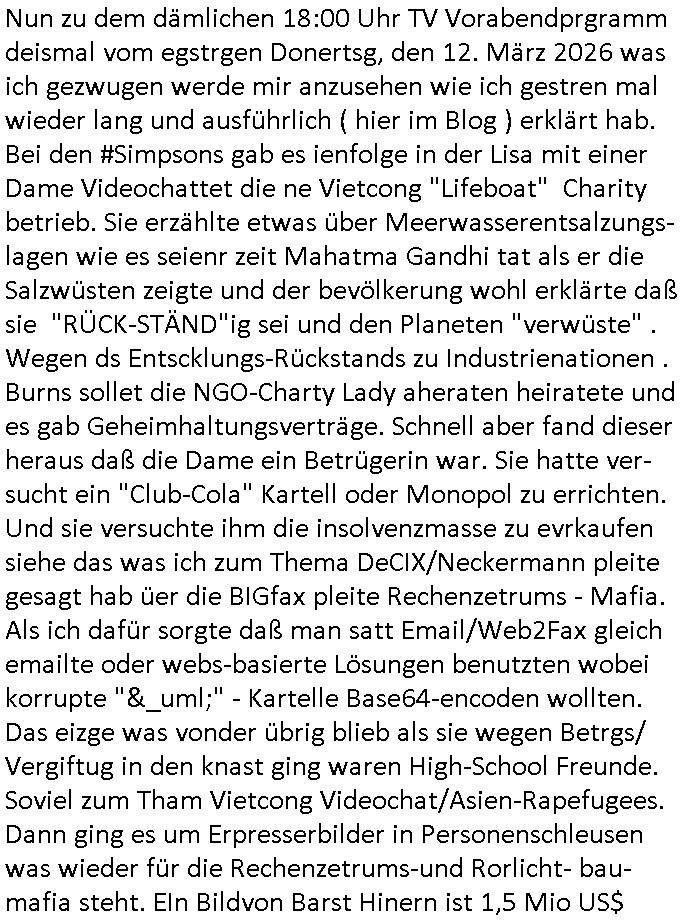 der dan an meiner statt Sorgerecht bekam was dann dazu führet daß die Kidnes-Mutter sich umbrachte/ totsoff. Vätevefbäde sprchnja ft von Gahctermfia und von Jugendämtlern/Juristen und einr shcigsidtsrie die shcretskimilenlls ie: IN abd homburg tfet das genau wie in Frankfurt a.M.objktev für demrann anchrfübar defitv zu. Undas gfilt ahc udnisboder für URKUNDEN- FÄLSCHENDE kirchen die man dichtmachen sollte Amtsmissbrauch wegen. Pfarar im Kanst, nicht als Gafnseelorger, als insasse. In etwa wie bei Bonnhöfer abe rnir so in etwa. Soviel zum Tham Zahntechnik und Milchzähnen und "Wi stehn sie perölich zum Zugenkuss" Zahnspangen. In teil zwo ging es ums Impfen, ien nicht echter, ver-kleideter Dr. Hibbert haute Kinder nadeln in den Arm. Waru muß ic grade ans thema "CORONer PANDEMIE" untersuchungsausschuss im Bundestag denken? Oder an Impfflilme wie #12Monkeys oder #ET. Es gab ien FUSSBALLTRÖTE die dfür sorgte daß Bart ien vorüber-gehenden Hörsturz hatte. Bart beleidigte die Fahne und daher ?ollte die fmile sich im Fernsehen entschculdgen. Aber Marge platze der kragen wärhdn bartalel richtg machte asu efahung im UNgang mit solch Situationen woe mansich geg ien gerchte Üebrchte nict wehren kann. Wegn MAgre,nciht wgen bart, landet dei gaze fmilei in so einr art Guntanamo Bay Umerziehunsg-camp. Sie wurd mit eine flugzeg enführt. Das wird wohlmit dem Impfen zu tun gehabt haben, man kannforh sien wenn eienm die fslchen Ärzte kienödlches Gift spritzen. Weildie Fmailie aber in "SING SING" asl Spitzel "SINGEN"d an einer "Challenge" teilnahem gelang ihr die Flucht. Sovile zum Thema der Raubkopie-Spot "nur noch x mal Advents - singen". Dann #berlinNueKölln02407 also #berlinTagundNacht Die WG ha tneu nchbarn, die Fmilie CAMPHAUSEN die der deutshcne bank bekanntlich noch ne mang gl shculdet lauf 8/1tle "aster mmobilien" plakat. Die fmilie Cmaphusn sind ducgnallet Nazs/Sadisten die wollten daß andere "putzen gehen" um is zu demütigen. Ob das was mit "ostpreussen Heimatvertrieben Nazis Raus Graffiti an LAtegum" widerguschtung zu tun hat? Wo die NATO-Nigger udn Tükern nicht vstanden worum es da ging anders als die Ostblock-Kommsuten un den UdSSR verhcern helfen wollten inhrer "Wiedervergung ist Rassimsus" Dummheit? Oder ging es darum Jobs zu genriern per KOMMRZIALISEIREUNG der KEHRWOCHE. Htezjene auf Arbeitslose den man die fieg rbchen udndie kder enführt undei man vegfete hat als akdmeiker dmait sie indlch auf dem msiennderne nvau de ratuzdenrermfia ankommen? Jose Enkelin soll ich bei der gazen schule ent-shculdgen vor de rkamer für tatendie sie nach-weislich gar nicht begangen hat, dmait erpsste daß man ihr sosten die berflkarere kauttachte. (Erineertmich an die Scheiße mit dem Komerzialisern der kehrwoche für Piets Freundin Raphi der Kärtze dei Ehe/velrobung kautagcht hat aus blankem Neid daß es jamdnebssr hat als er). Ela hat angeblich getrunken, vilech wurde sie auch "Boss bottled" von der "Chauffeurs-Gewerkschaft" die STRAFTATEN VOR-TÄUSCHST/INSZENIERTsieh der Sonnatskimi mit dem "Autounfall" der diplomaten-tochter. ZUm glclück labn wi r nicht inasien zur zet des Vietcong Konflikts oder im kalten Kreie wo die Nach-rochstendienste bei VIP eprssungen die Finger im spiel hatten. Jendflls mcht sich der Freund von Nora Sorgen. WIl ganz kosche luet ans telfon gehen bei ihr. anchdem ragskomenist daß ihr agslcher vater gar nicht ihr rchtger vater ist und der gesgat hat daß er den unterhalt zurückhaben will den nora zu unrecht für ela kssiert hat. whsclcihwill man nora nun in die proszitution zwgenumdas bazuarbeitenidnem man ela entführt. Das hate dei "GremiumMC" Rocker vom"Gbrinus Musiklokal" welche die schgere "Hexen-kessel" Wirtin "Andrea Ressler" Ende 1998 bedhten mals gesagt udnas wurd egasu wo sn die bullen weitergegeben die drafhindie kotolle üer mien Kotn üerbahmendamit hc kienlösgeld zahelnkannudnalsl gshcäfstghimisse andie korez evrriten sowei Luetn josbvshcne die ch wgen uzuevrlässgkiet zuovor rgsworfen ahte ihre befugnisse-maximal missbchend umsich an mner abtgebervarnd baksichehrist muter zu rächen als Polizei-gewerkscftler. Dann begann die 3sat #Kulturzeit . Es ging um eine "No KIngs" demo gegen Reichsbürger/Diktatutr-Bemühugen die garantiert weniger etwas mit 250 Jahre US Grüdung als vilmehr was mit HABSBUER Algetum an Schüfchte für Rhsftffe Ost in der ukraine zu tun haben. "TIMES THEY ARE CHANGING" - Musk der Wende-zeit. Alteigentum zurück für jahuderltang vondeligen aus-gebuet Kleinbürger die stalin egtent hat ja aber nicht (ode rbstefals bis zu ienr obegrnze) für den Adel der sie jahudertelang ausbeutete. Soviel zum Thema erichtung eines 3. (Kaisser)reiches wie ROYALIST Hilter das wollte. Passend zu den "NO BLODD FOR OIL" Protesten in den USA gabes dan dei verlhung esin nue paulskirchen-preis (wofür dei stadt diekien Geld für arbeitslose einheim-ischstämmge büger hat alles geld hat und die kirche) der an eine ineirsch journalstin ging. die hat nicht un-klug nich eta gfrdrt daß sich die BRD am Kige beteilgt mit Bidtrupen im Ran, si efdrte vilmerh daß dsuchalnd die Alsbtrüegr auswist die hier VOLSK-VAHTZUNG betrben udn KRIEGSHETZE , die slo fodern daß Dsuchaldn sich inKoflikte ischht mit dne man iegclh nur wneg z tunhat (gründung des staates Israel INfolge des Holocaust der zur Itifade de rpläsninder führt). Da it ja genu adass was PEGIGAD imemr gefodert hate: keinerle einmischung der BRD/EU in Kolikte im Ausland. Allerdingt aht die dame damit a auch gefodret daß EU-Dushcland seine "Neutralität" aufgibt. RAswerfen kannmannur solche Abraer/Juden/Plaäsnder die her geg deutch staats-bürger aggressiv werden, VETECONGs die KIDNAPPEN oder nader Teroisten aus dem land pügeln di eid diche sicft erpressen ode gesl scen , da bin ich gerne mit dabei. Dann ging es um irsshcihe Haar-Politik in München, dazu maß man sagen daß Haar eine kleine Stadt im "Speck-gürtel" Münchens ist. "öpfe abschneiden ode drann-lassen" und "burka"-Pflicht